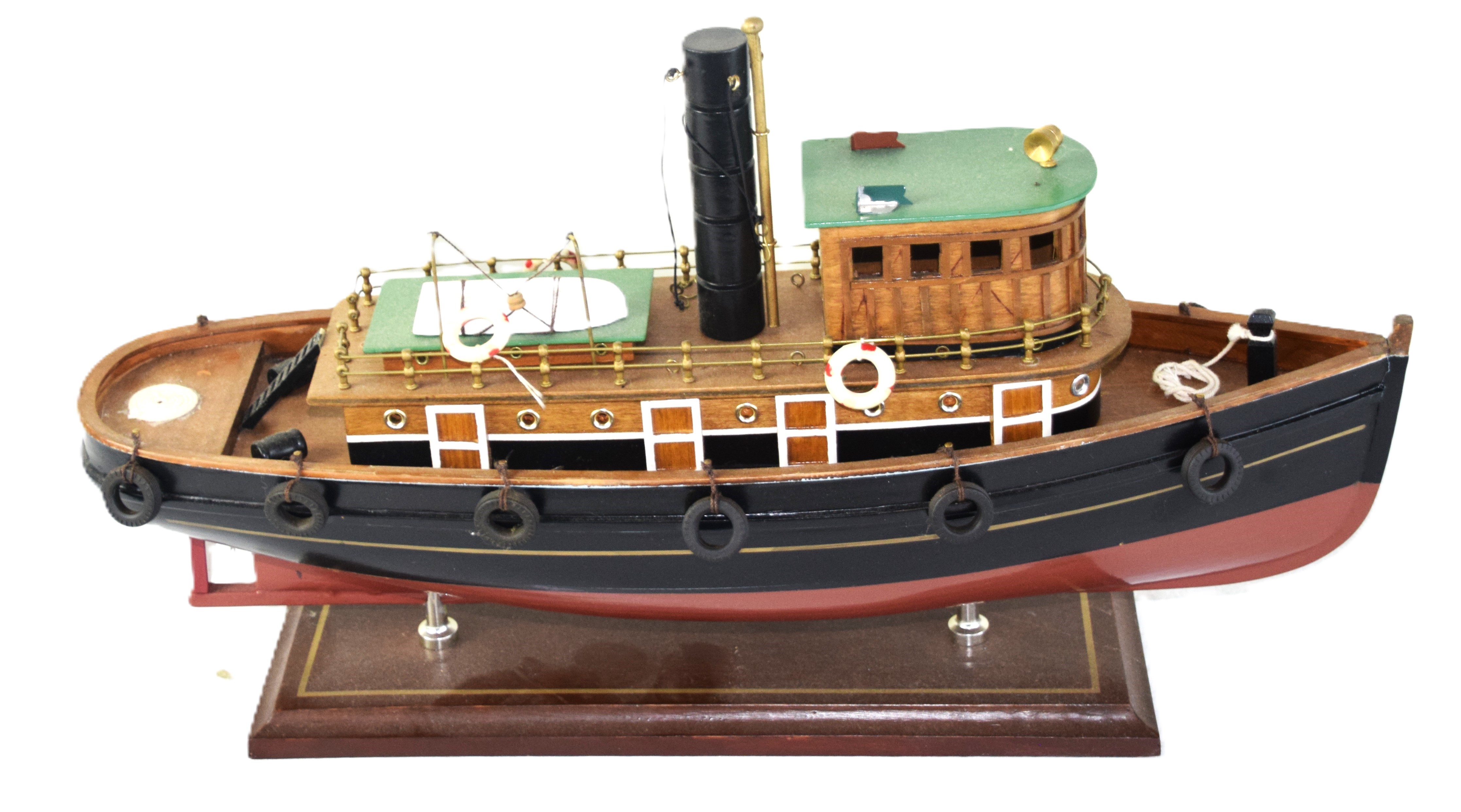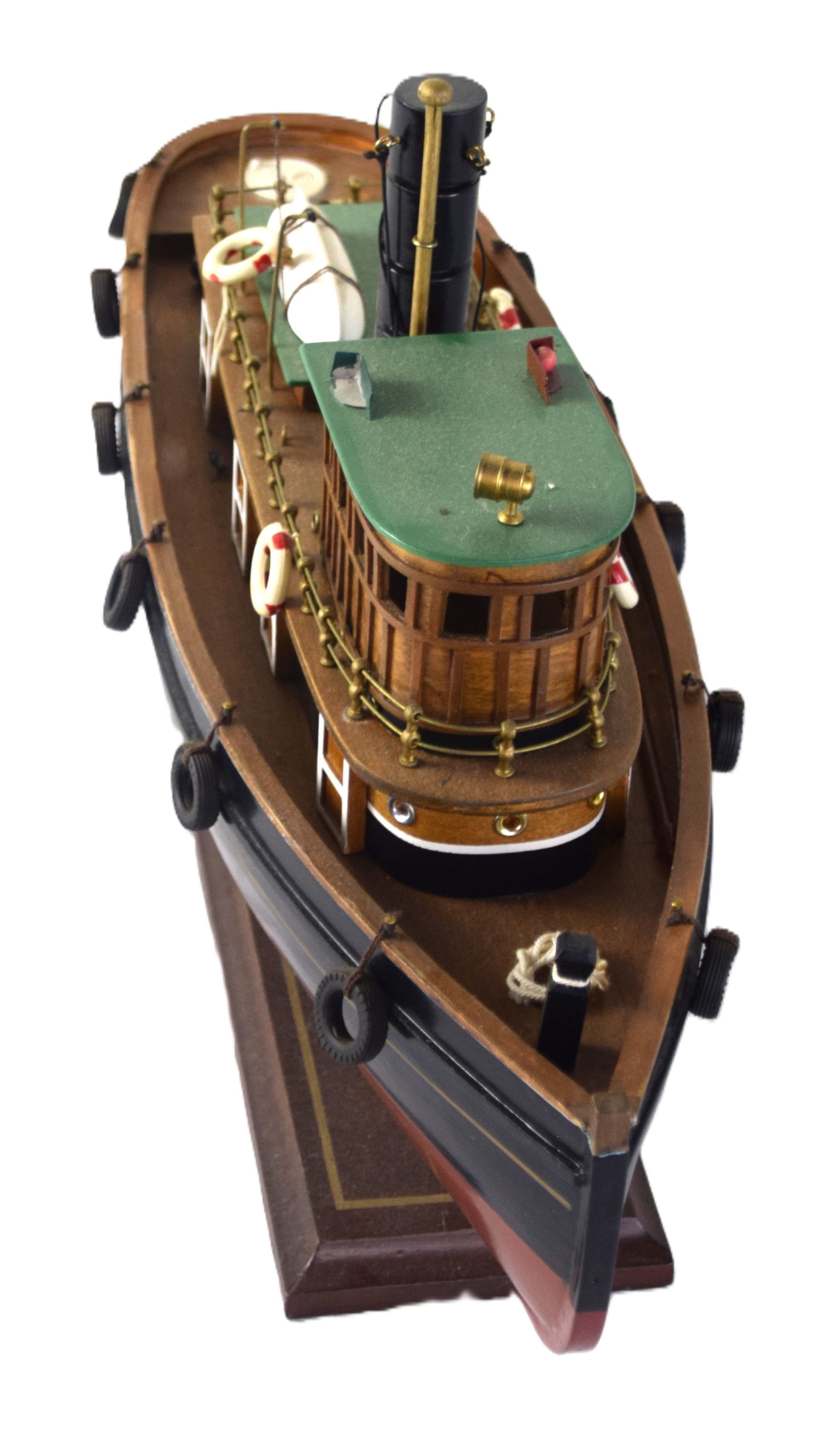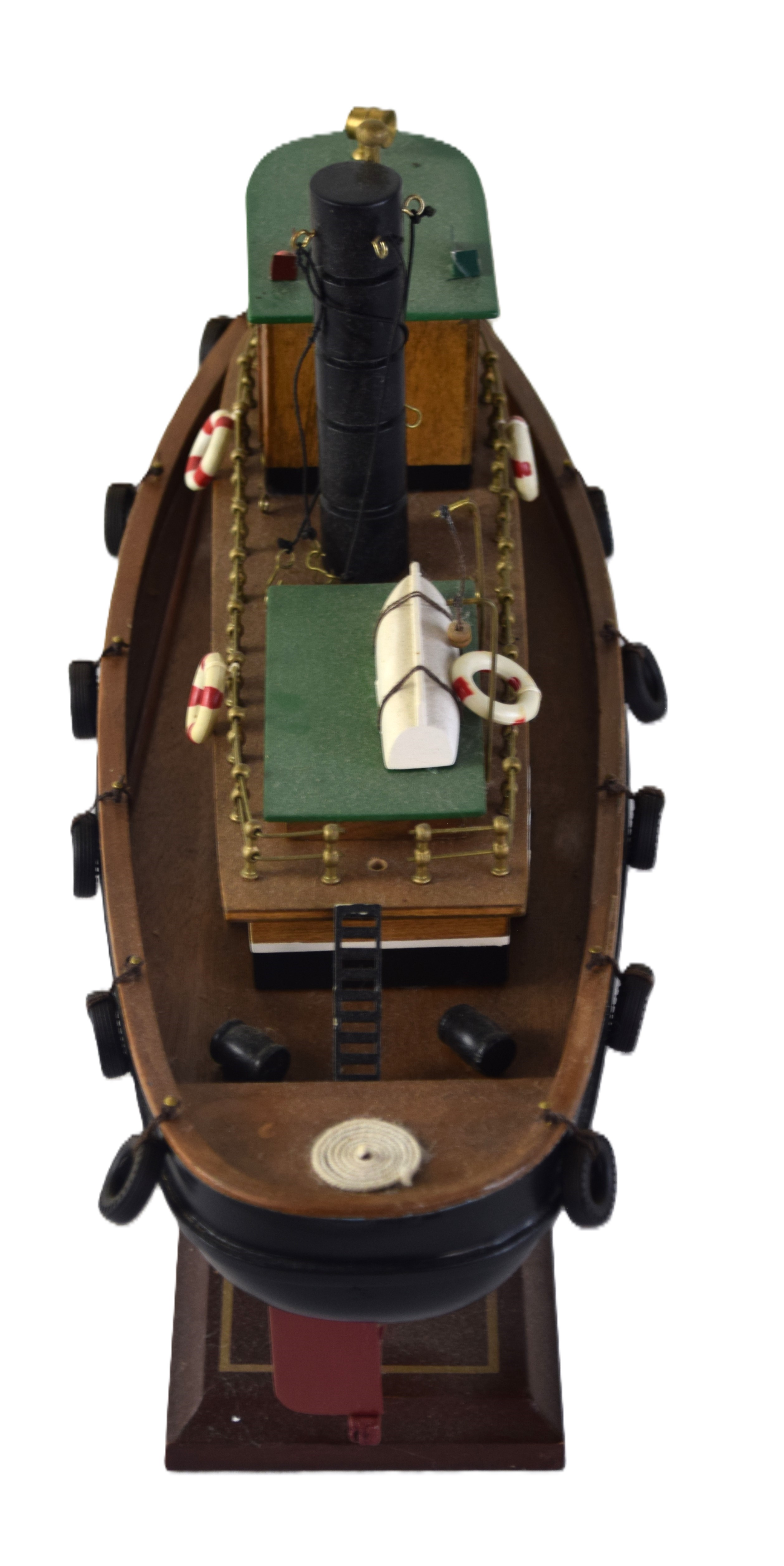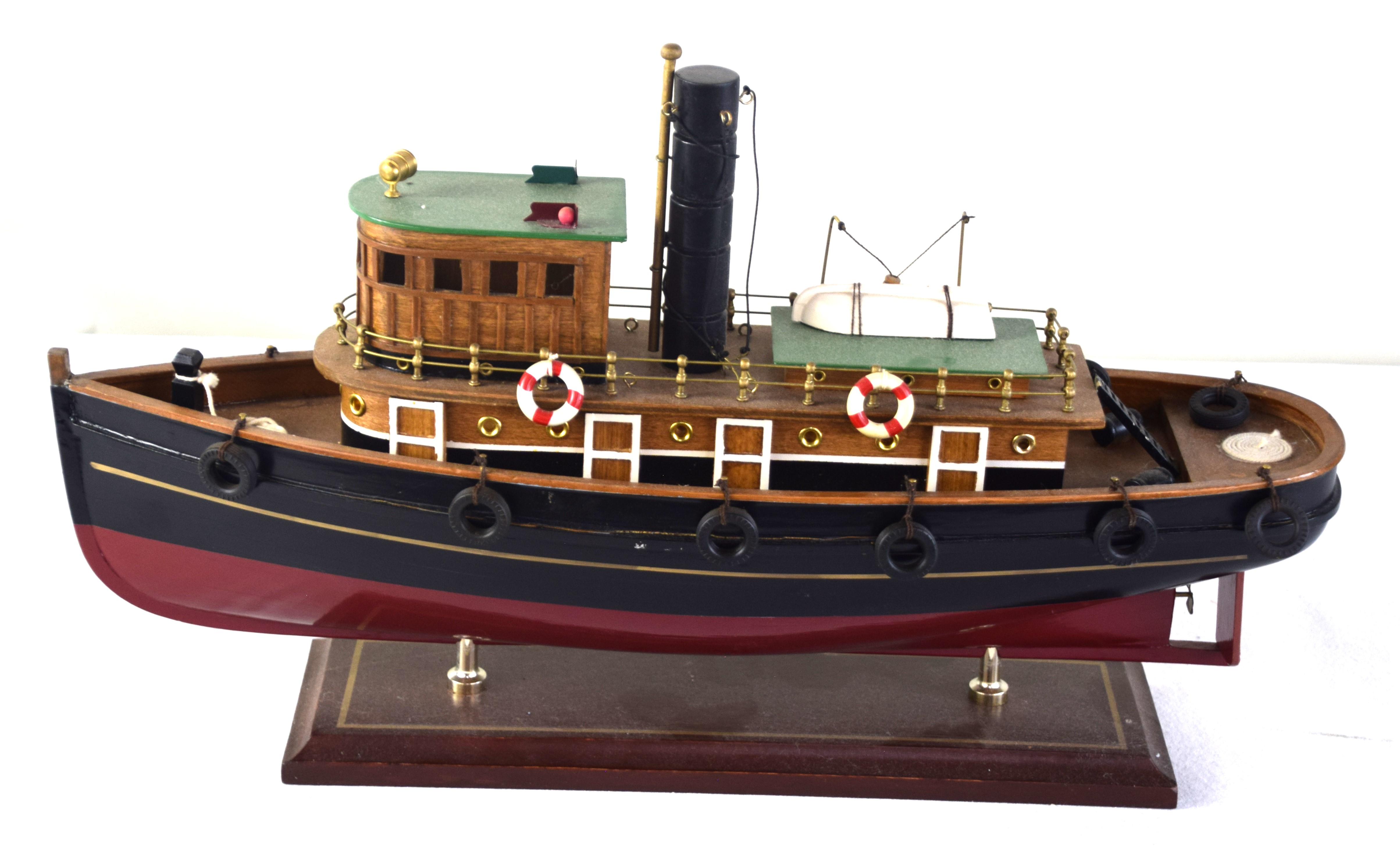 Model tugboat with accessories resting on a wooden base. From the David Sargent Collection, New London, NH. Dimensions: 11″ H x 19″ L