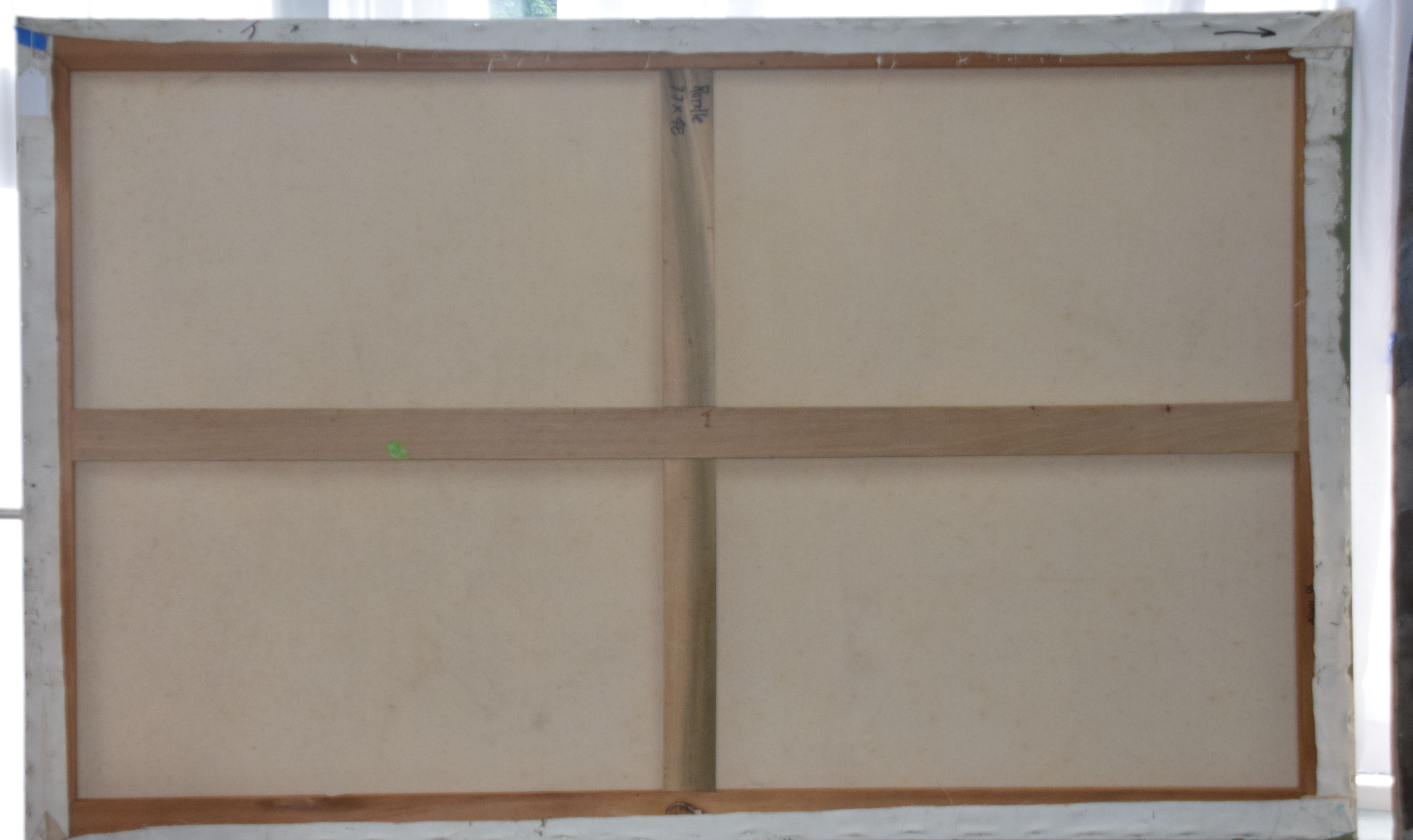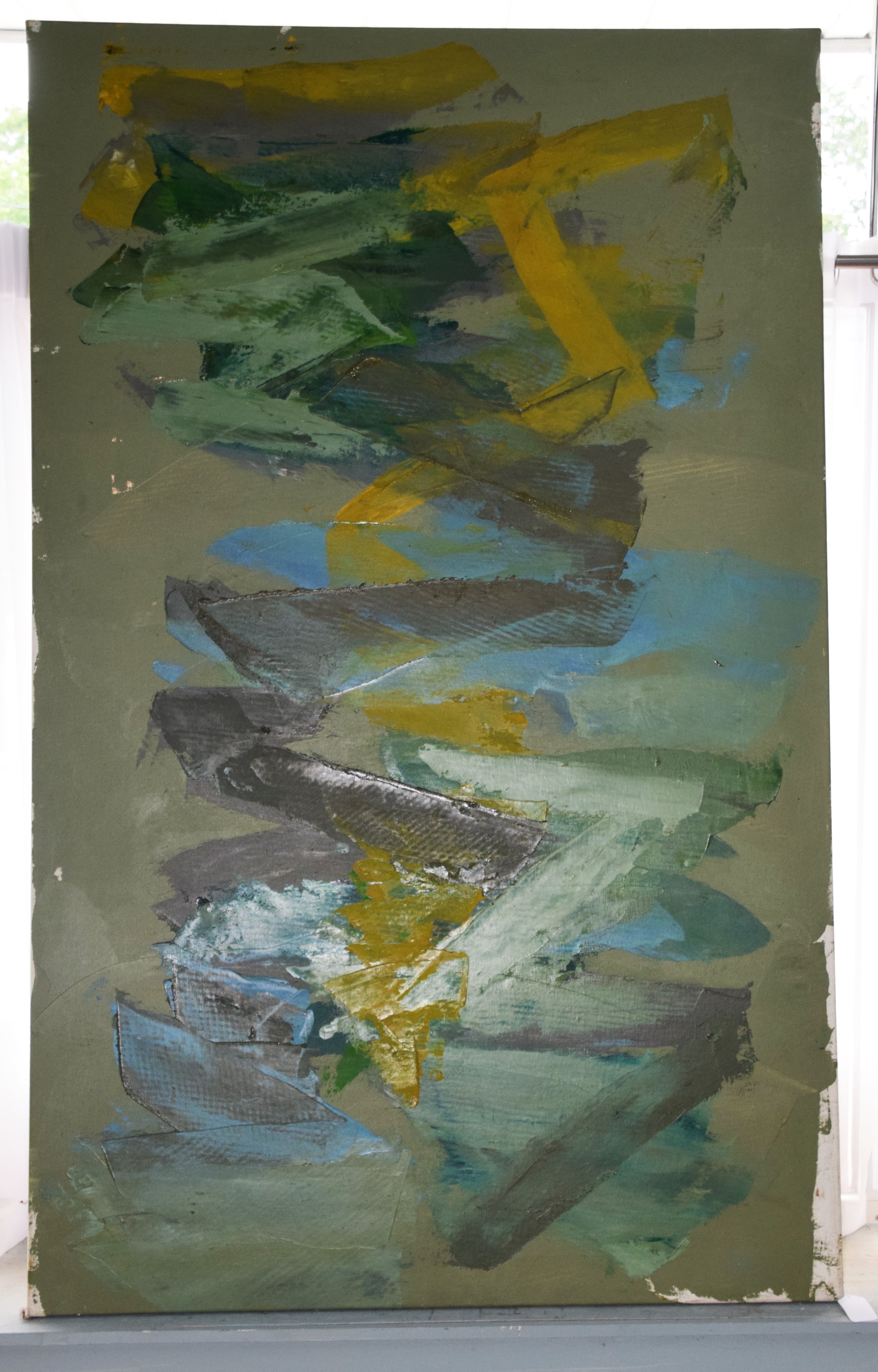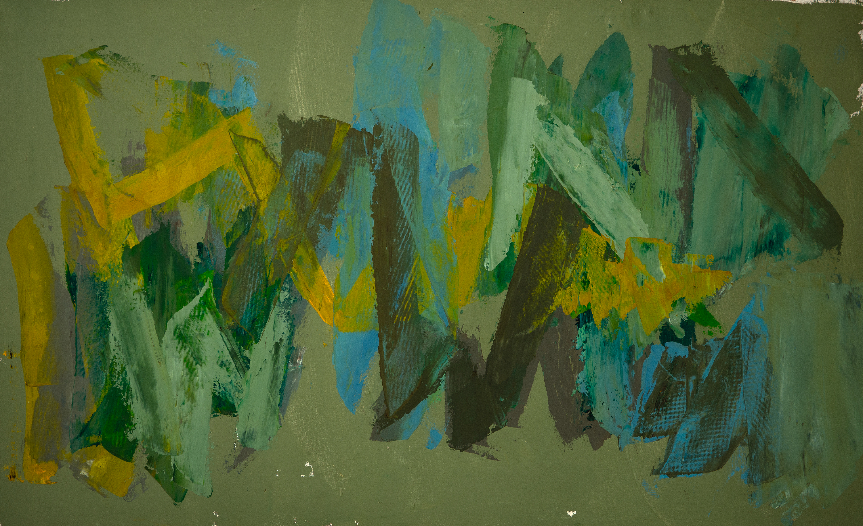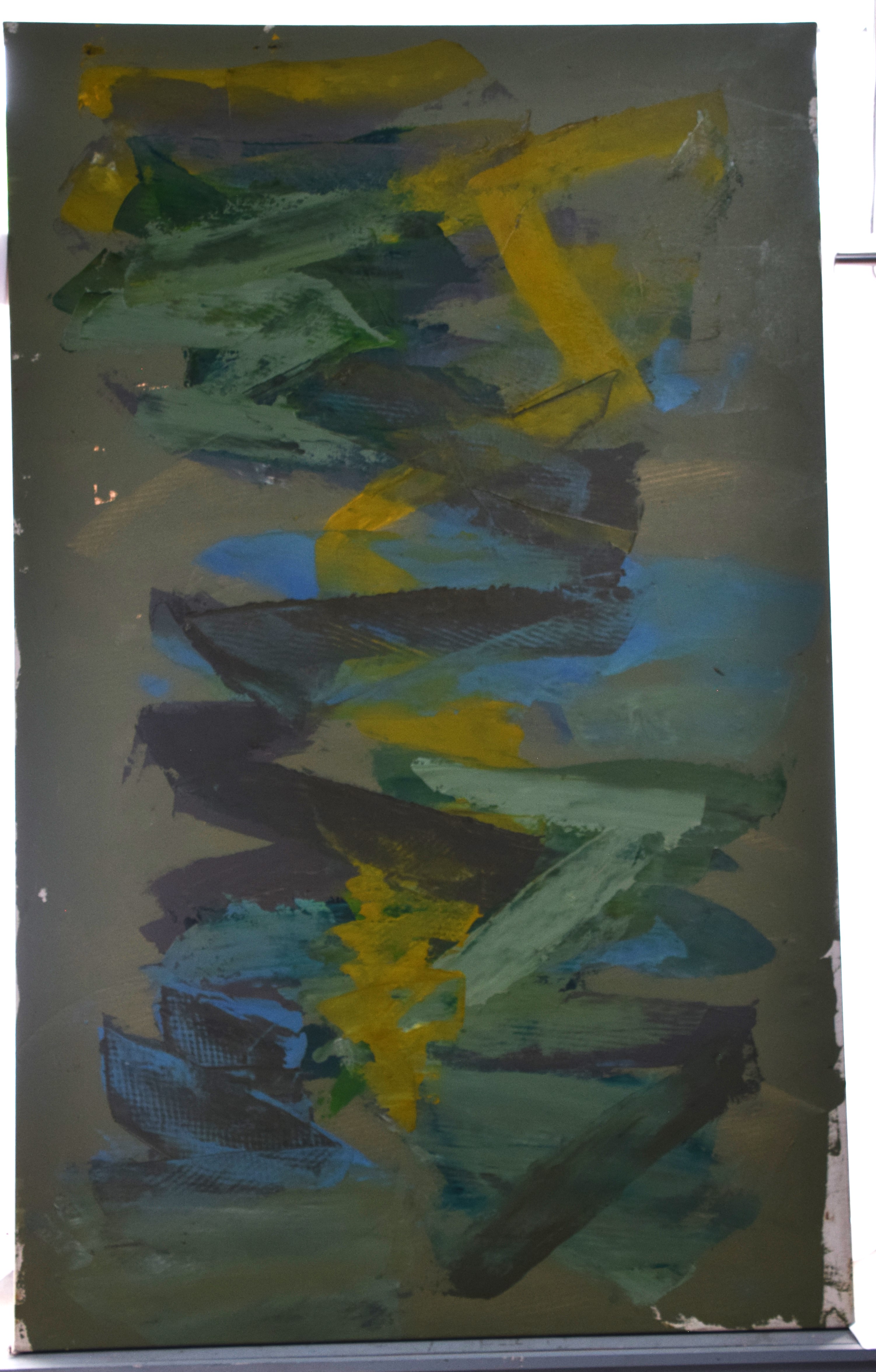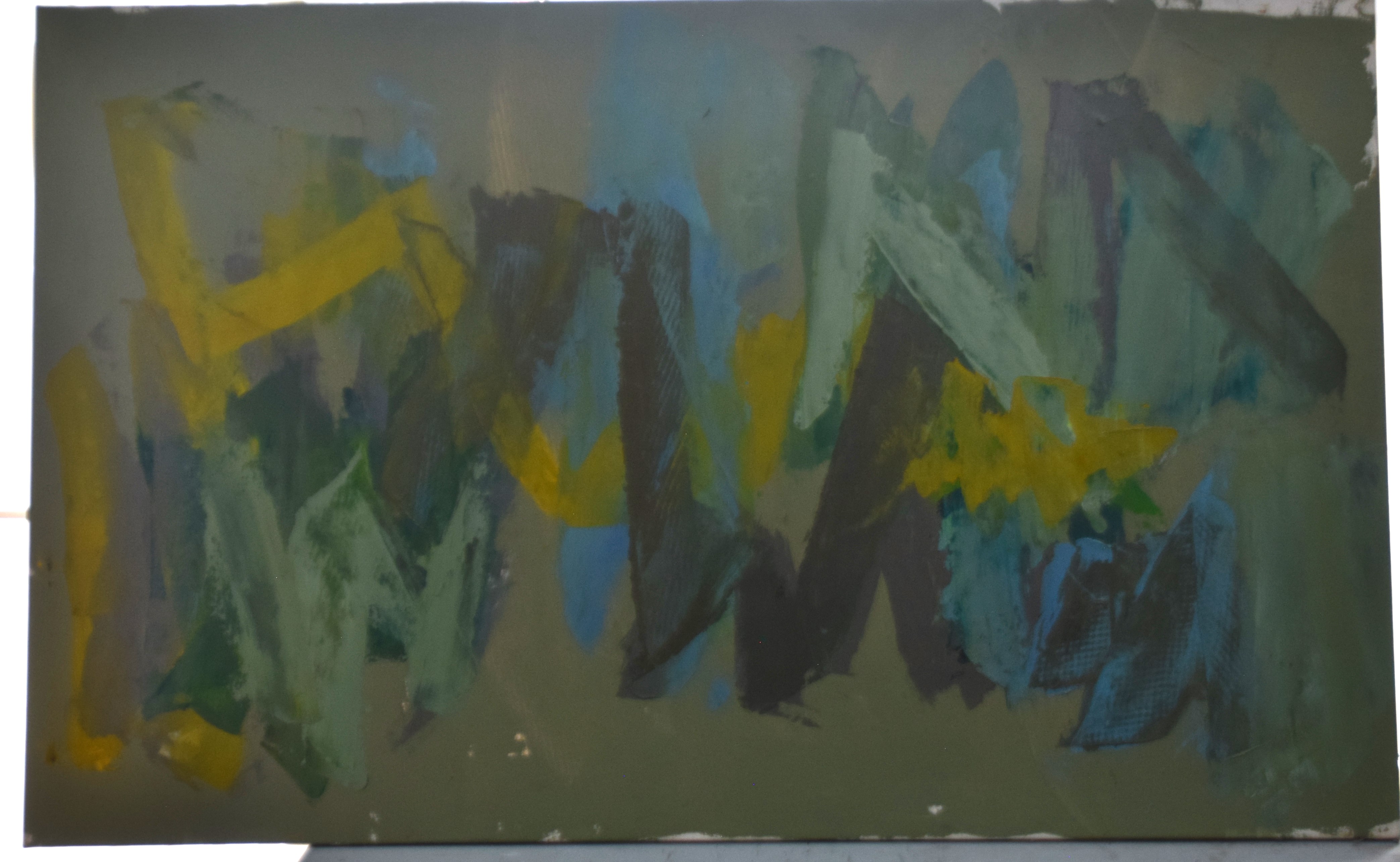 An abstract, multicolored painting of greens, yellow and blue. Elyssa Rundle (1932 – 1994) worked in New York and Pennsylvania and is known for Gestural abstract painting (Vincent van Gogh was also known for Gestural techniques). She opened a studio on West 23rd Street in New York City and became a member of the New York School of Gestural Abstract Expressionism. Rundle took bolder risks in her approach to color, composition and proportion, encouraged by the interaction with fellow artists and feed-back by noted art critics of her time including supporters Clem Greenburg and John Russell. Three years after her death, in 1997, her collection of work won a grant from the Judith Rothschild Foundation, established for the purpose of bringing recognition to highly talented, deceased artists. The Rothschild Grant helped create an inventory of the collection, and an exhibit and catalogue called: The Spirit of the Paint, by the Berman Museum. This artwork is from that collection. Dimensions: 48″x 77″
