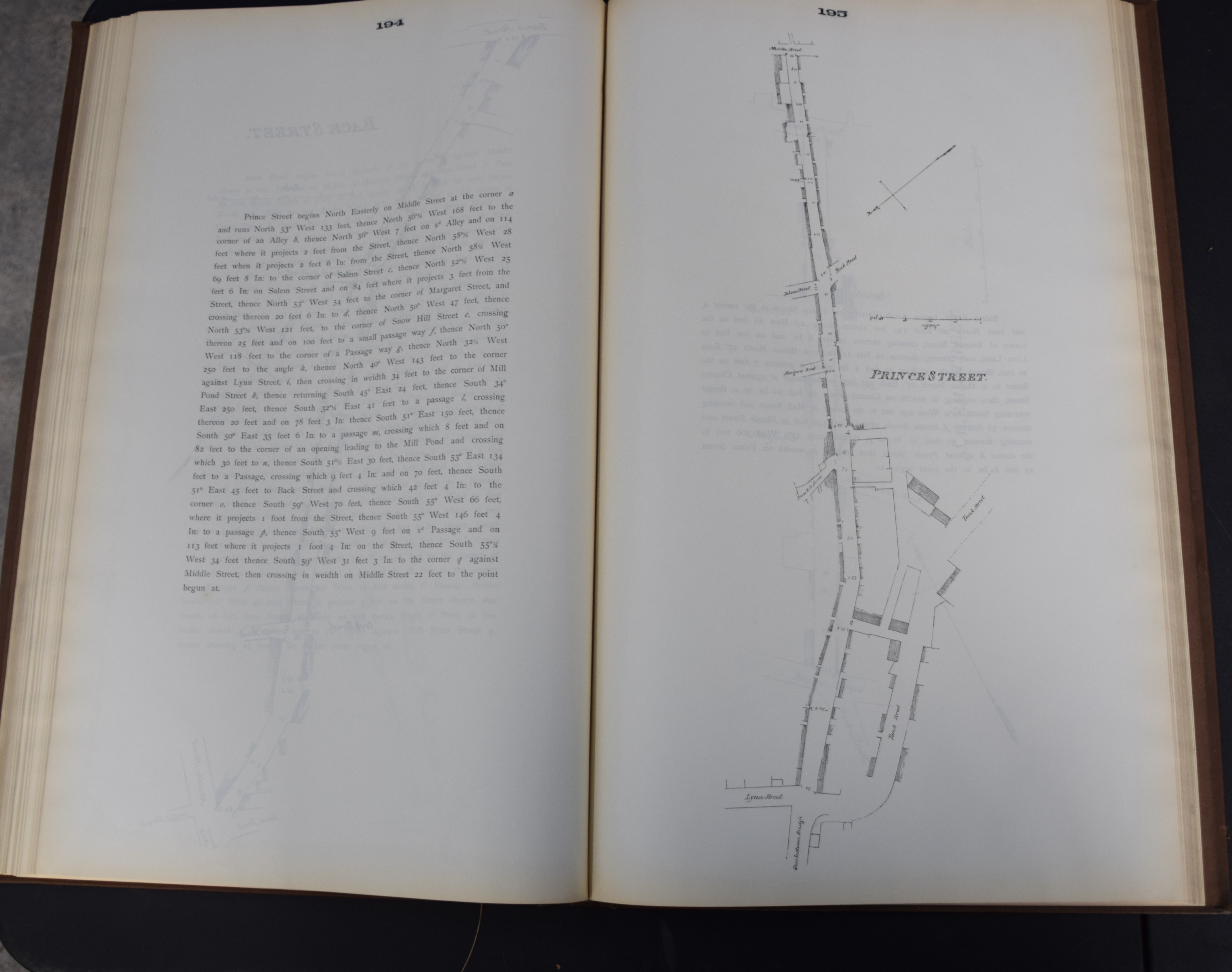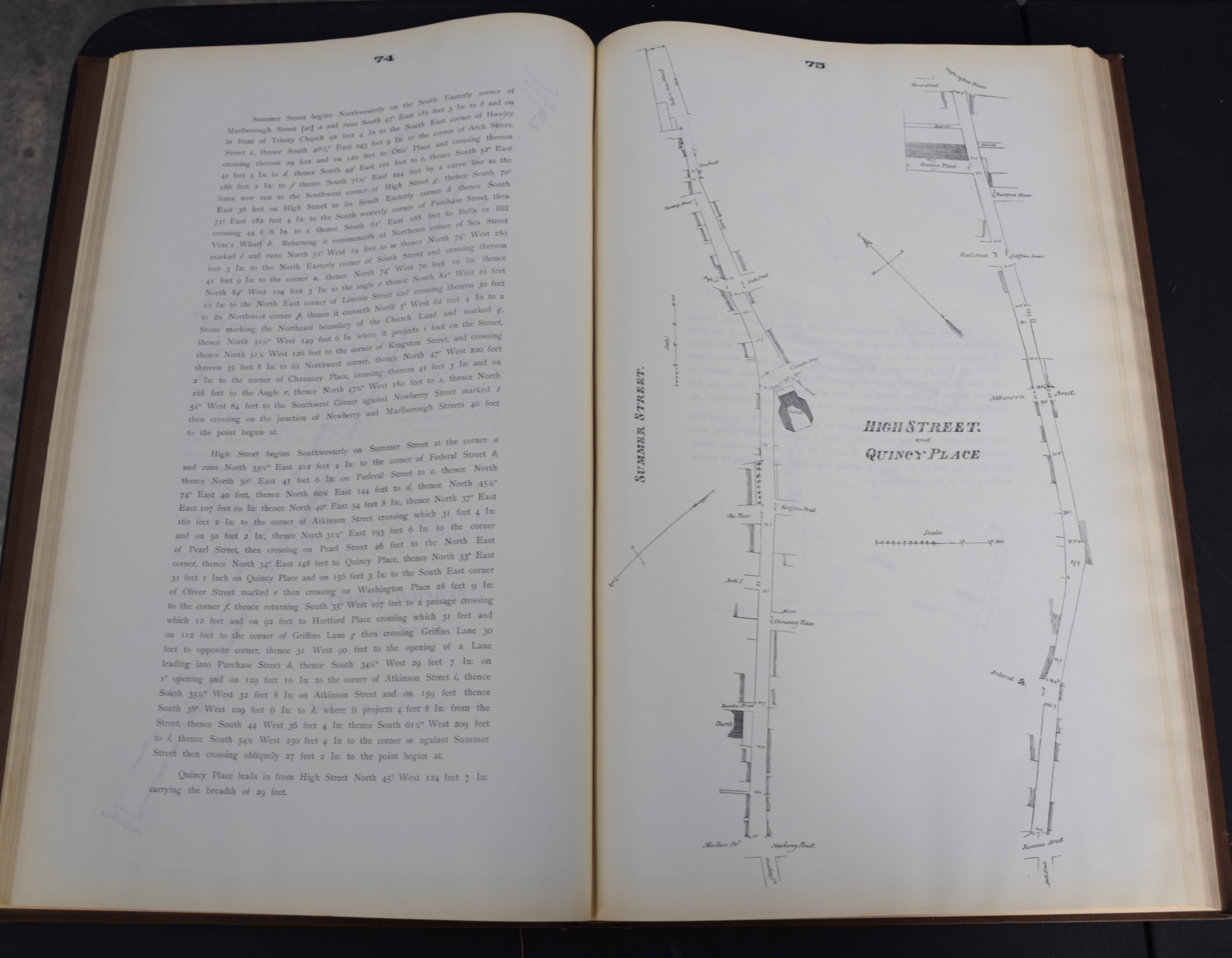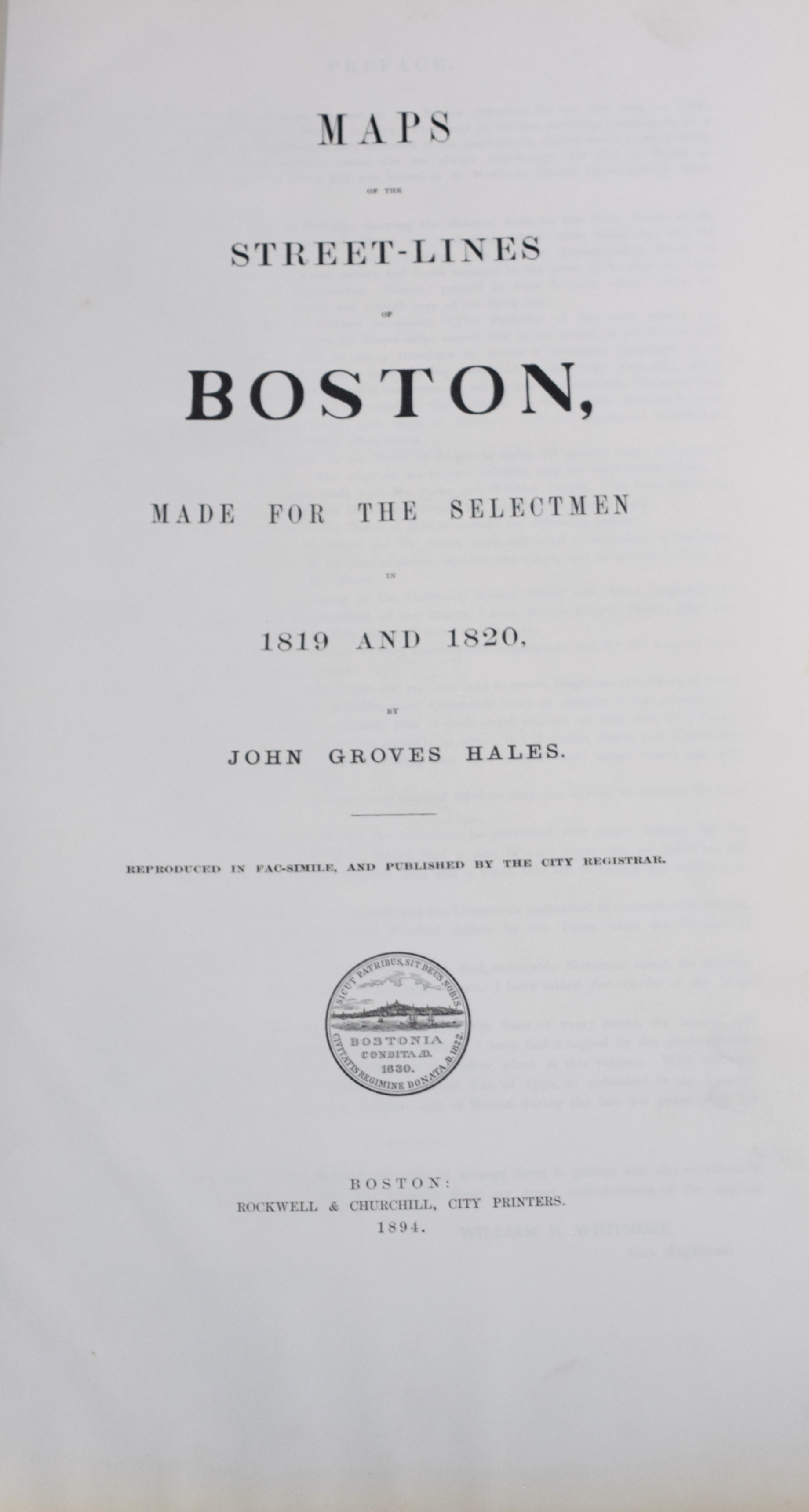An atlas of Street Maps of Boston drawn by John Graves Hales, 1819, made for the selectmen of Boston. Reproduced by Boston, Rockwell, & Churchill, City Printers, 1894. There is a map of each street with short survey description of each, 285 pages. Dimensions: 17″ x 13.5″