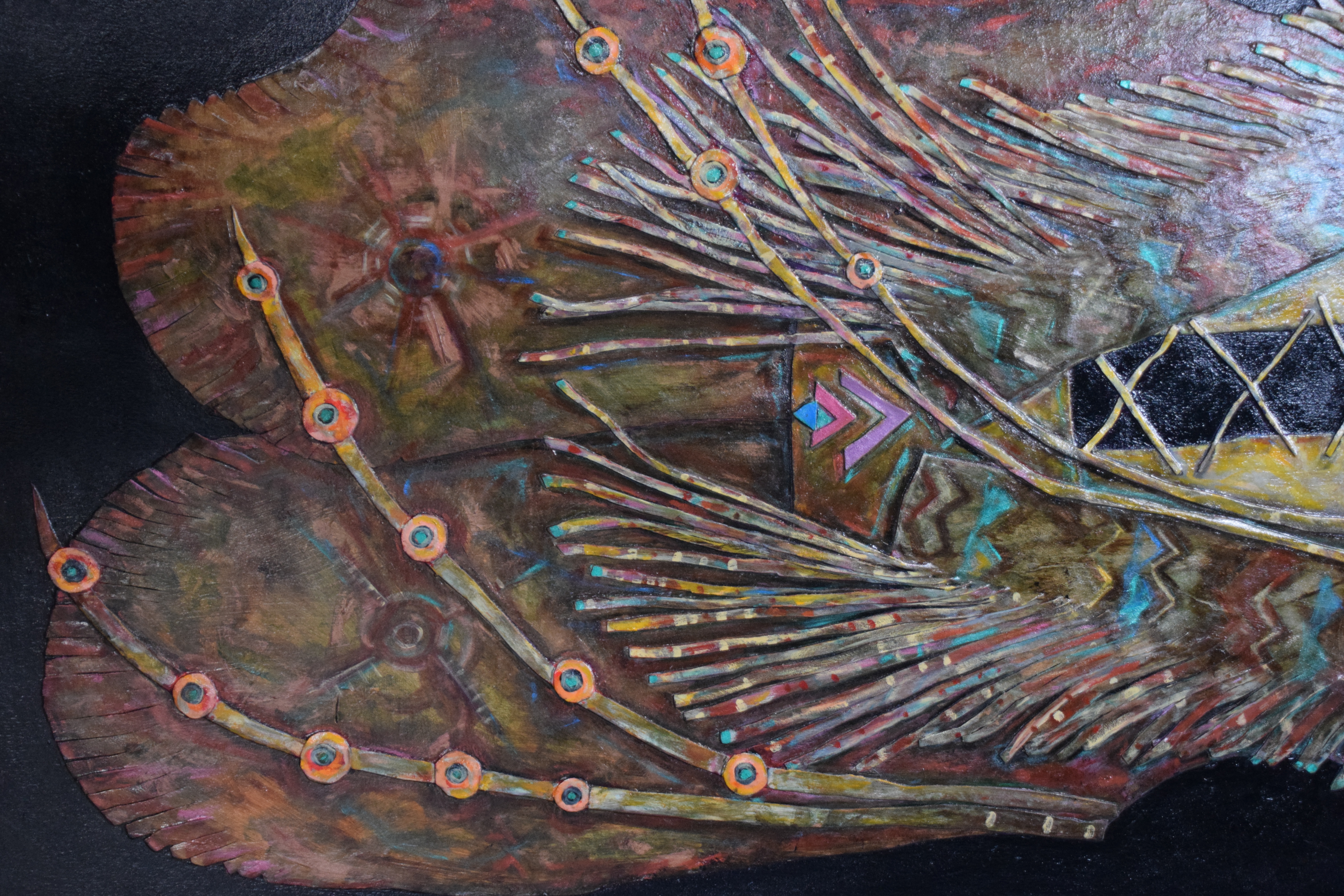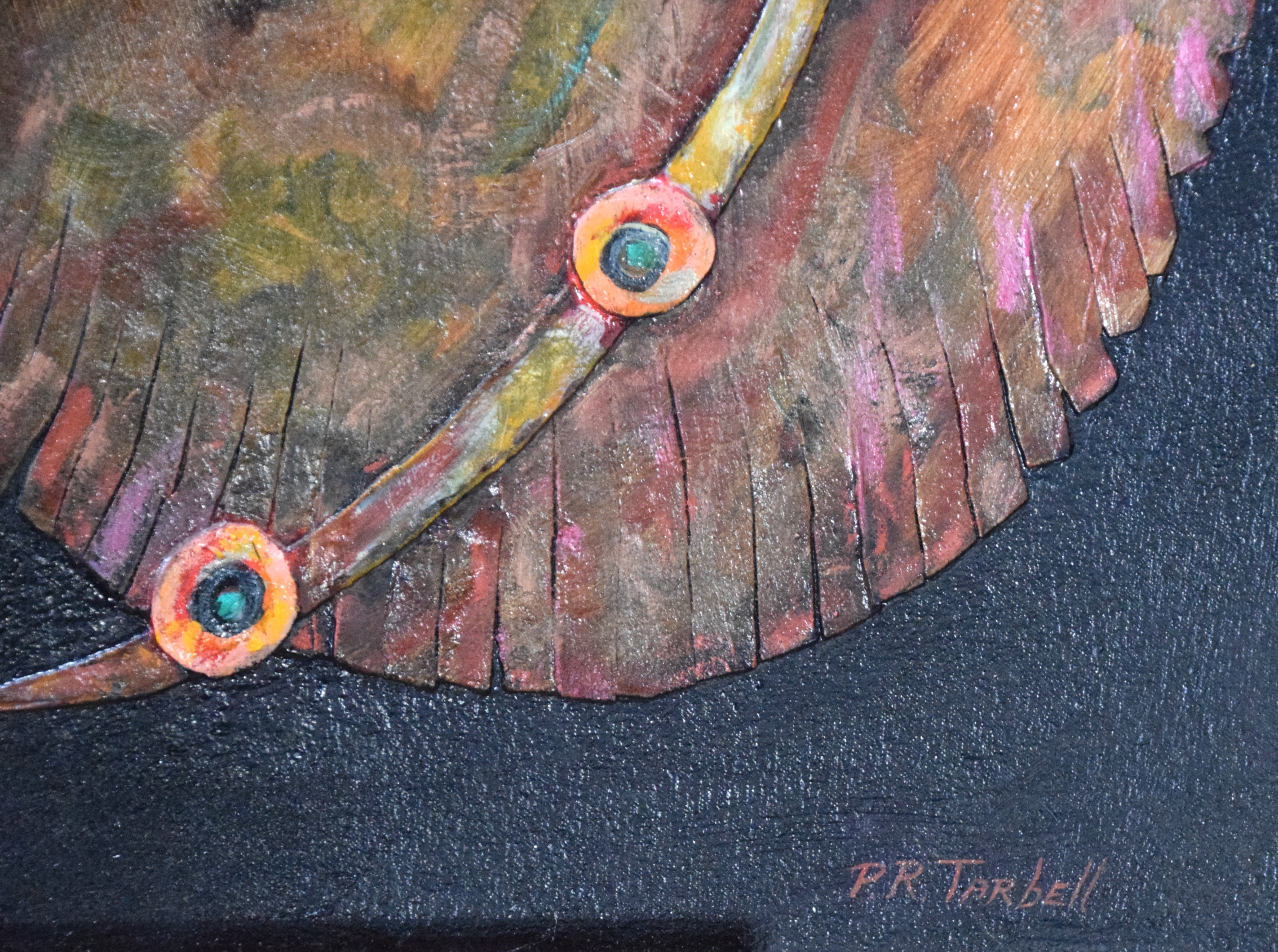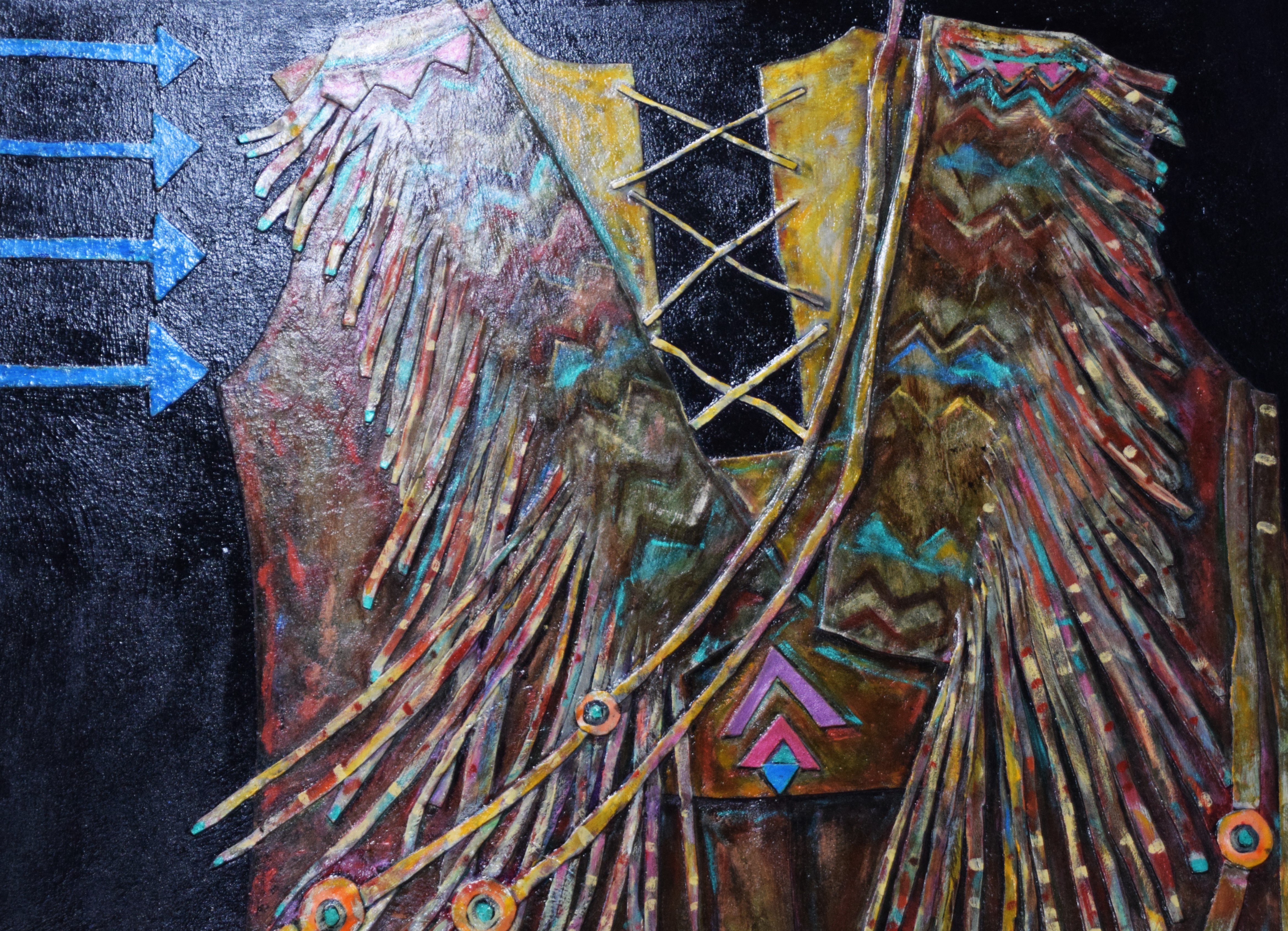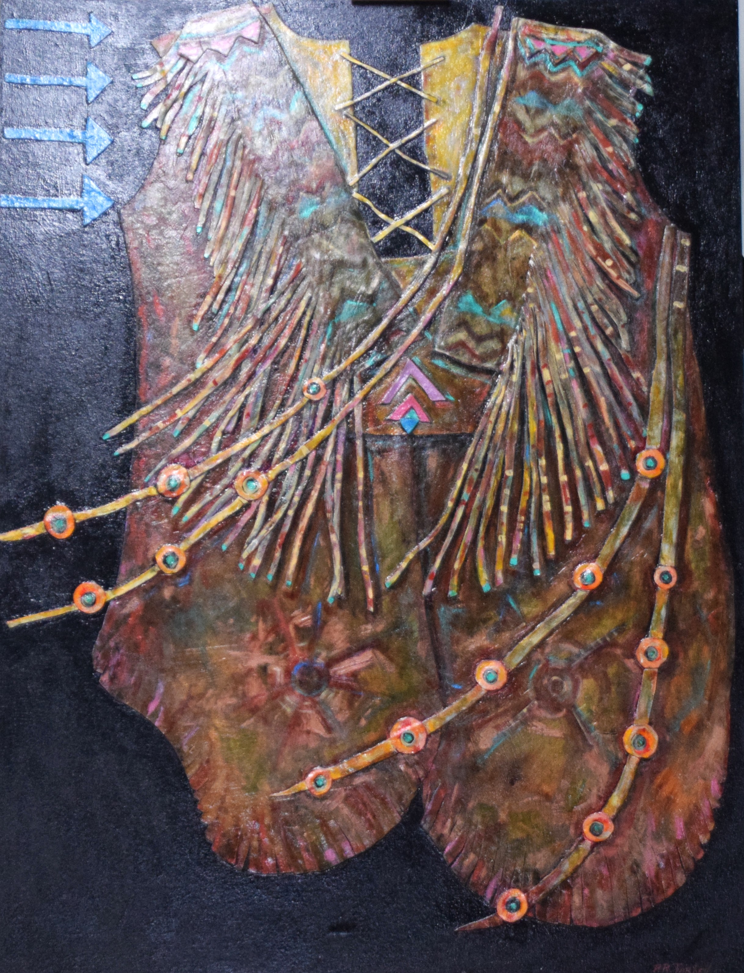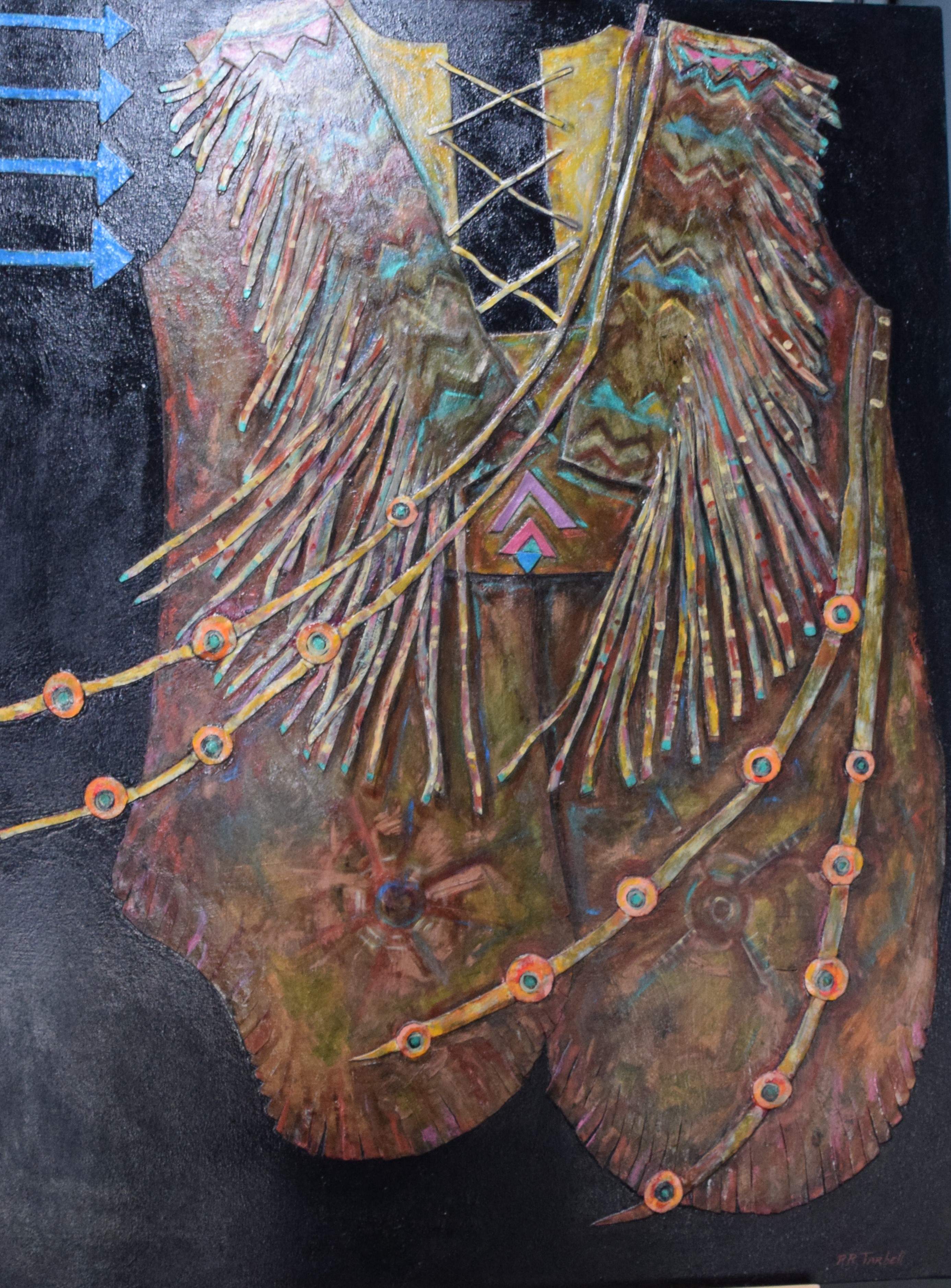 Fabulous, signed oil on canvas with leather highlights of a Southwestern warrior tunic by Pam Tarbell. Brown with leather feathering/straps. Pam Tarbell, Concord NH, is a graduate of the Rhode Island School of Design and a United States Art Embassy Artist. Her work is exhibited nationally and in 2023 had a solo exhibit at the Arnold Arboretum of Harvard University. Dimensions: 48″ x 36″