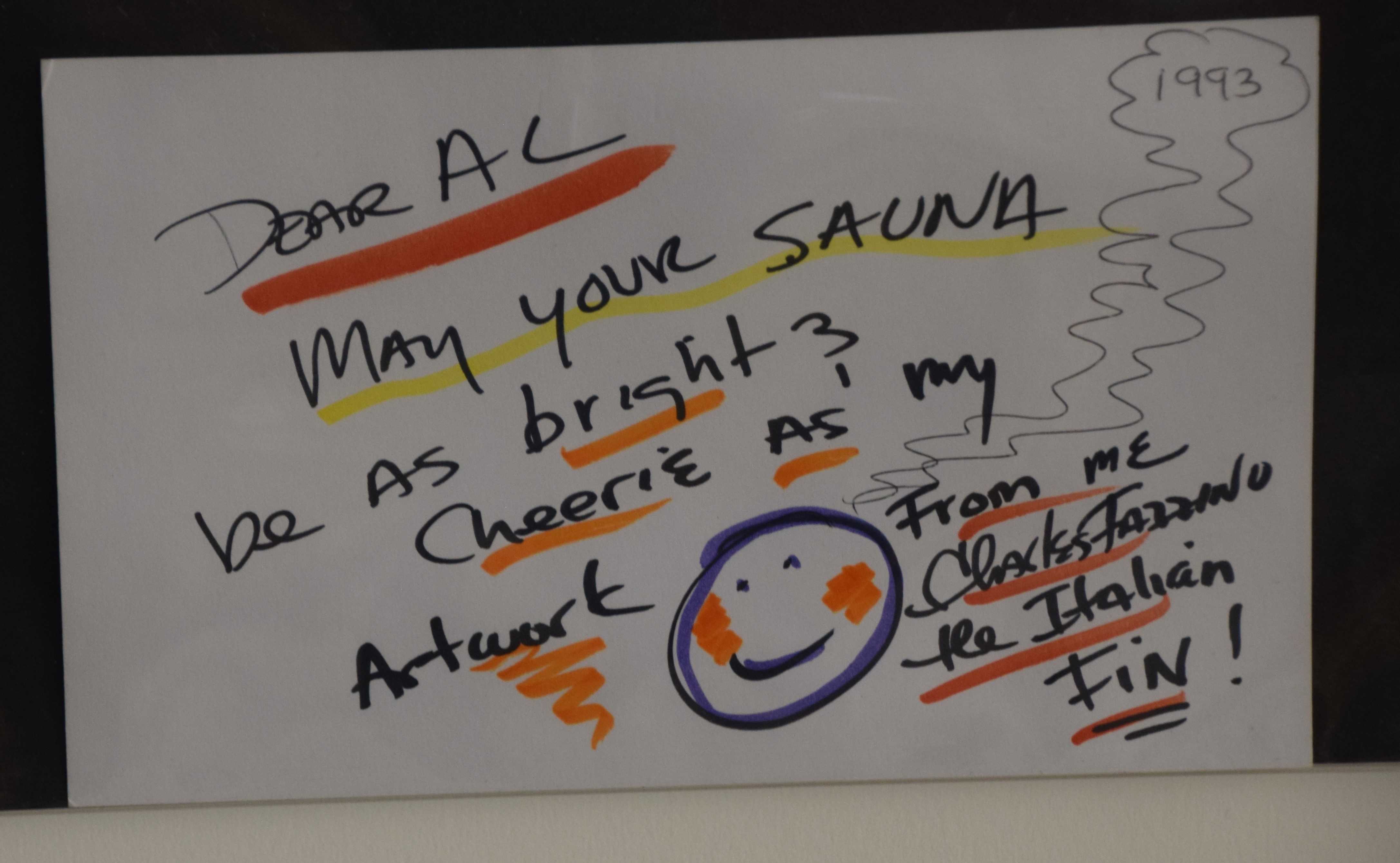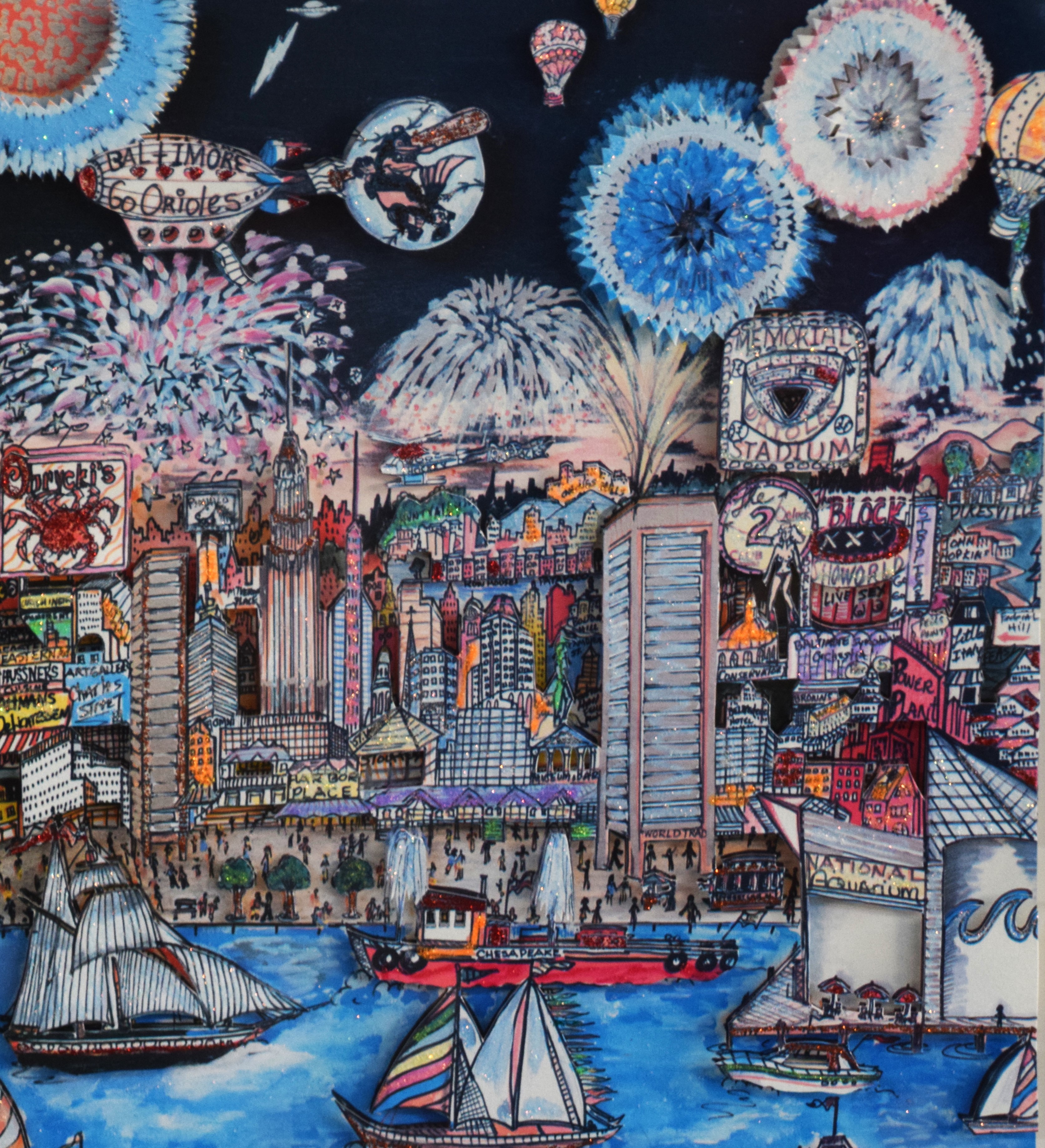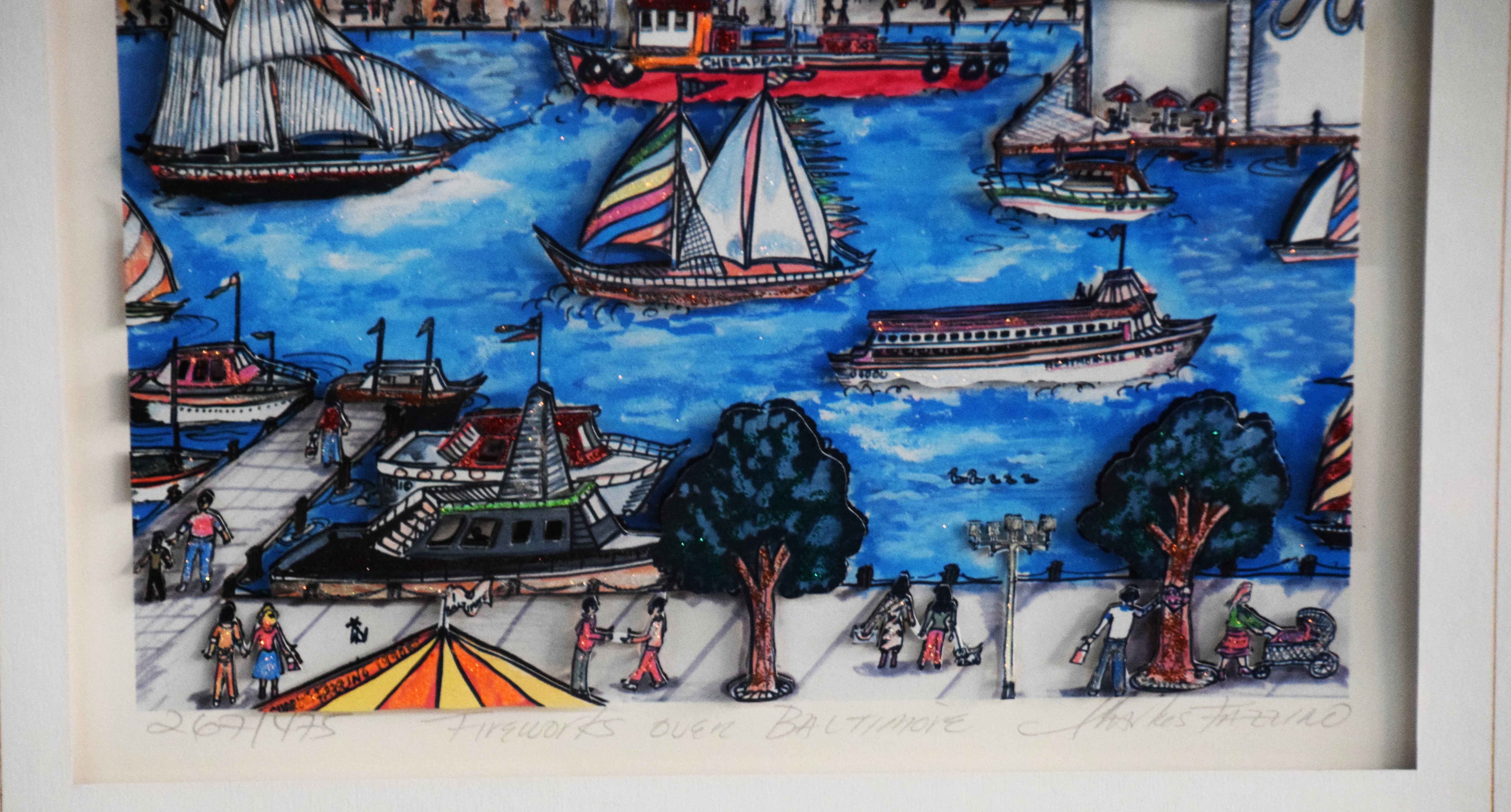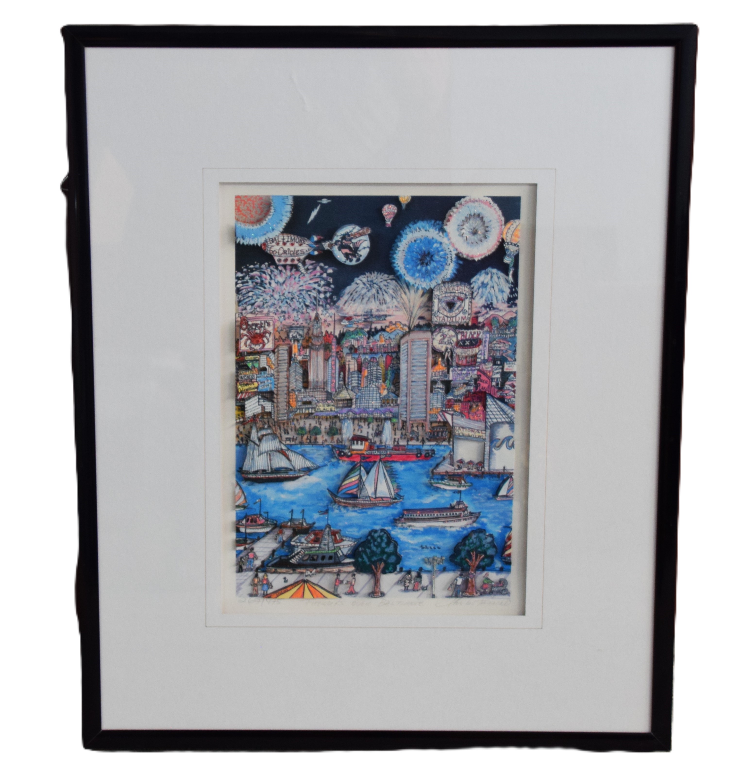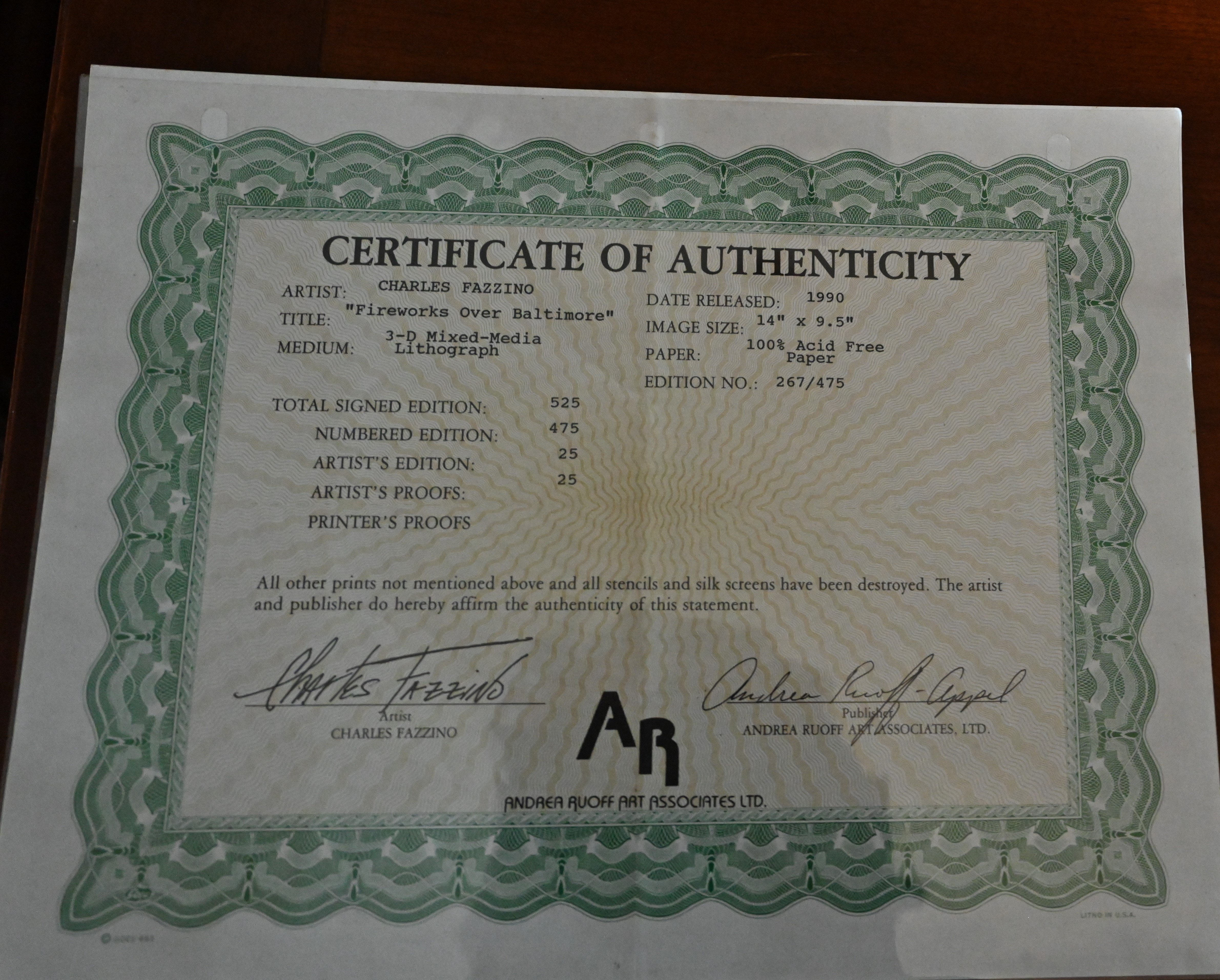 Colorful, framed and signed, 3-D Serigraph titled “Fireworks Over Baltimore” by Charles Fazzino on museum board. Edition number 267 of 445 with Certificate of Authenticity, dated 1990. Work is signed by the artist on back with a colorful note. Charles Fazzino (Born 1955) works in New York and is known for 3-D graphics, kinetic sculpture, serigraphs. Fazzino has also immortalized locales such as Boston, New York and Philadelphia. Dimensions: 14″ x 9″ Image size
