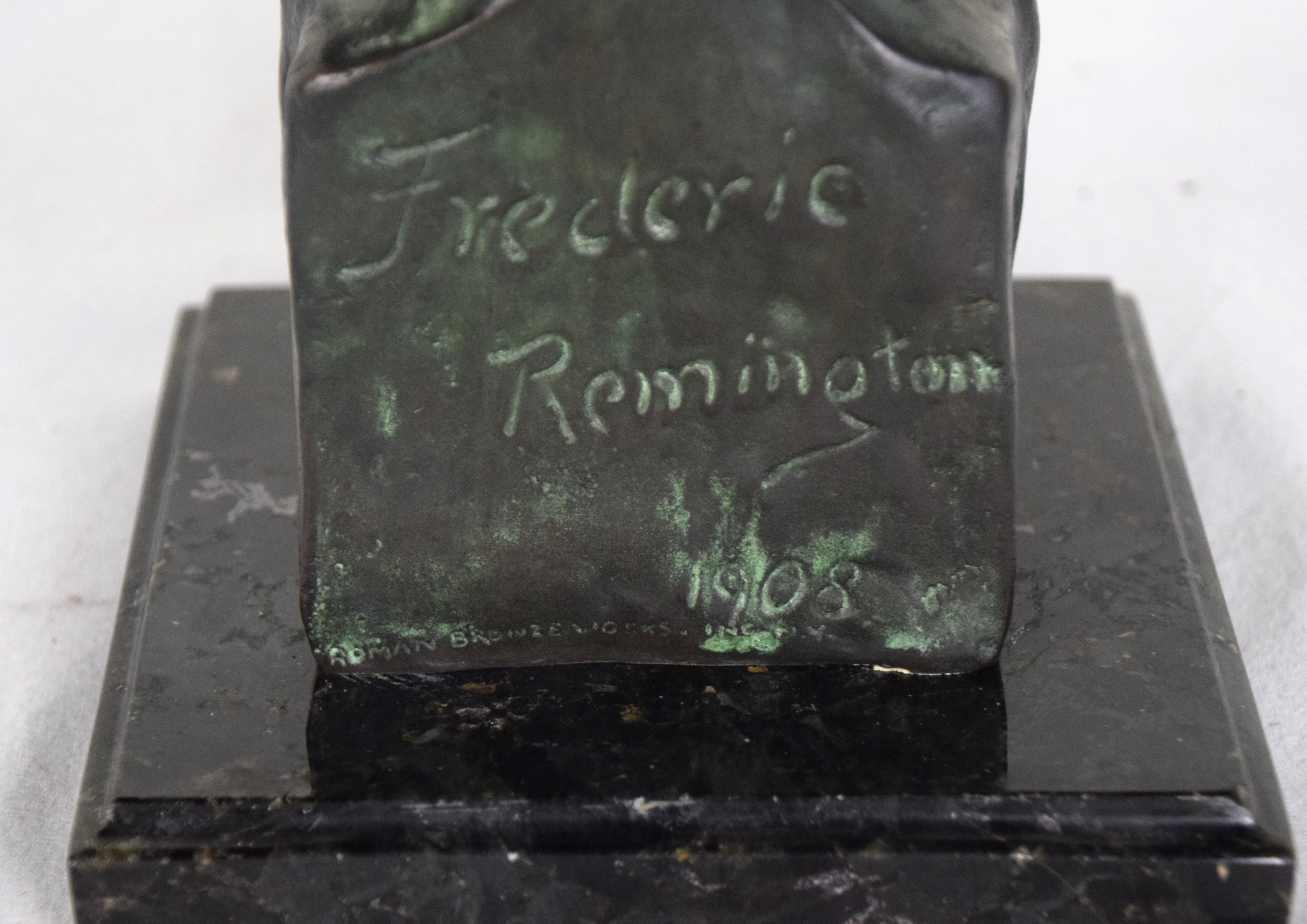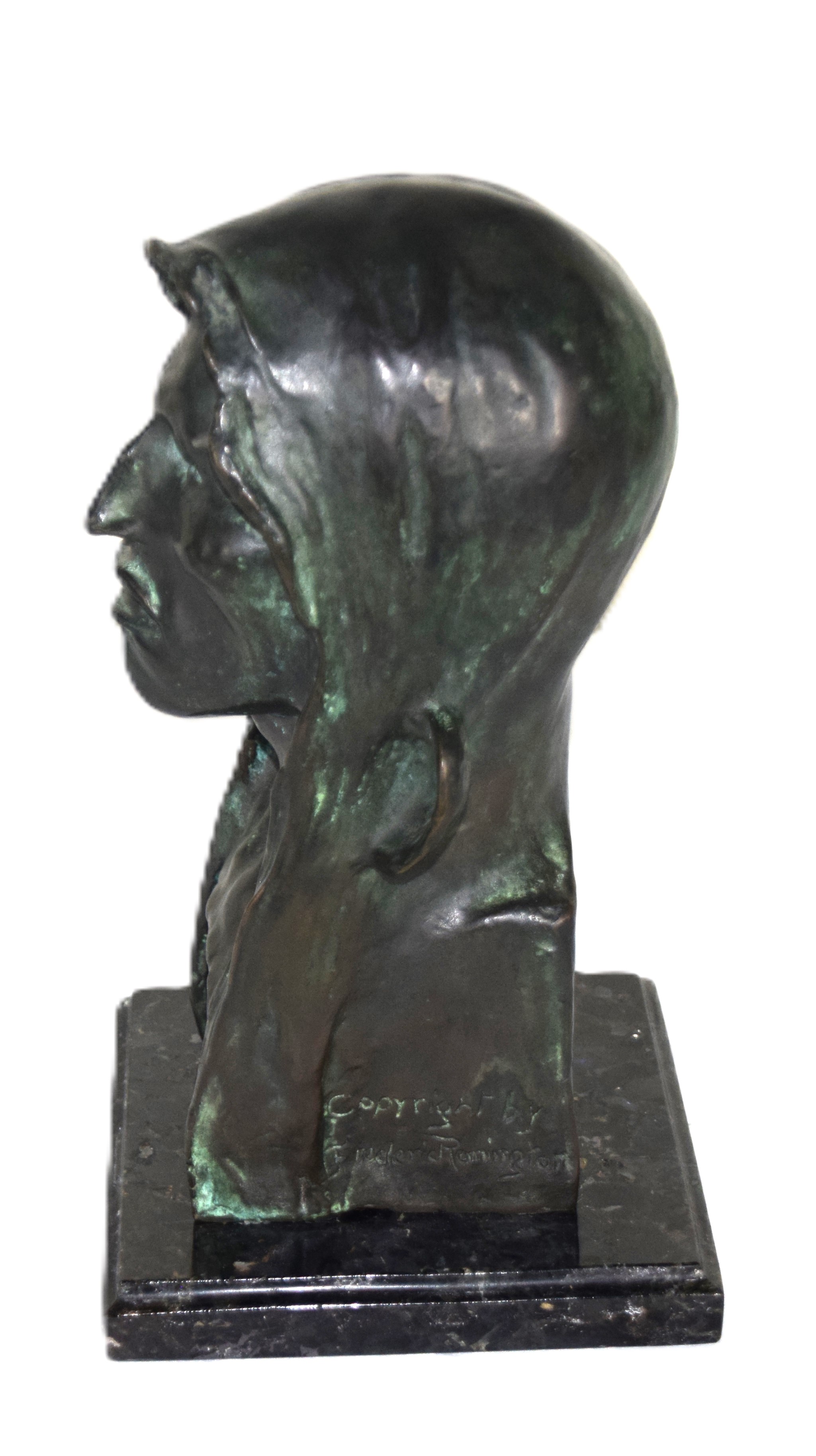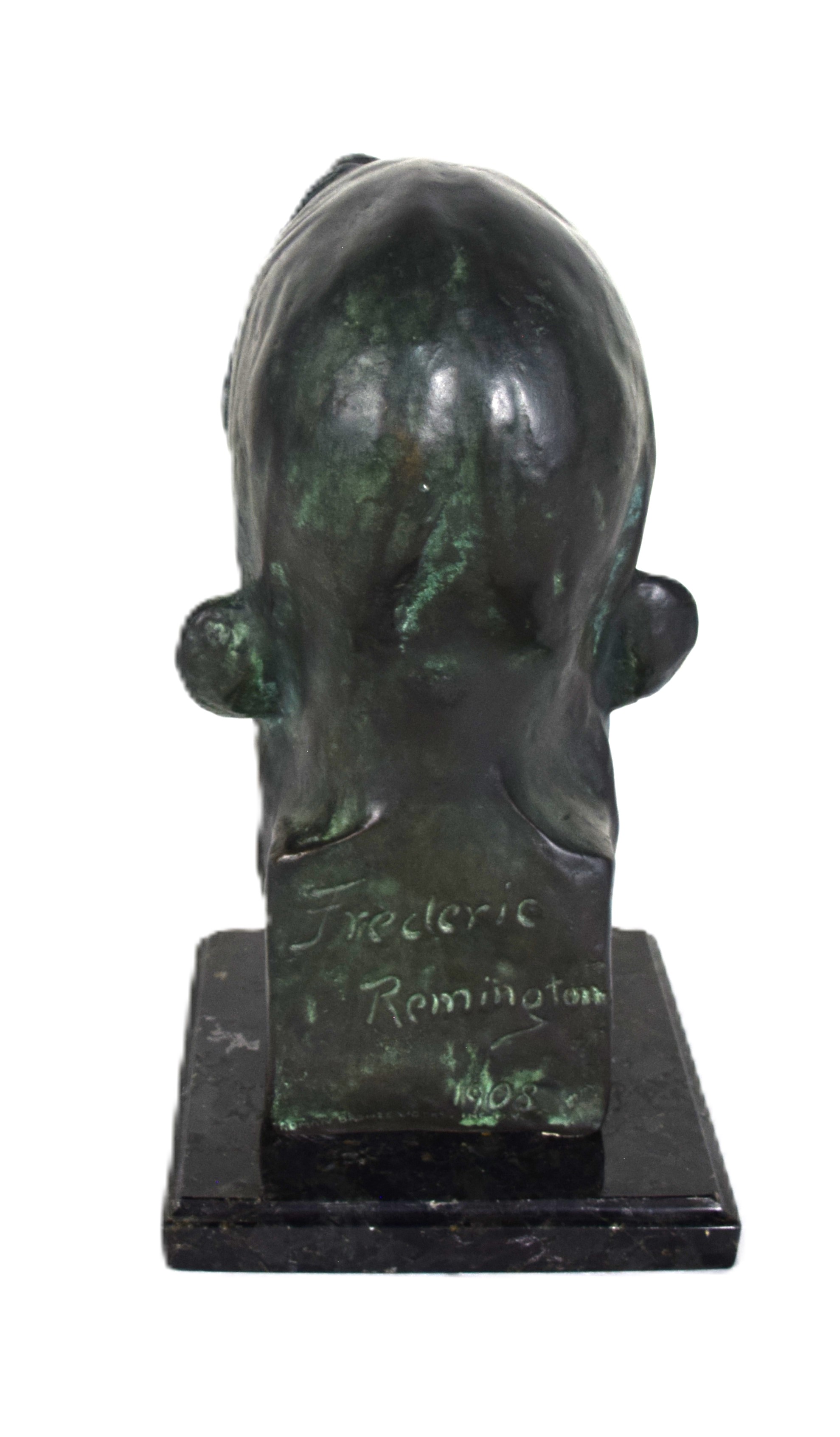 Bronze on black metal base of Frederick Remington’s “Savage”. Signed “Copyright by Frederick Remington, 1908”. Cast by the Roman Bronze Works. Frederic Sackrider Remington (1861 – 1909) is known for Western painting and sculpture. In 1900 Remington began working exclusively with the Roman Bronze Works, New York. They produced his bronzes using the lost-wax bronze casting process until his death in 1909. Dimensions: 11″ H