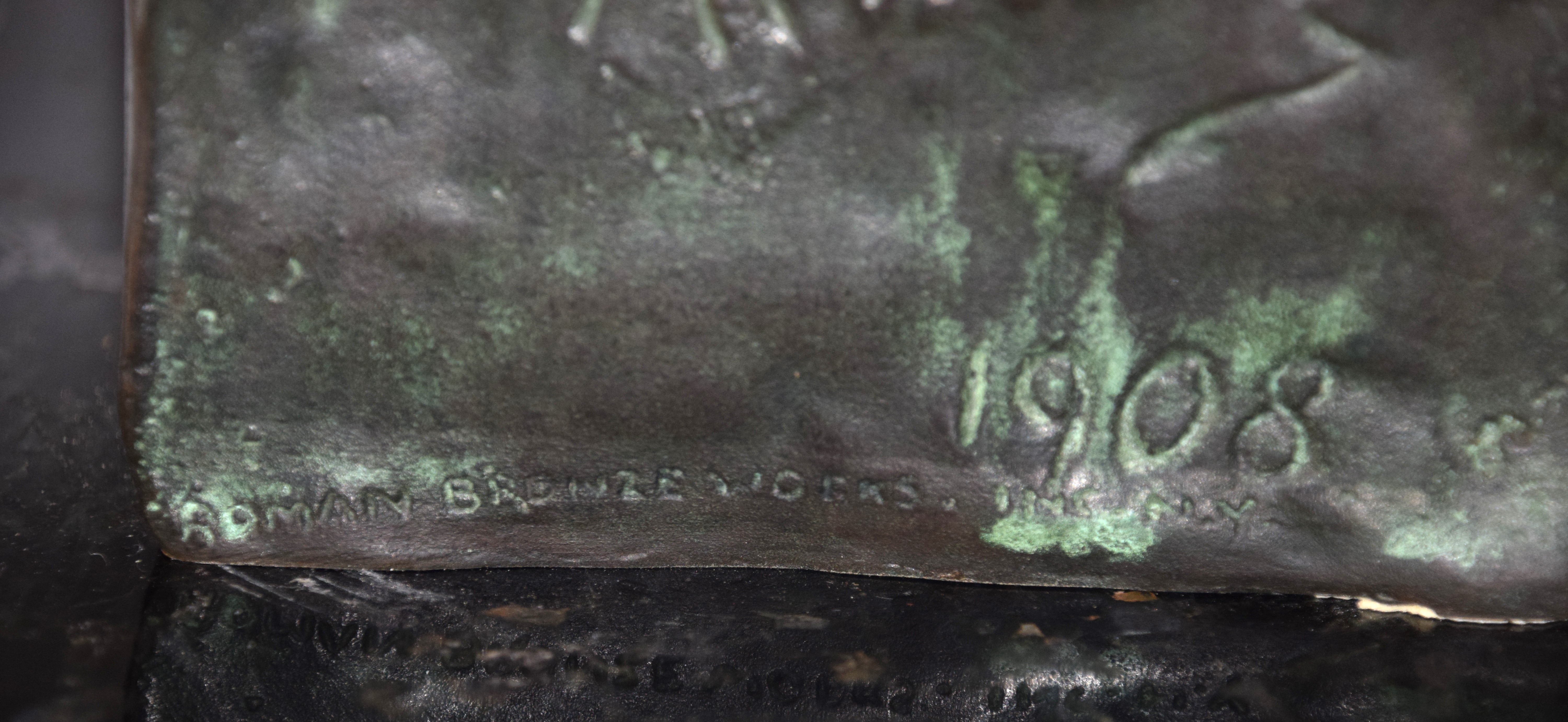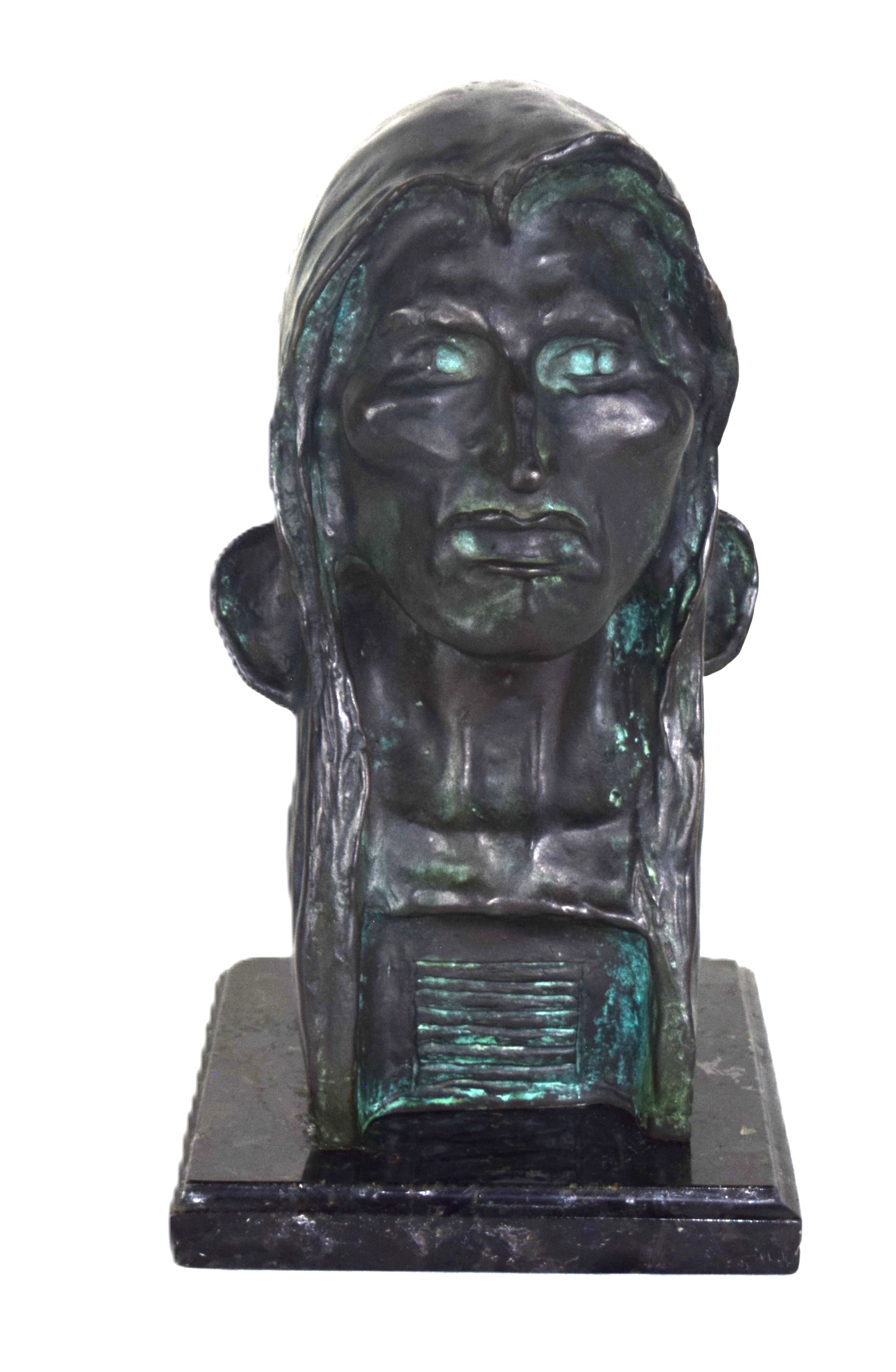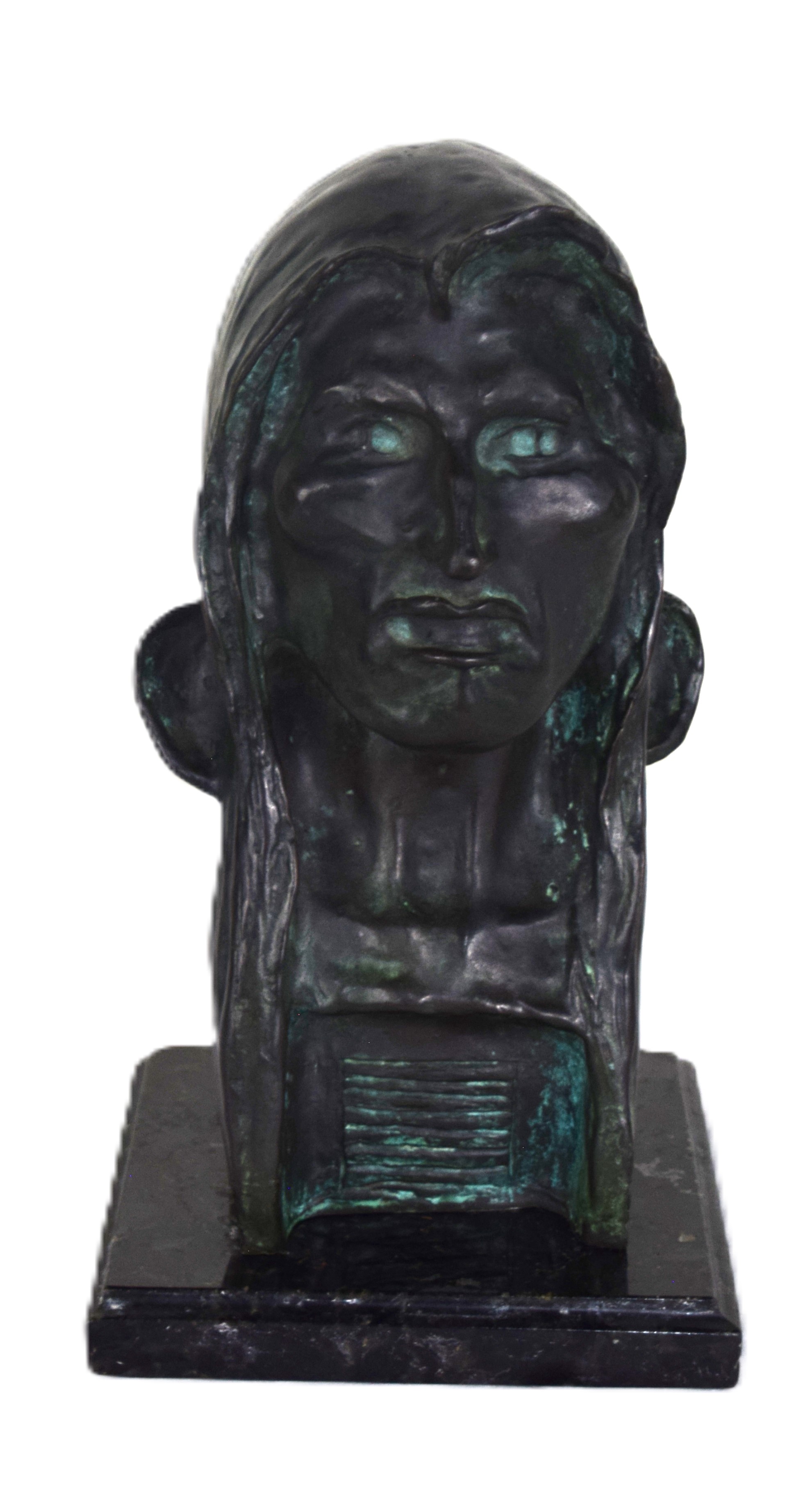 Bronze on black metal base of Frederick Remington’s “Savage”. Signed “Copyright by Frederick Remington, 1908”. Cast by the Roman Bronze Works. Frederic Sackrider Remington (1861 – 1909) is known for Western painting and sculpture. In 1900 Remington began working exclusively with the Roman Bronze Works, New York. They produced his bronzes using the lost-wax bronze casting process until his death in 1909. Dimensions: 11″ H
