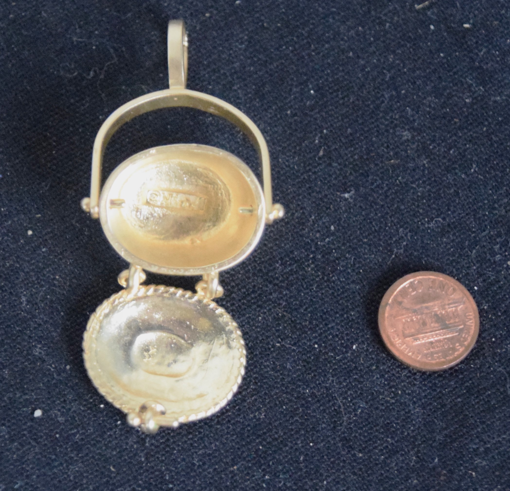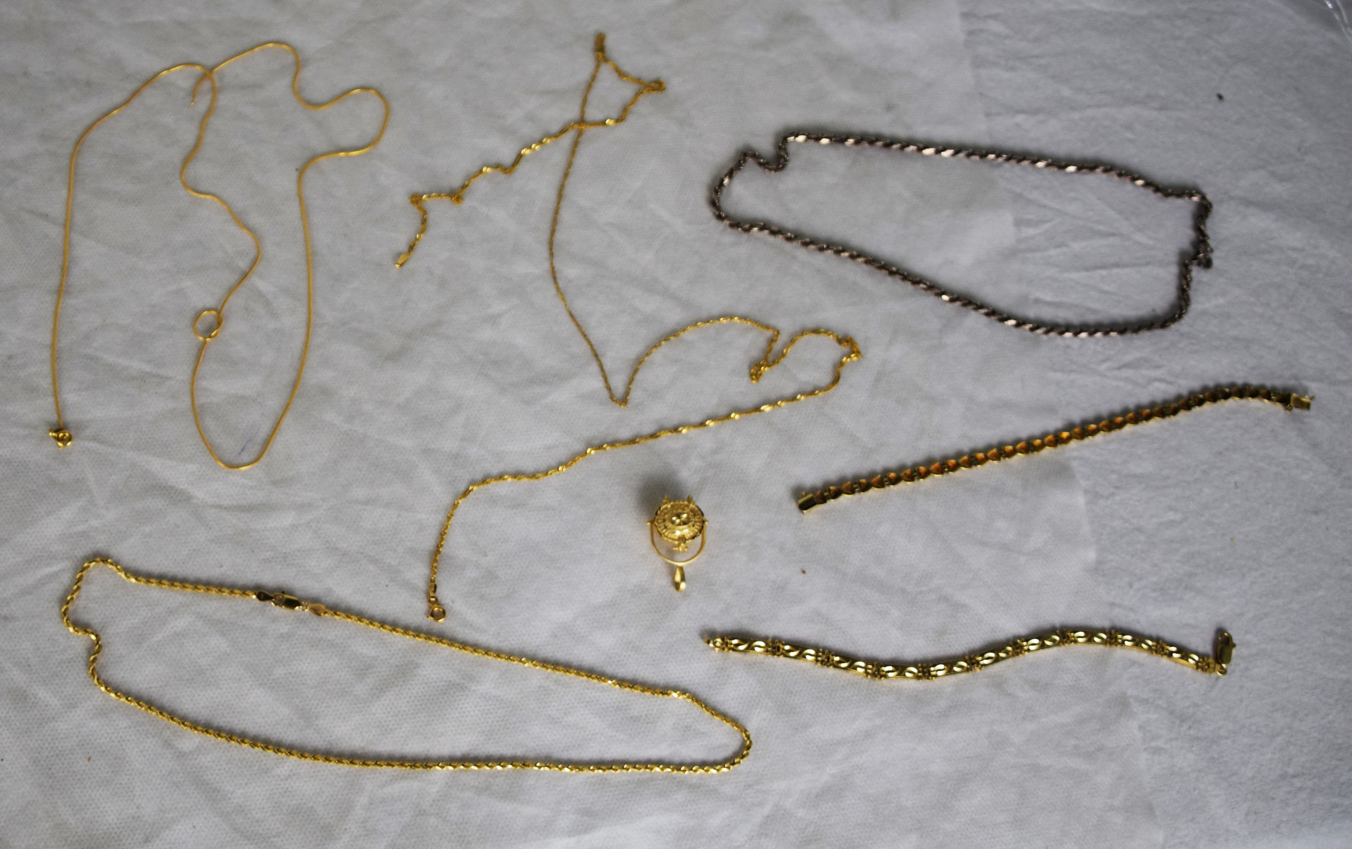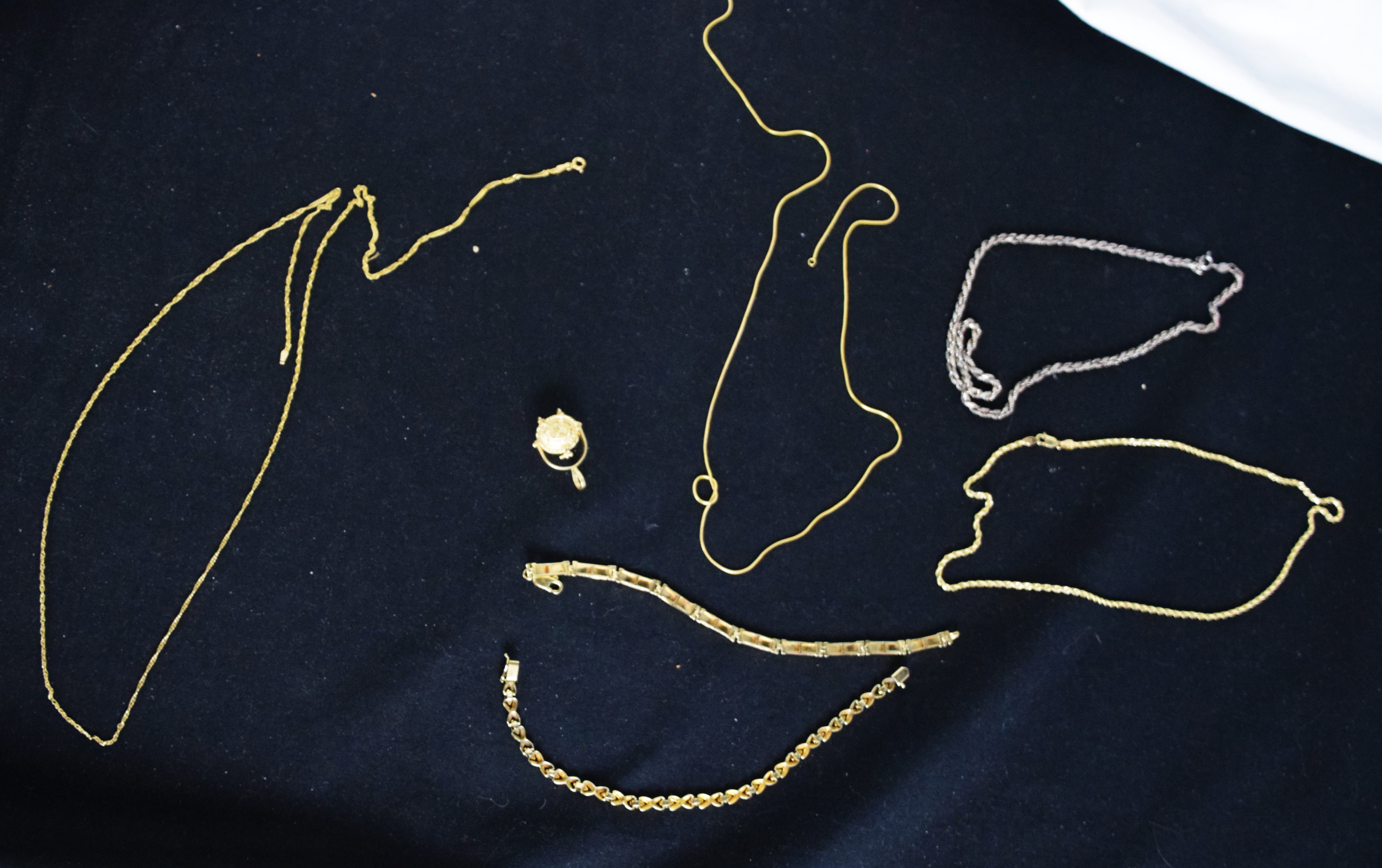 Two 14K gold necklaces 19″ L and 17″ L of 12.4 grams and, one 10K gold necklace 14″ L and a 10K gold bracelet 7″ L totaling 10.4 grams, along with a gold charm of 6.7 grams. In addition is a Sterling silver necklace.