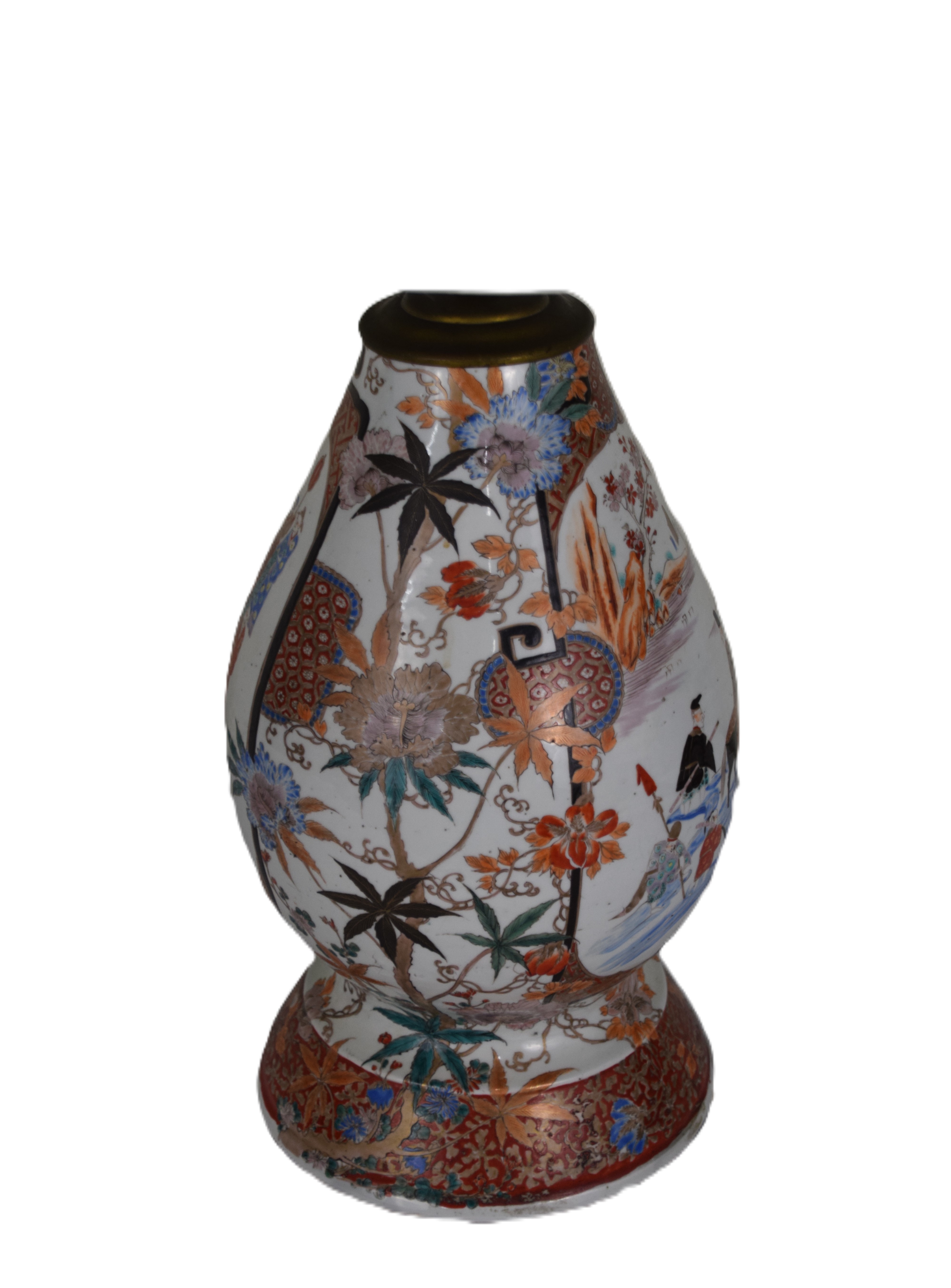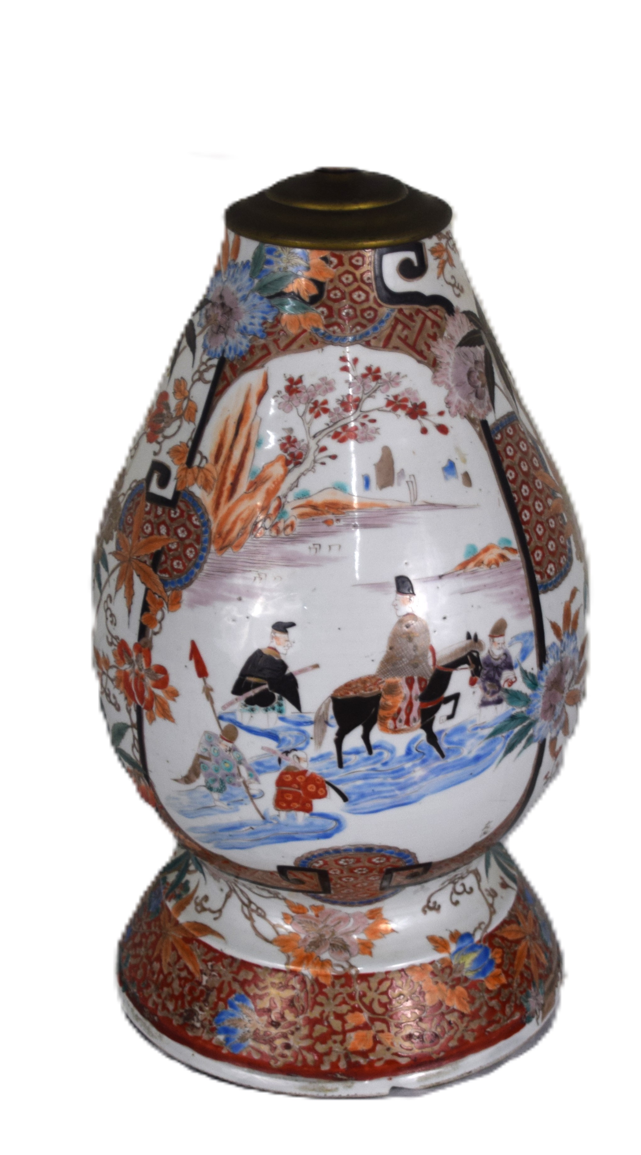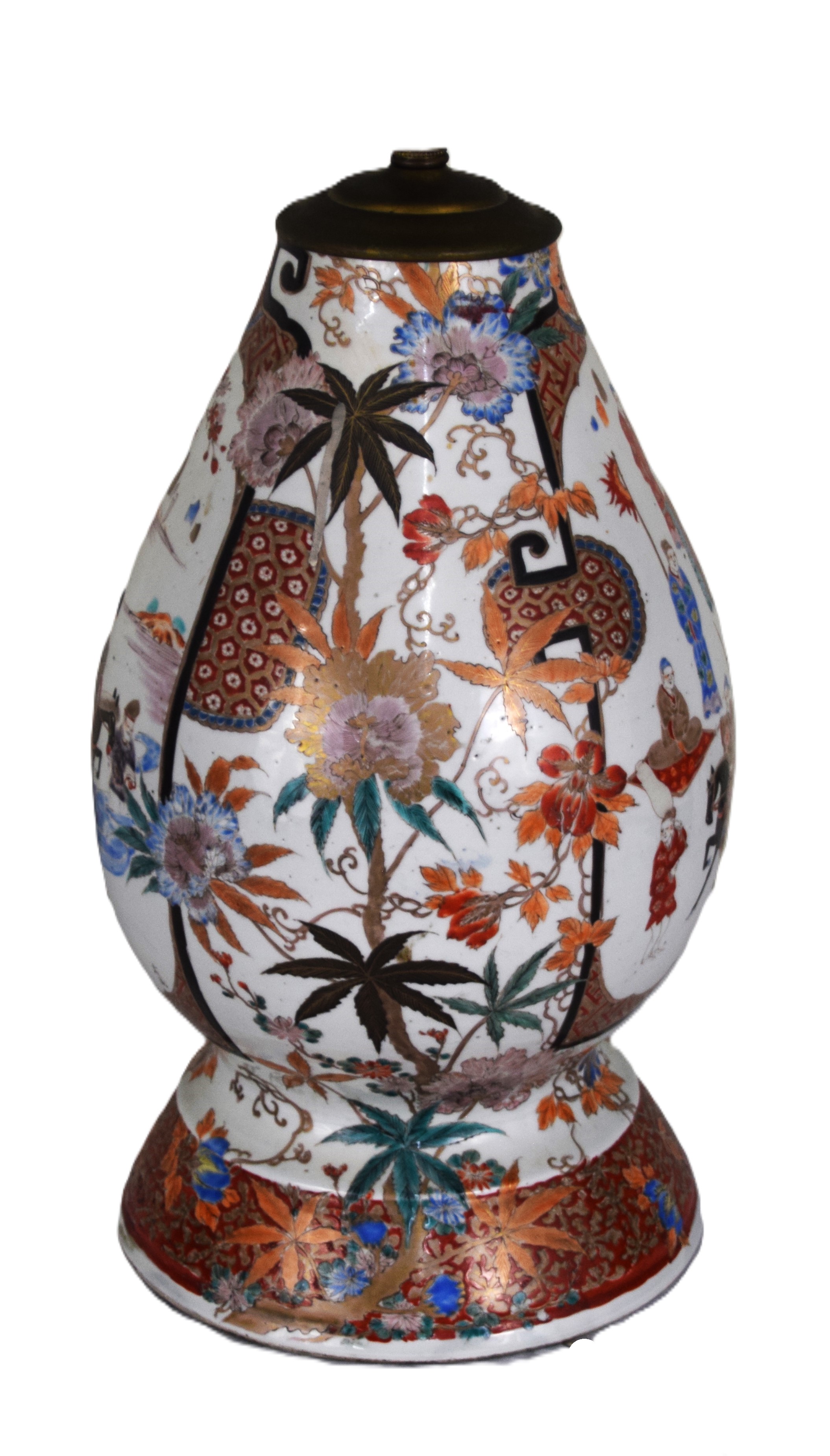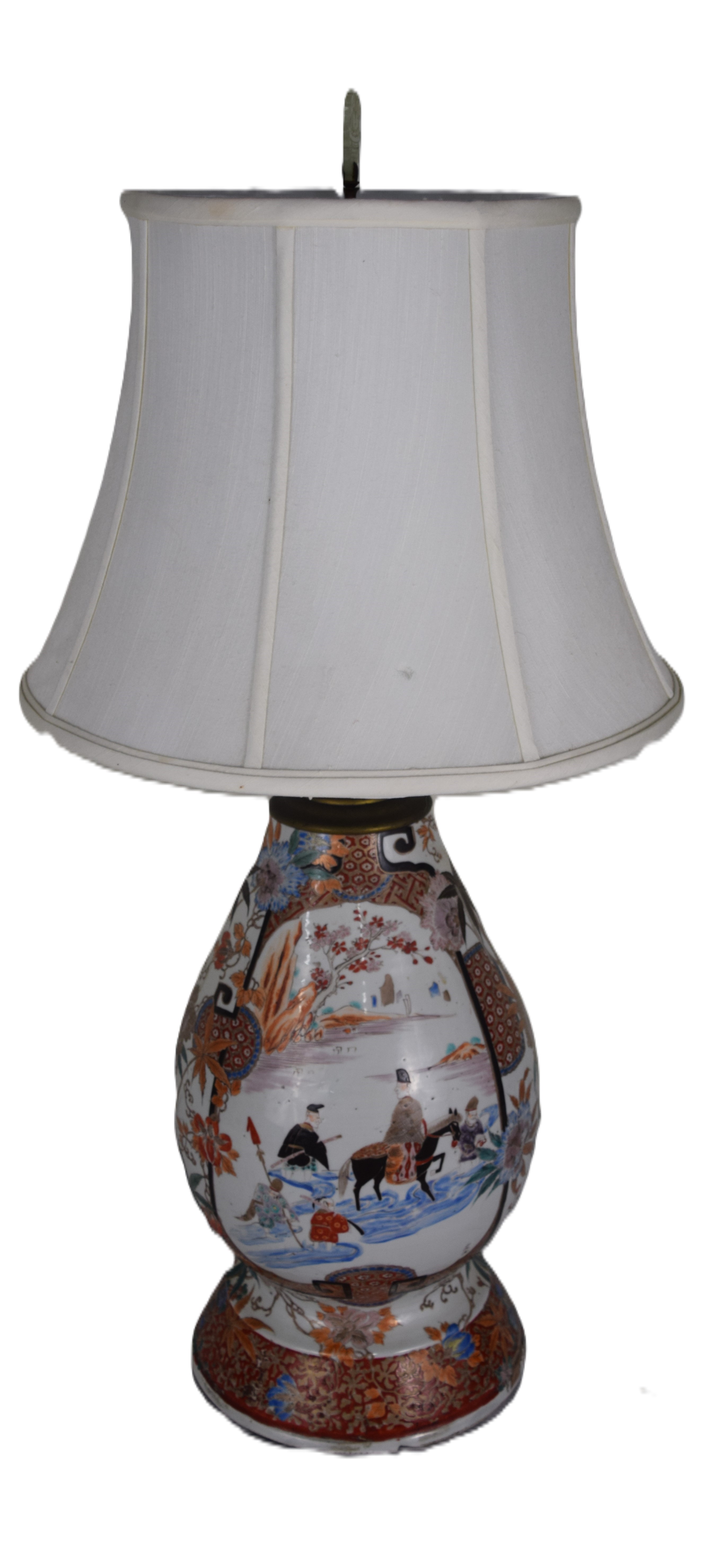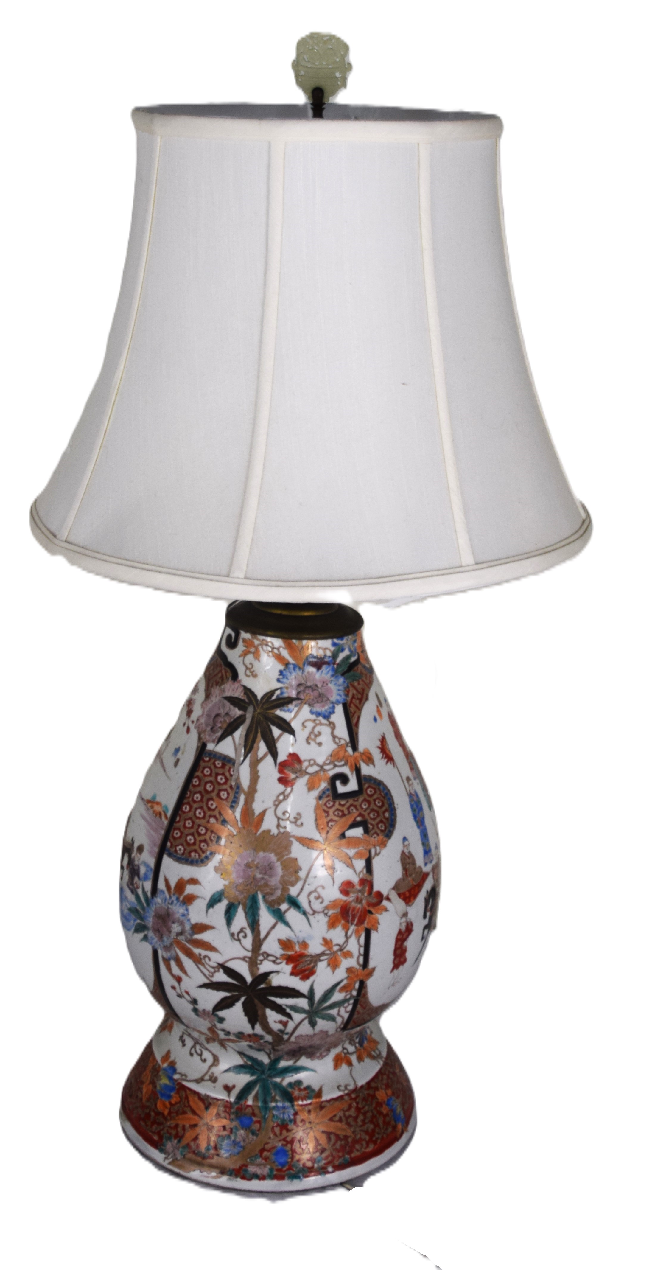 Impressive Chinese porcelain oriental table lamp, decorated with multi-people design and flowers and with a linen shade. From the David Sargent Collection, New London, NH. Dimensions: 33″ with shade