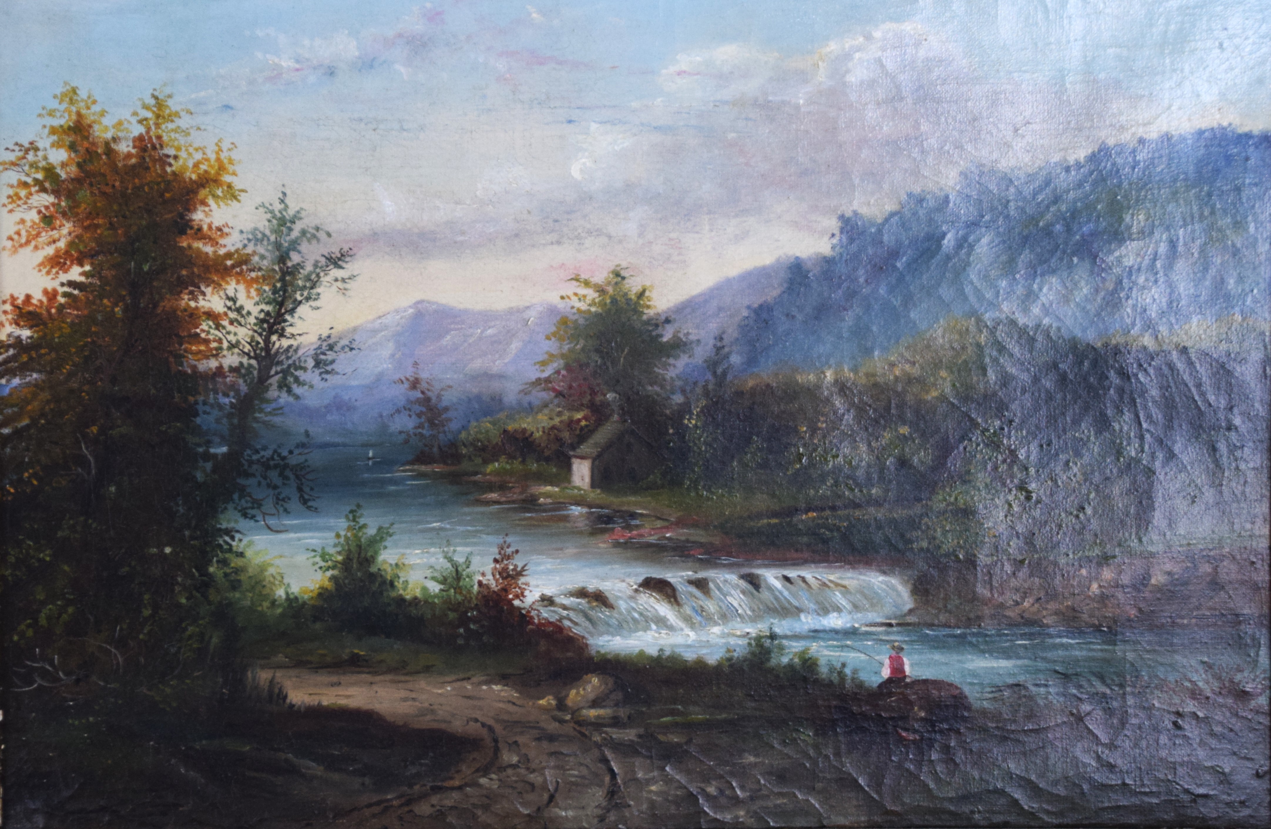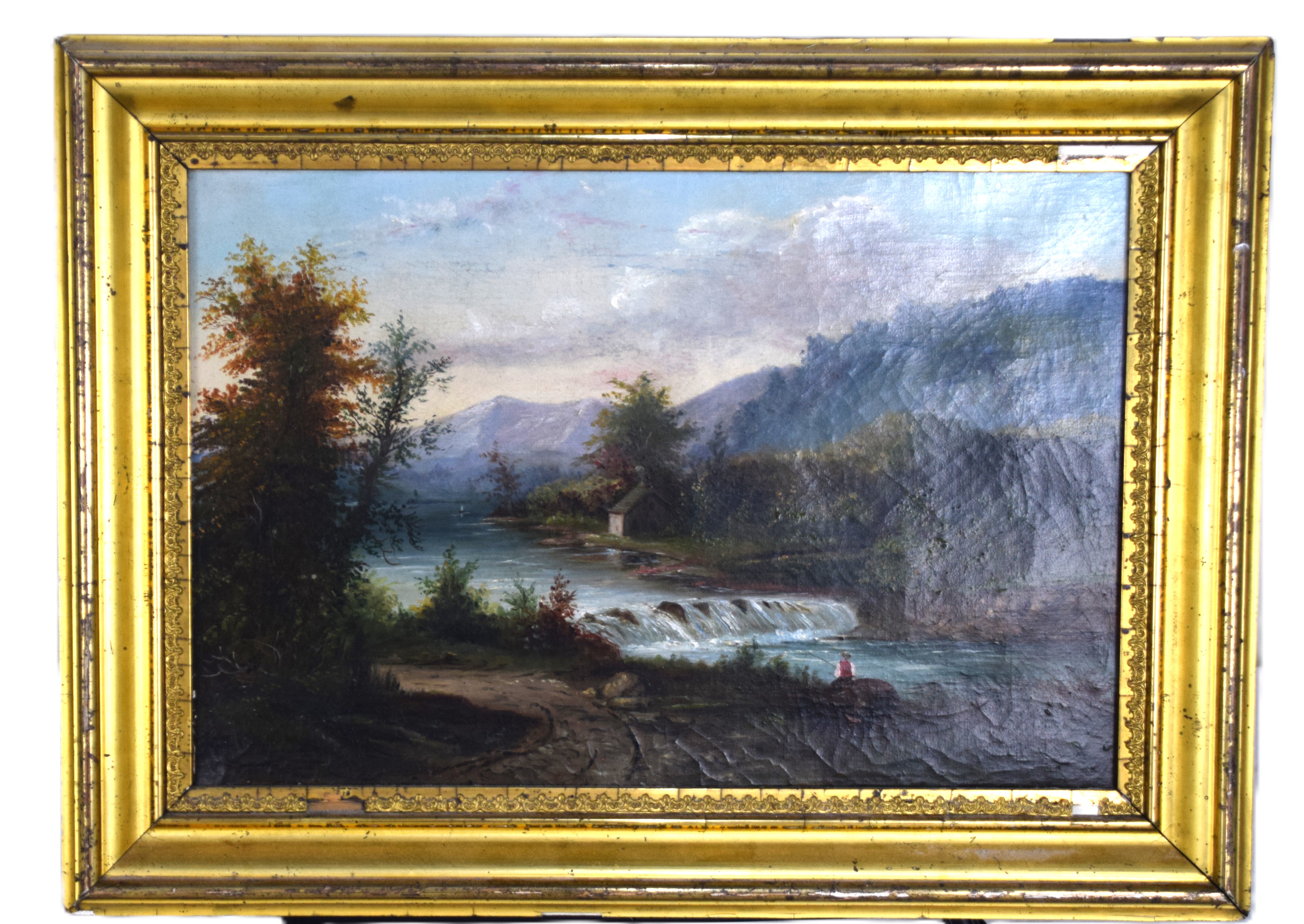 Framed, 19th Century White Mountain landscape along a river with waterfall, cottage and fisherman with mountains in the foreground. Provenance: Ed Weissman. Dimensions: 12″ x 18″