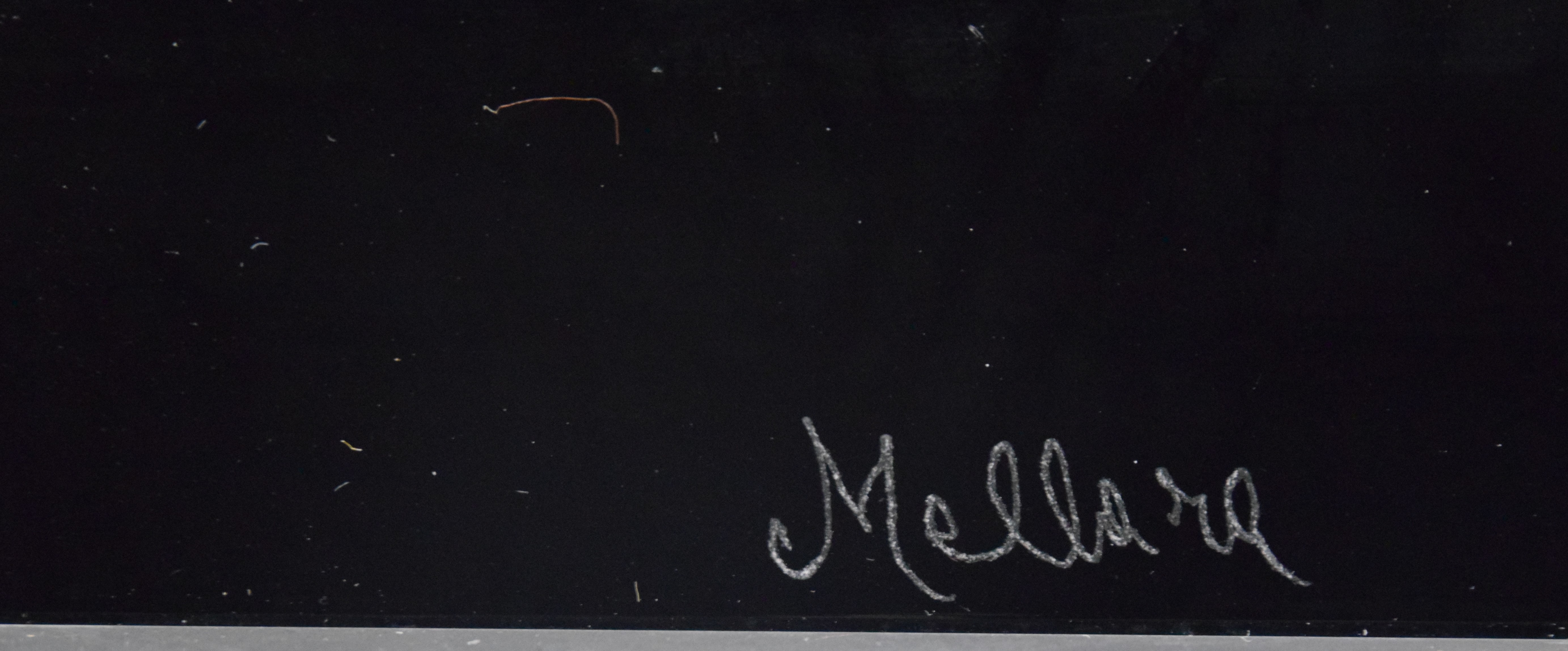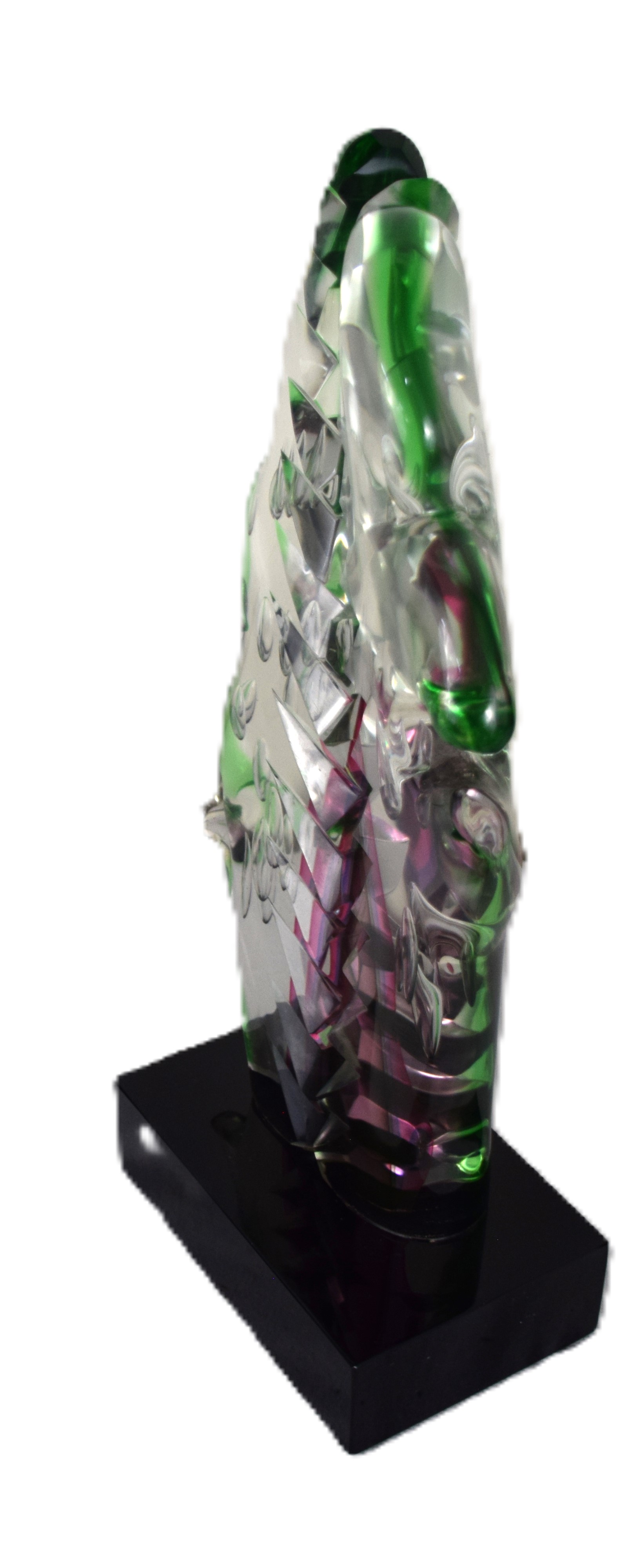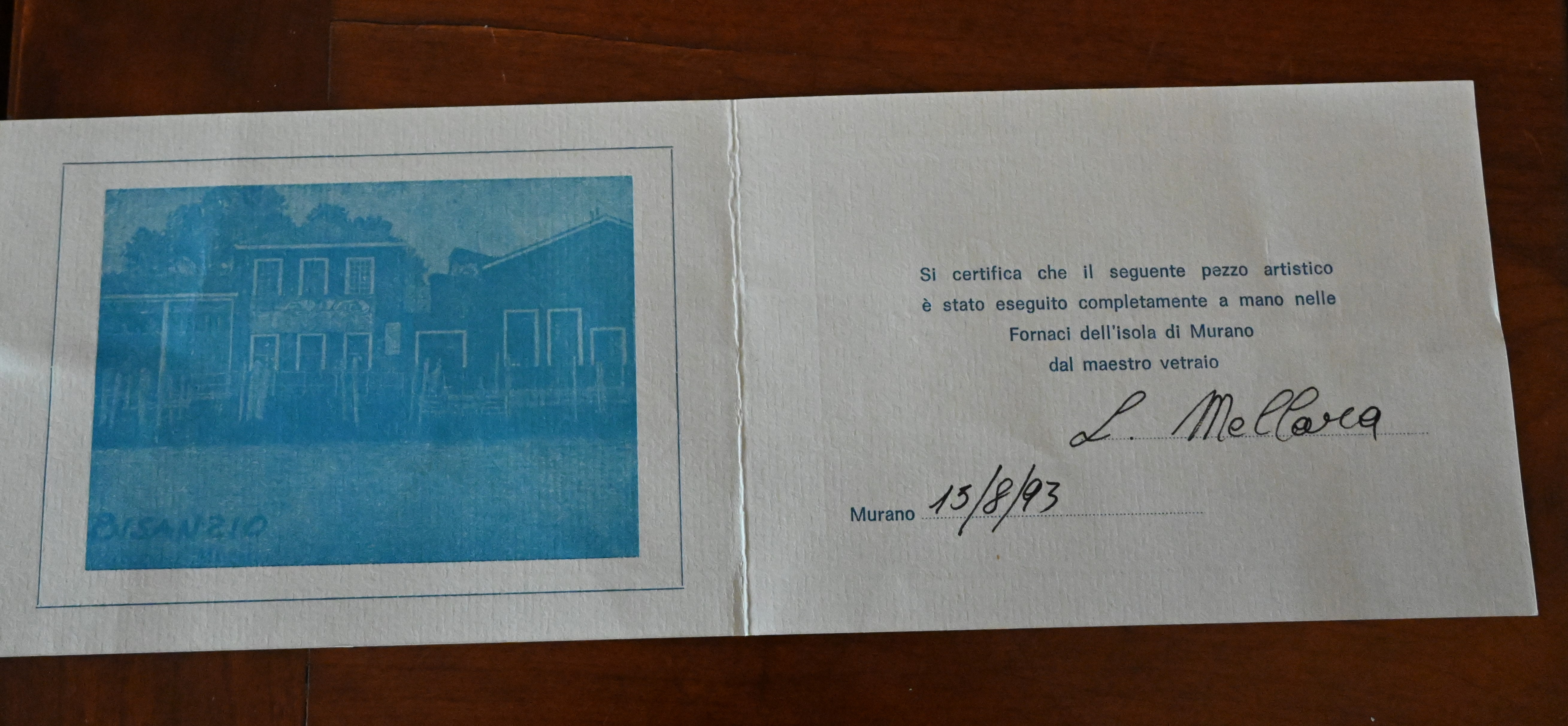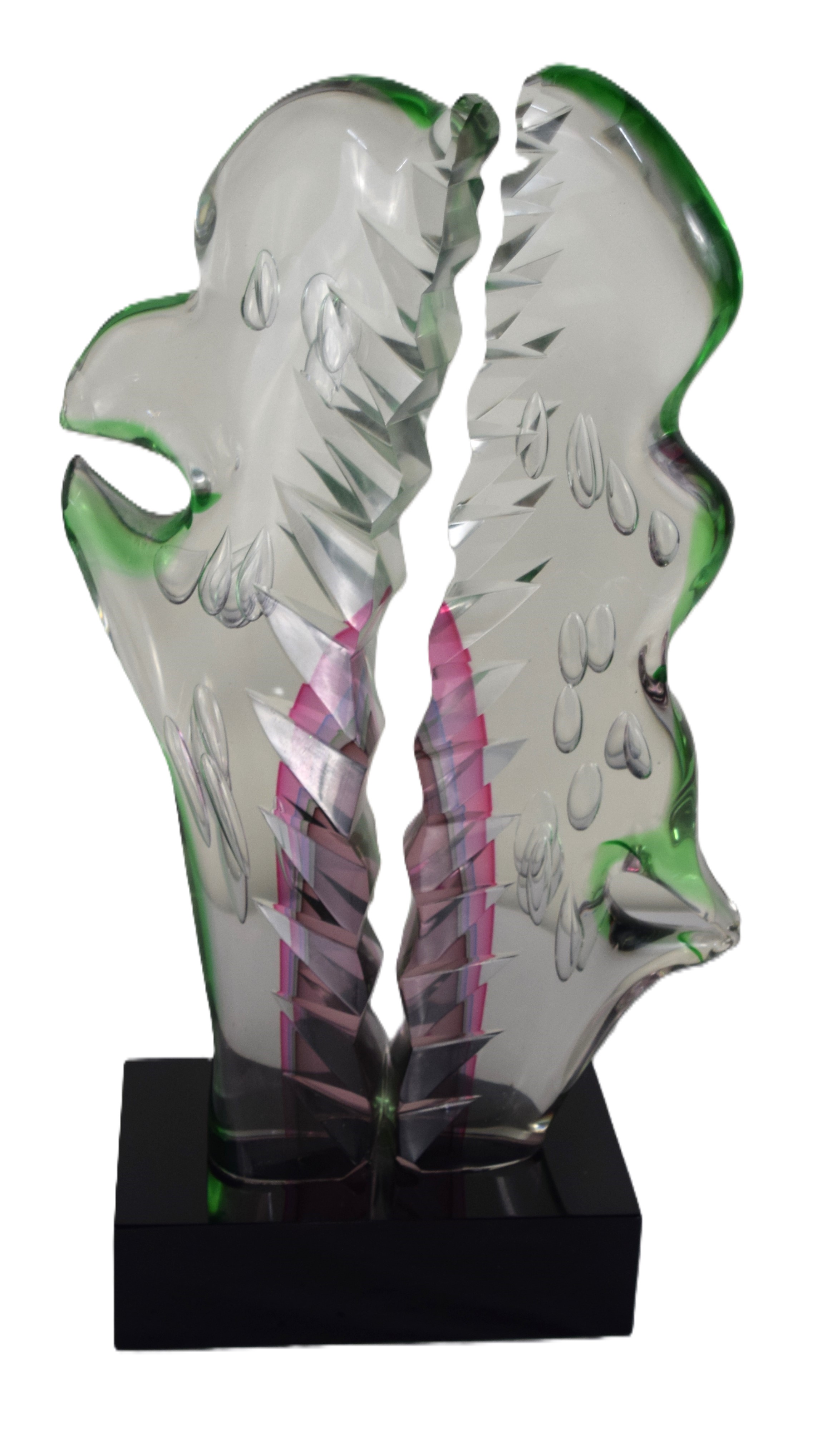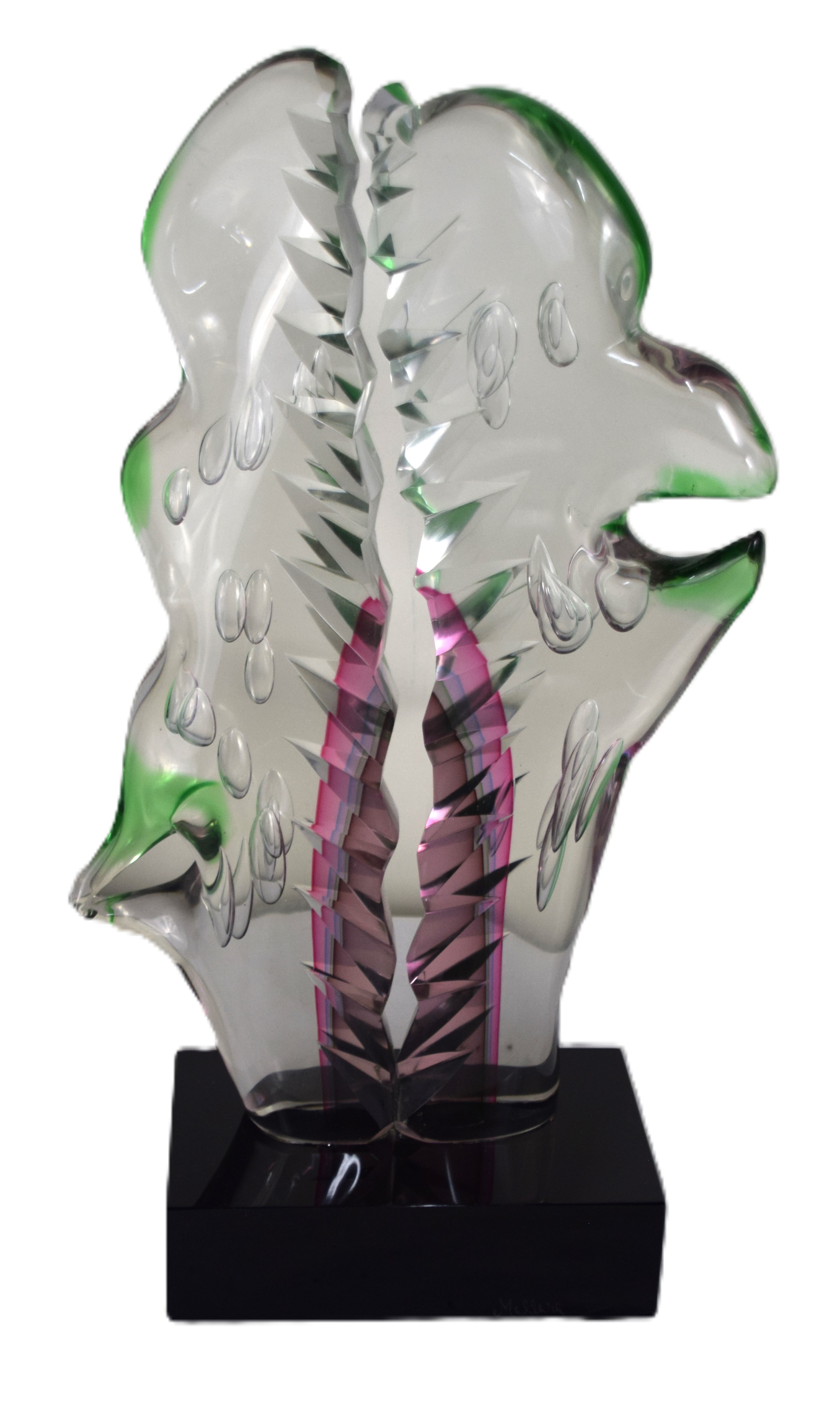 Attractive glass sculpture crafted by Murano artist Luigi Mellara, signed on bottom on black base. Colored glass has been overlaid/submersed by a layer of clear glass called the Sommerso technique. Luigi Mellara was born in 1952, he studied glass making under Alfredo Barbini & later worked for Licio Zanetti. In the 1980’s he owned his own studio Vetreria Luigi Mellara. Dimensions: 20″ H