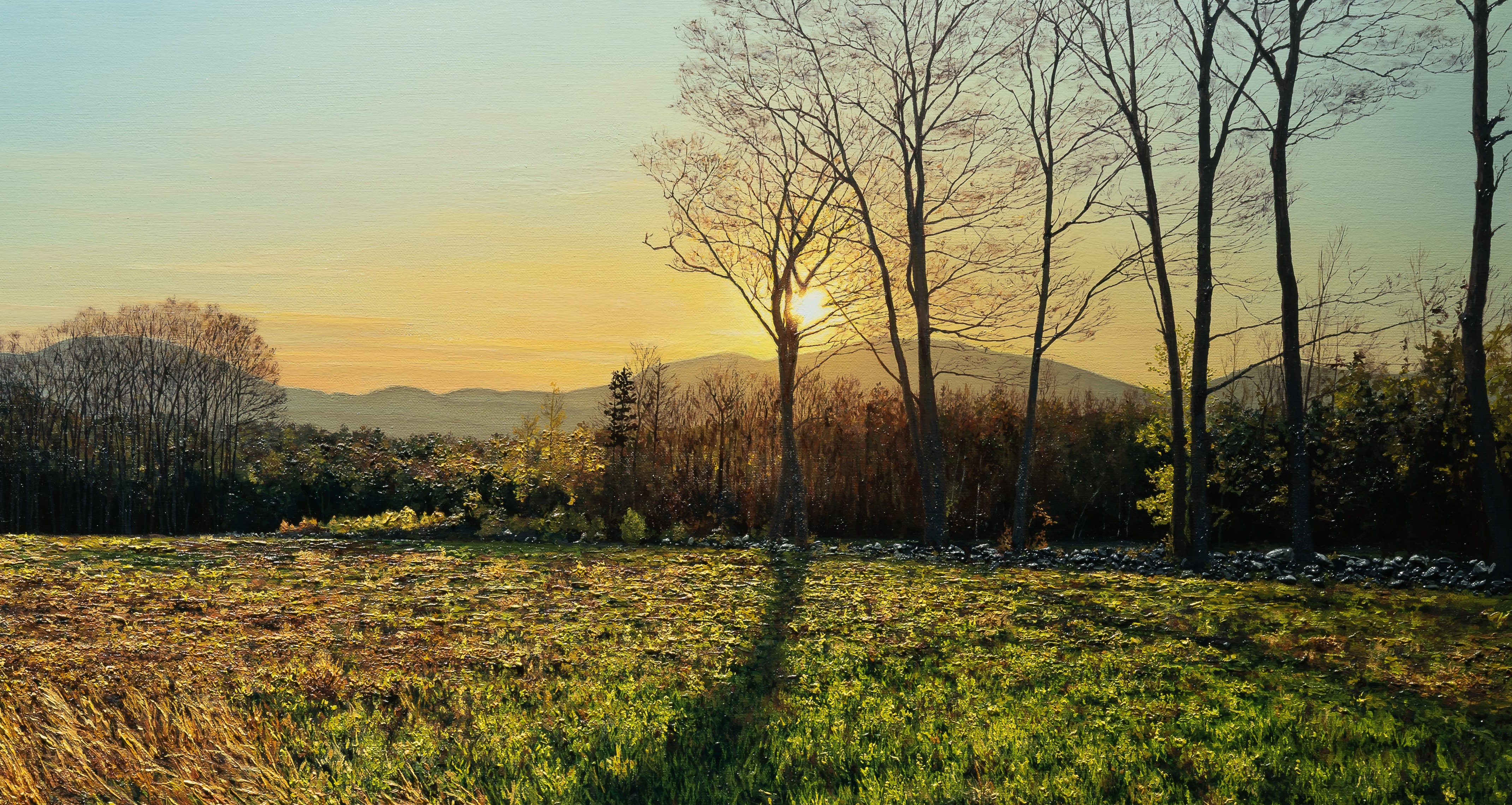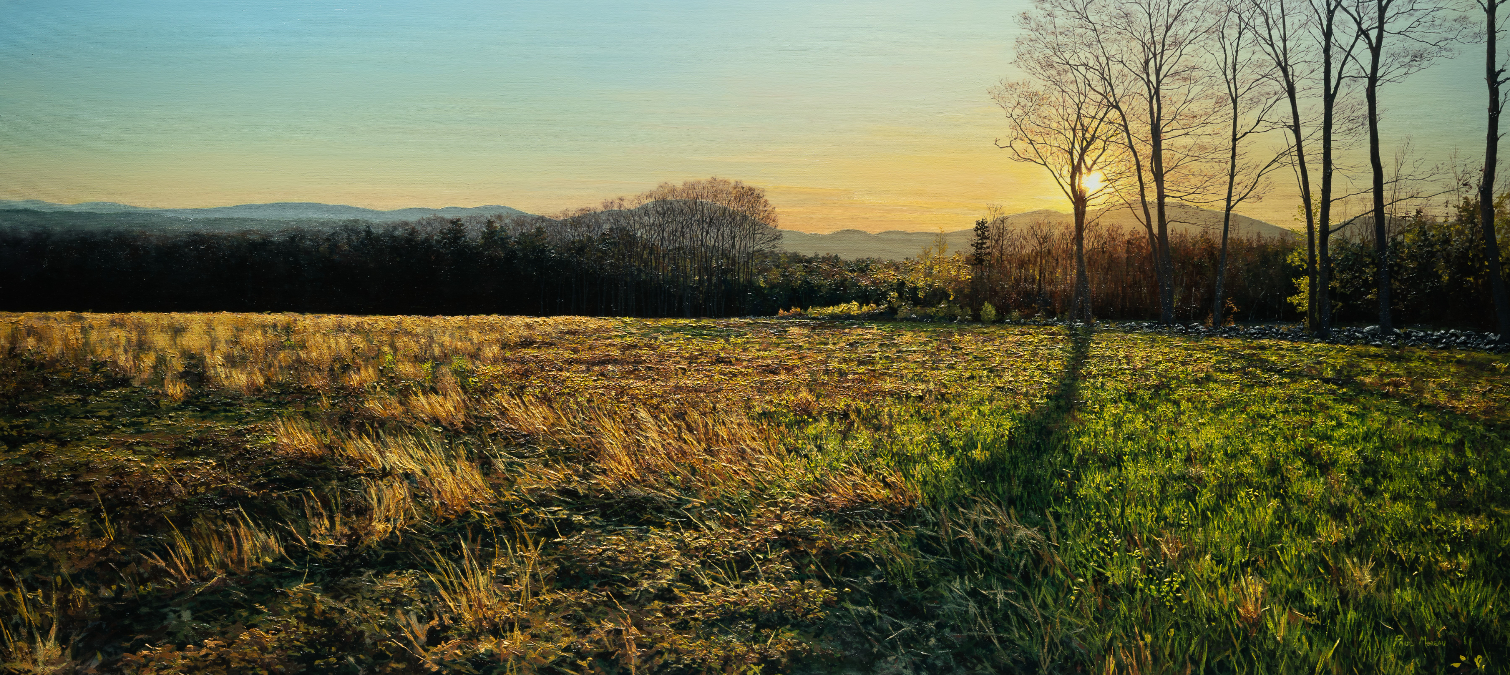 An oil painting on canvas of Tamworth NH, by Paul Moreau. Painting has a dramatic skyline in early evening in tremendous detail. Paul Moreau (b. 1986) is an active oil painter living in New Hampshire who is known for his landscape paintings built on a strong foundation in realism. Dimensions: 22″ x 48″