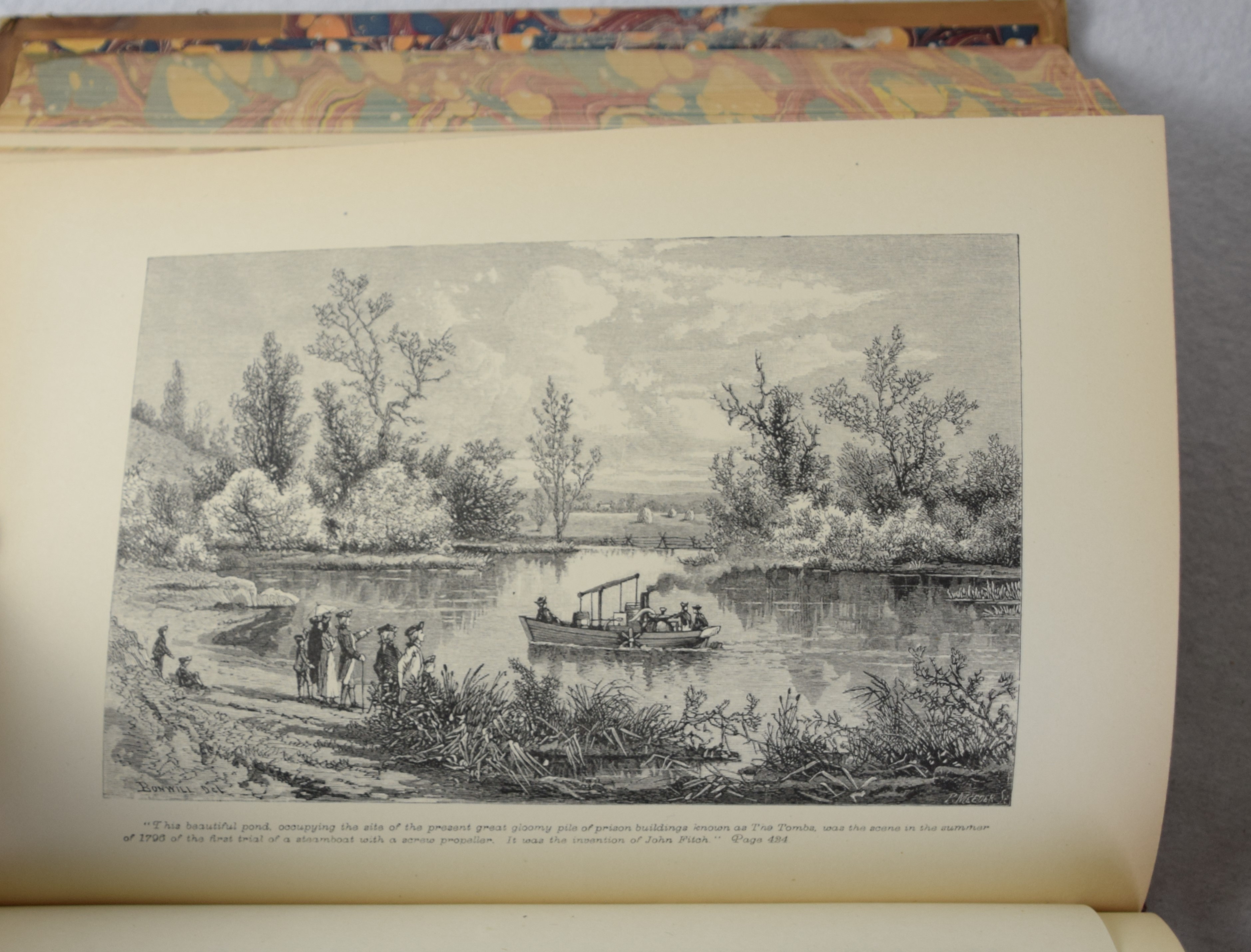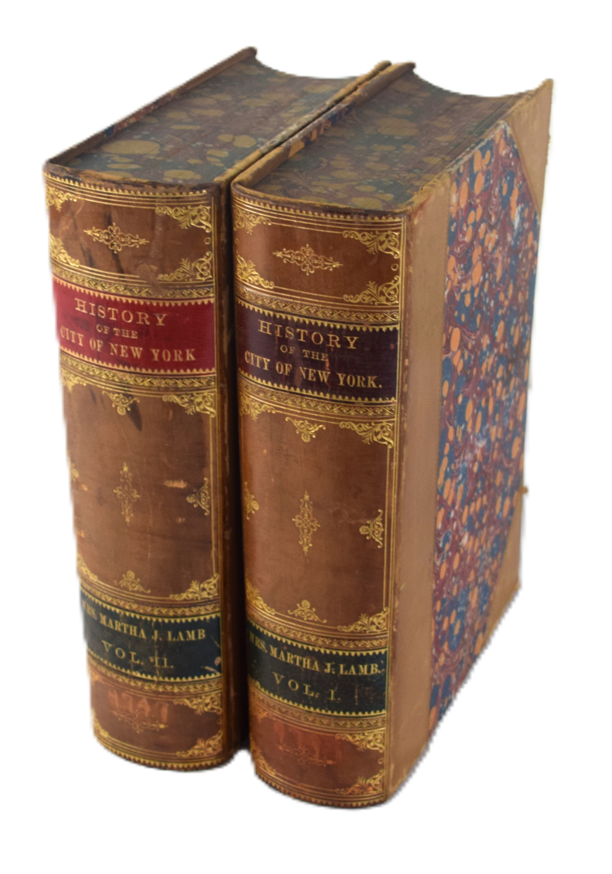 The History of the City of New York in hardcover, 1st Edition in two volumes published in 1877. Original 3/4 tan leather over marbled boards and gilt titles on spine with marbled page edges and end pages. More than 150 illustrations–portraits, maps, buildings, landscapes, etc.– in each volume. 786 pages and 820 pages. At the time of its publication, this work was reputed to be “the most complete history ever published of any city in the world.”