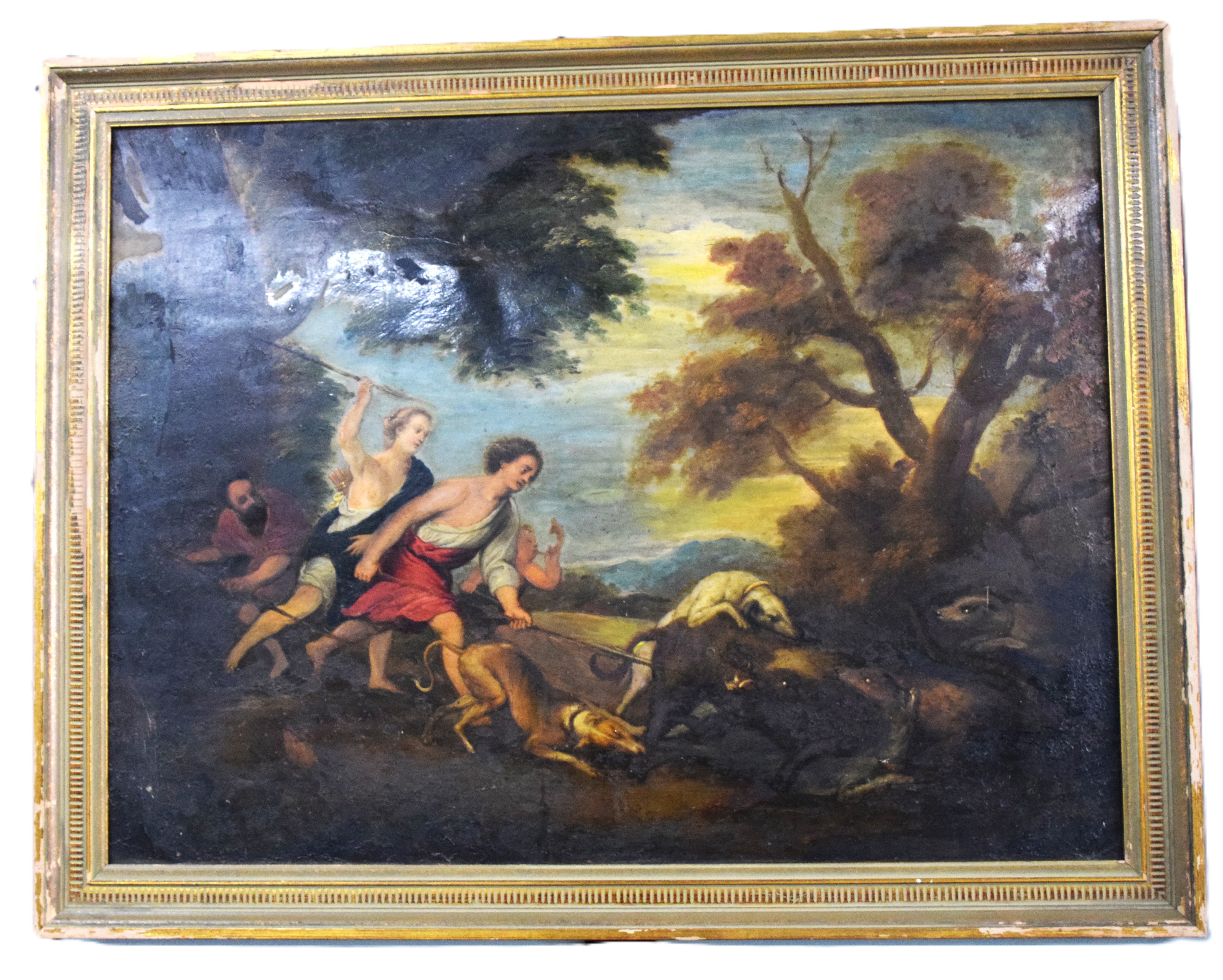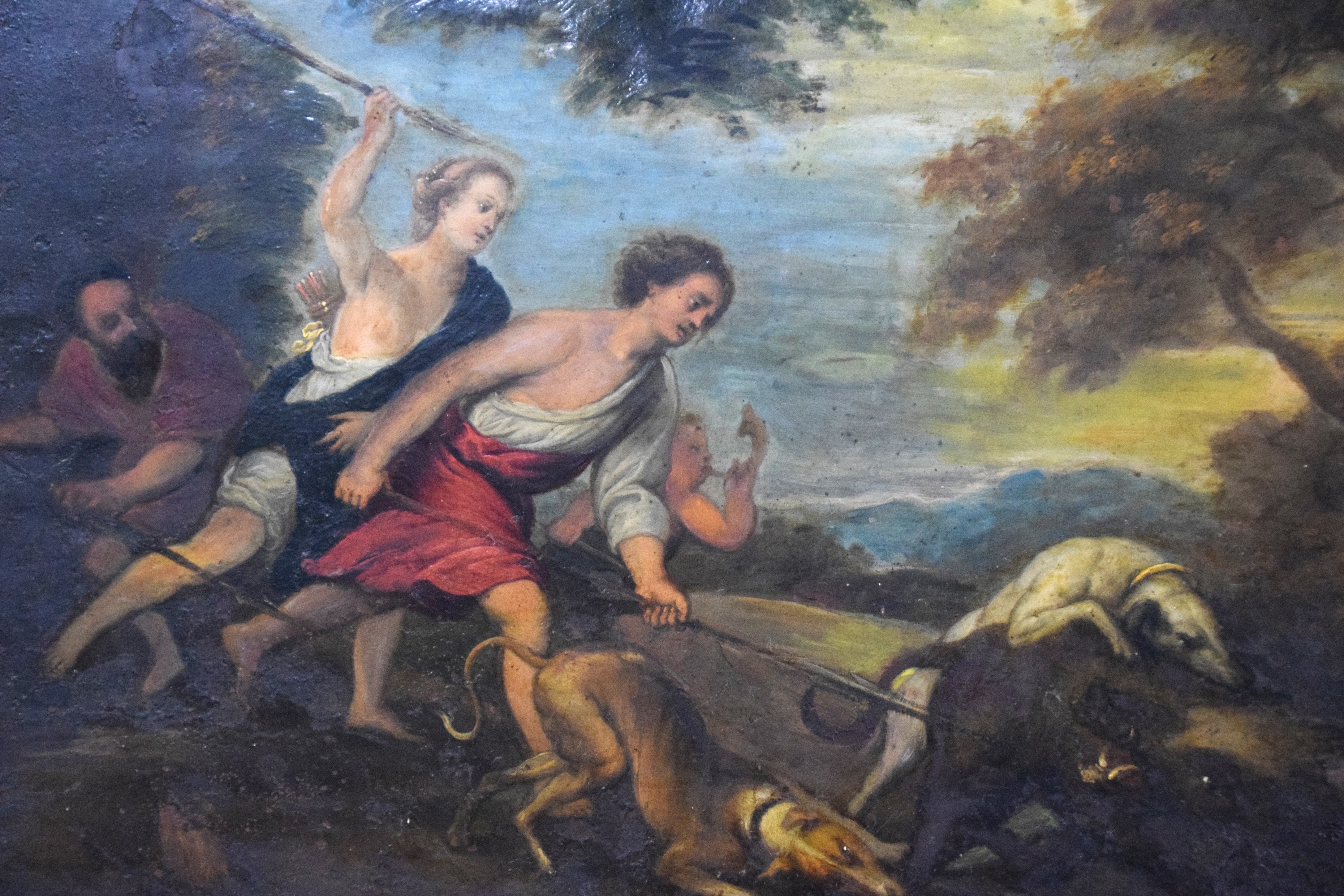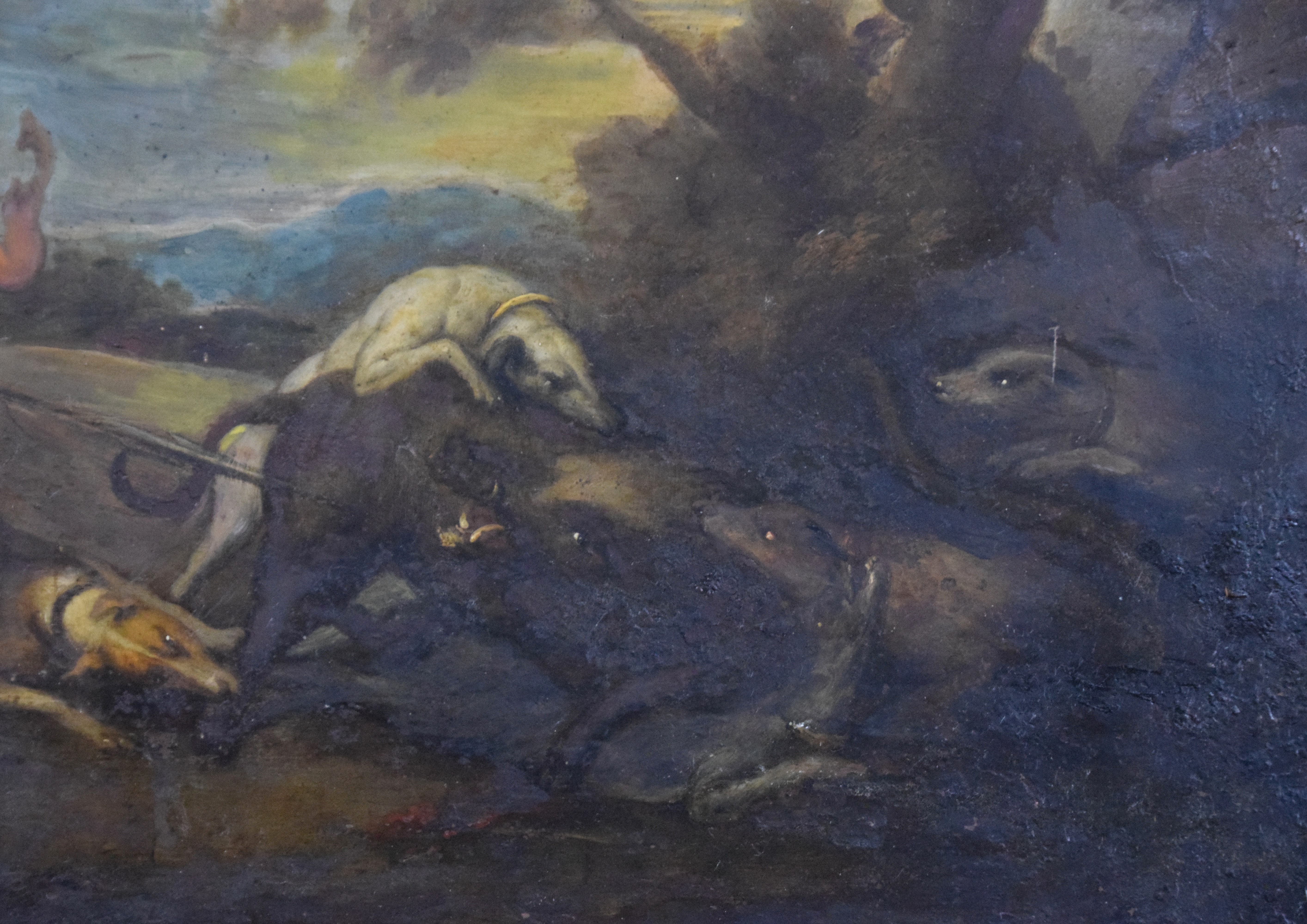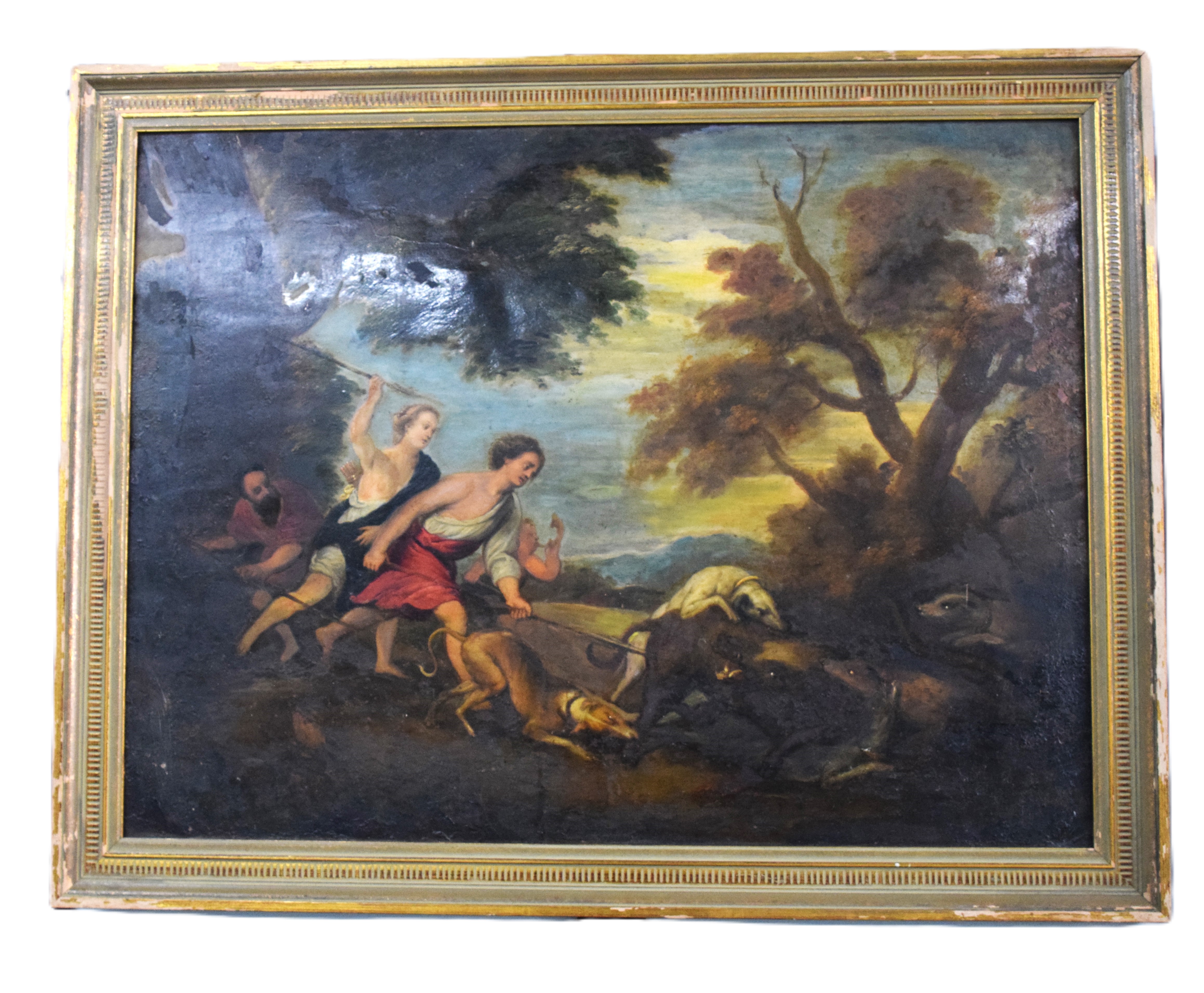 Early oil on copper painting of a hunt scene, old master copy. Dimensions: 21″ x 28″