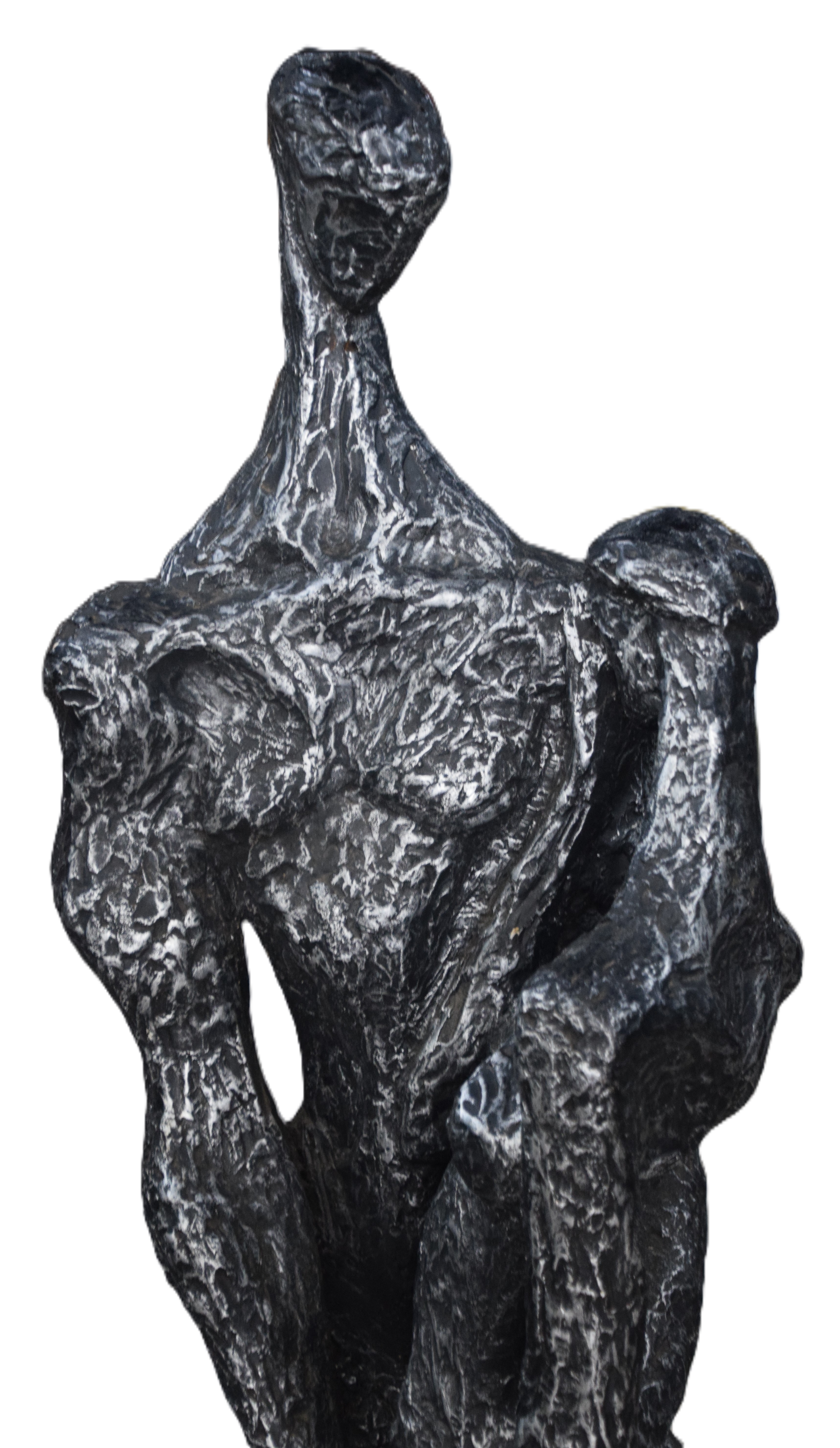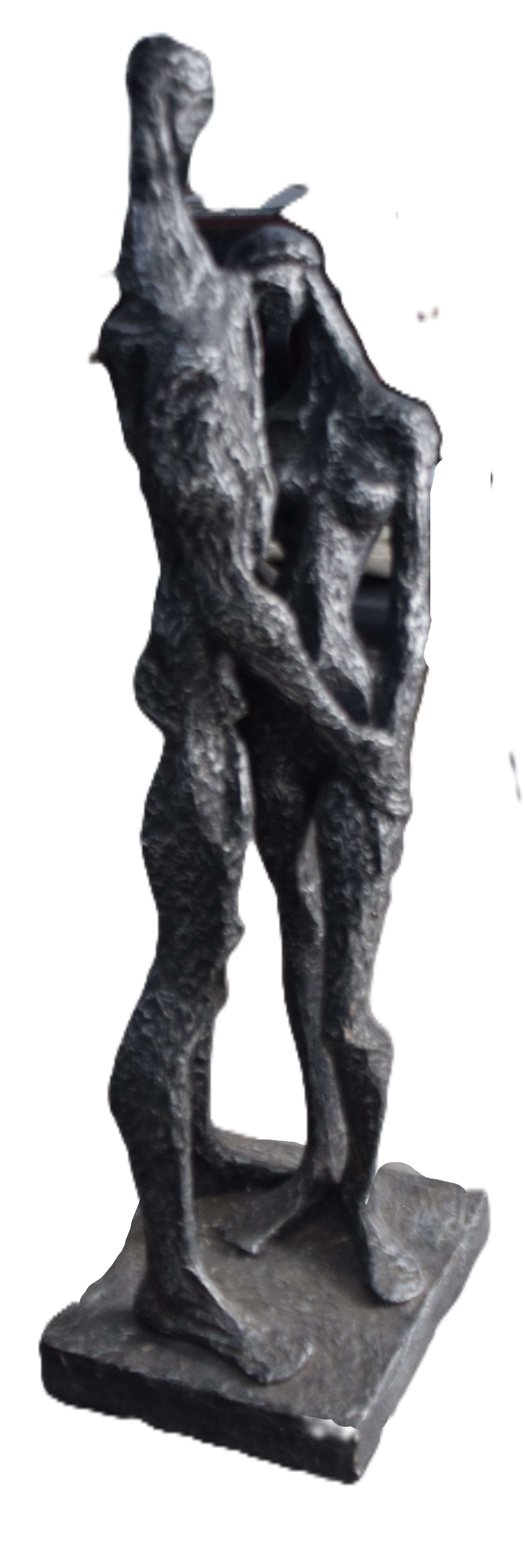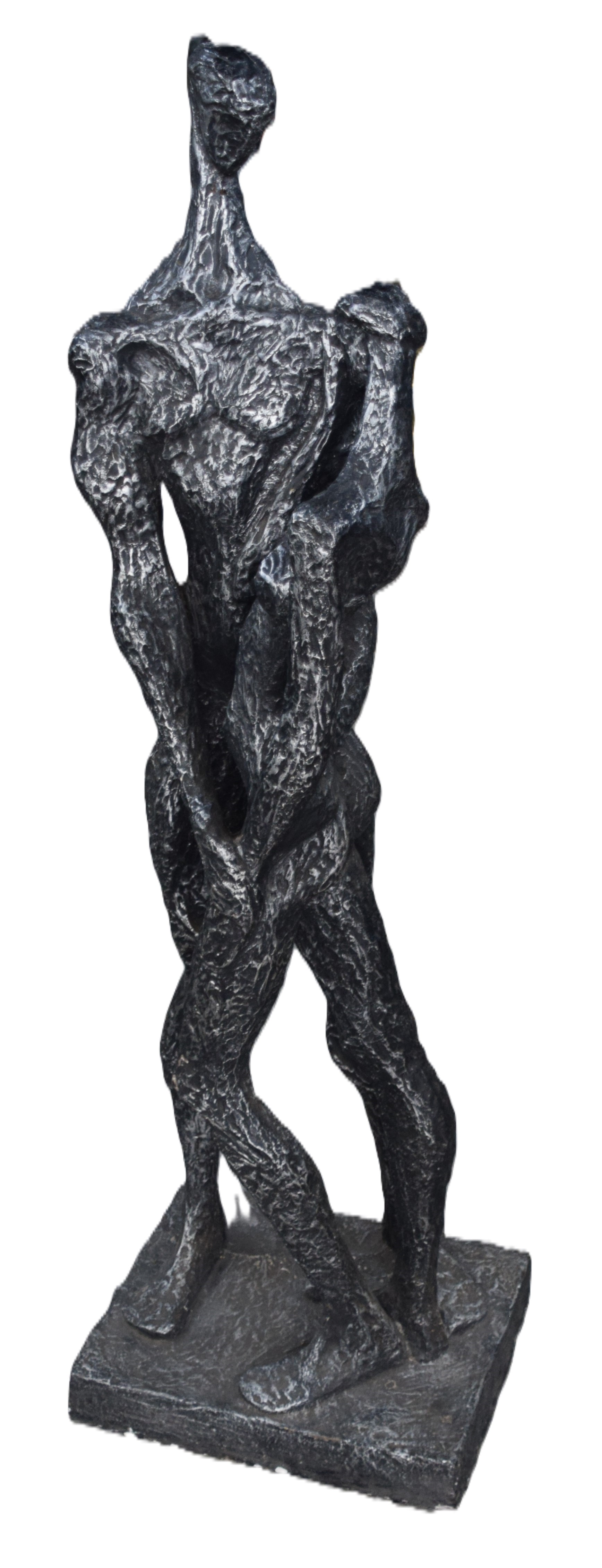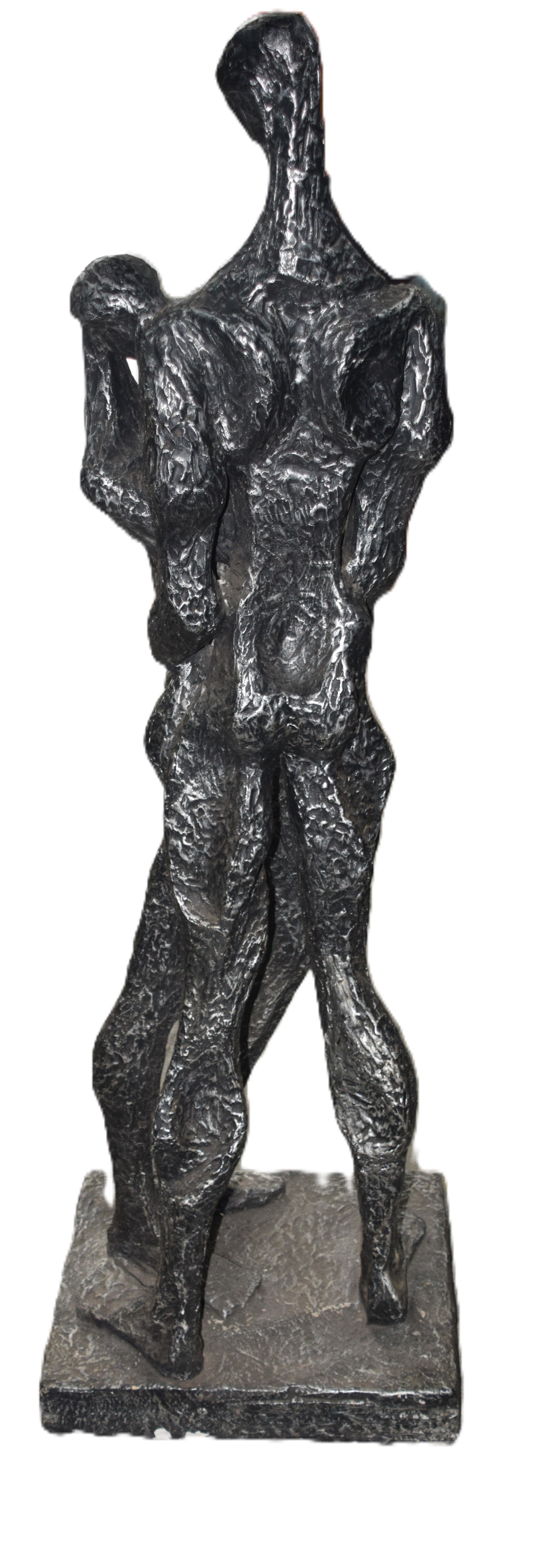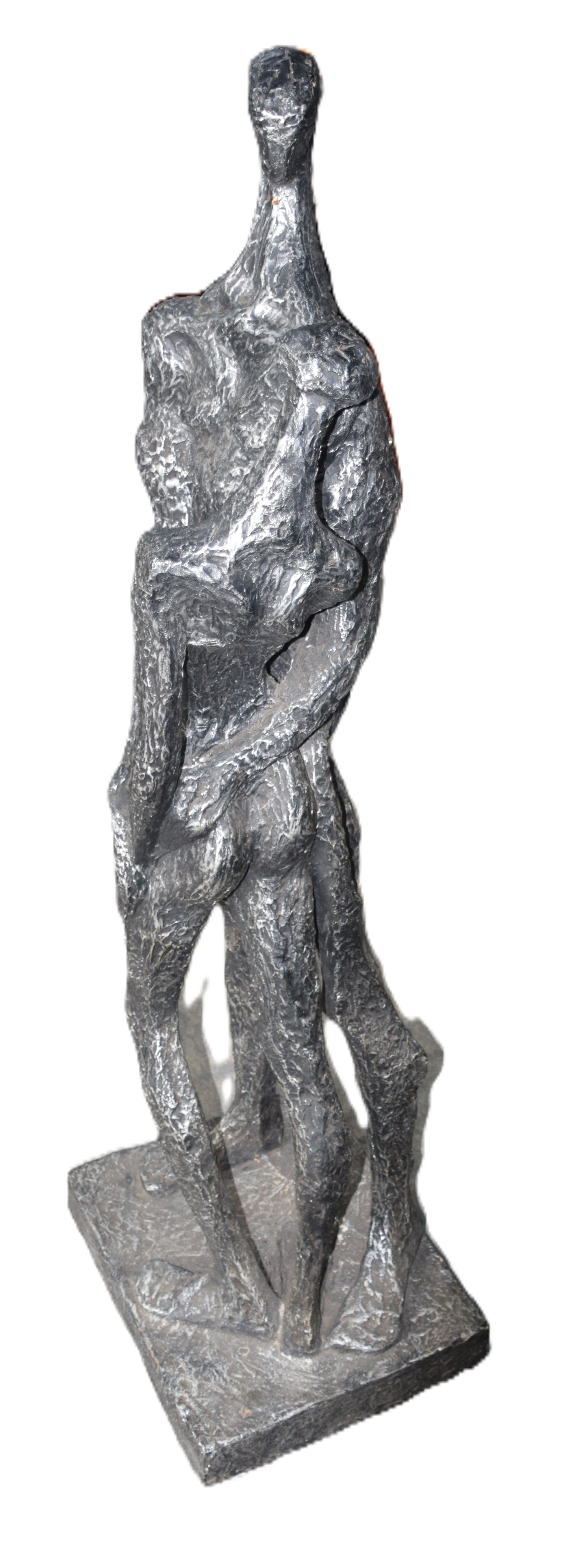 Cold cast bronze resin of a male and female embracing. Giacometti style, unsigned. Dimensions: 55″ H