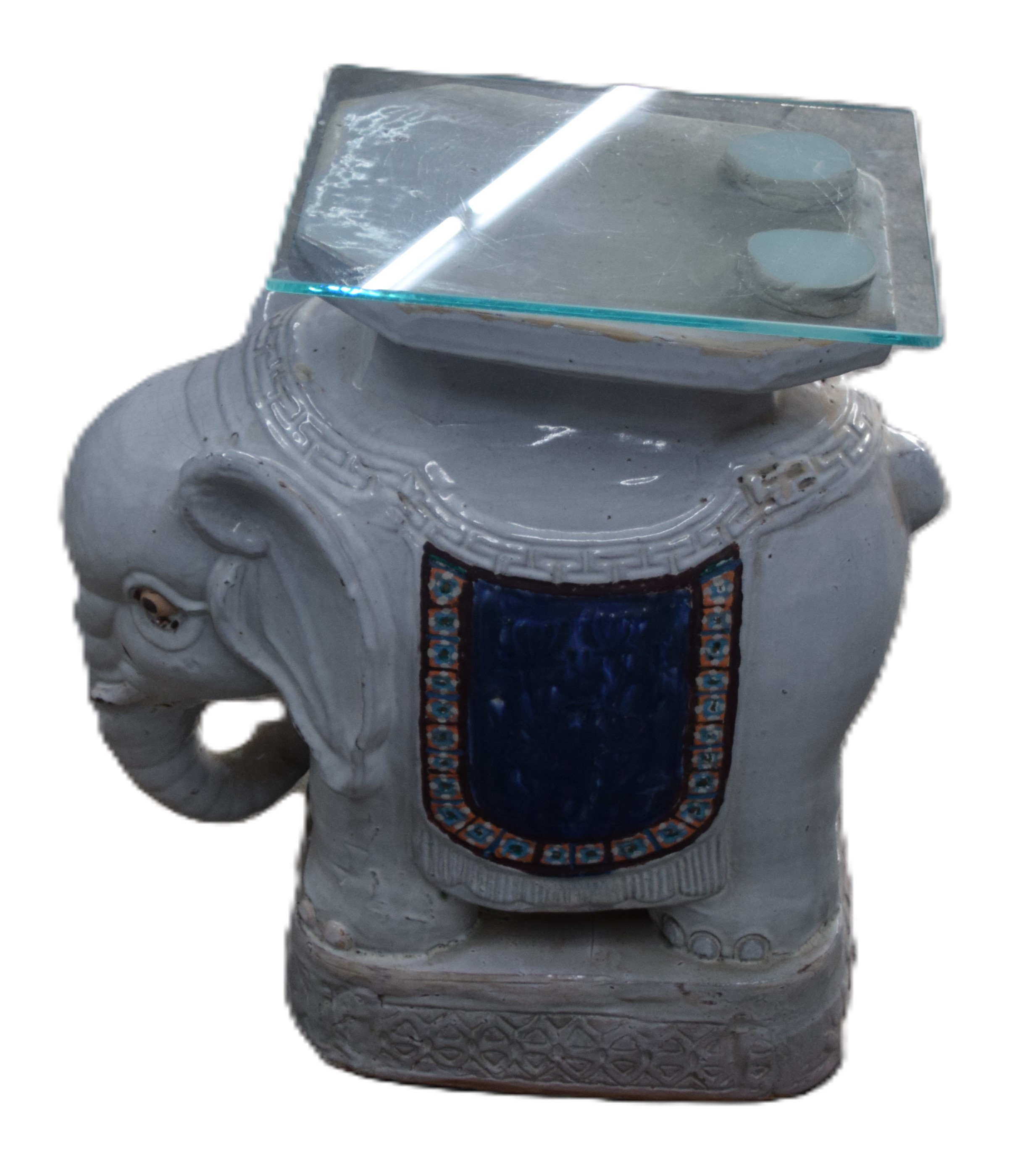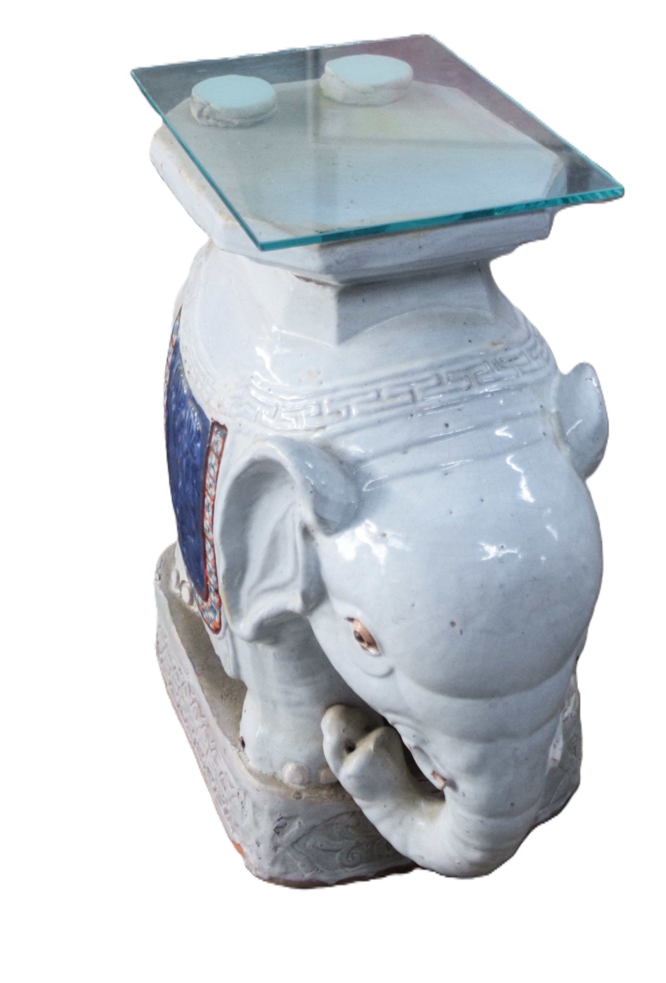 Oriental porcelain elephant form garden seat with decorations. From the David Sargent Collection, New London, NH. Dimensions: 20″ H x 18″ L