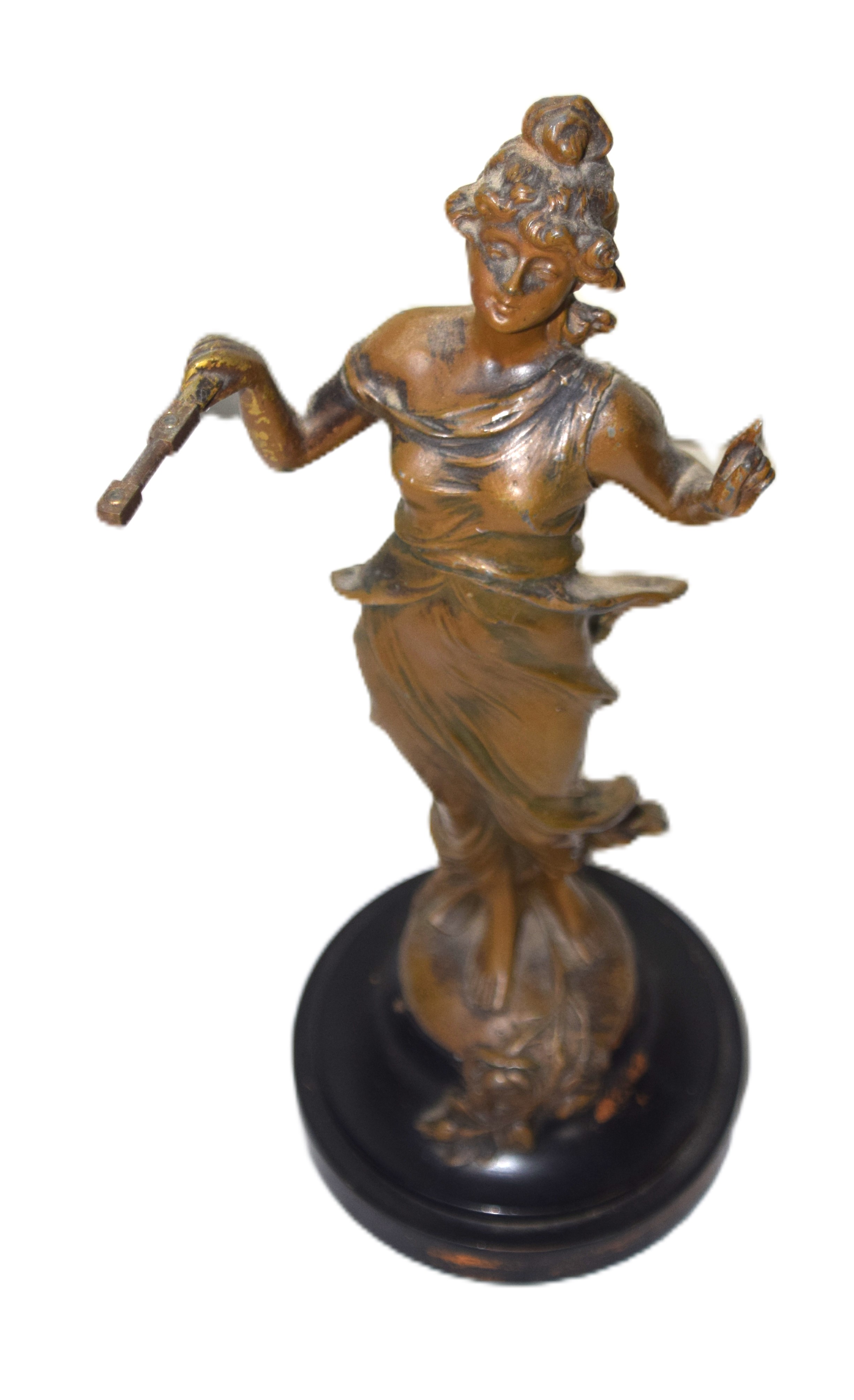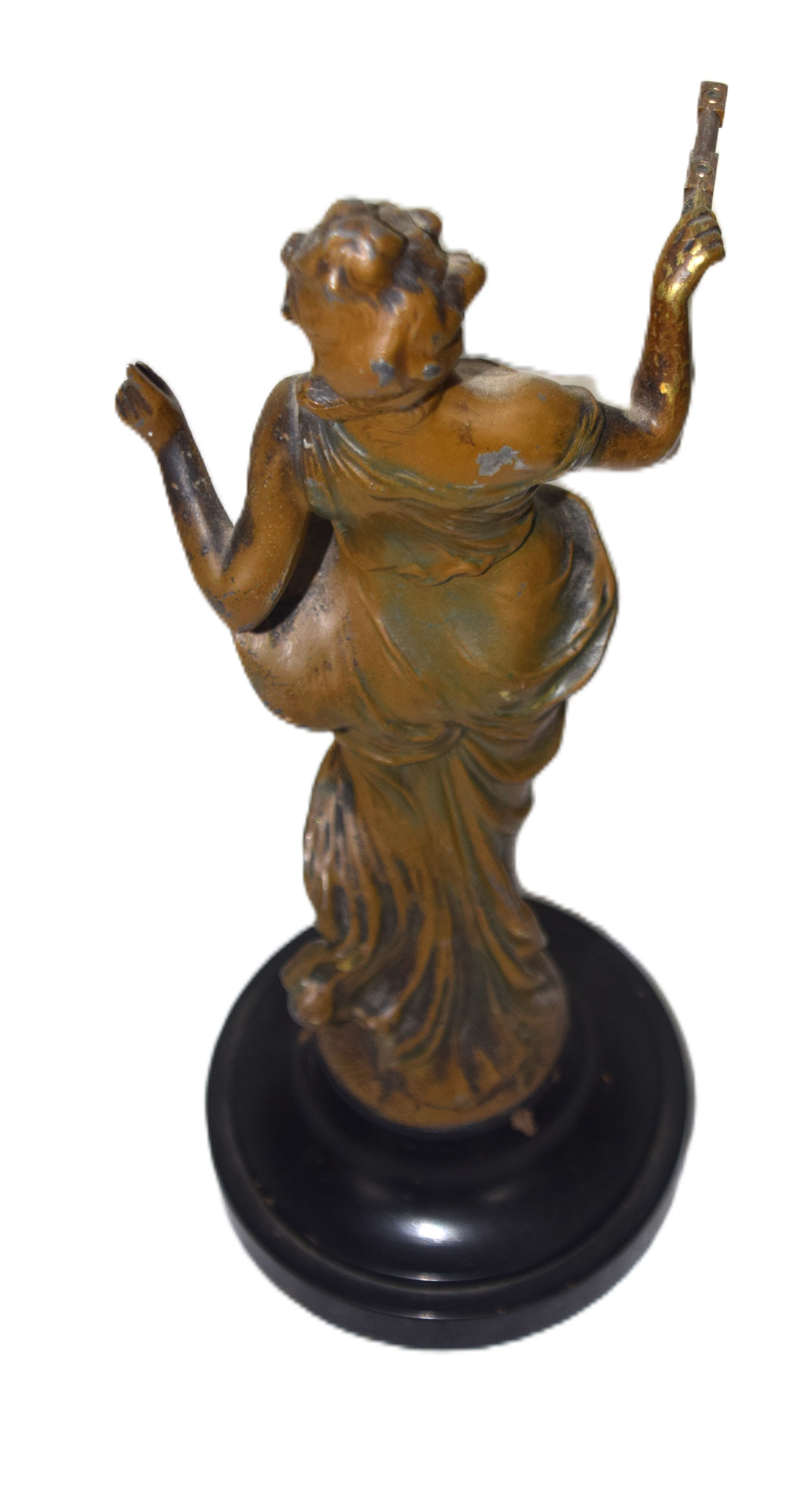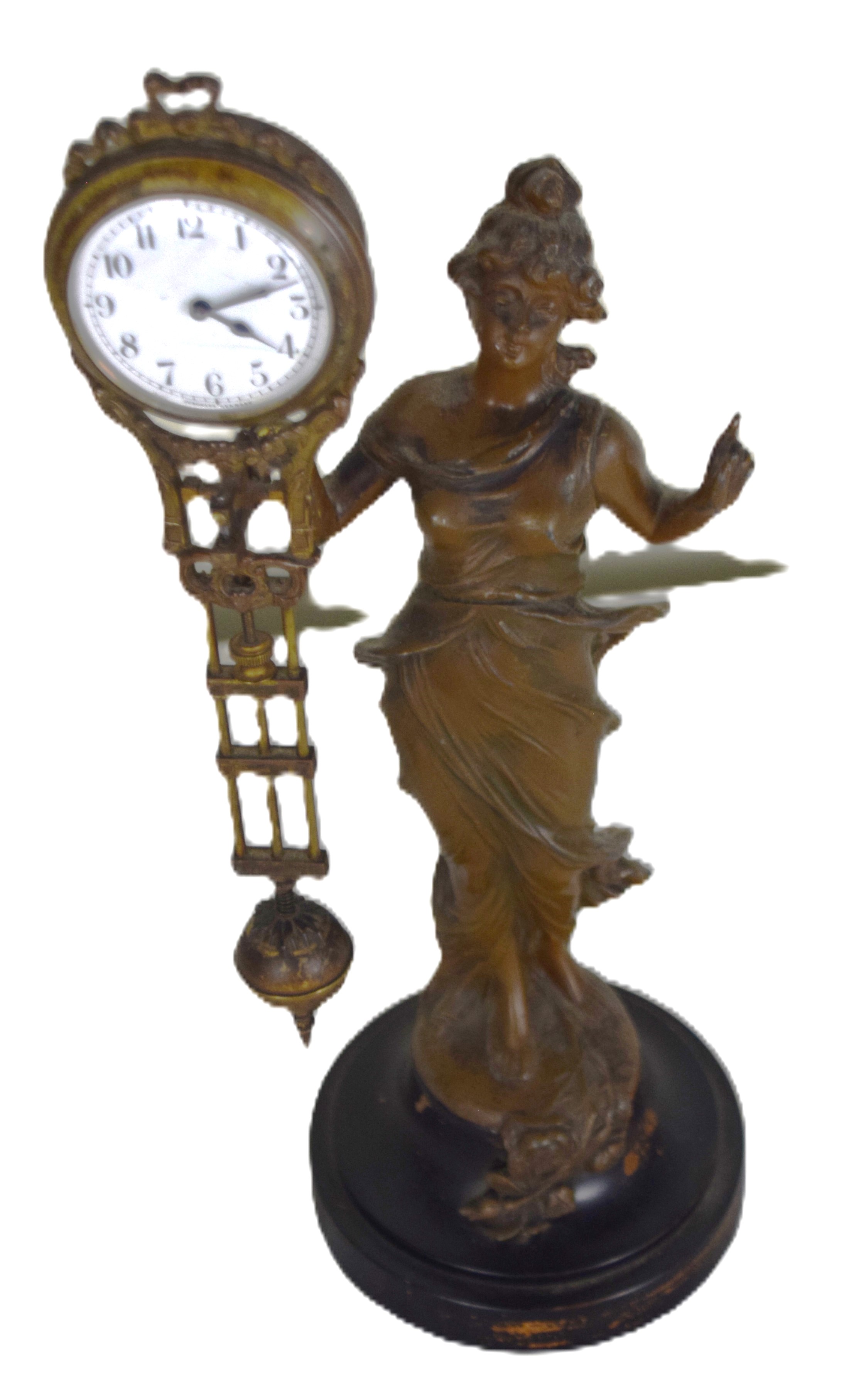 Swinging, German arm clock of a bronze female on a wooden black base, signed Junghans Germany. Dimensions: 14″ H