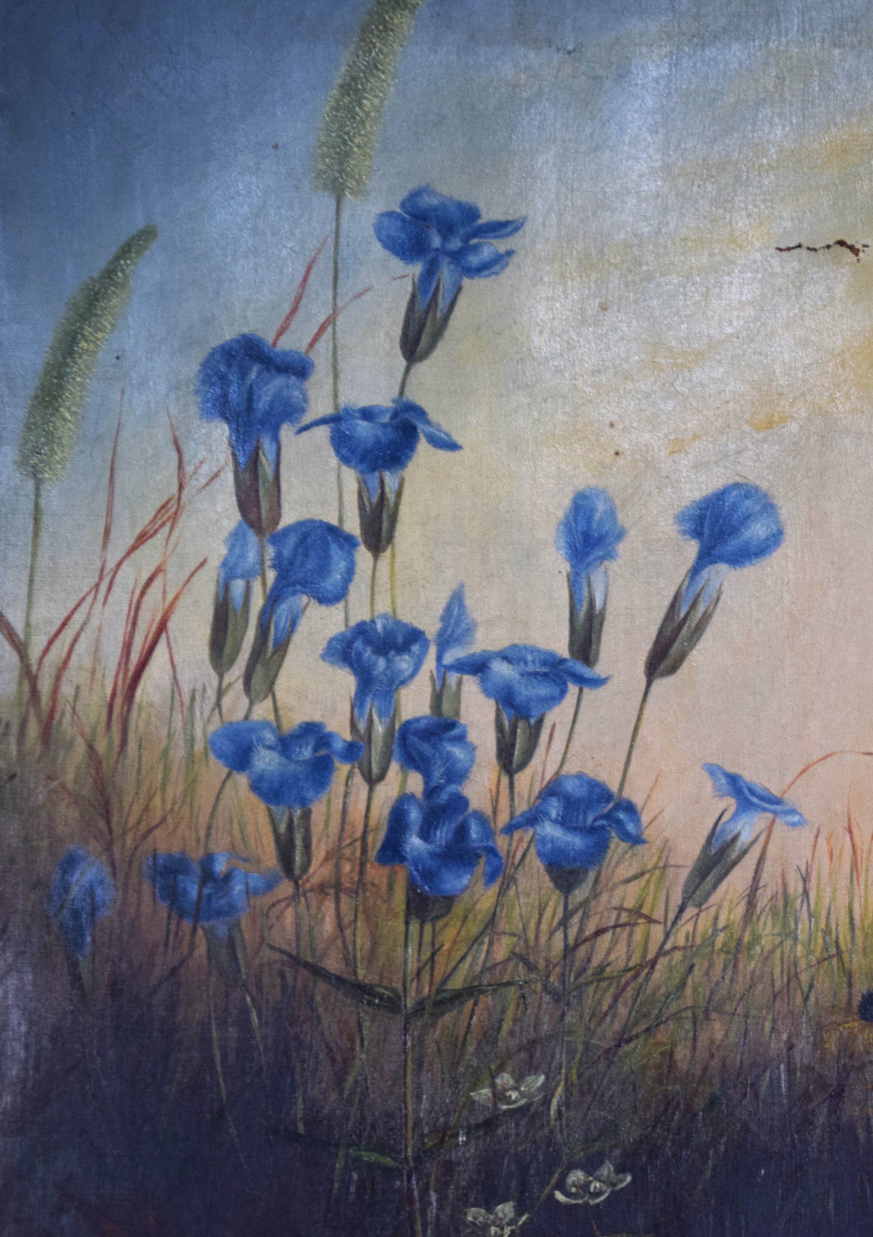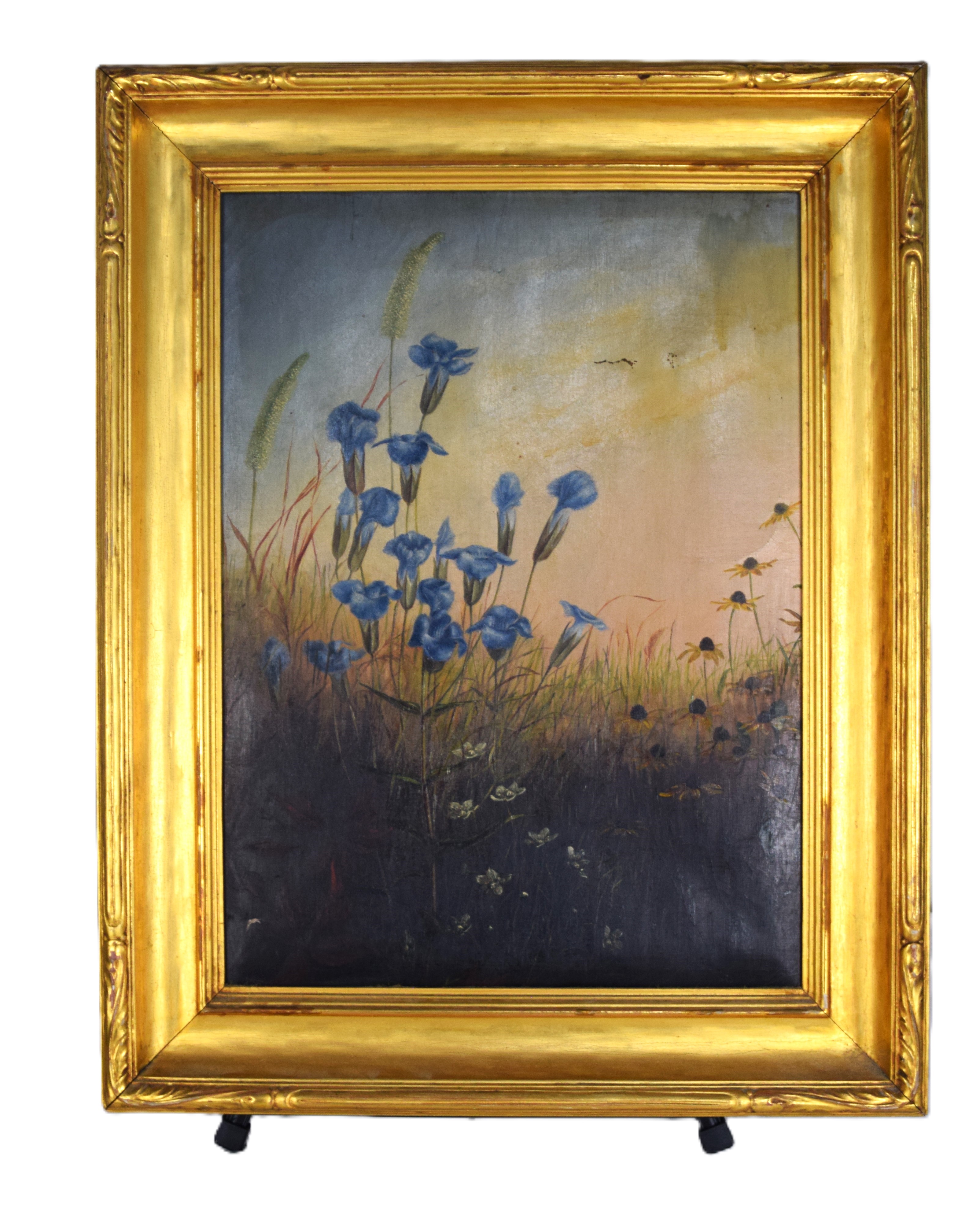 Framed oil on canvas of flowers attributed to Percy Sanbourn. Percy A. Sanborn (1849 – 1929) worked in Maine and is known for still life flowers and ship paintings. Dimensions: 21.5″ x 15.5″