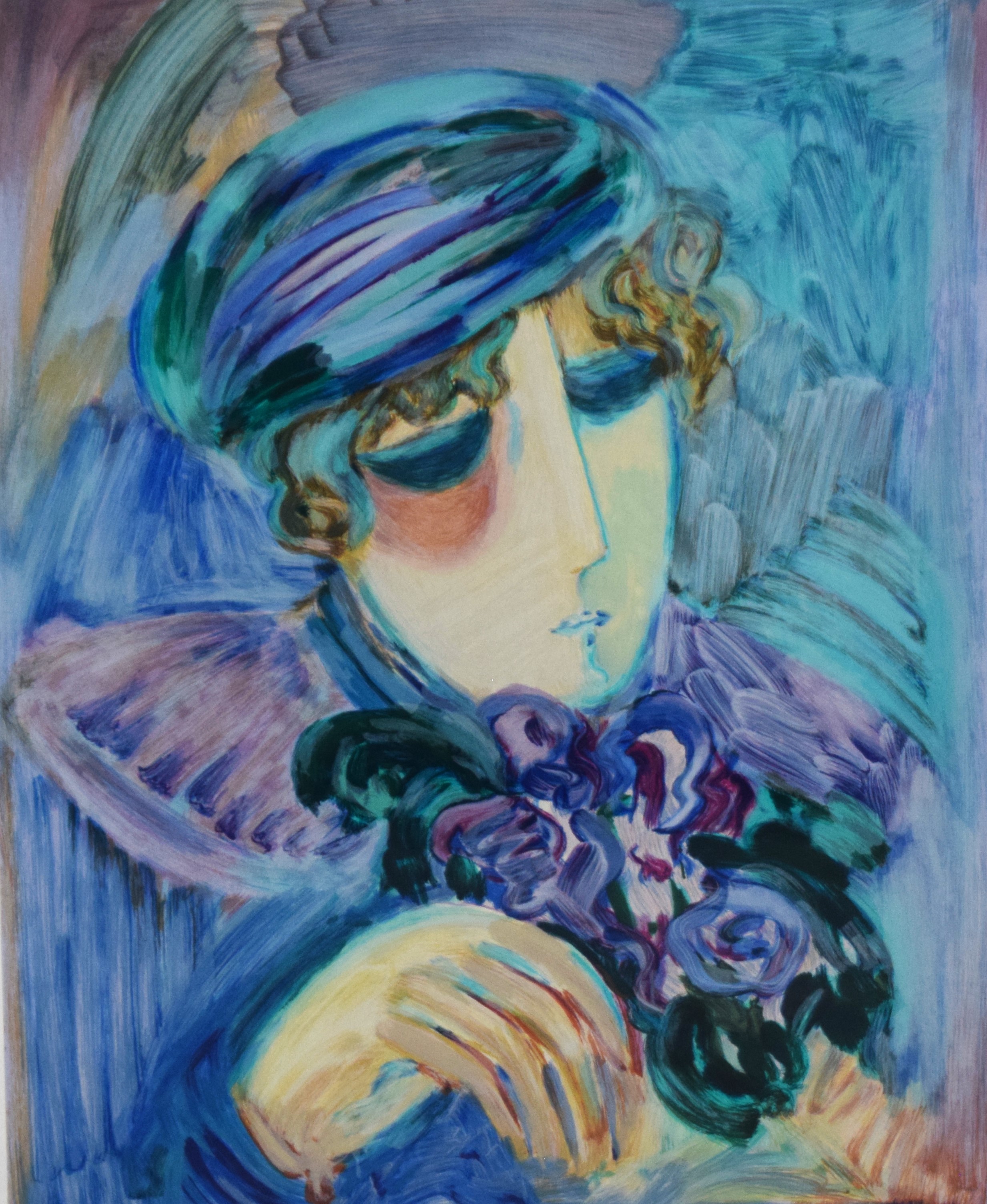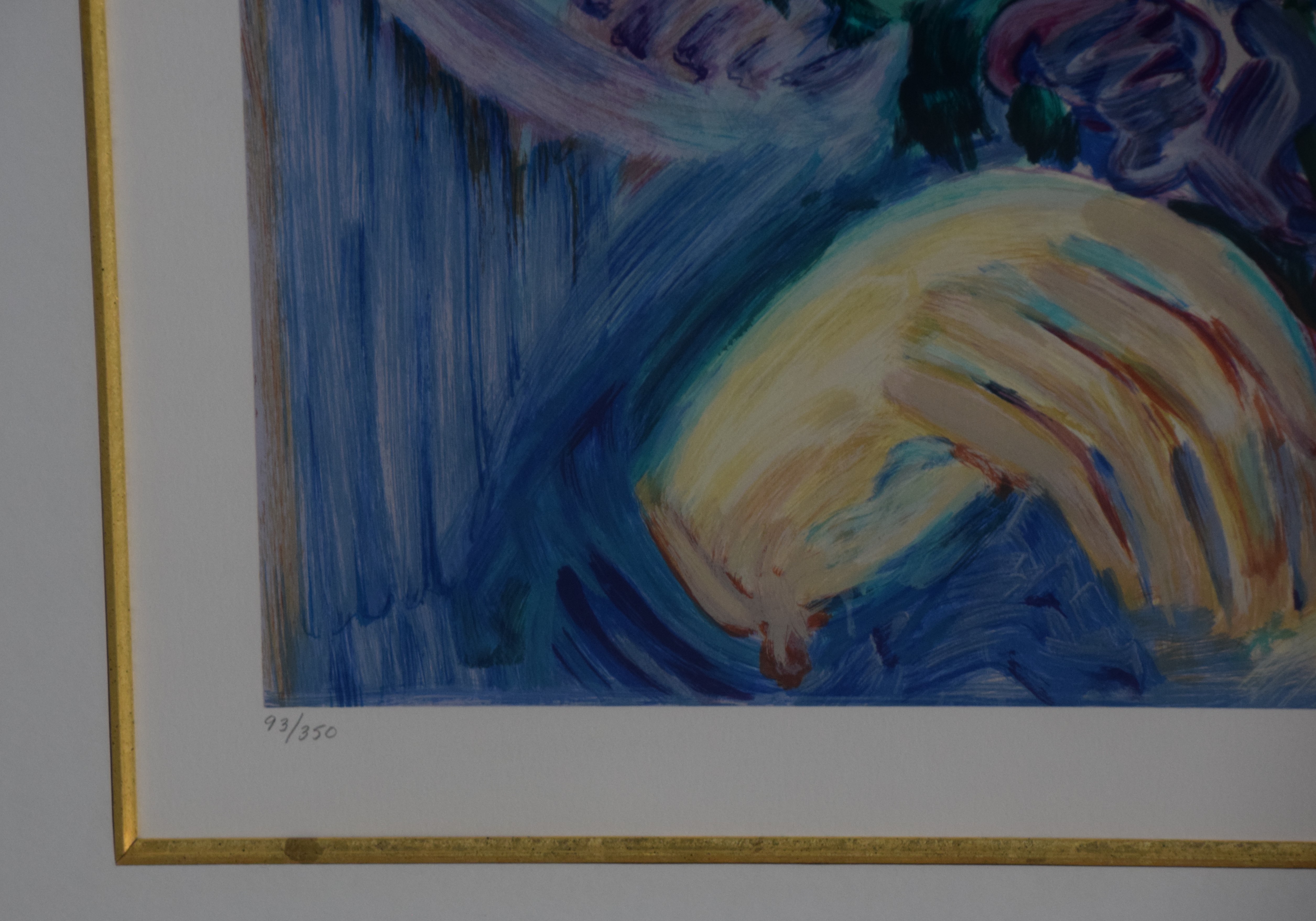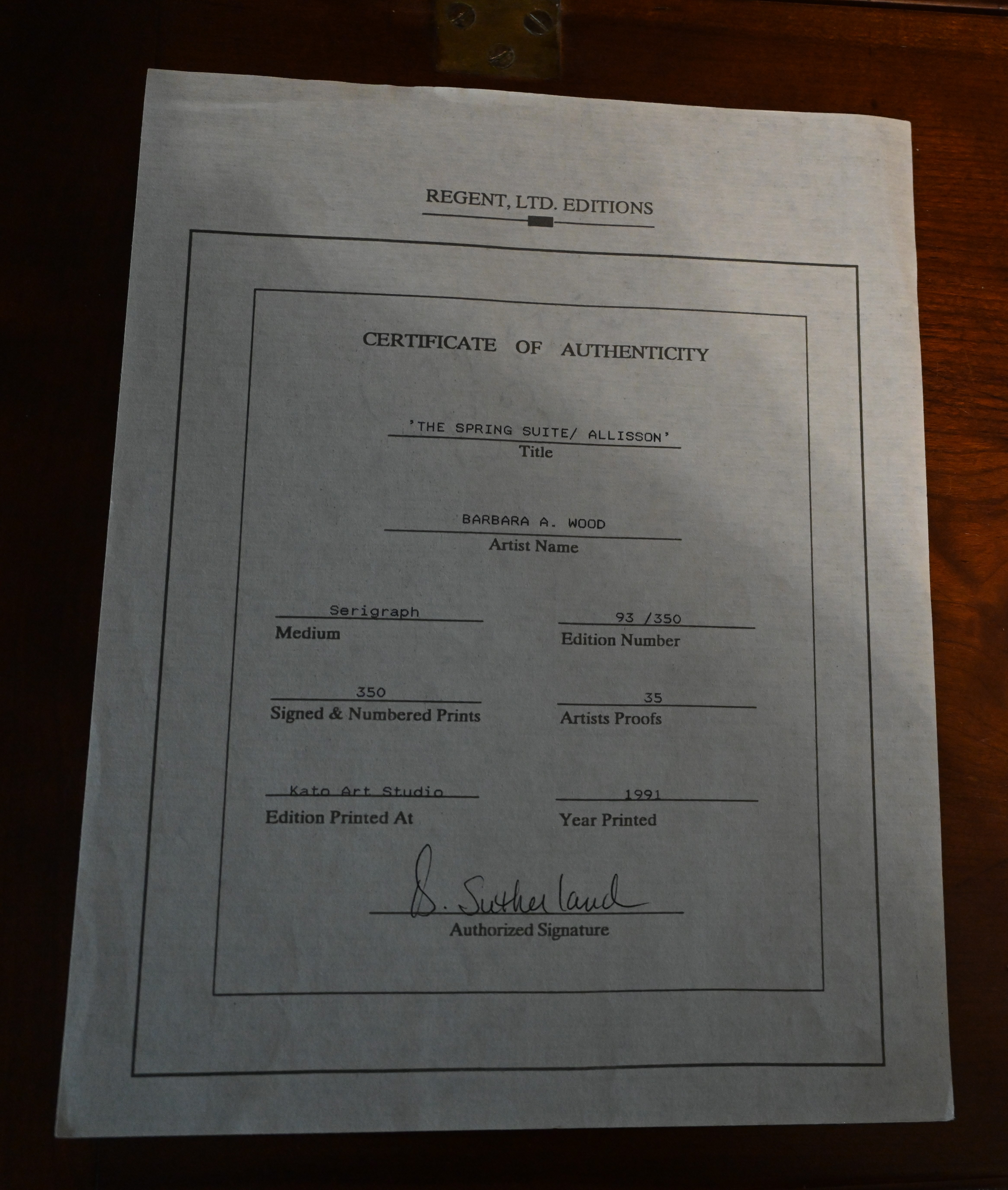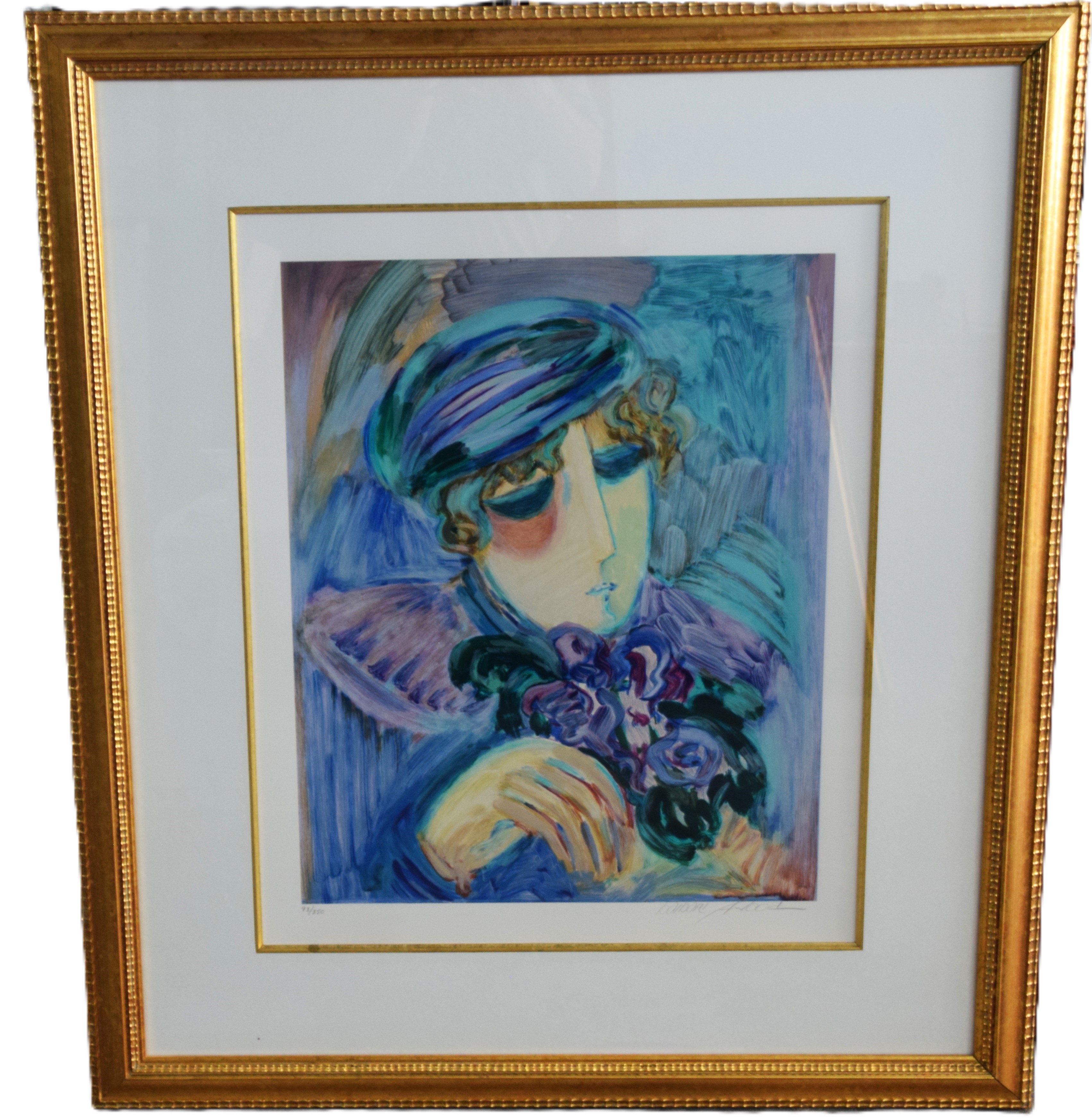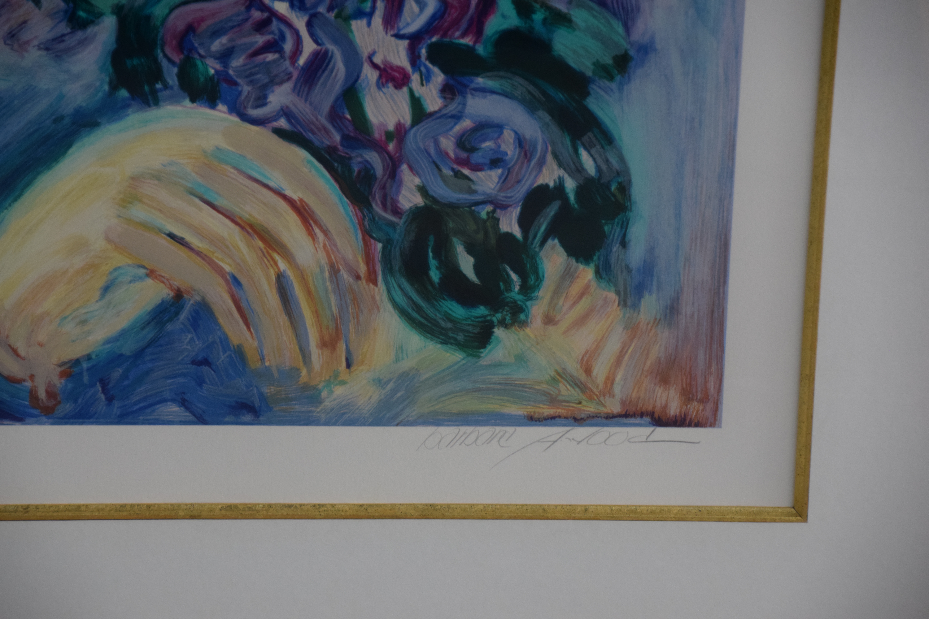 Framed serigraph titled “Spring Suite/Allison” by Barbara A. Wood, signed lower right and numbered 93 of 350. From Columbus, Ohio, Barbara Wood is a painter of modernist figures, especially females, and genre scenes. Dimensions: 27″ x 22″ Image size, 41″ x 36″ Overall