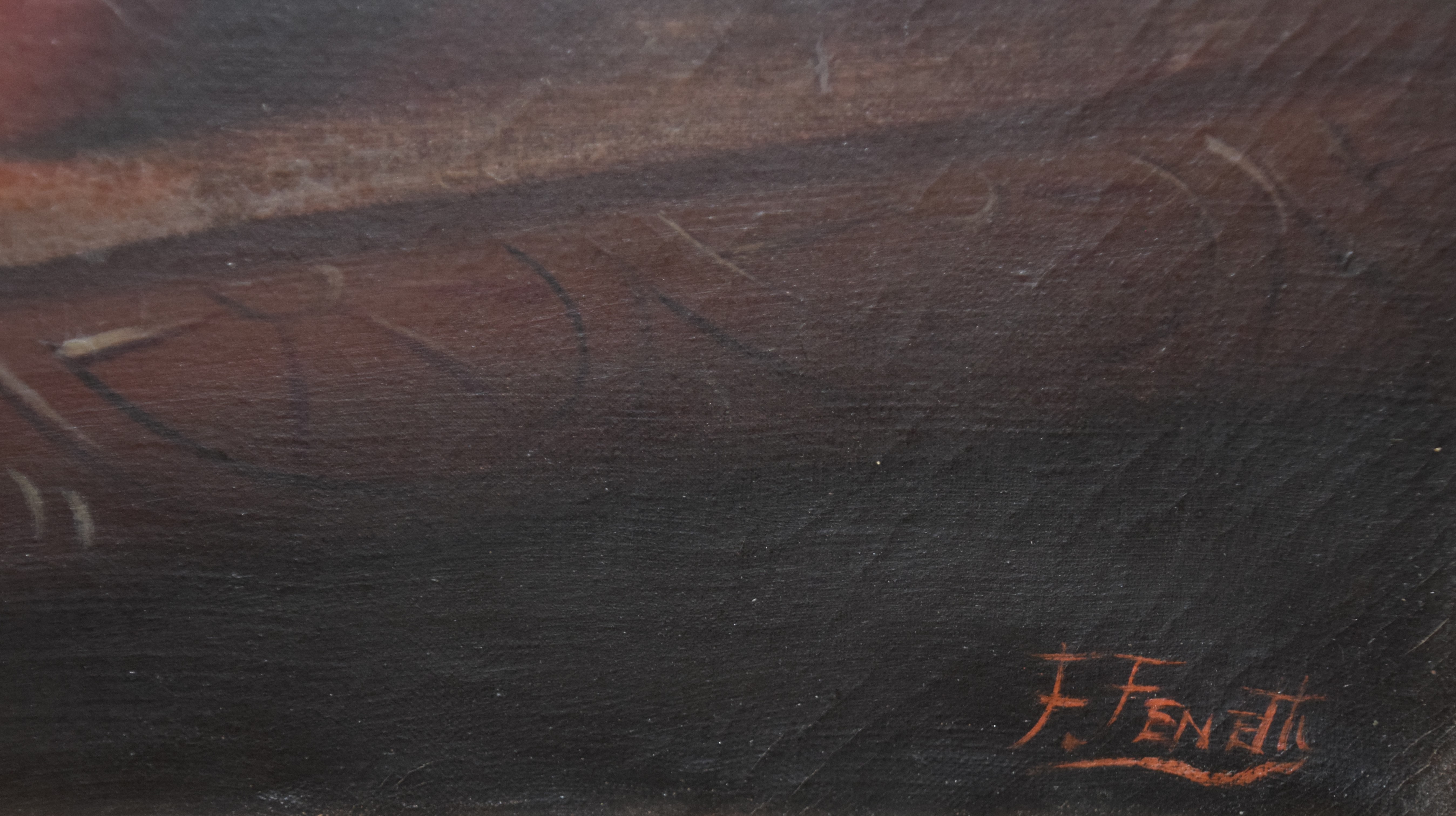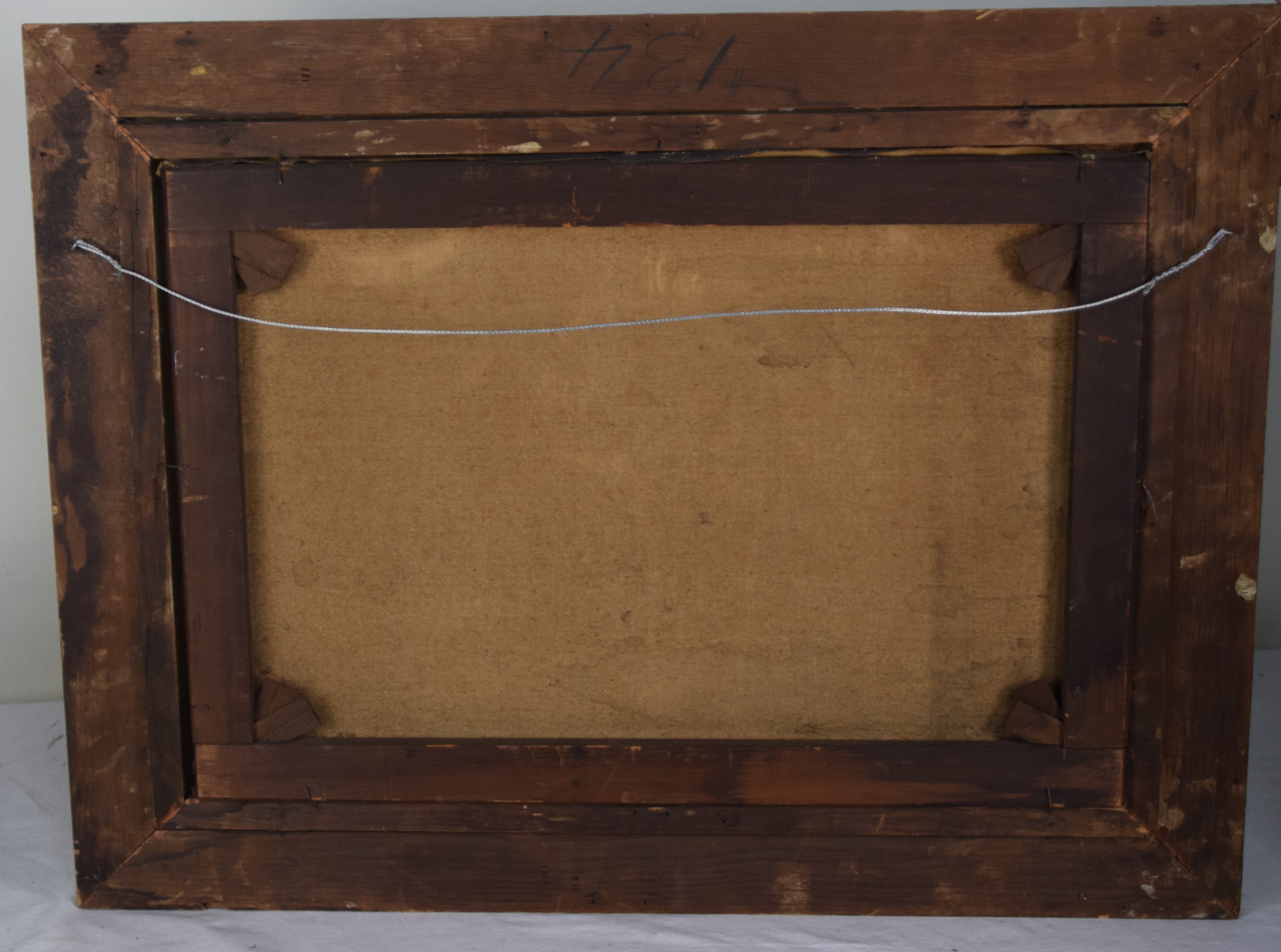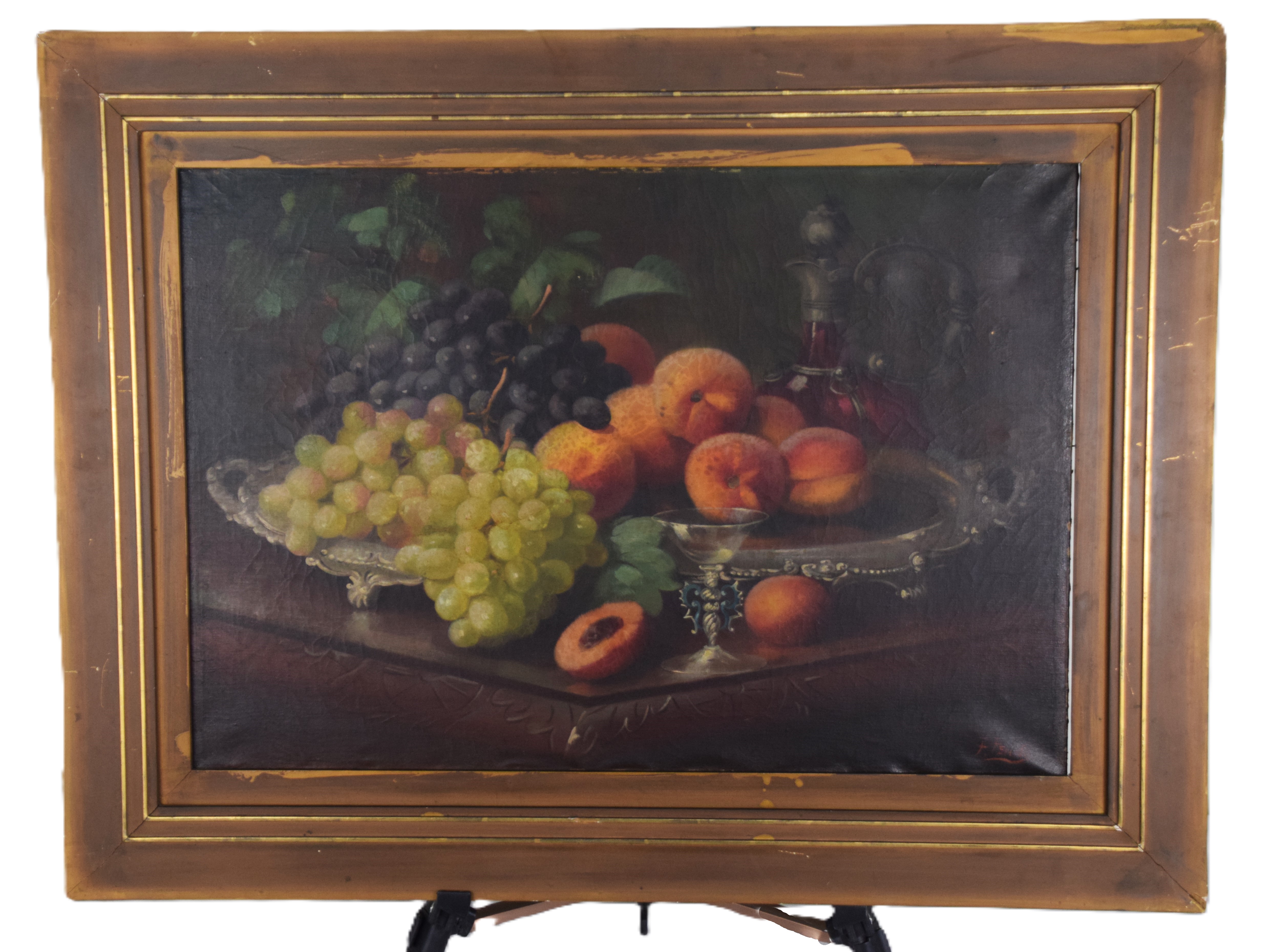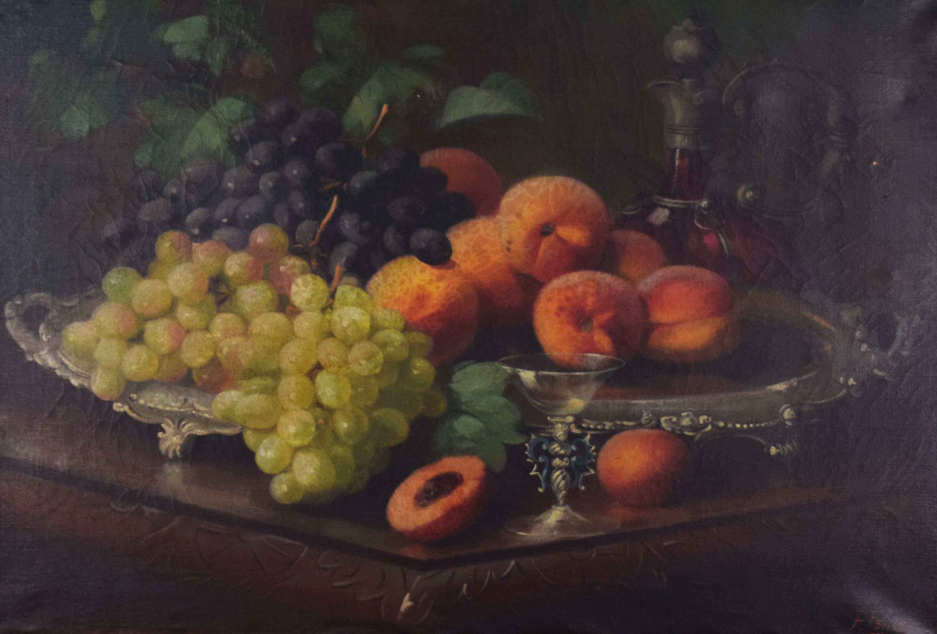 Attractive 19th Century still life of fruit on silver tray, signed F. Fenetty lower right. Frederick M. Fenetty (1854 – 1915) worked in Massachusetts, New Brunswick, Nova Scotia and Italy and is known for Trompe still life-flowers and fruit. Dimensions: 17″ x 25″