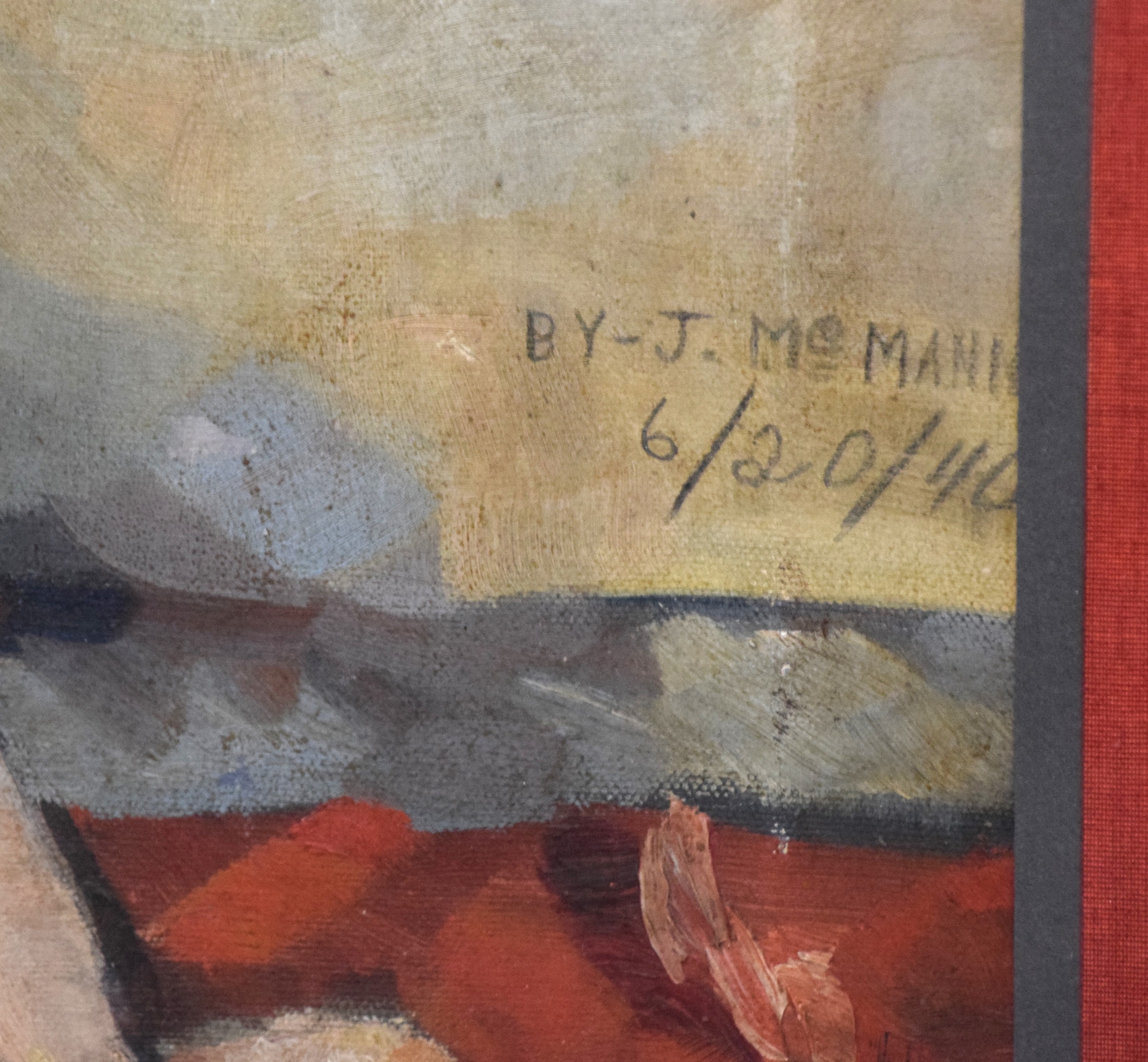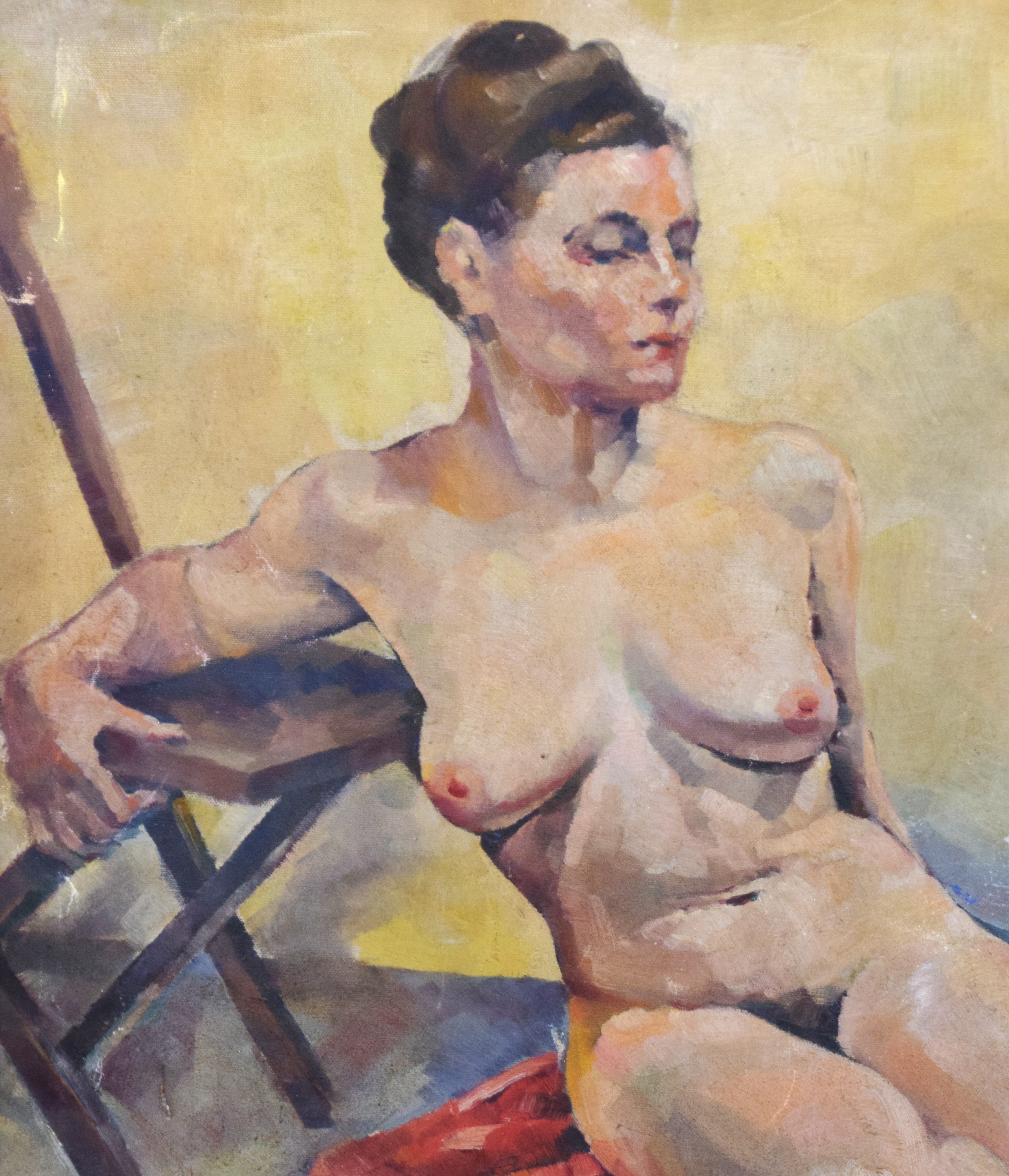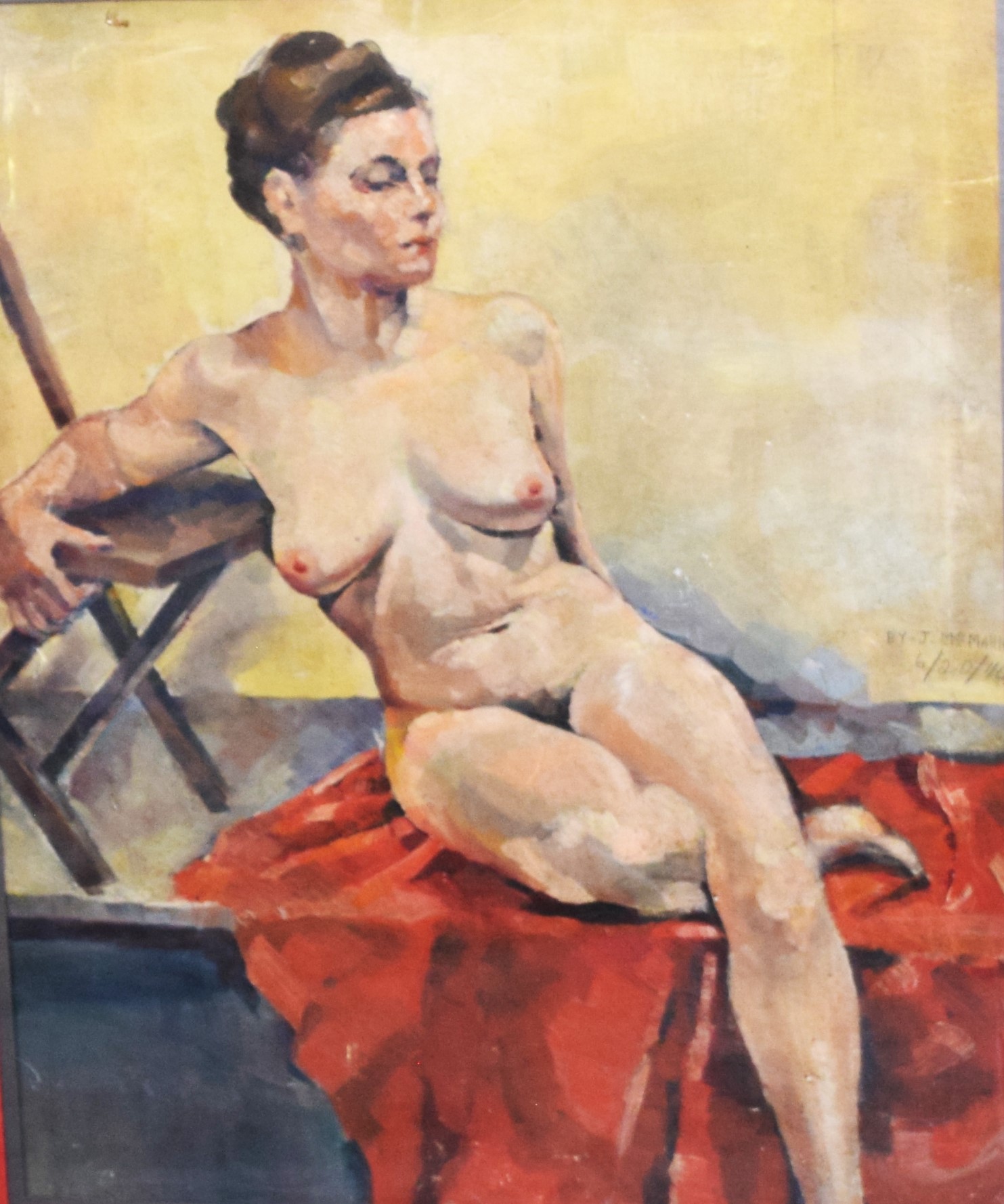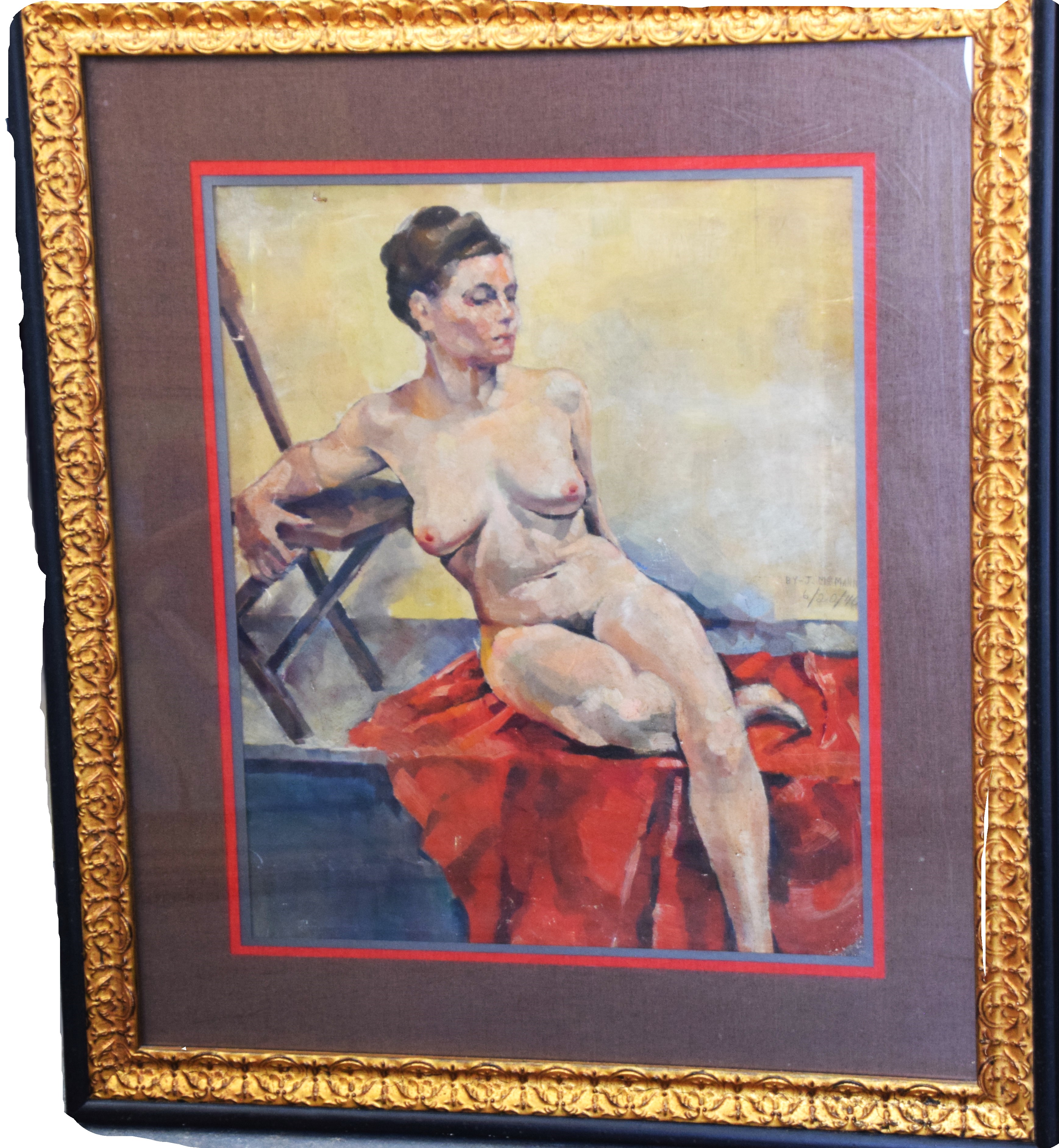 20th Century portrait painting of a seated nude women, on canvas, signed J. McMann dated 6/20/40, beautifully framed. Jessica McMann is a listed artist known for portraits. Dimensions: 29″ x 23″ Image size