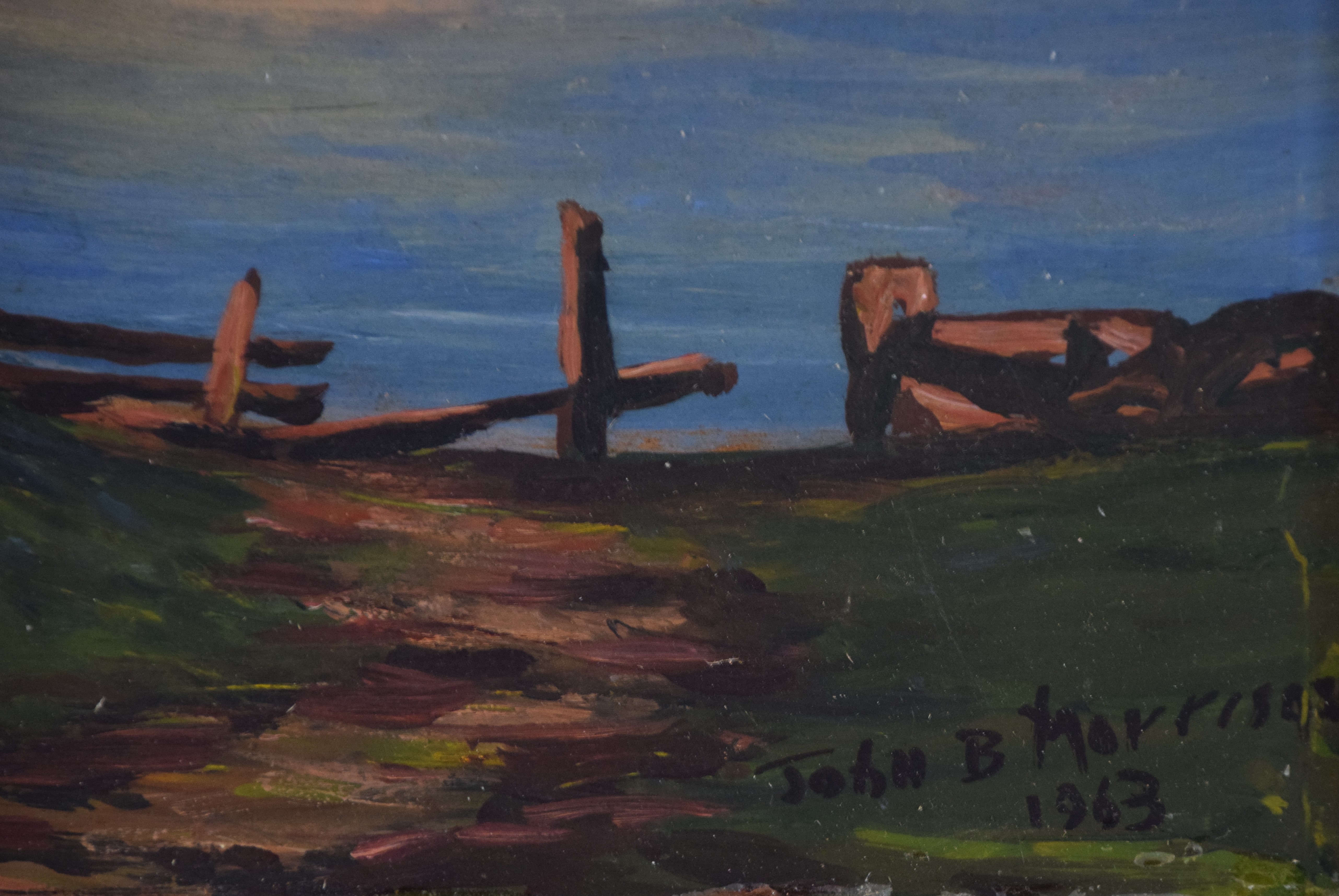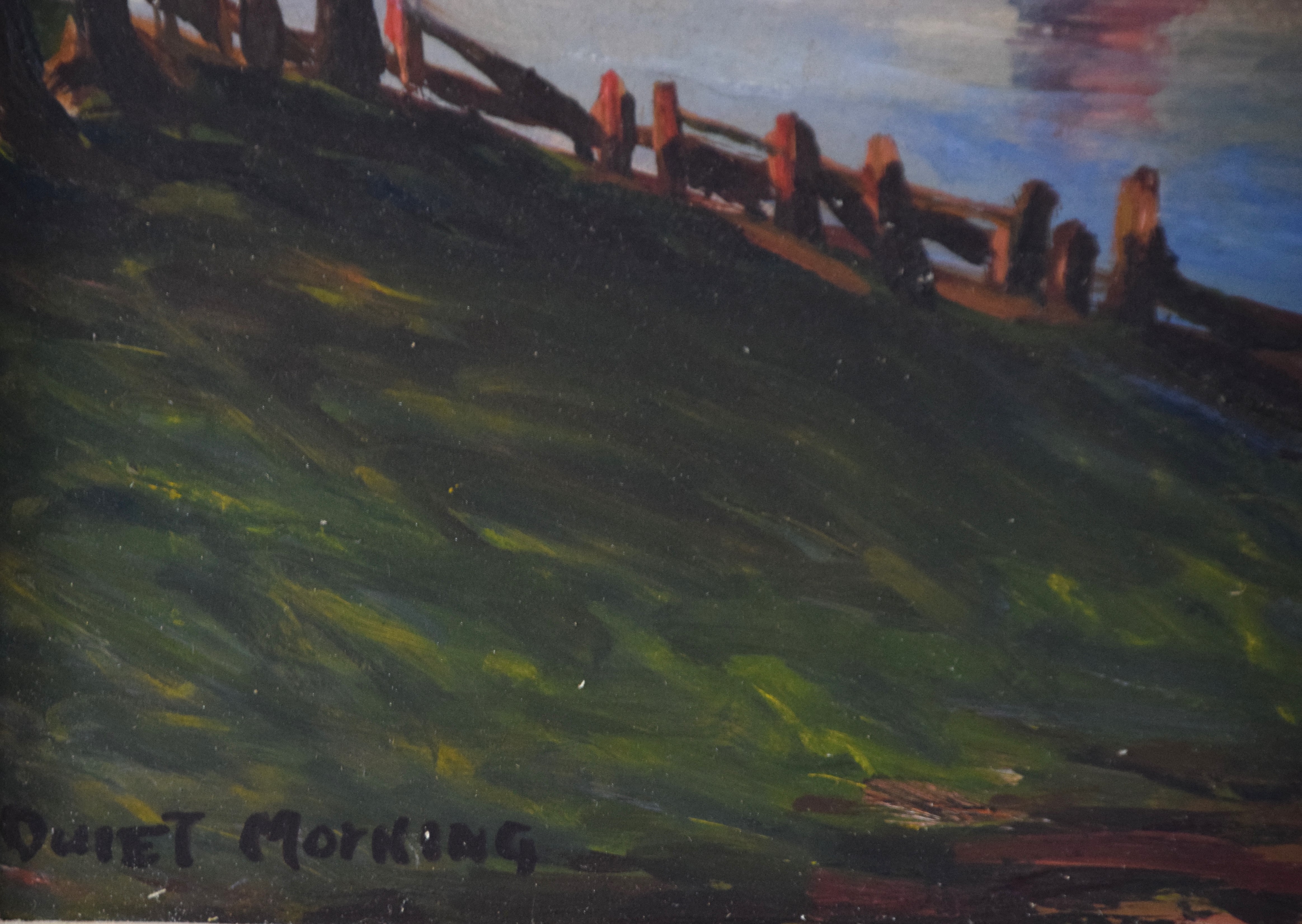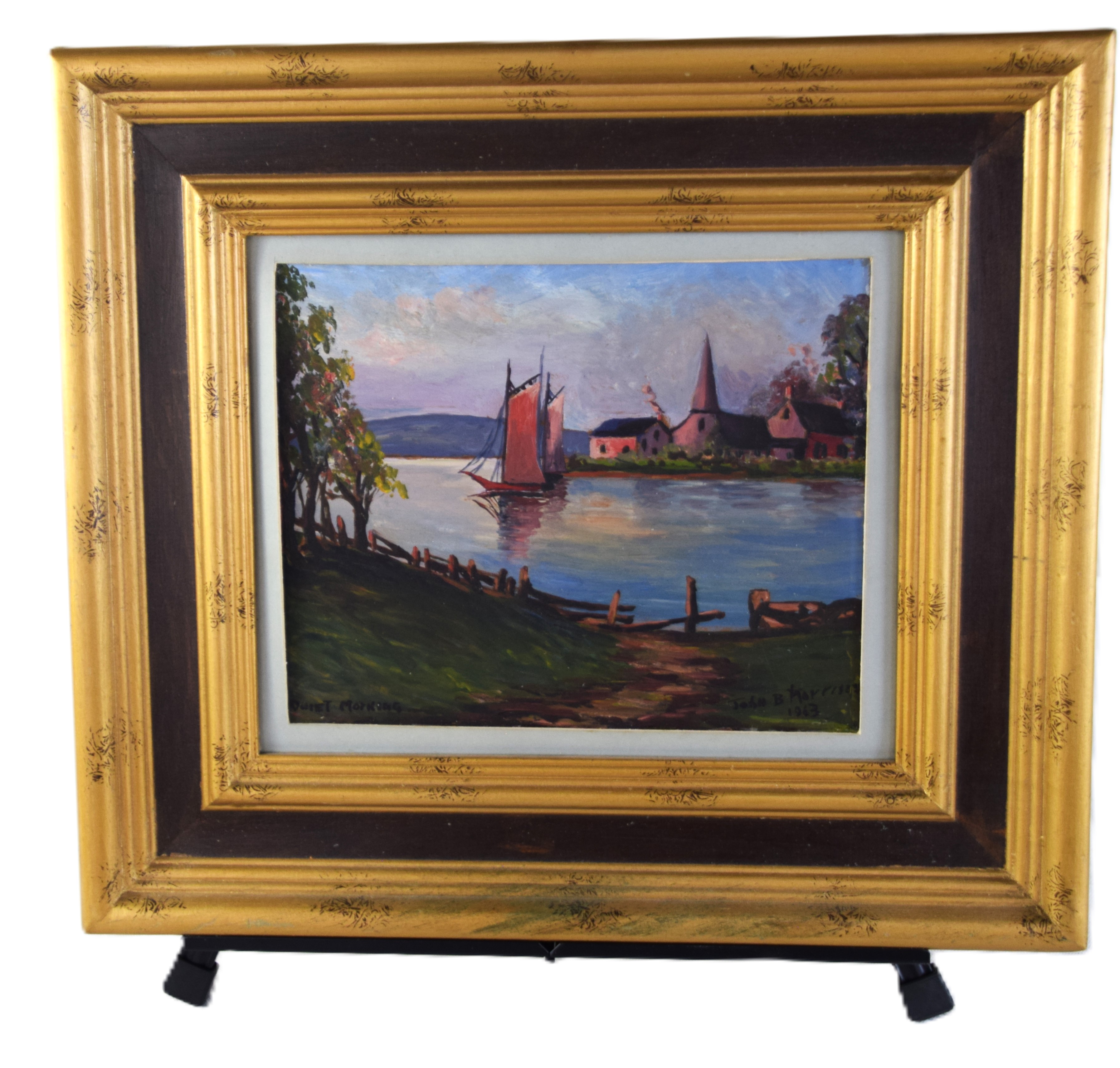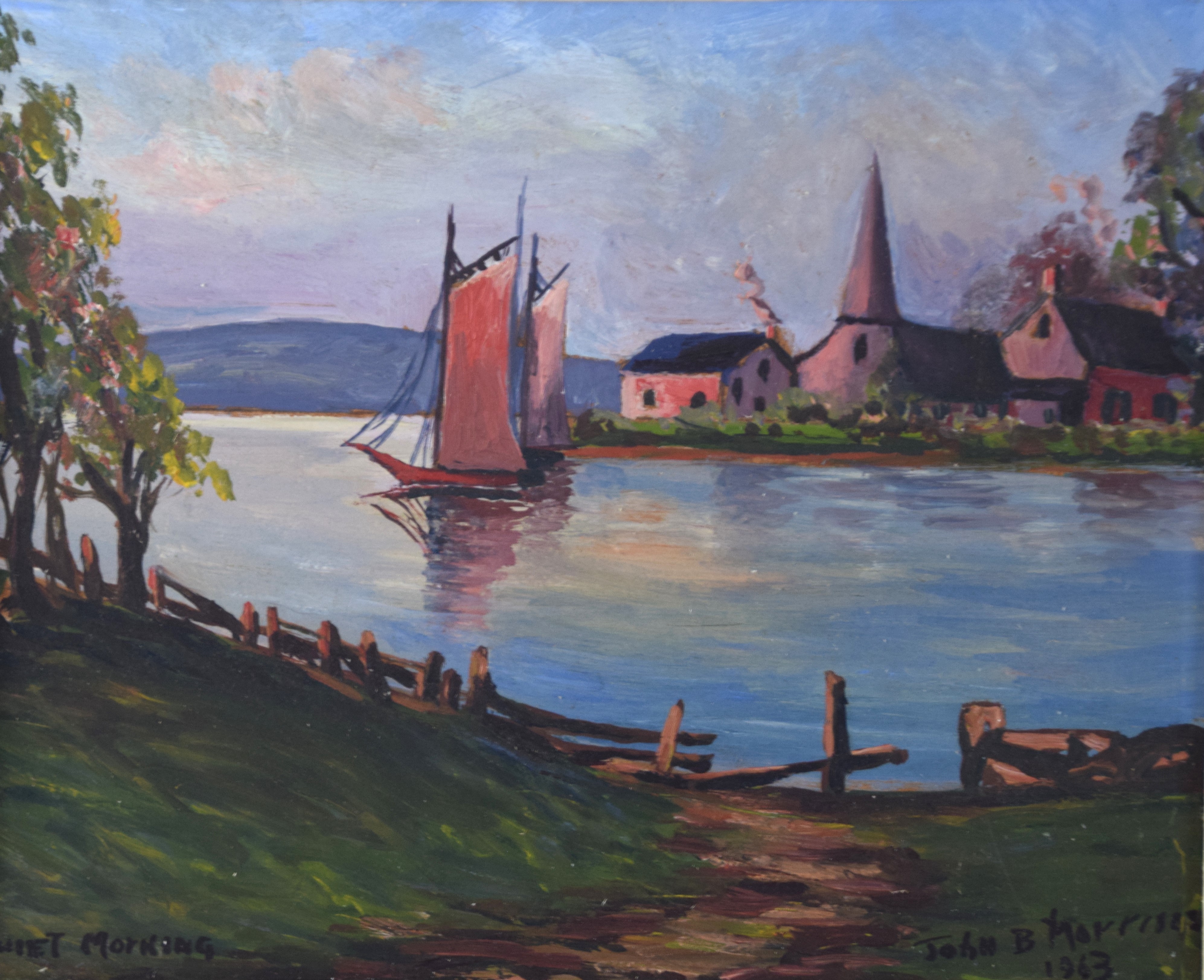 Oil on board painting of a sailboat and village, signed lower right John B Morrison 1963 and titled “Quiet Morning”. He is a listed artist known for realistic sailboat painting. Dimensions: 9″ x 10″ Image size, 16″ x 18″ Overall