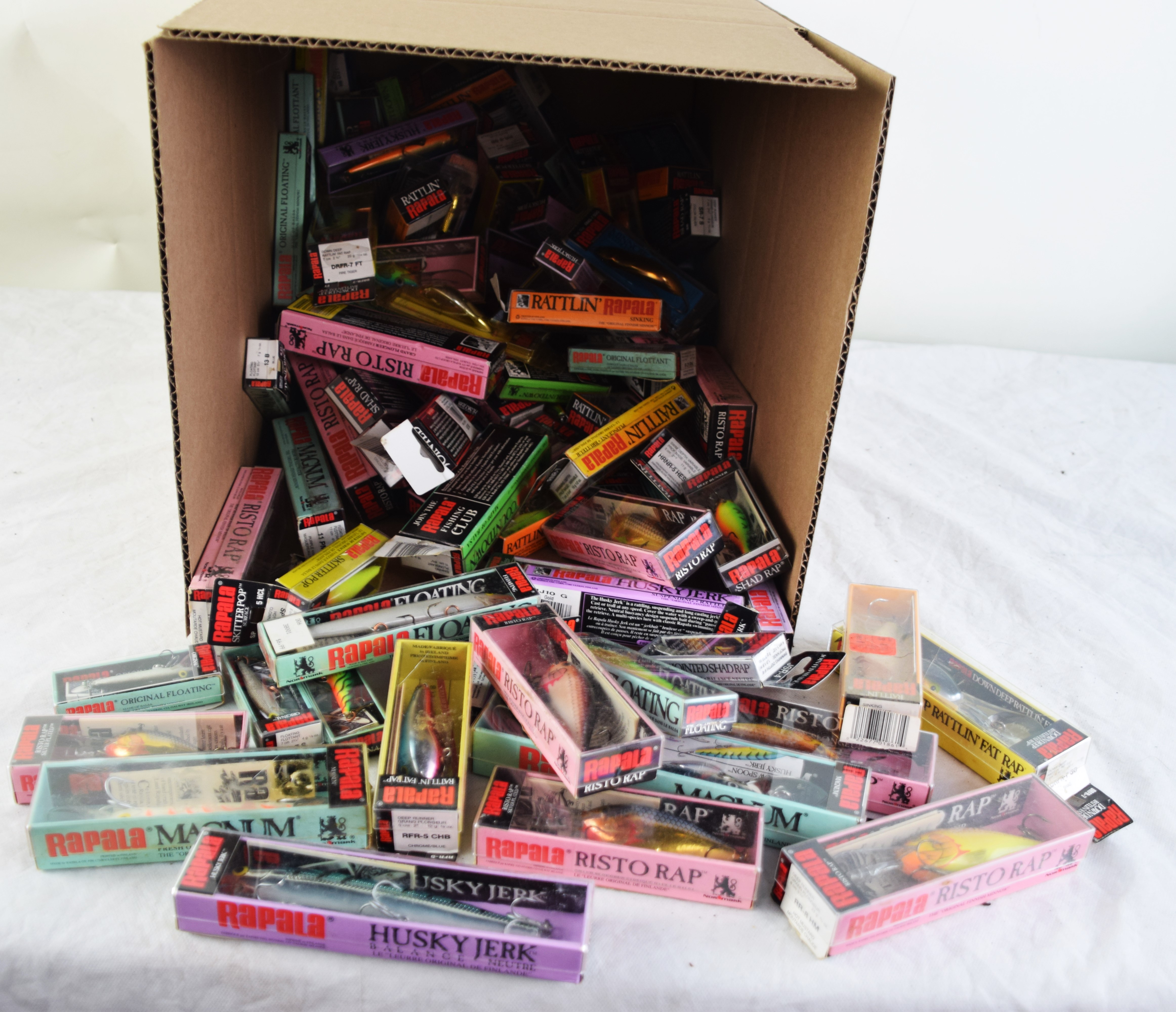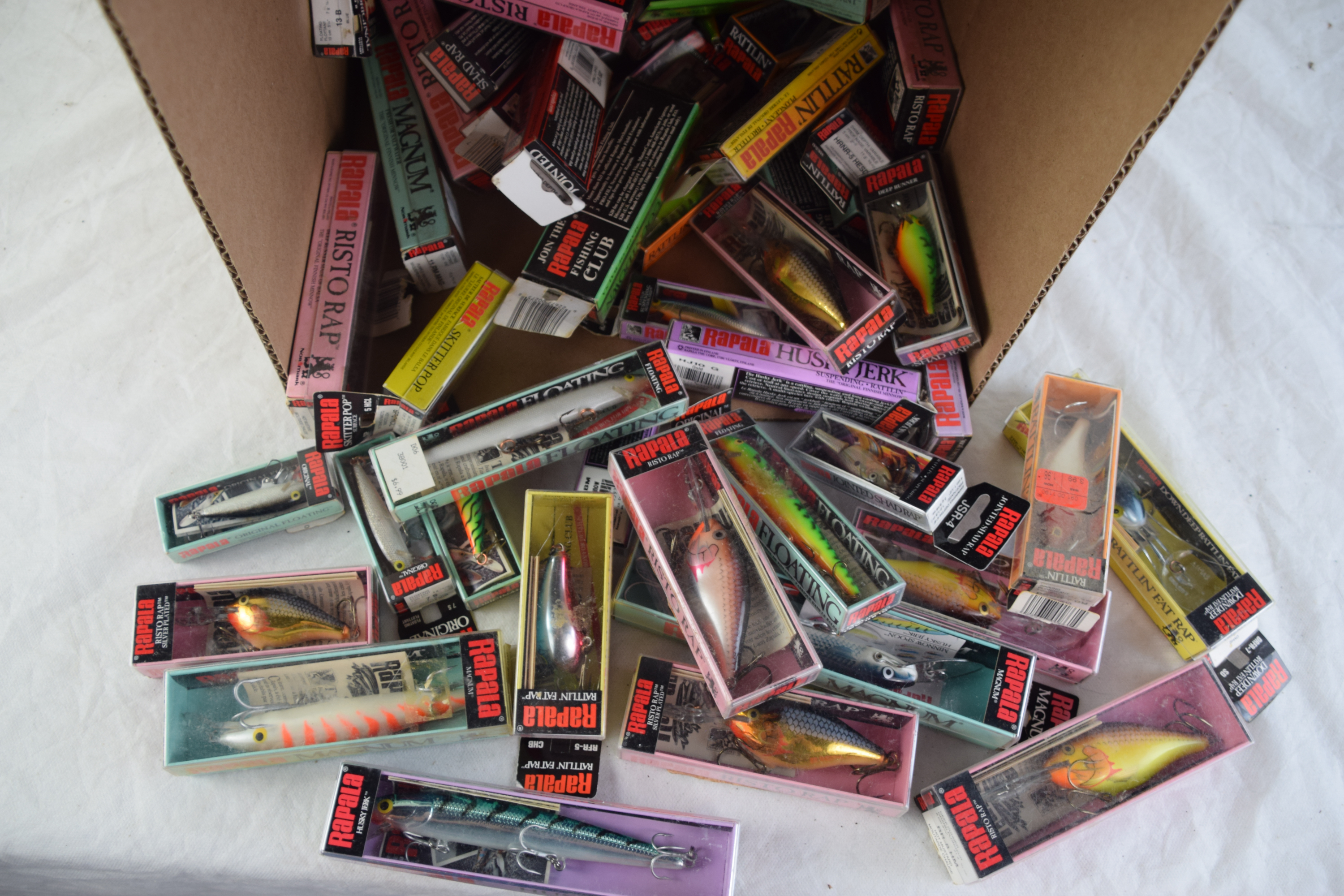 Dozens of Rapala fishing lures all in original box including original floating, floating jointed, Huskey Jerk, Risto Rap, Rattlin, Flat Rap, etc.