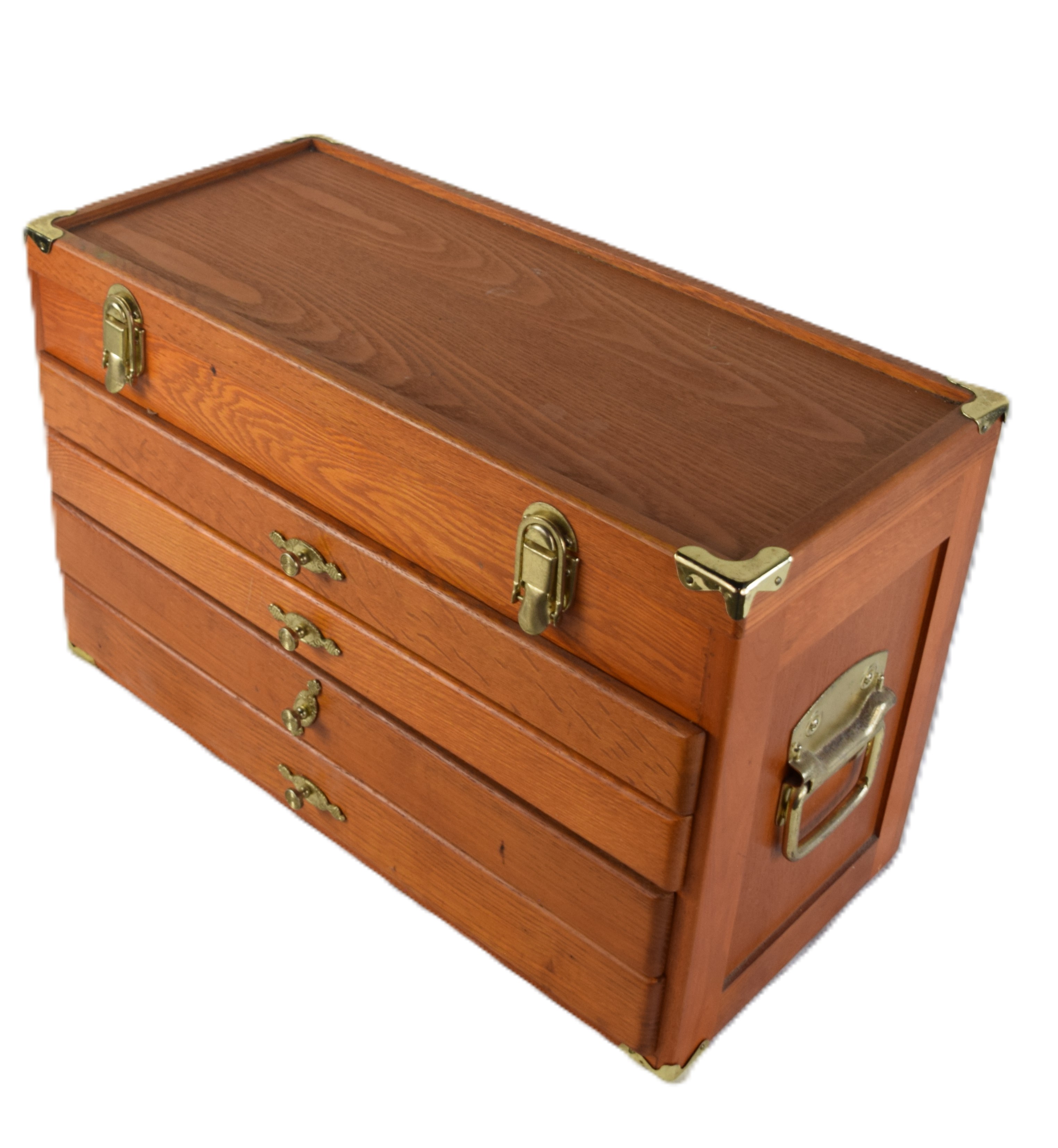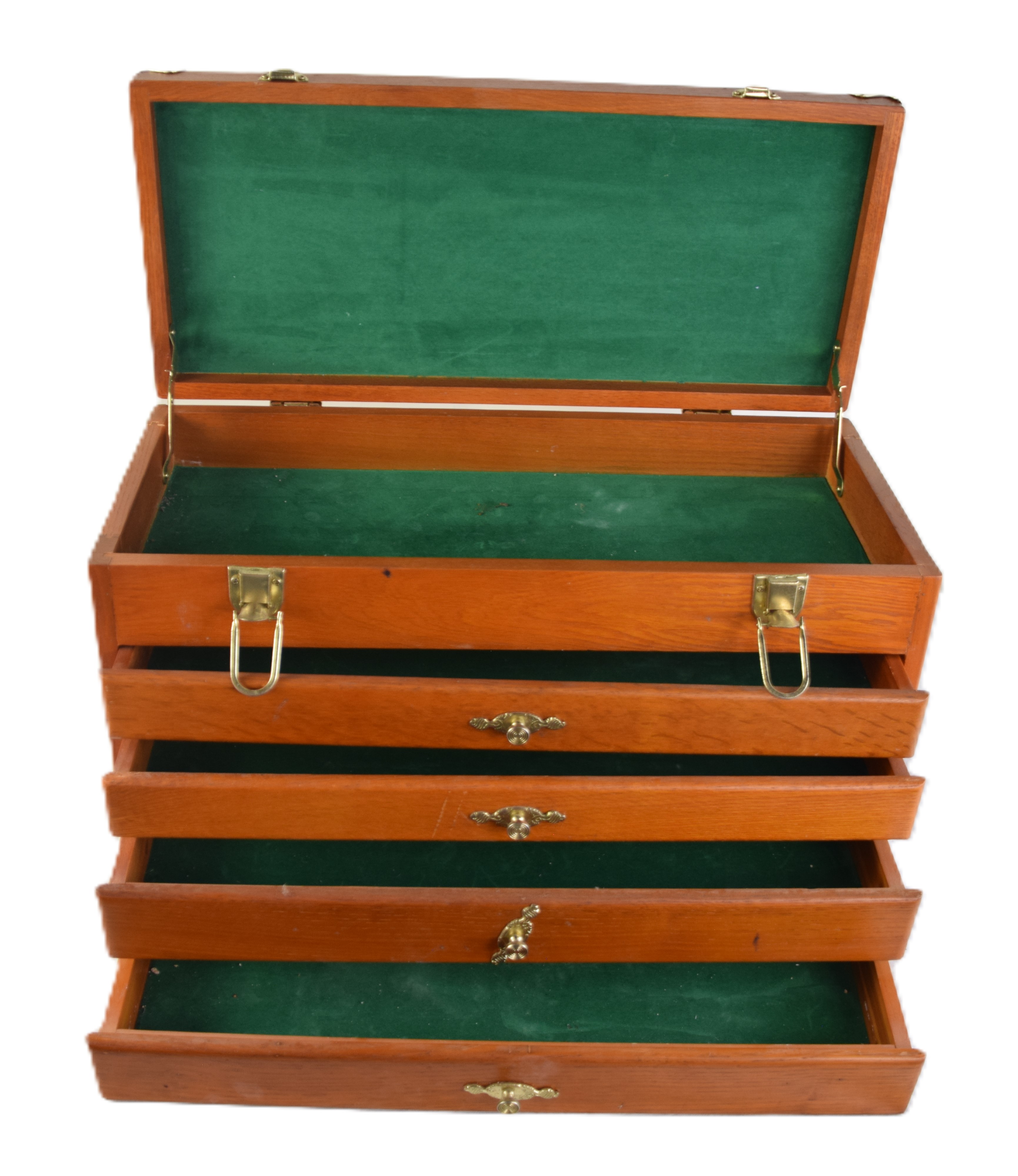 Oak collectors chest with 4 drawers and a top section, felt lined with handles on side. Dimensions: 12.5″ x 21″ x 9.5″