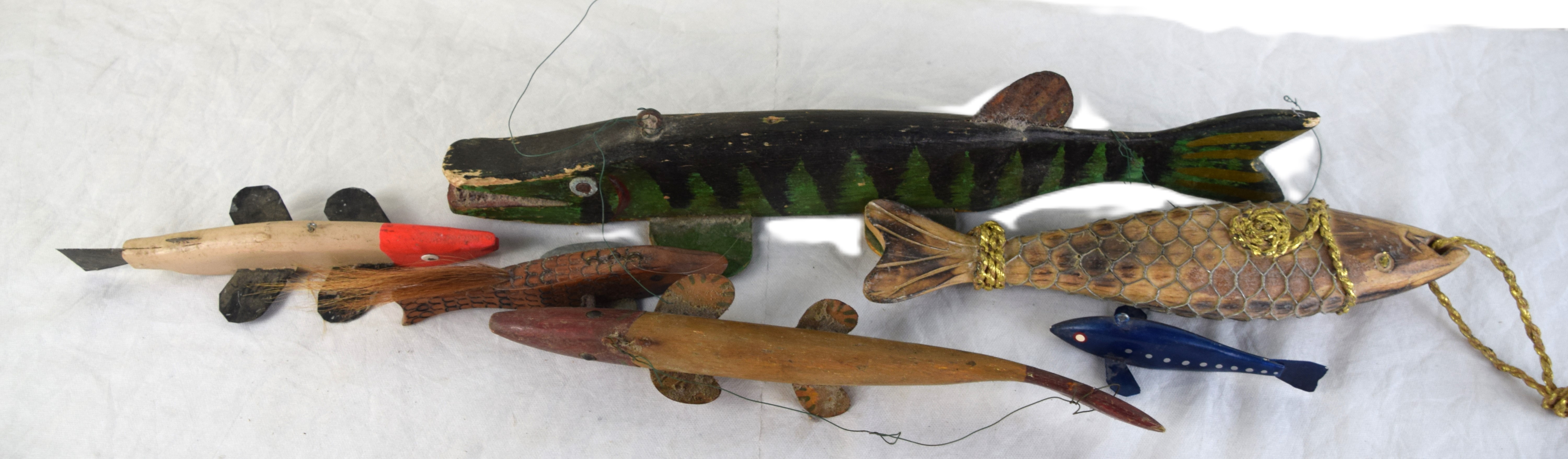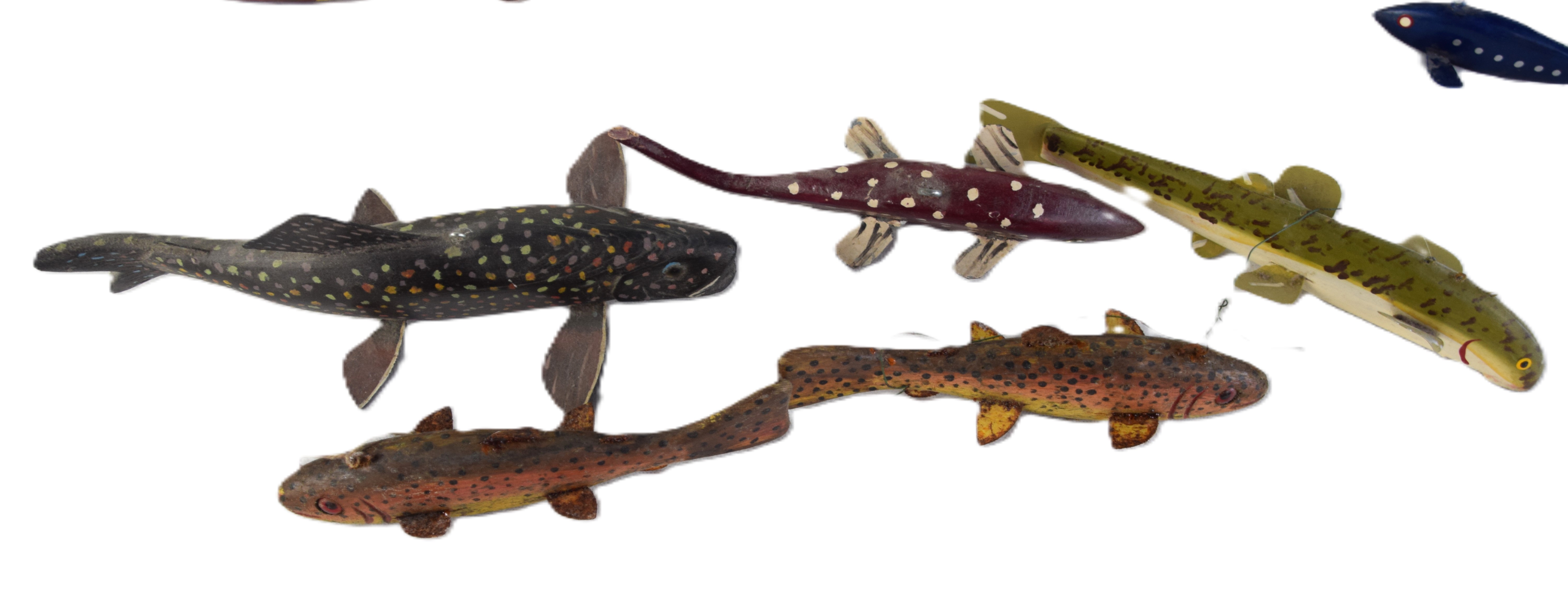 Collection of 12 large fish decoys including pickerel and rainbow trout, wooden with most having metal fins. Dimensions: 20″ to 6″
