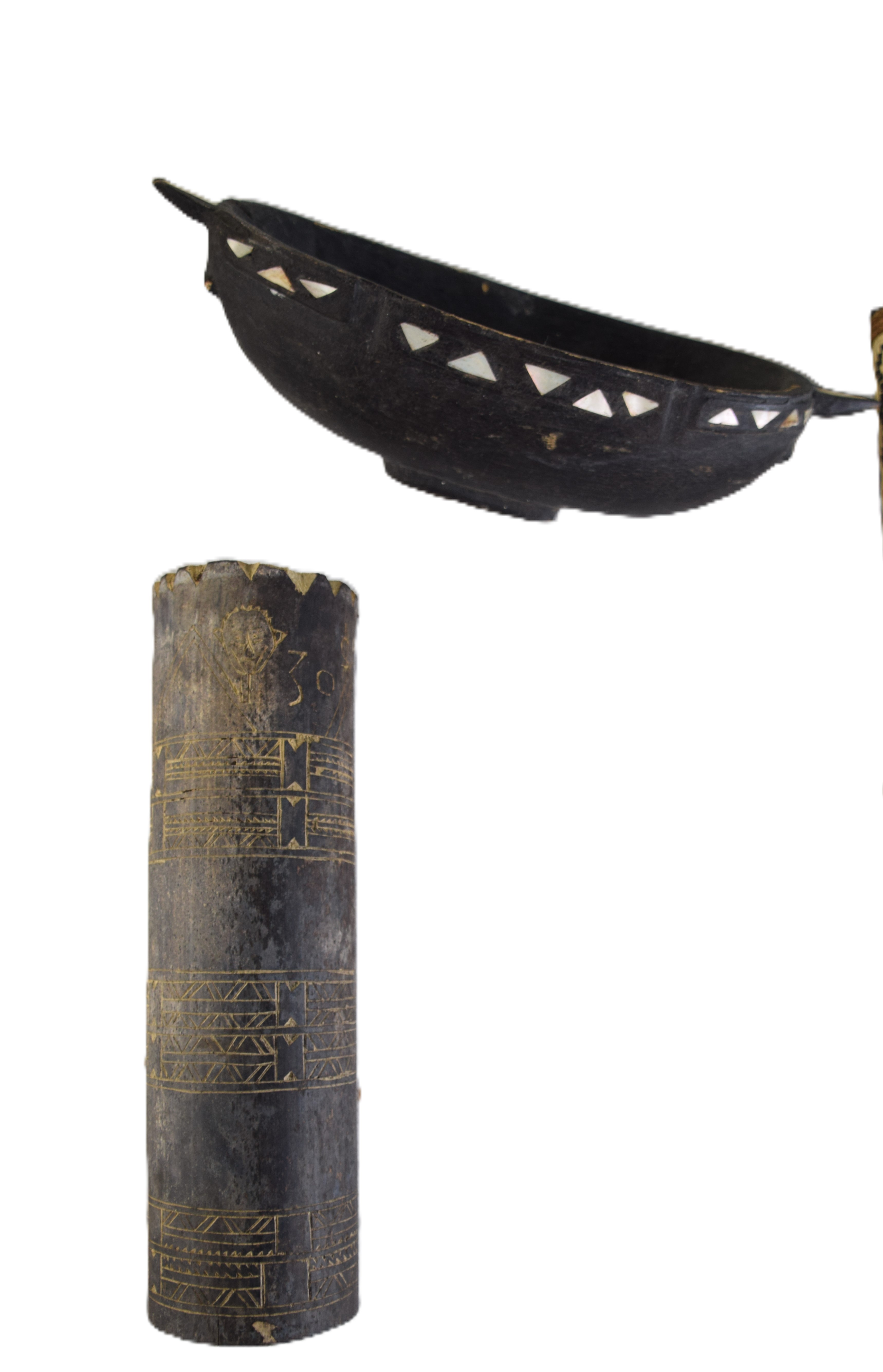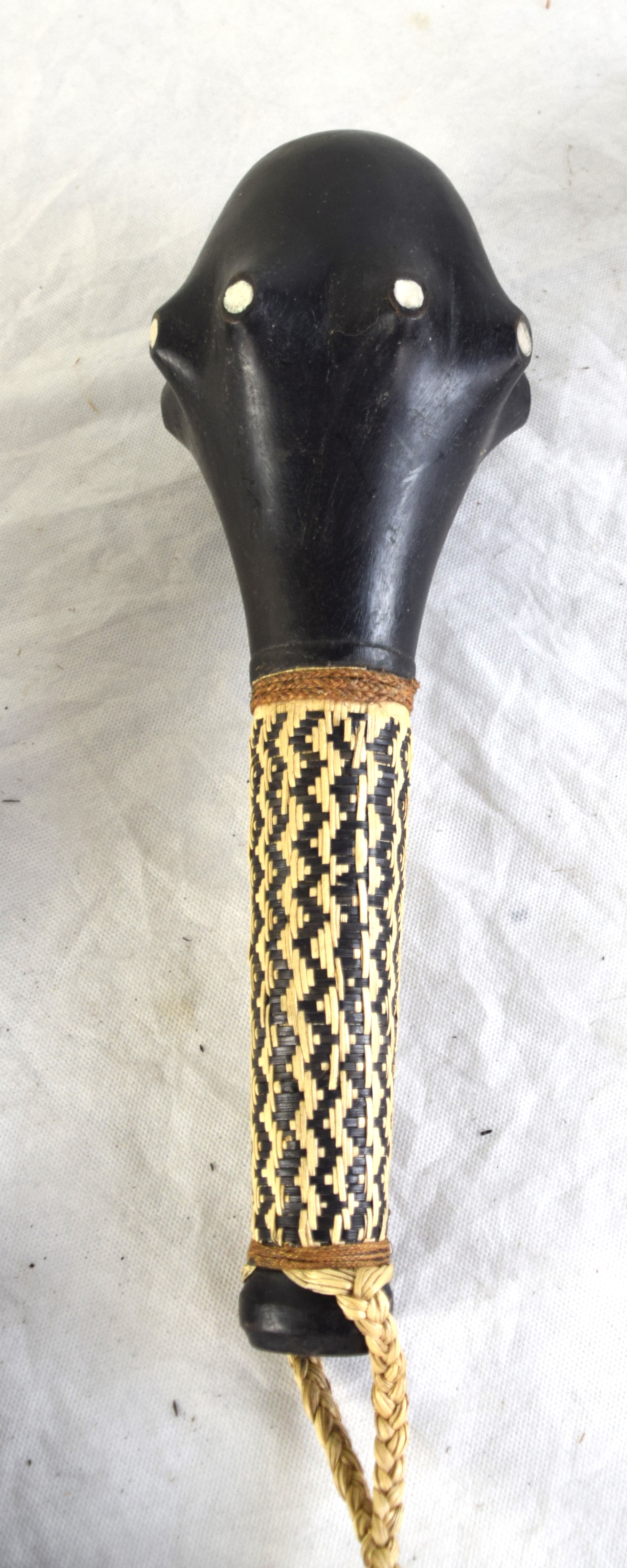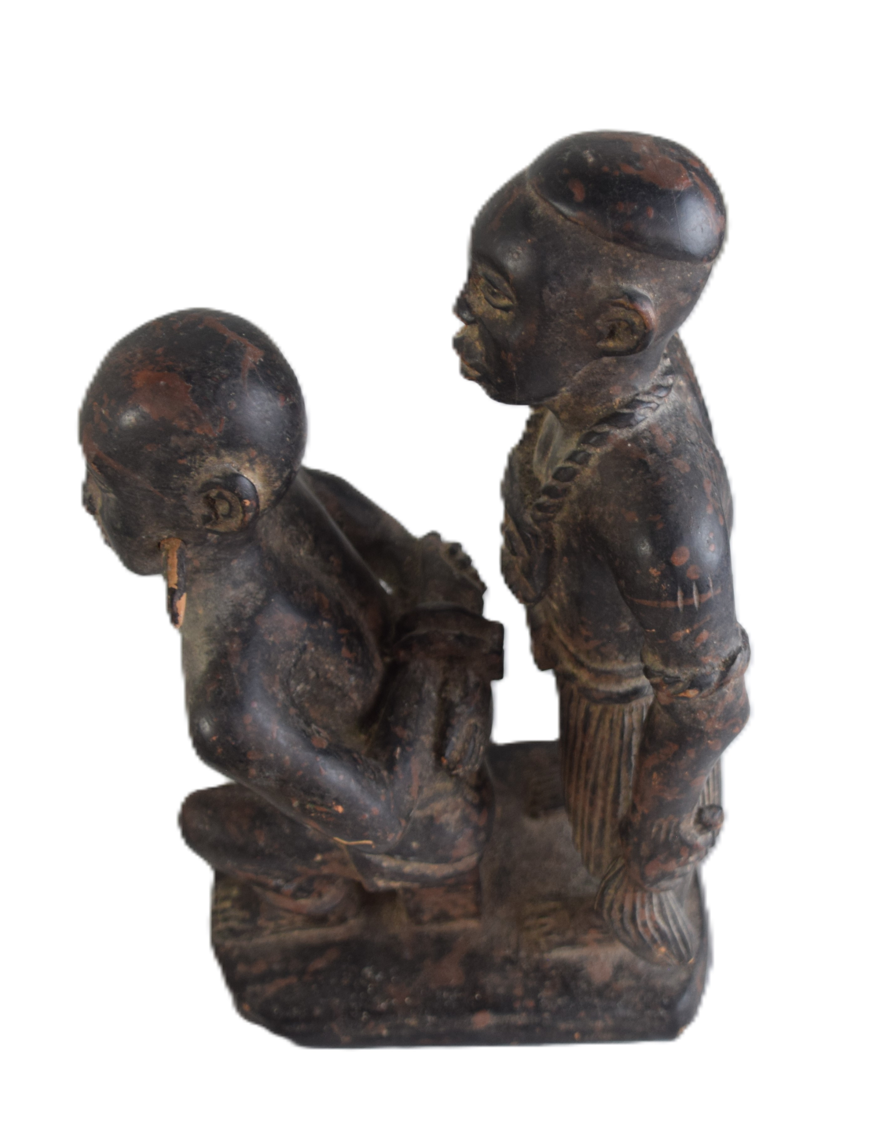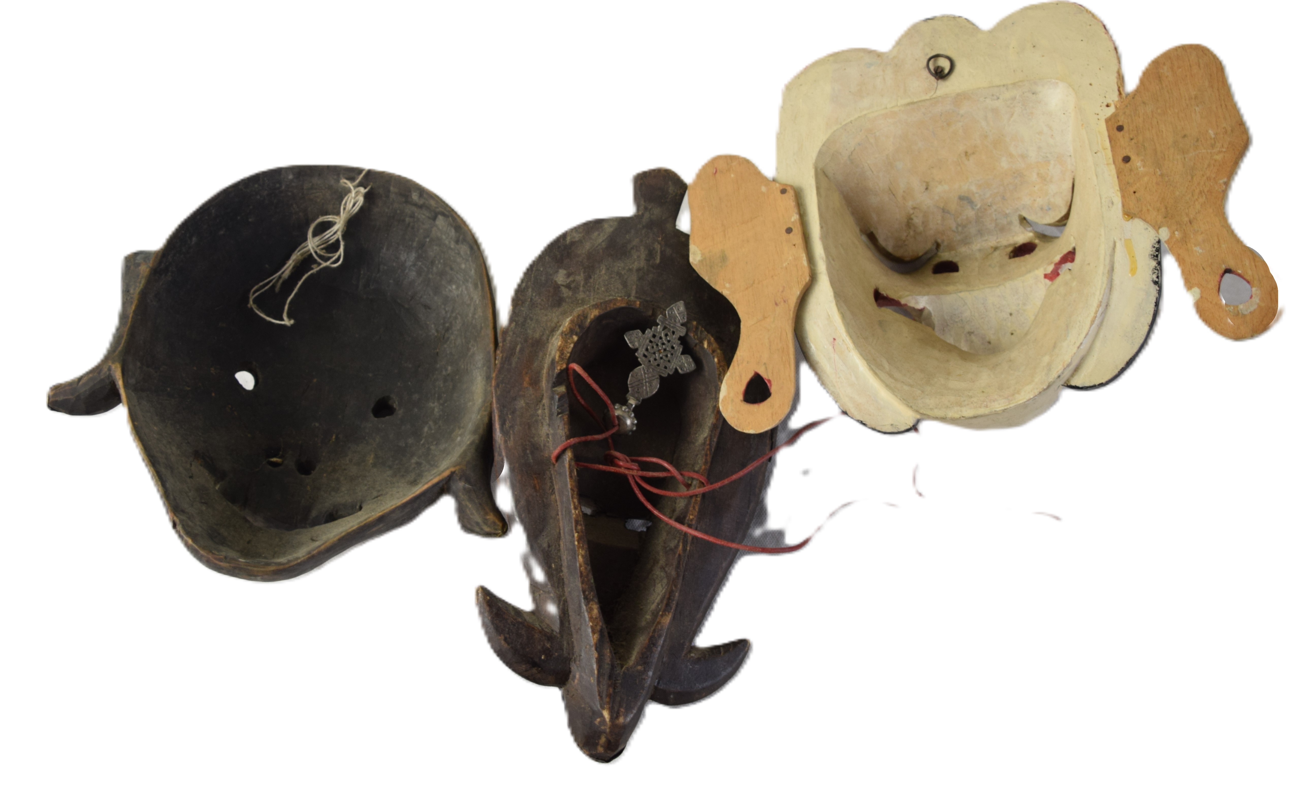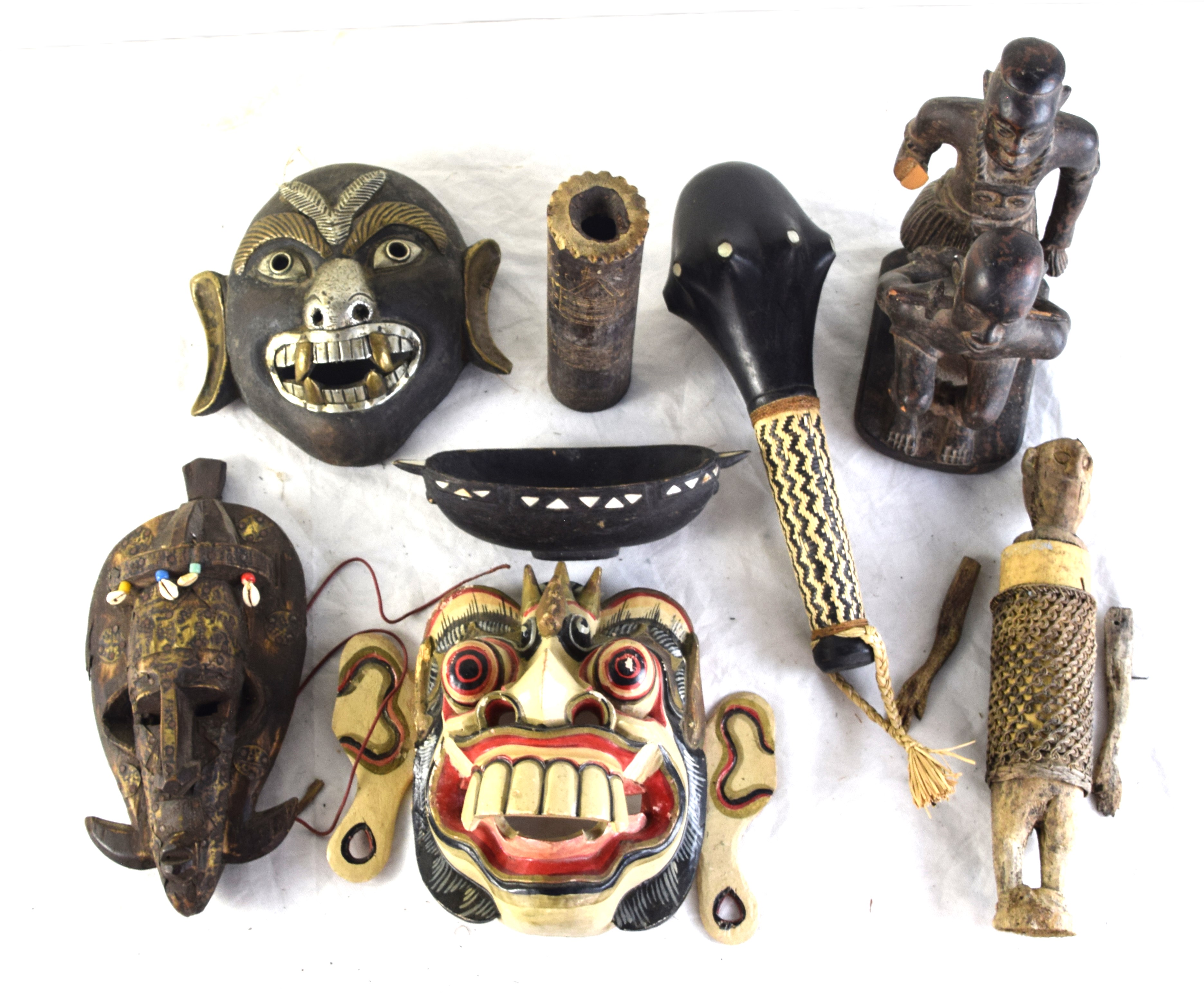 Collection of tribal items including three masks, one club, one statue, one boat, Carving of an African slaver and slave. All in varies sizes