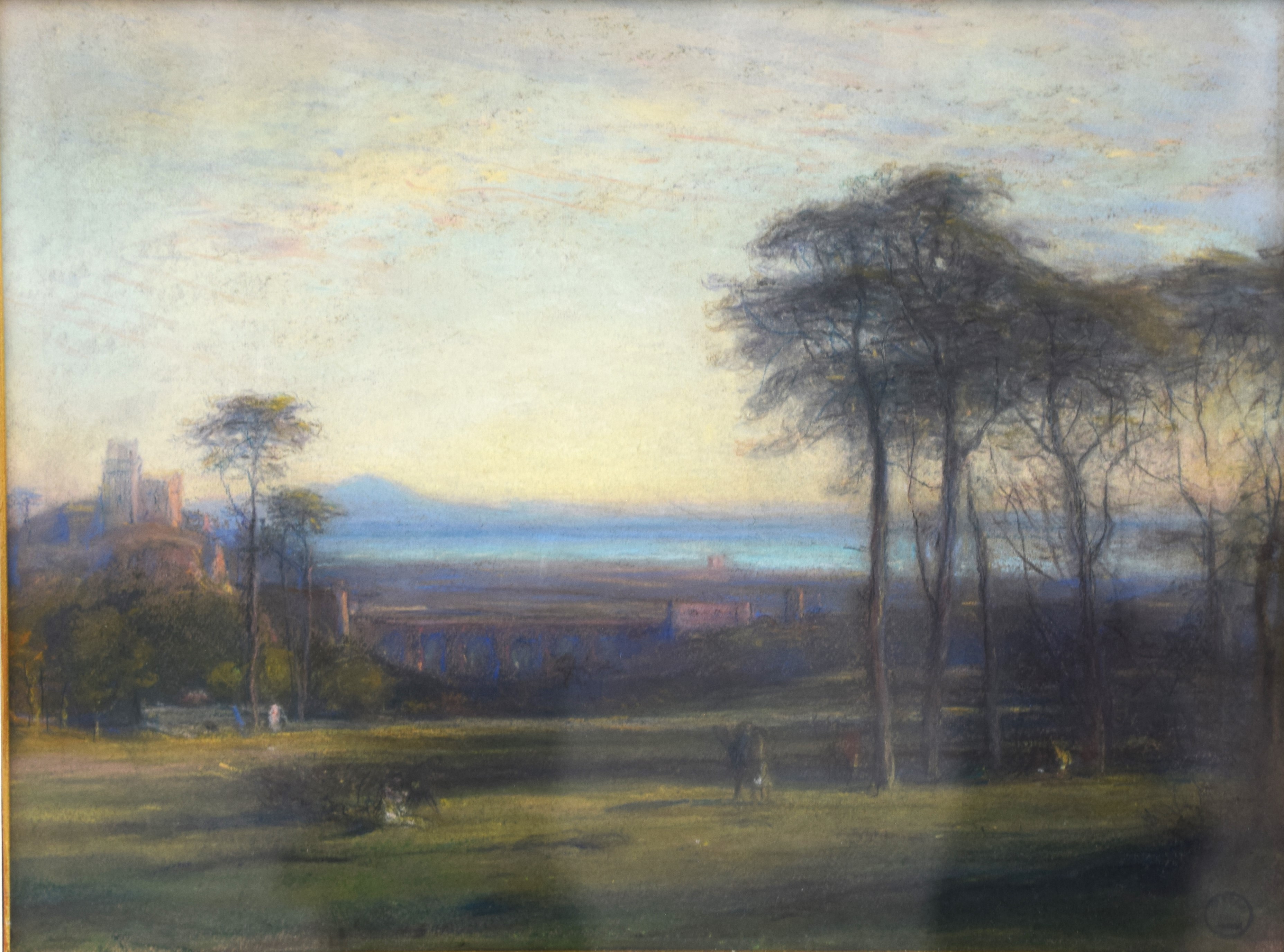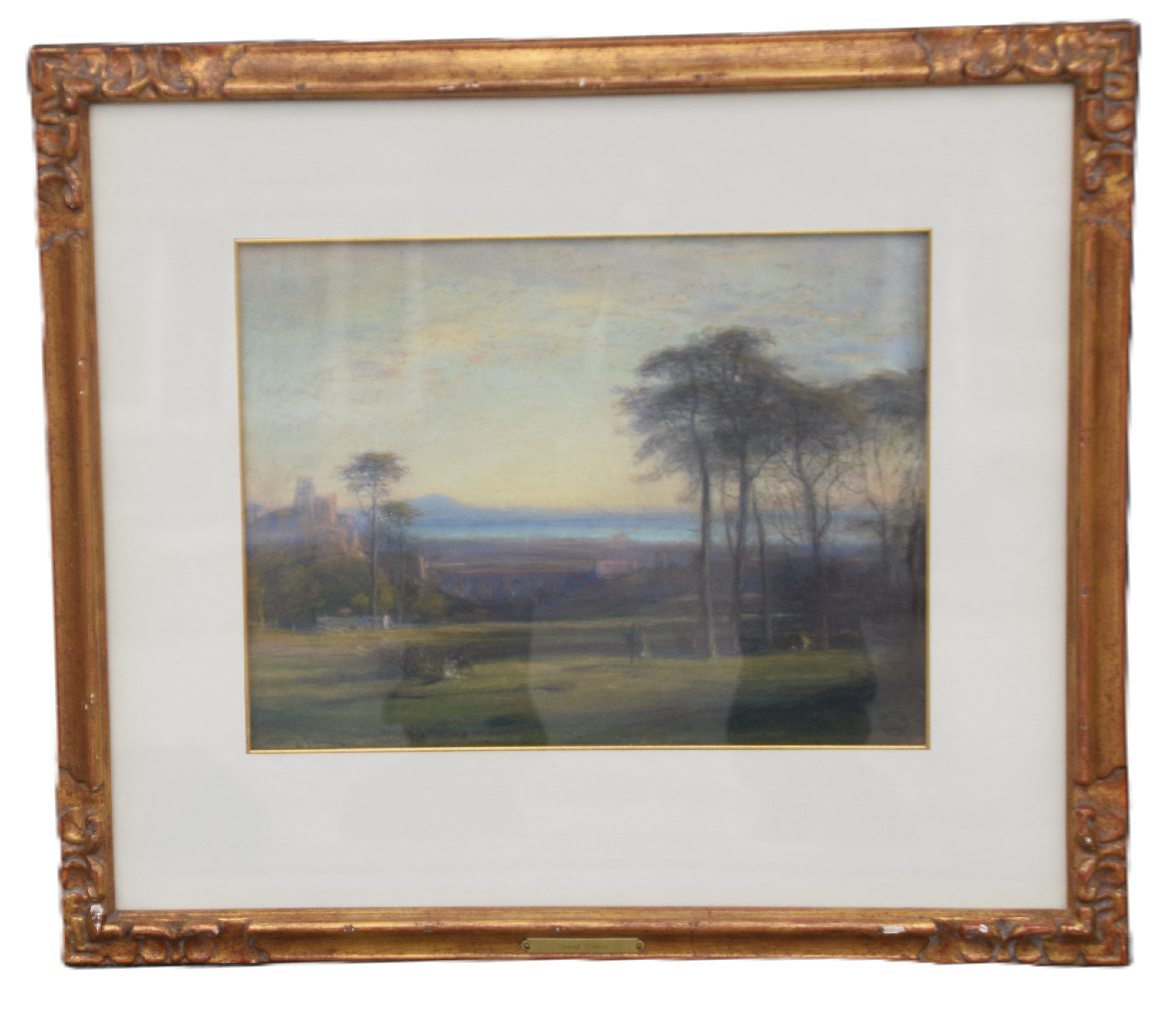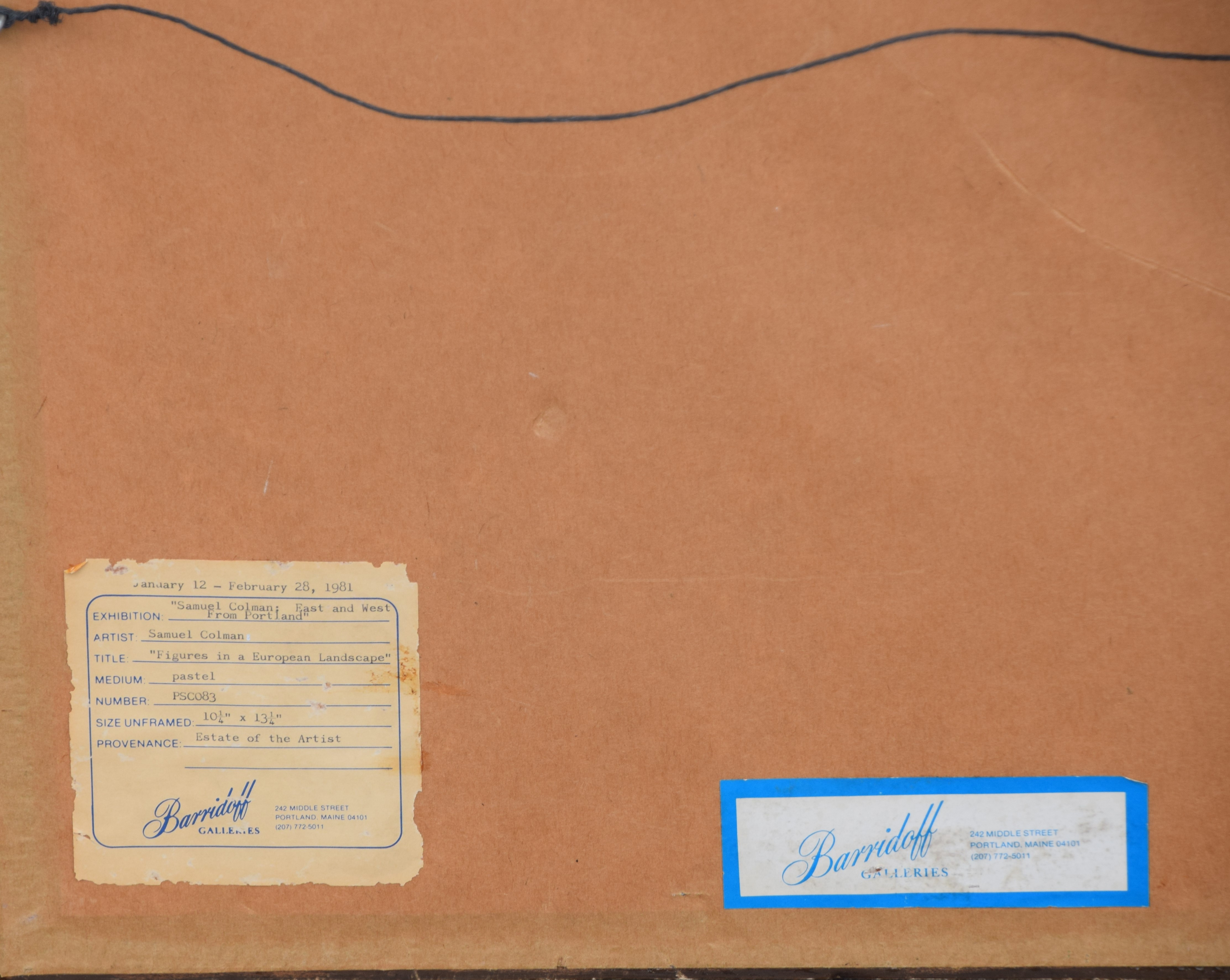 Framed pastel of a European landscape by Samuel Coleman, marked lower right. Coleman was a significant landscape painter of the second generation of the Hudson River School. Provenance: From the artist to Barridoff Galleries. Dimensions: 10 1/4″ x 13 1/4″