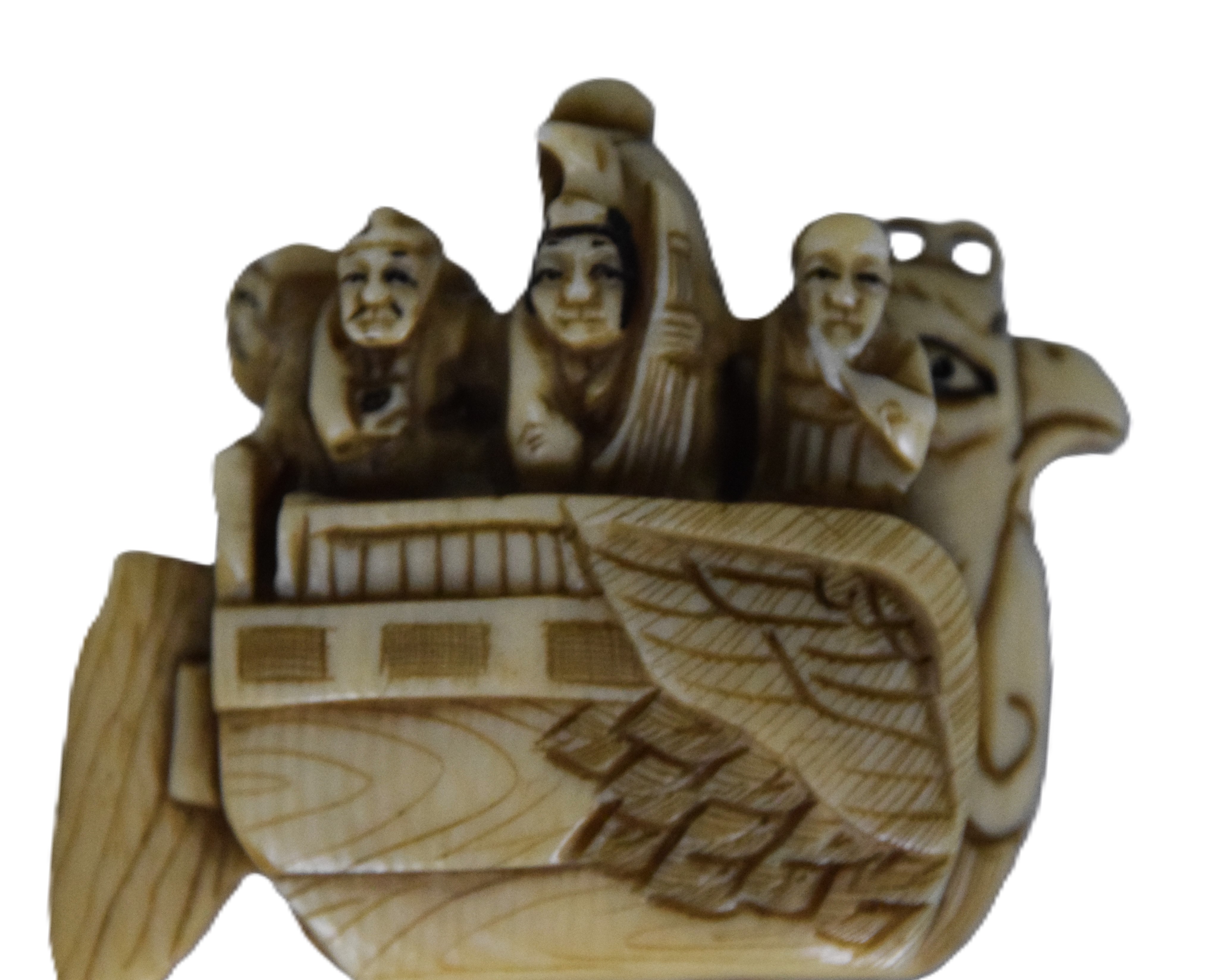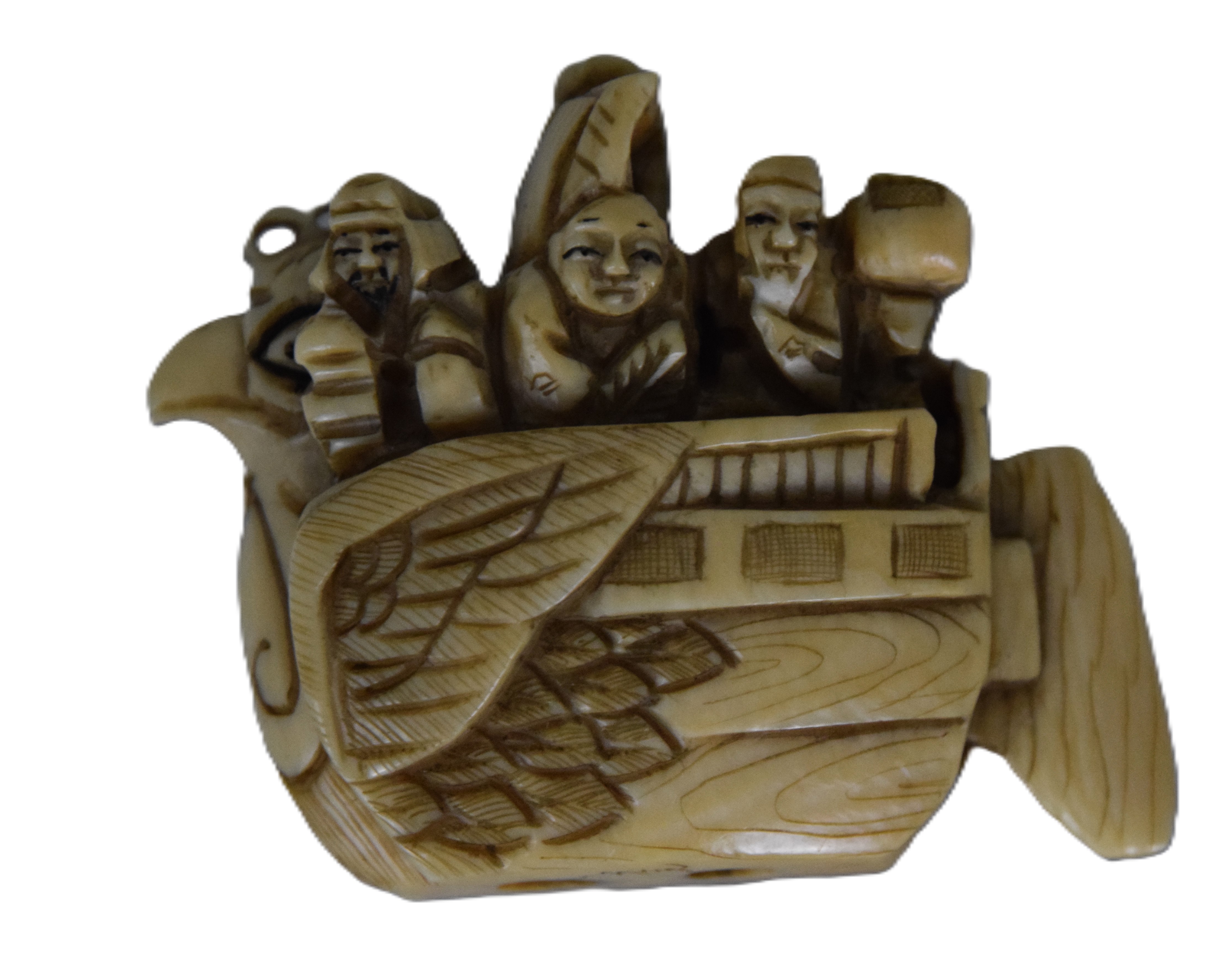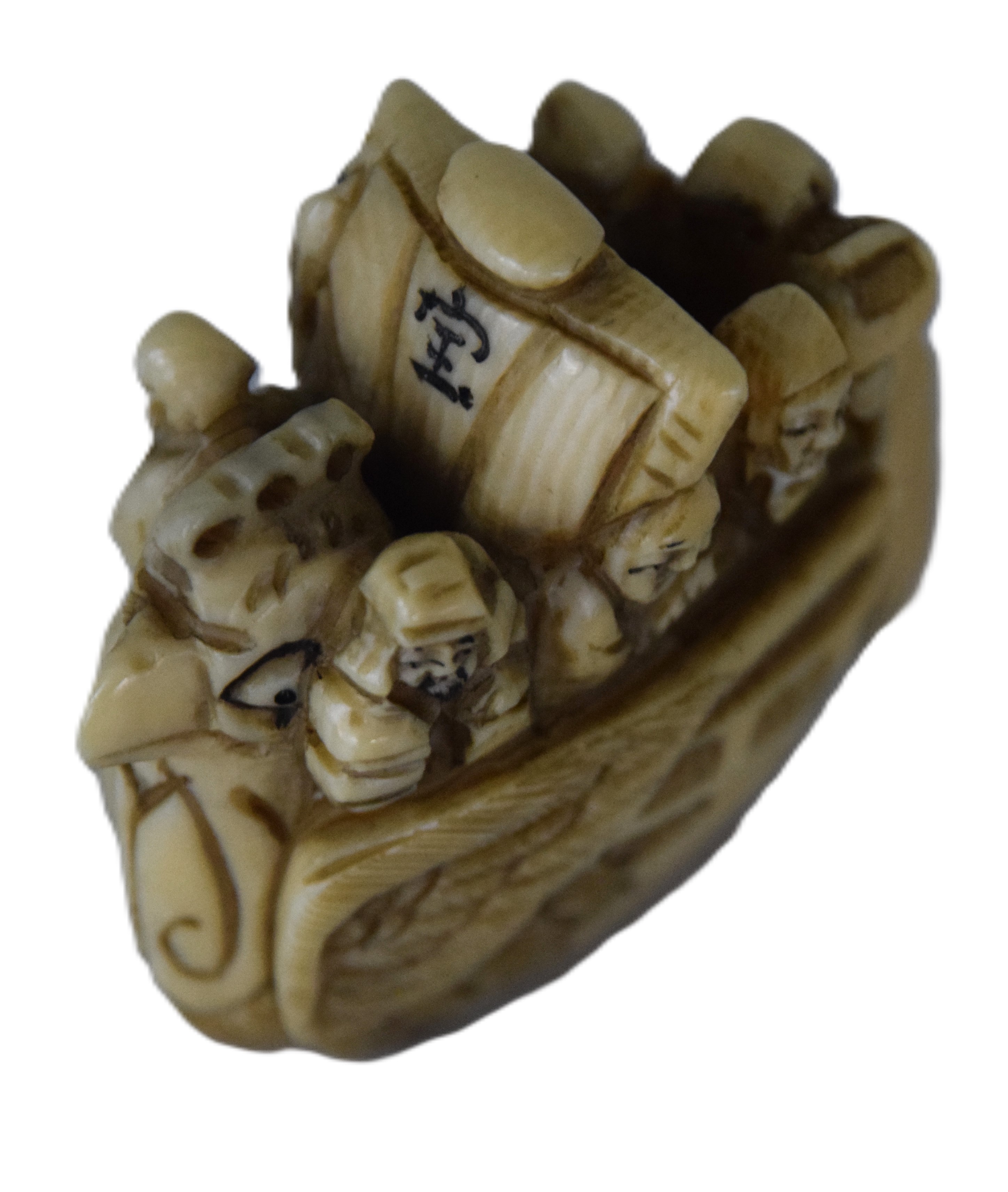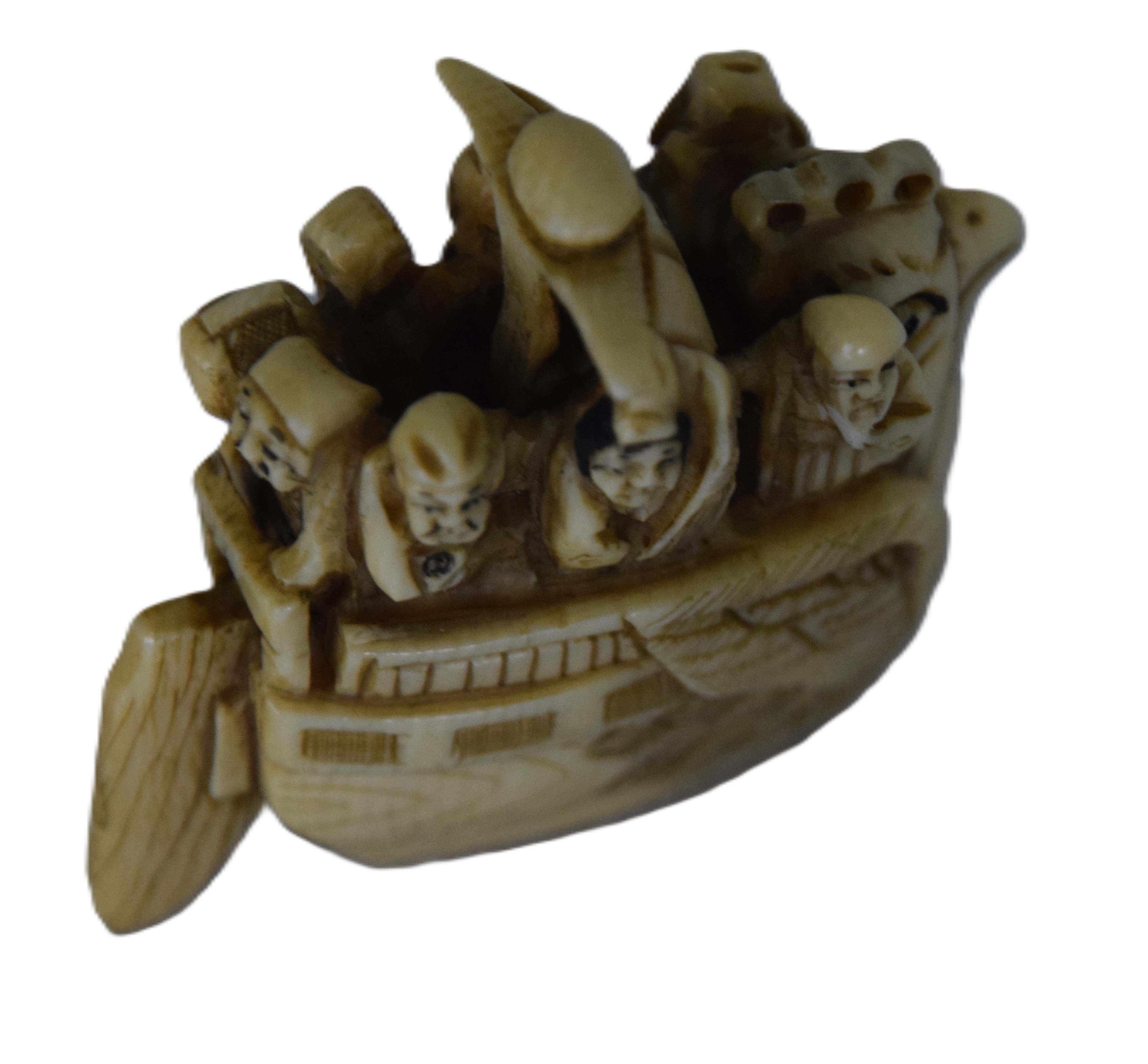 Highly detailed Netsuke carved boat with rudder, mast and bird with seven passengers. Dimensions: 1 3/4″ H