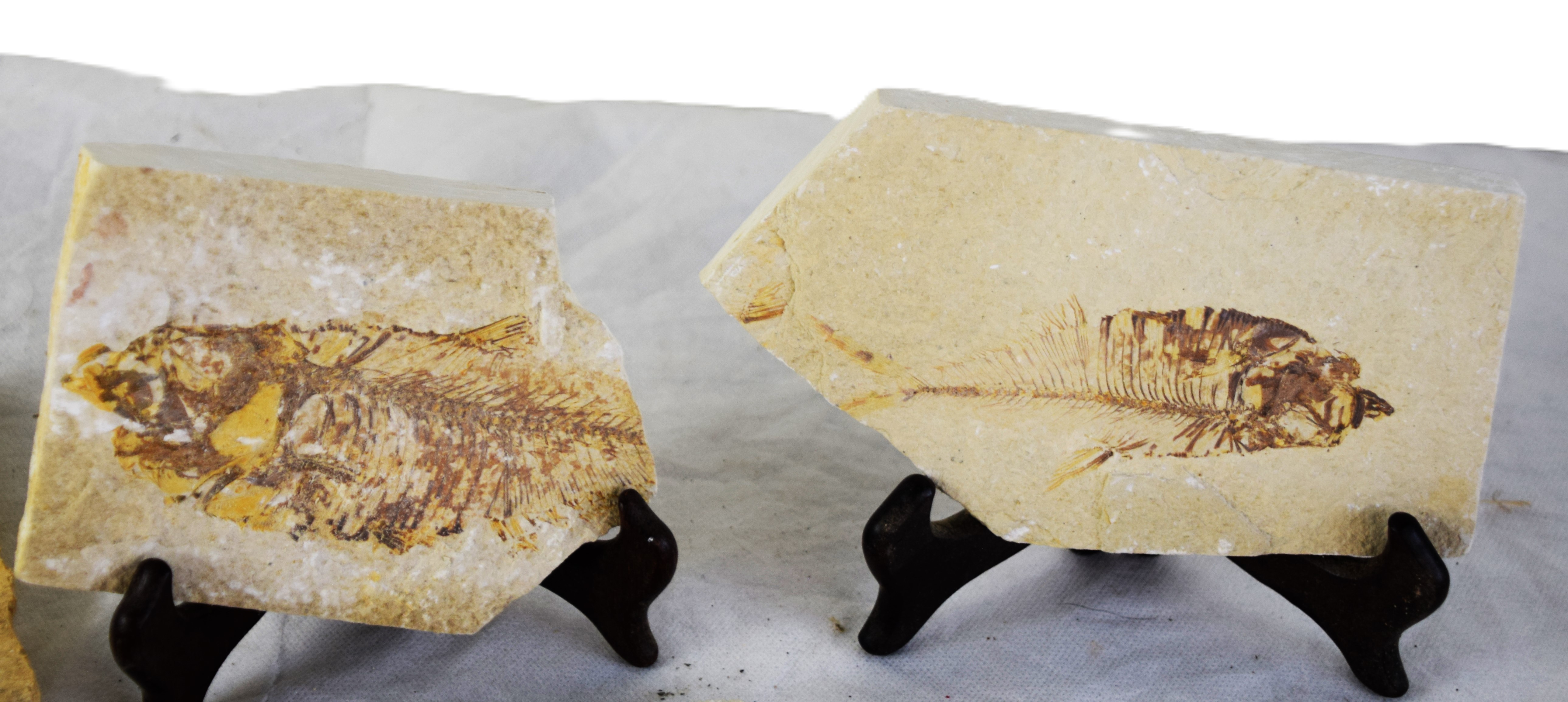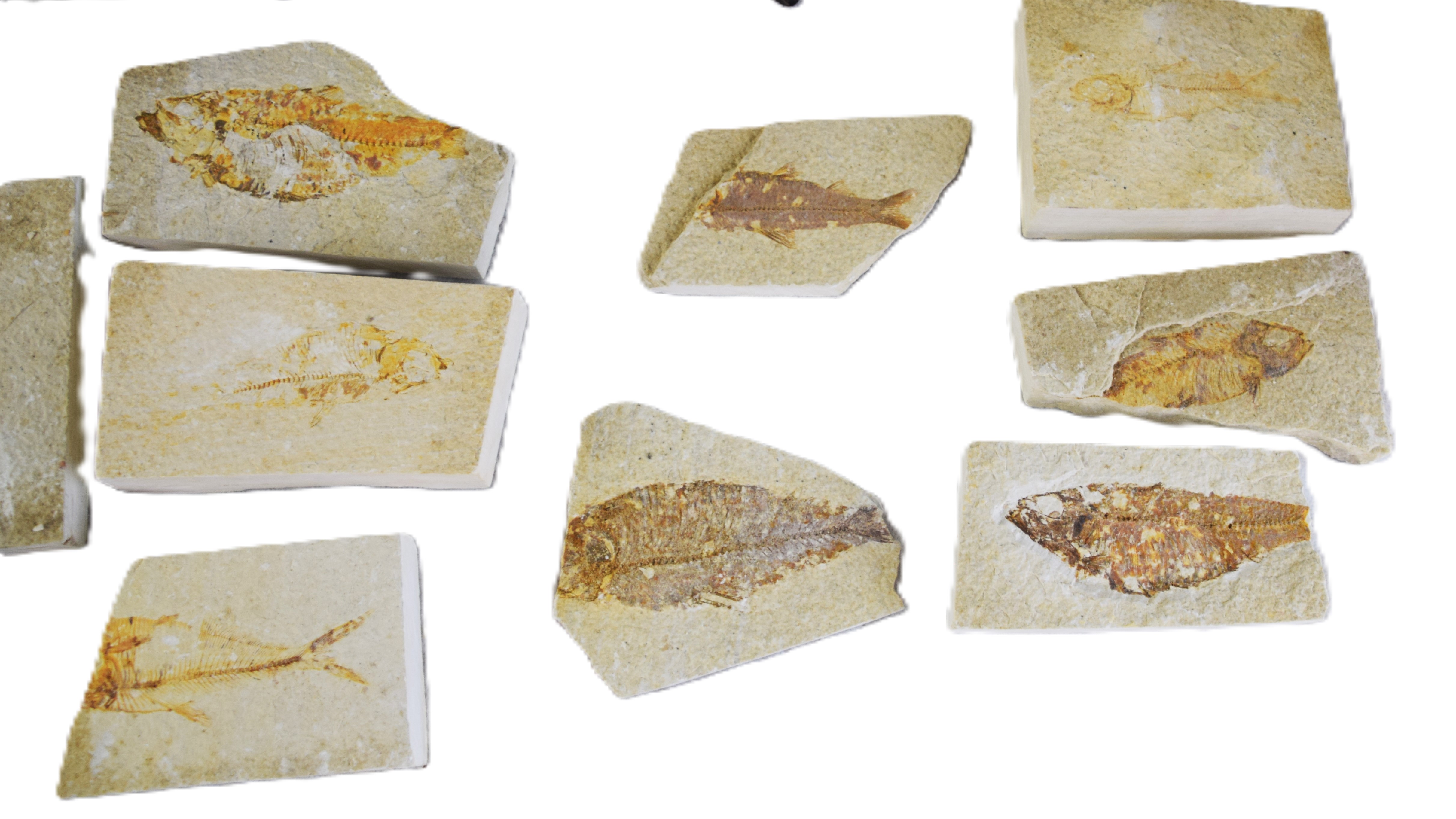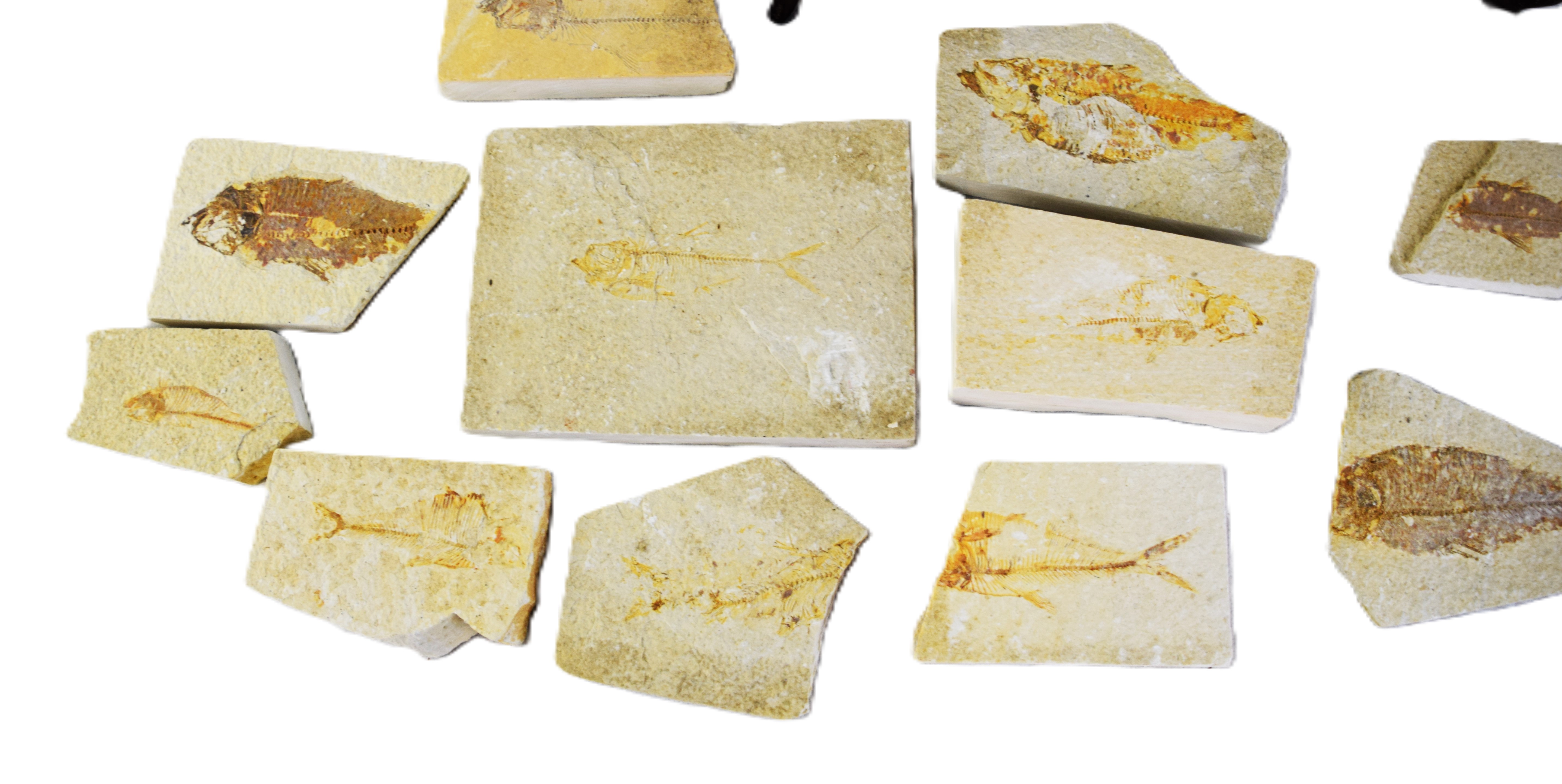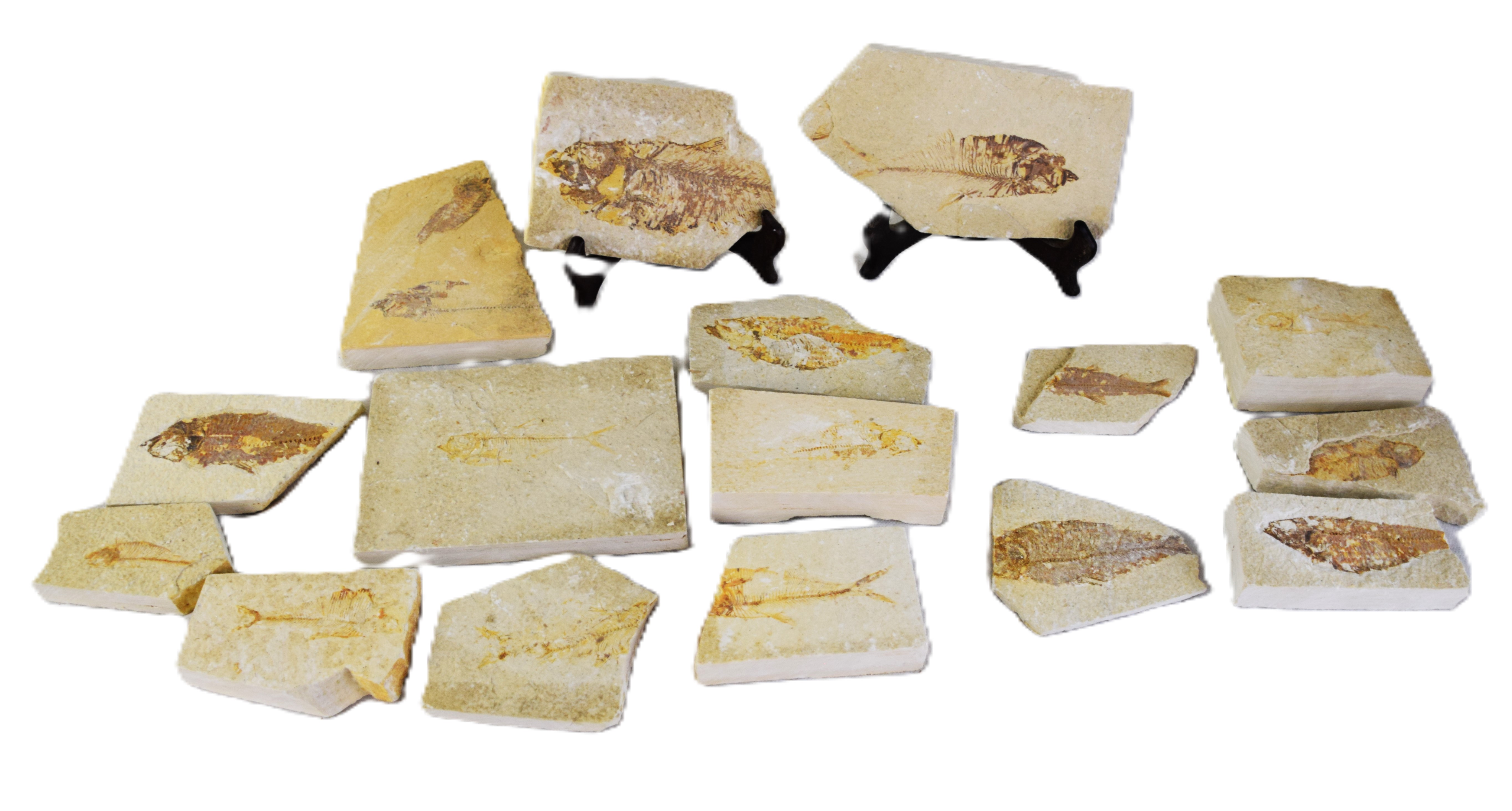 A collection of 16 fossil fish largely from Green River, Wyoming.