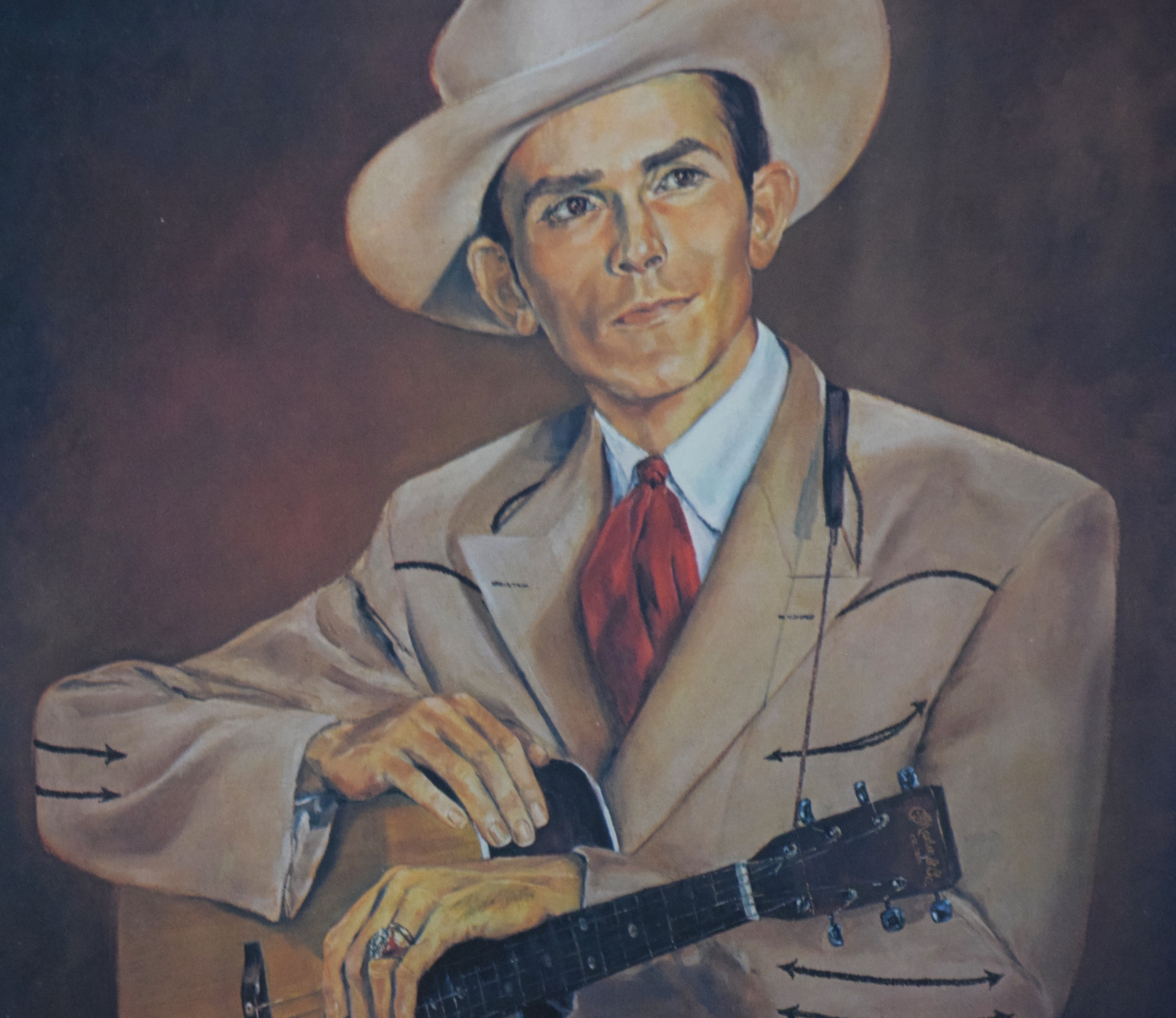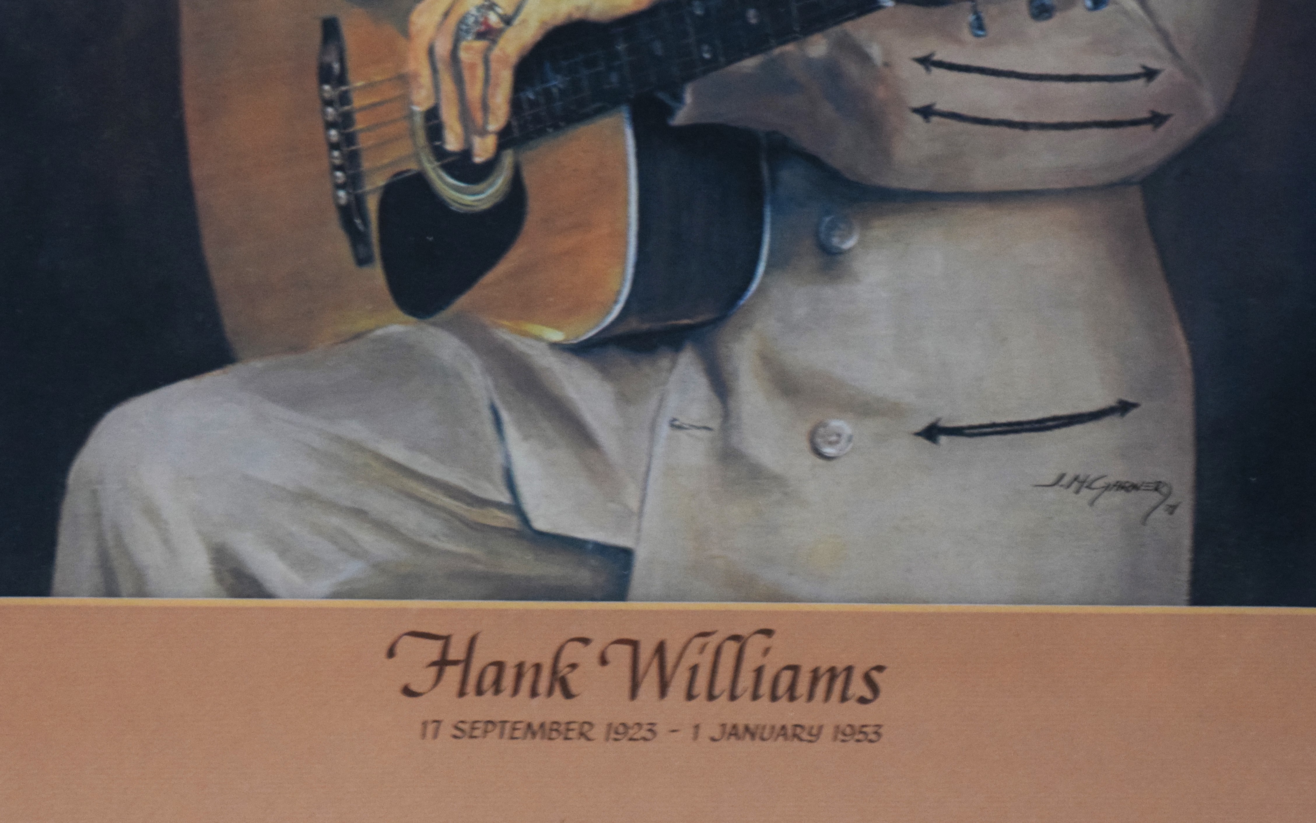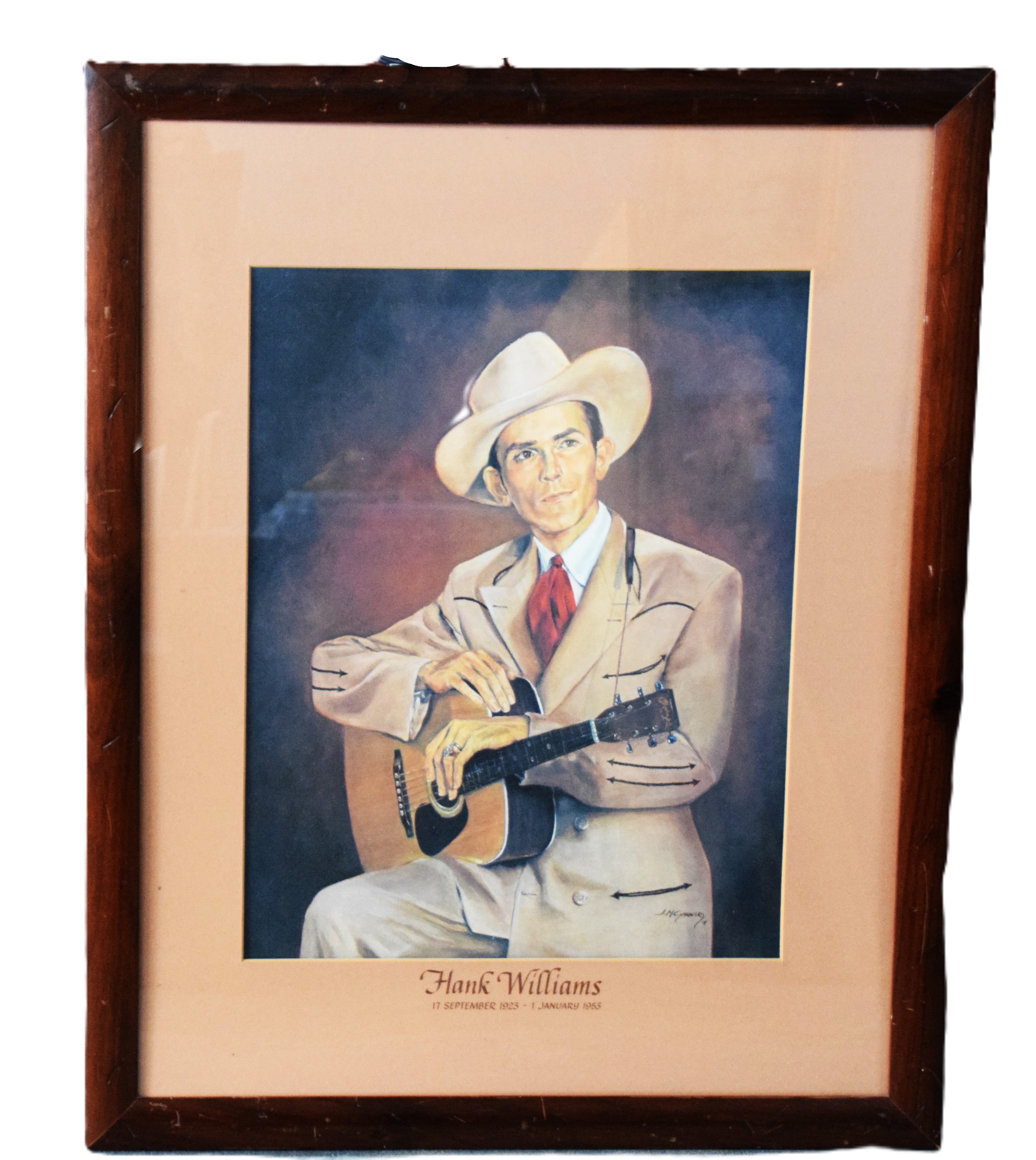 Framed Hank Williams watercolor signed by J.M. Gardner. Dimensions: 19.5″ x 15.5″