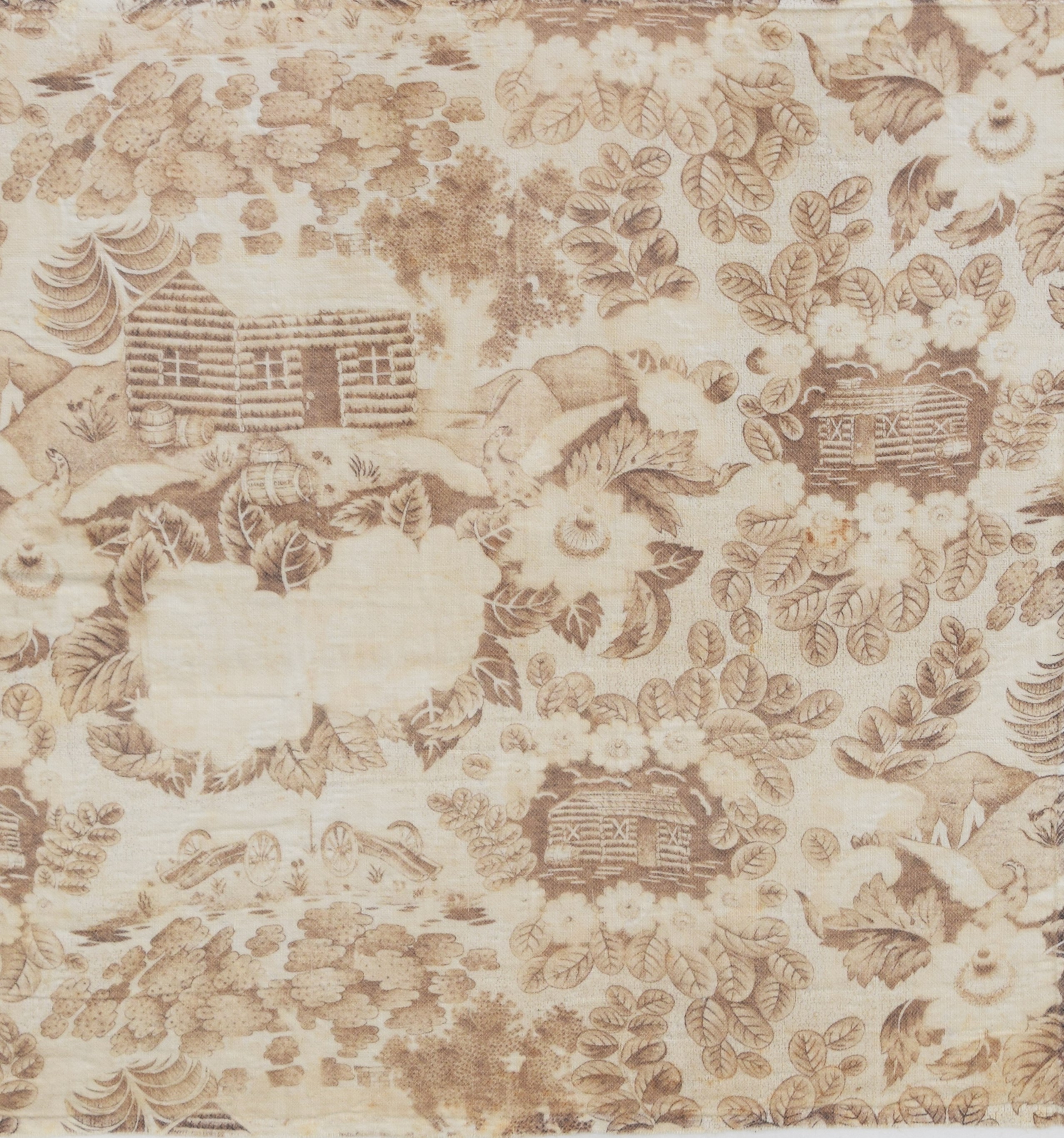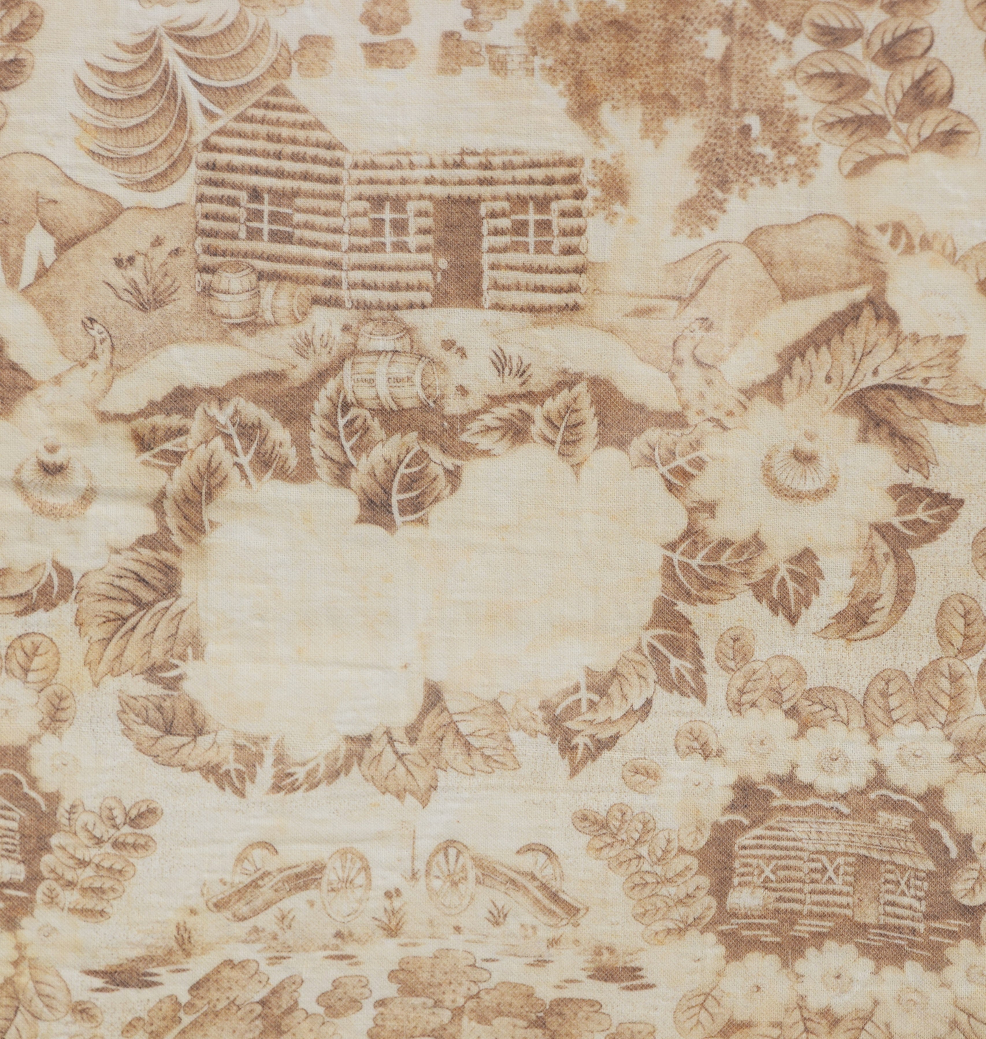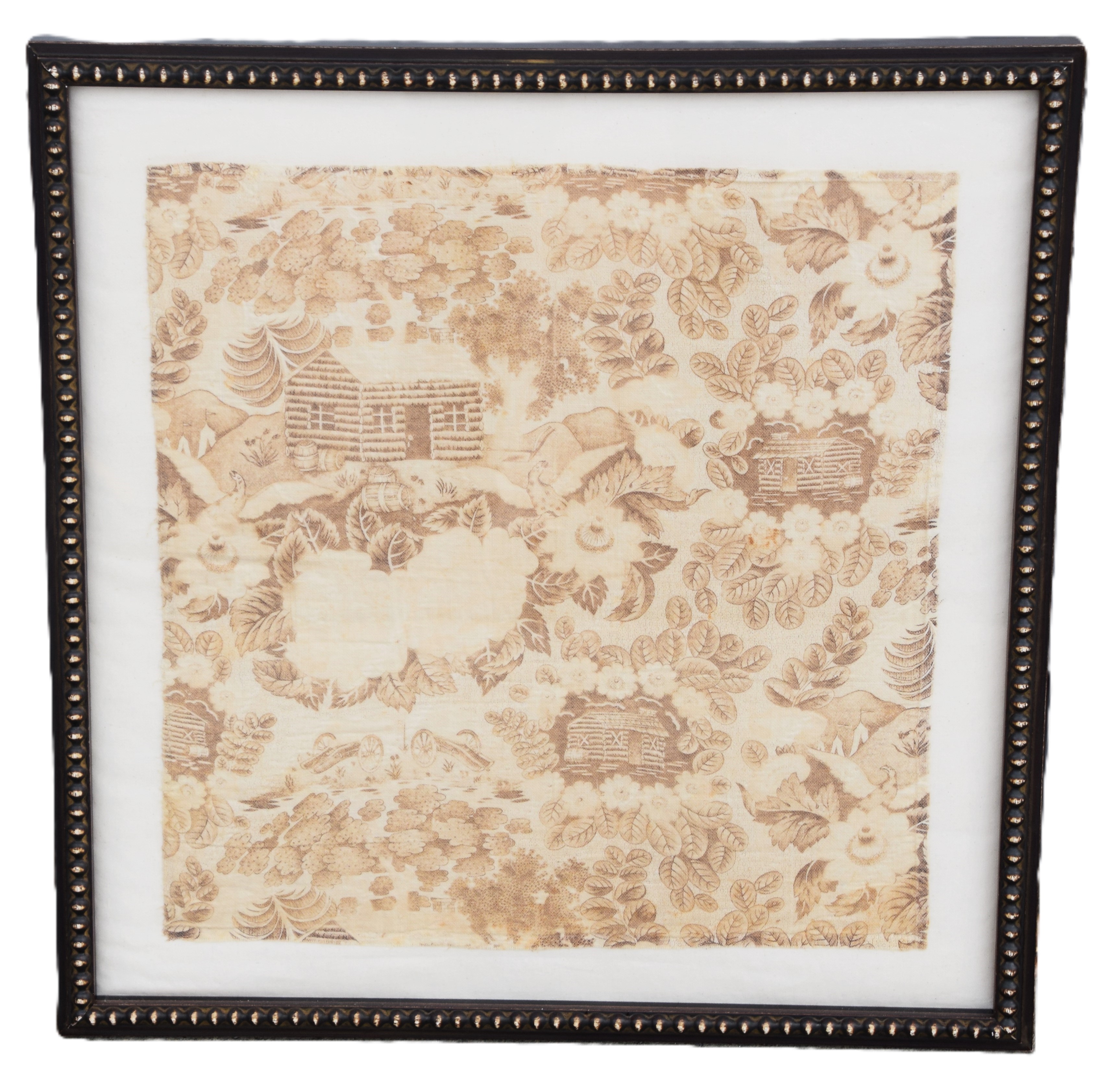 Framed President William Harrison campaign chintz from his log cabin campaign. The Whigs adopted the cabin and cider as emblems, both of which were commonly seen at their rallies and became symbolic of the party’s connection with the grass roots. Harrison rallies grew to unprecedented size, and the candidate delivered speeches , breaking the usual custom that the office should seek the man and presidential hopefuls should not campaign. Dimensions: 17″ x 16″