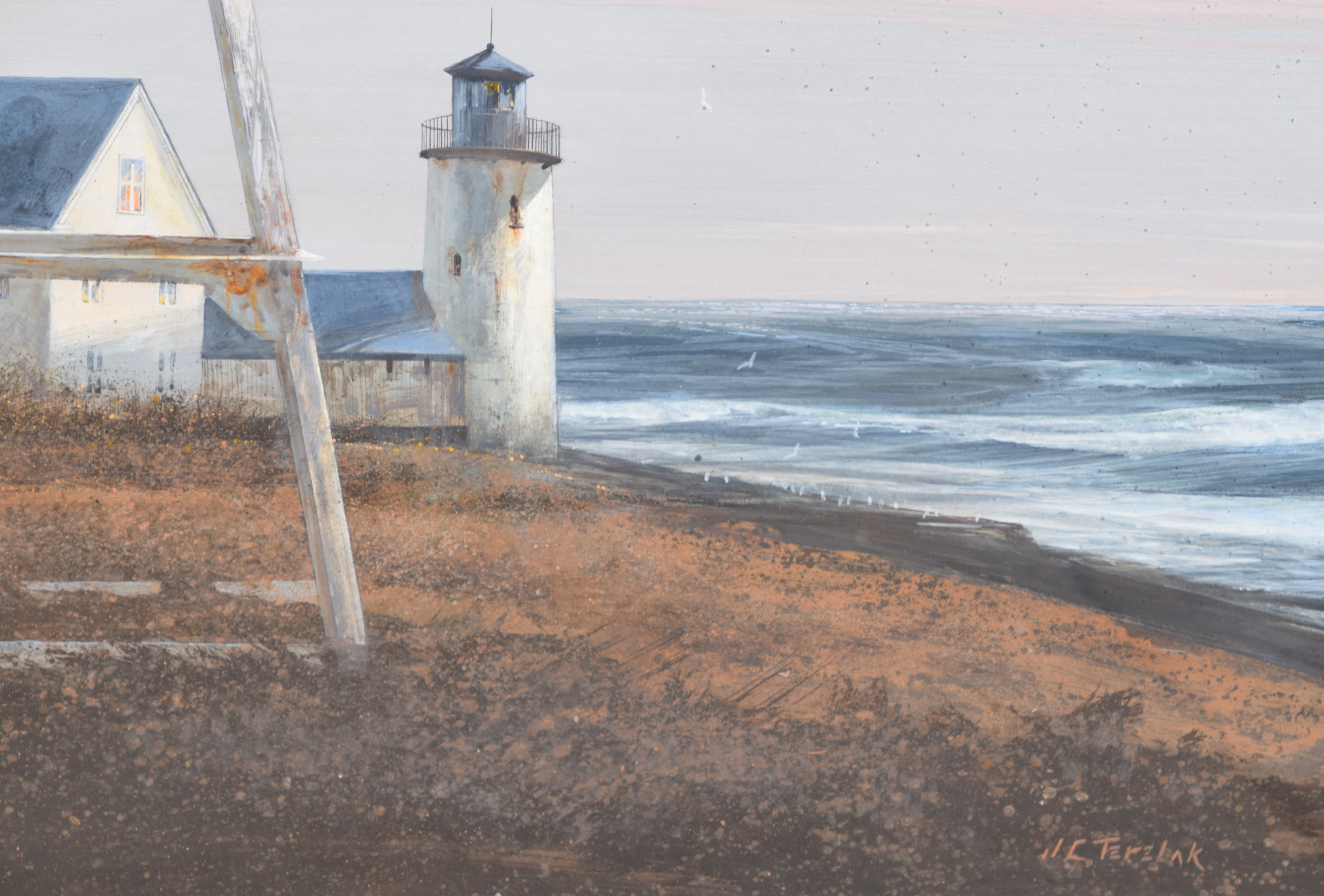 Framed color print of a lighthouse scene, signed lower right. John Charles Terelak (Born 1942) works in Massachusetts and is known for marine and coastal landscape paintings. Dimensions: 24″ x 31″ Image size