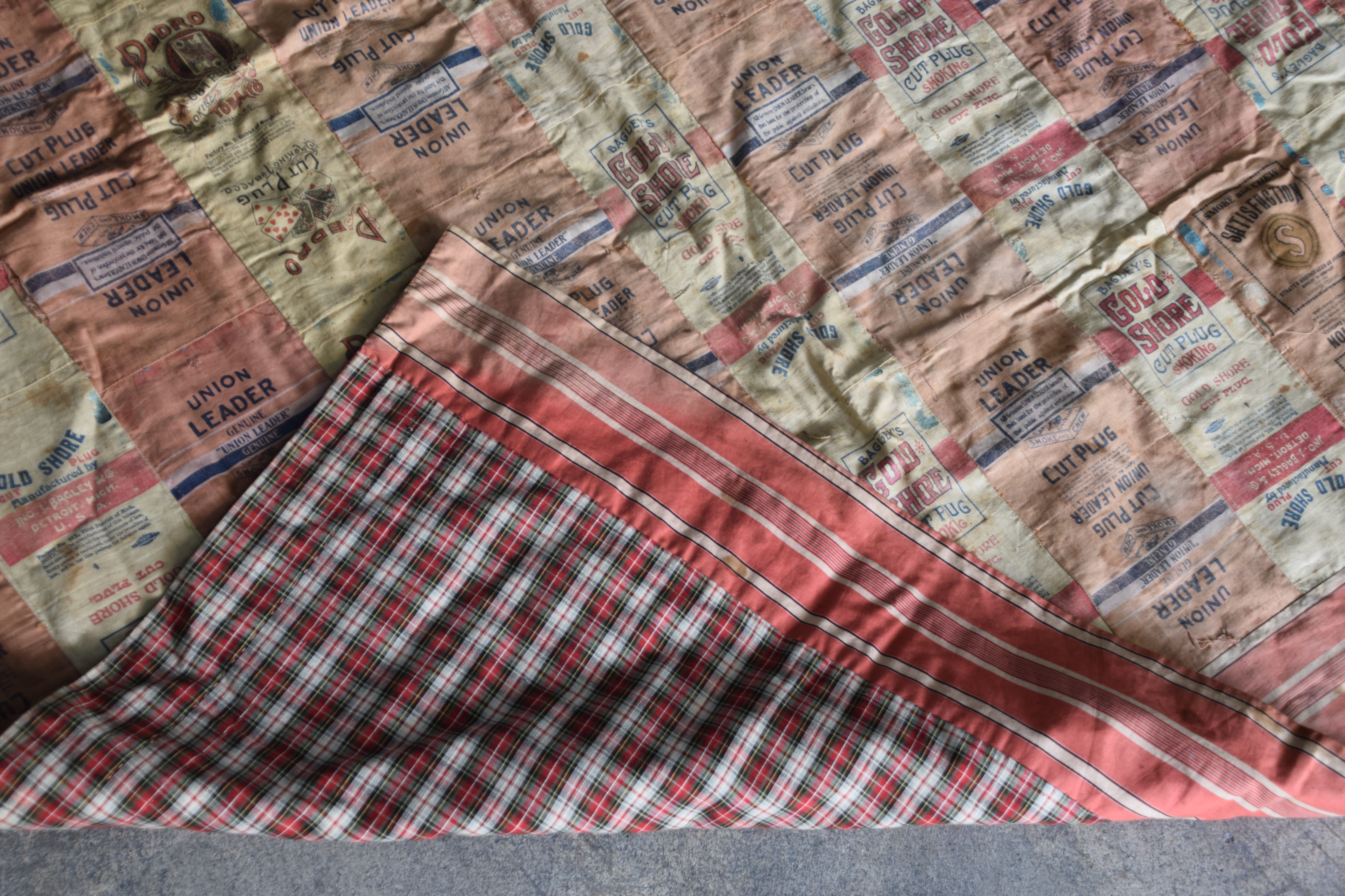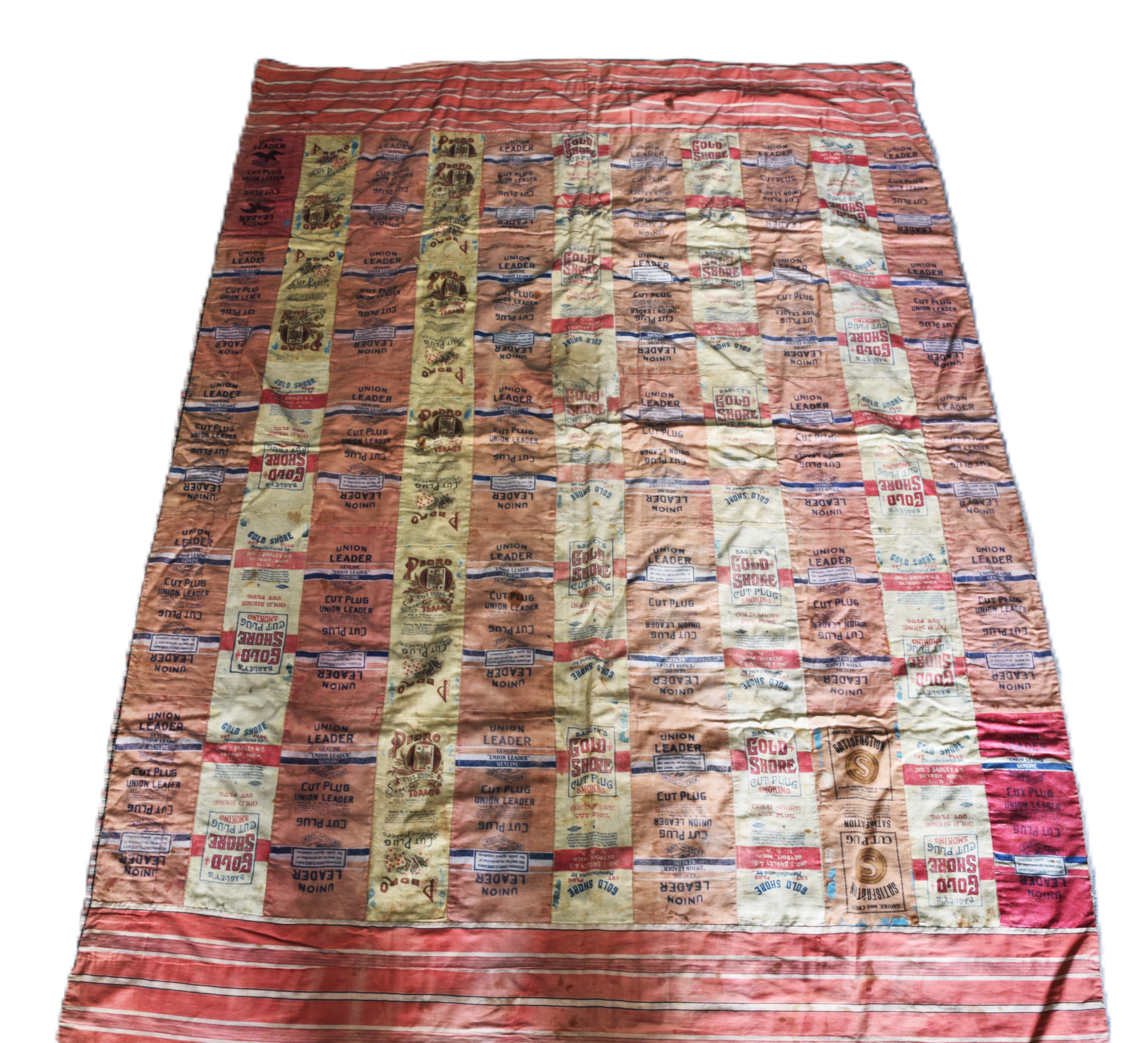 Early advertising quilt with designs advertising Gold Shore Union Leader, Cut Plug, etc. Dimensions: 3’10” x 5’3″