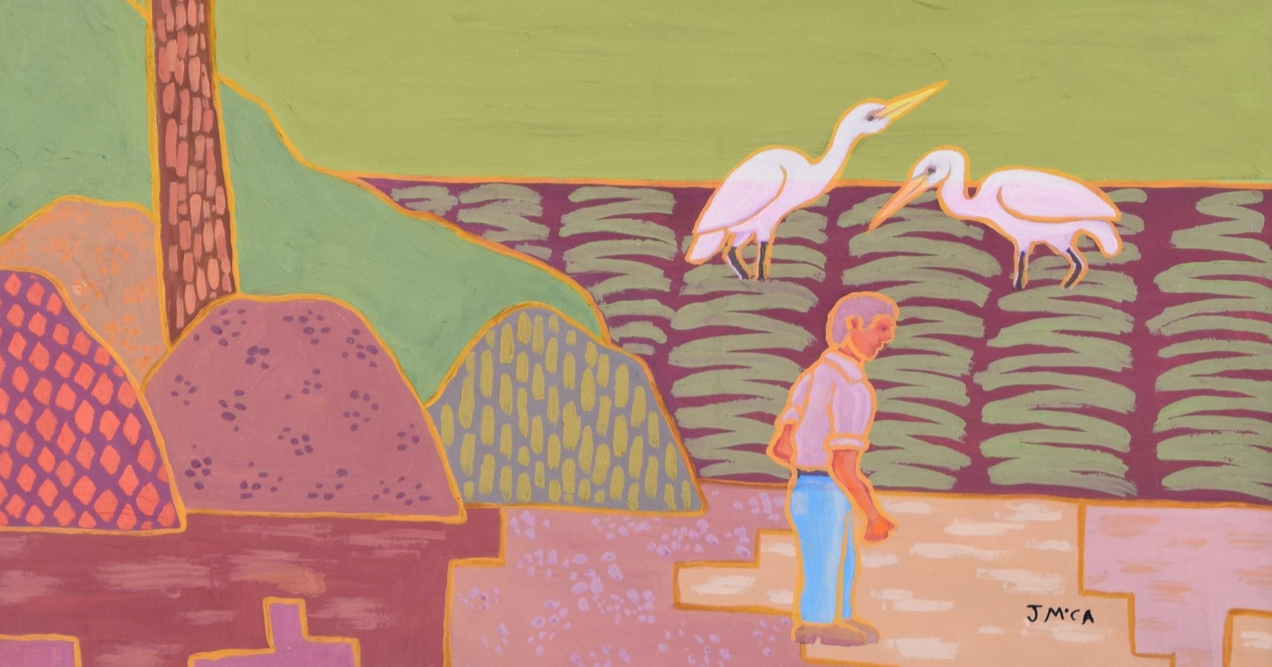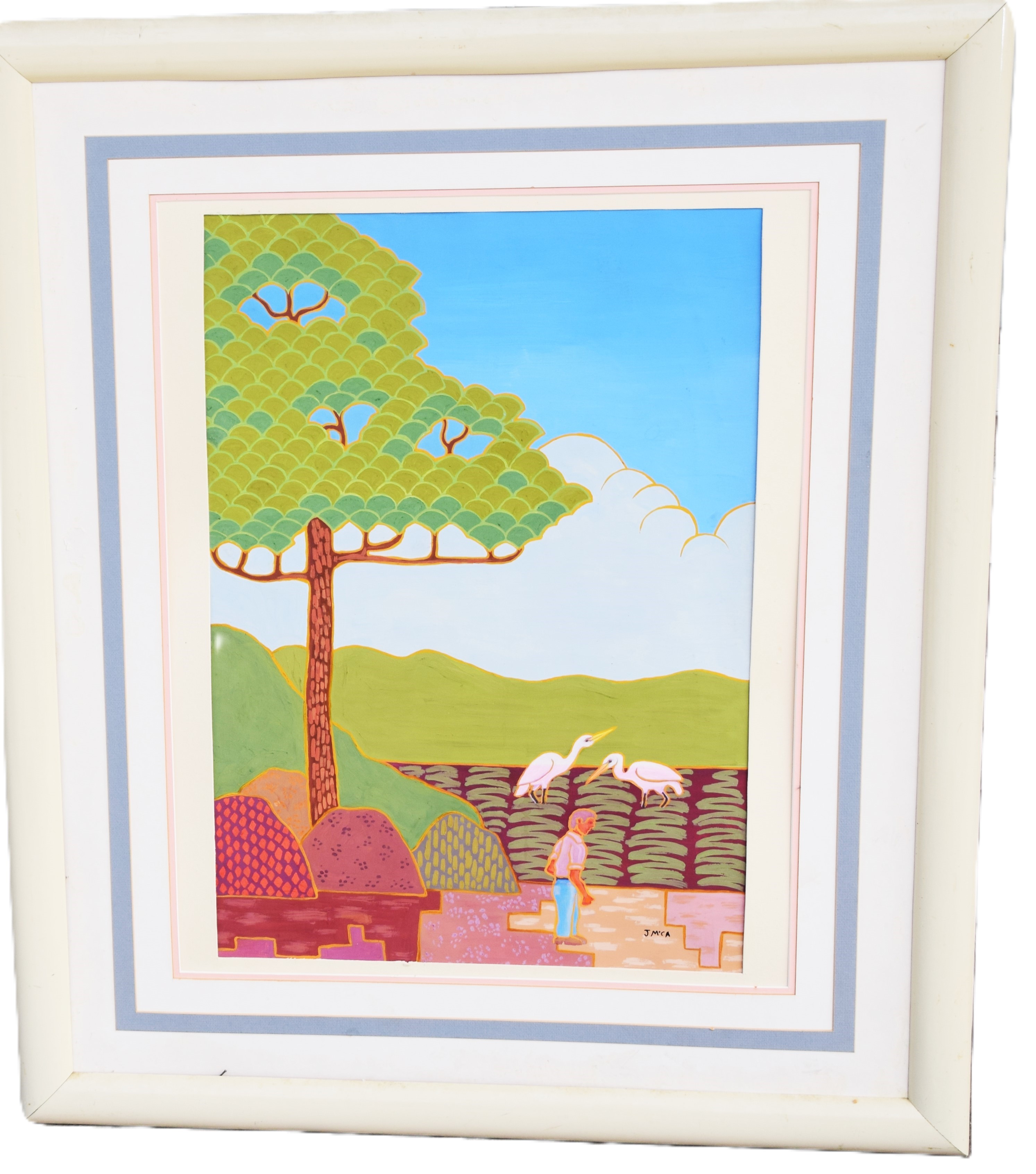 Framed oil on canvas painting of a modern landscape with a large tree, two white egrets and a gentleman. Dimensions: 26.5″ x 18″ Image size