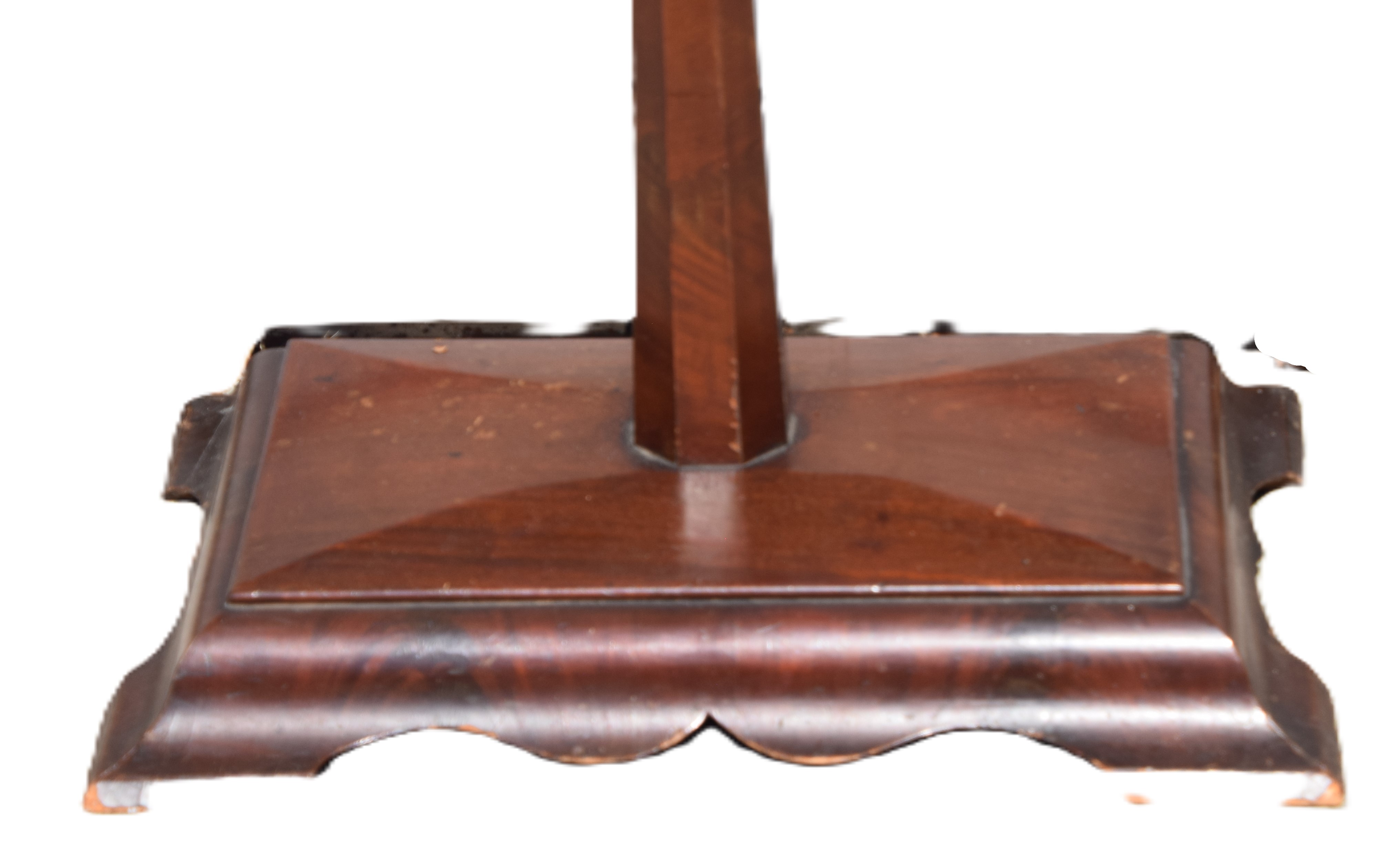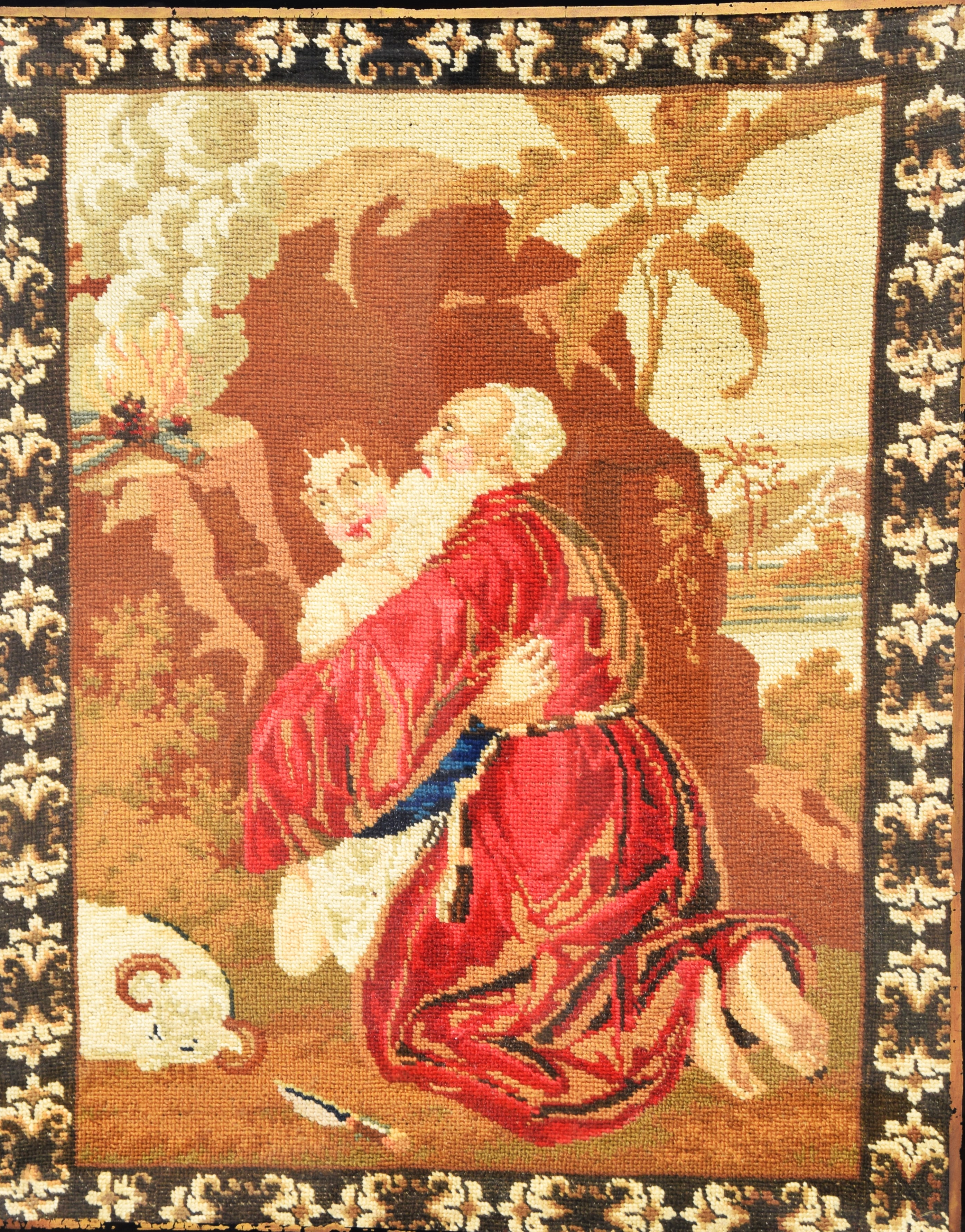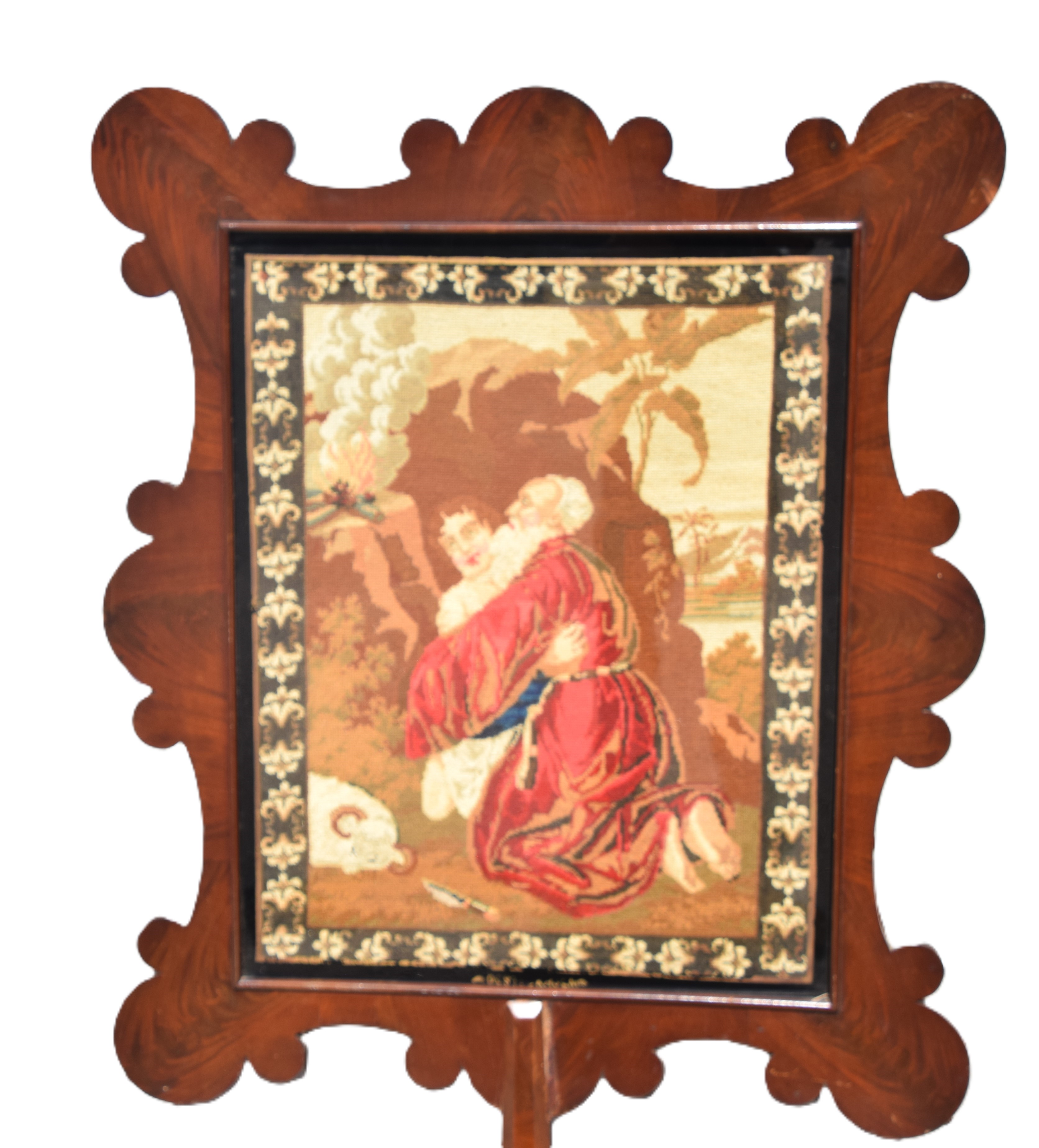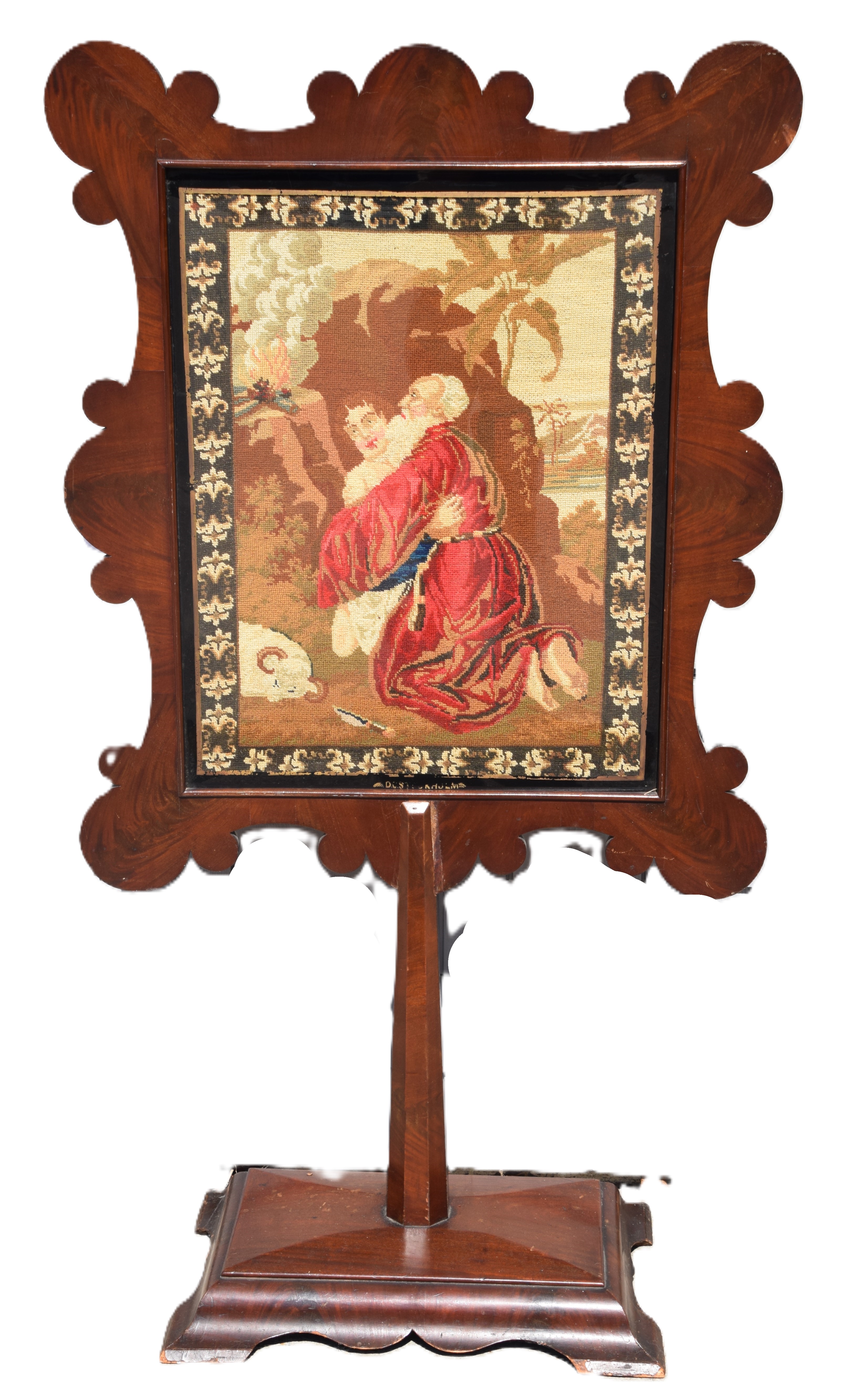 19th Century Empire fire pole screen depicting Moses embracing Issac done in needlepoint, in a well scalloped frame on a fluted post. Dimensions: 27″ x 21″ Image size, 58″ Overall