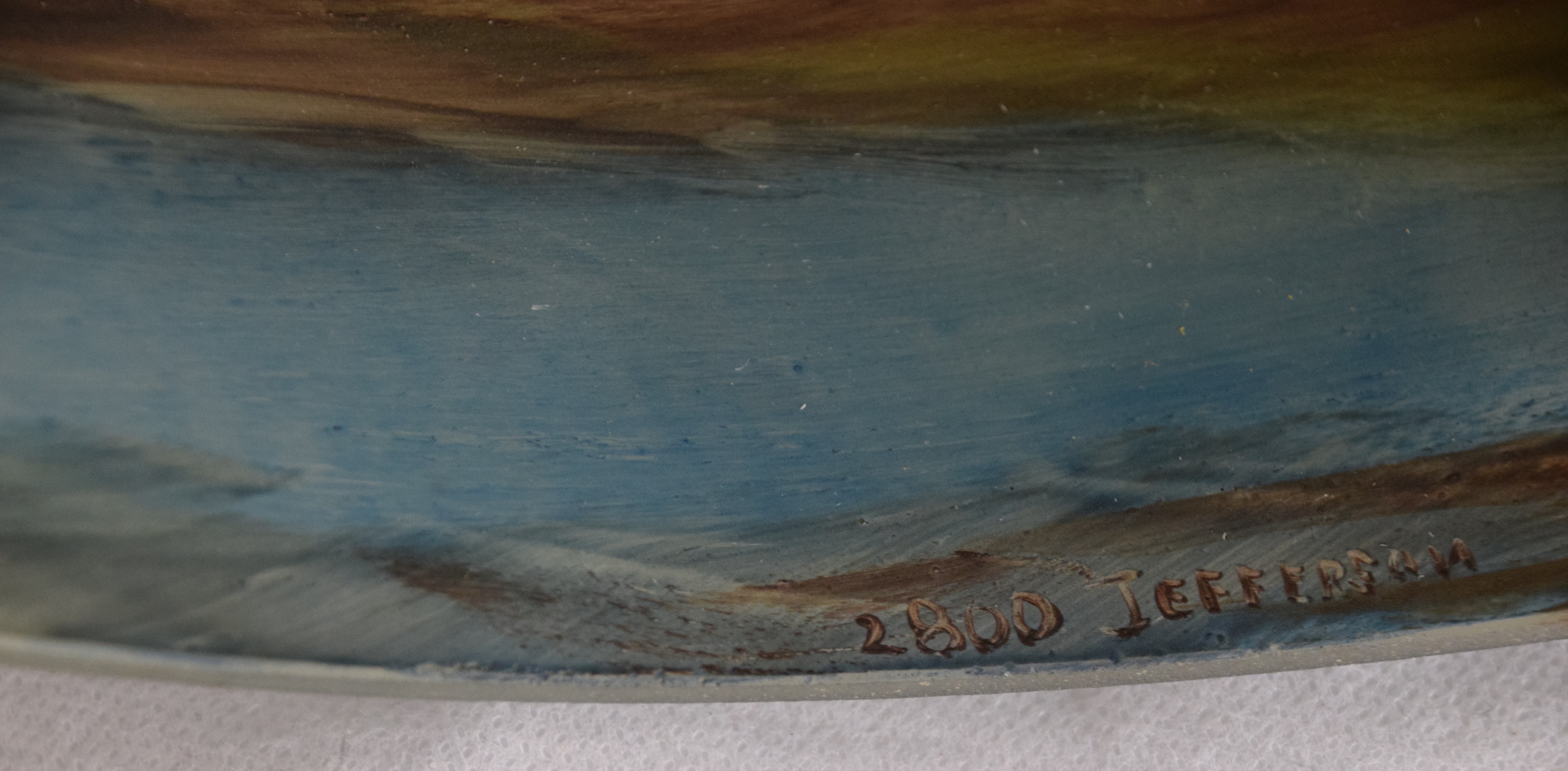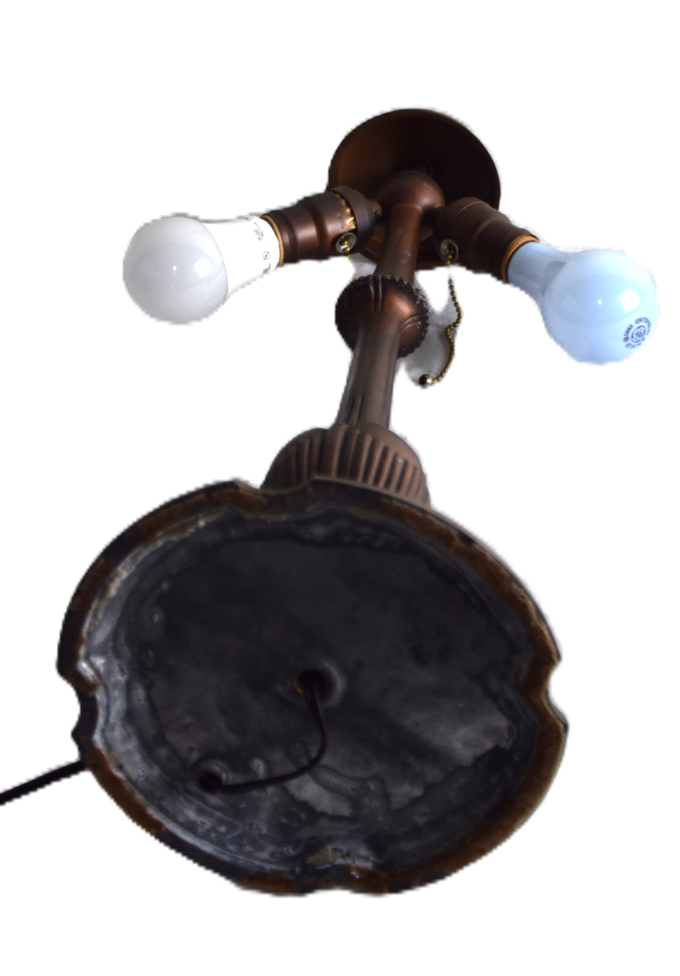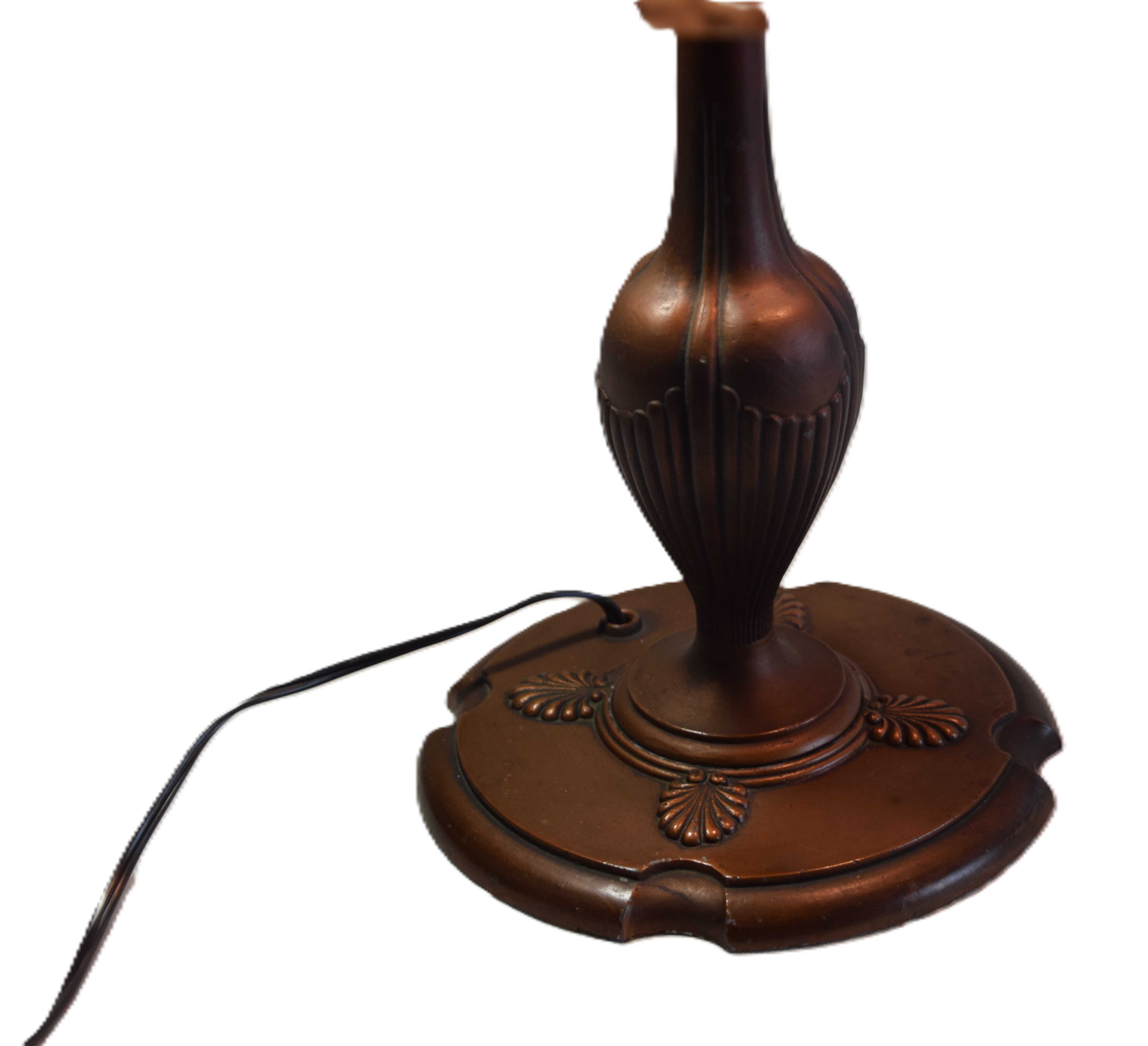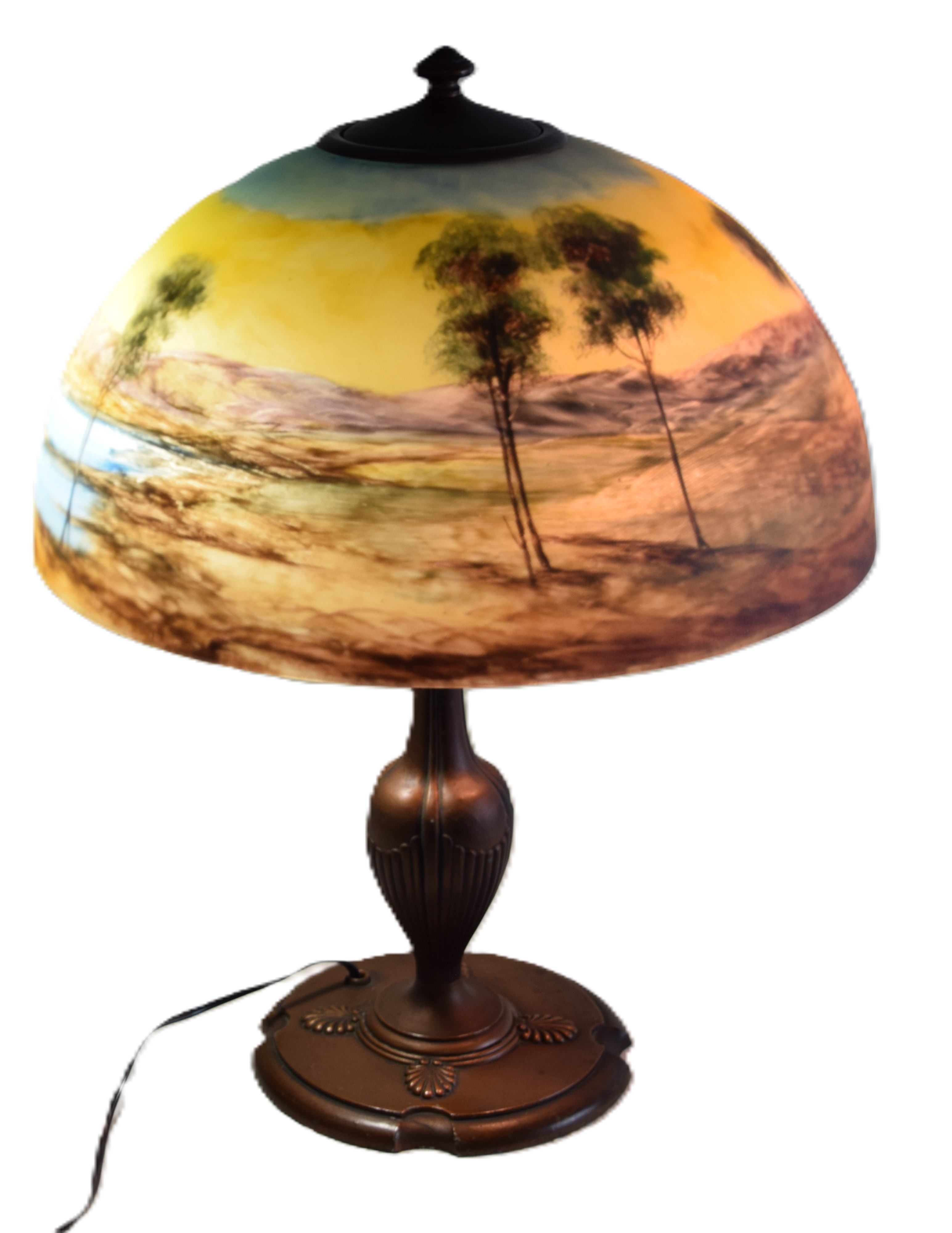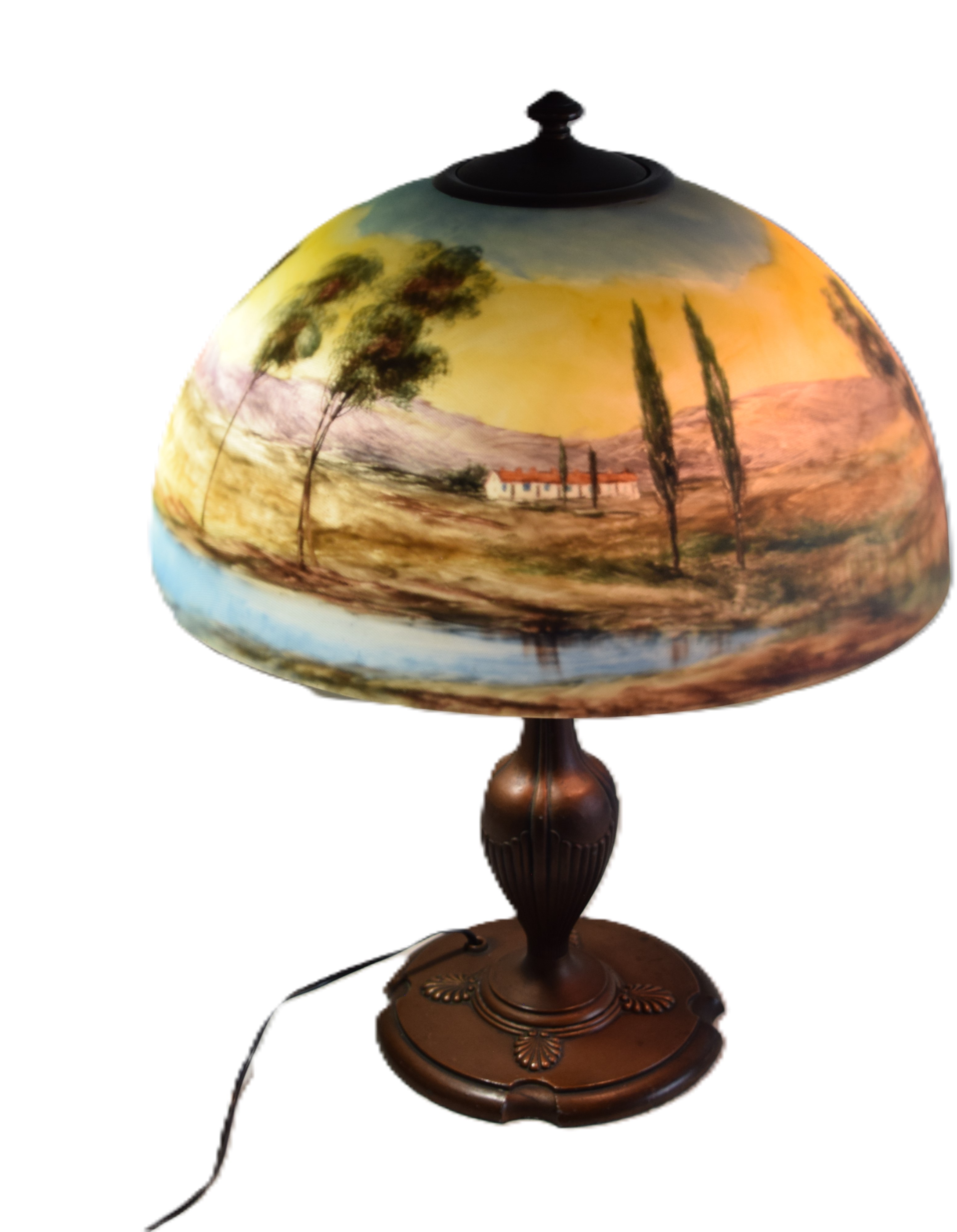 A Jefferson reversed painted table lamp circa 1920 on a bronze metal base. The shade is marked 2800 Jefferson. Dimensions: 26″H x 16″ Dia