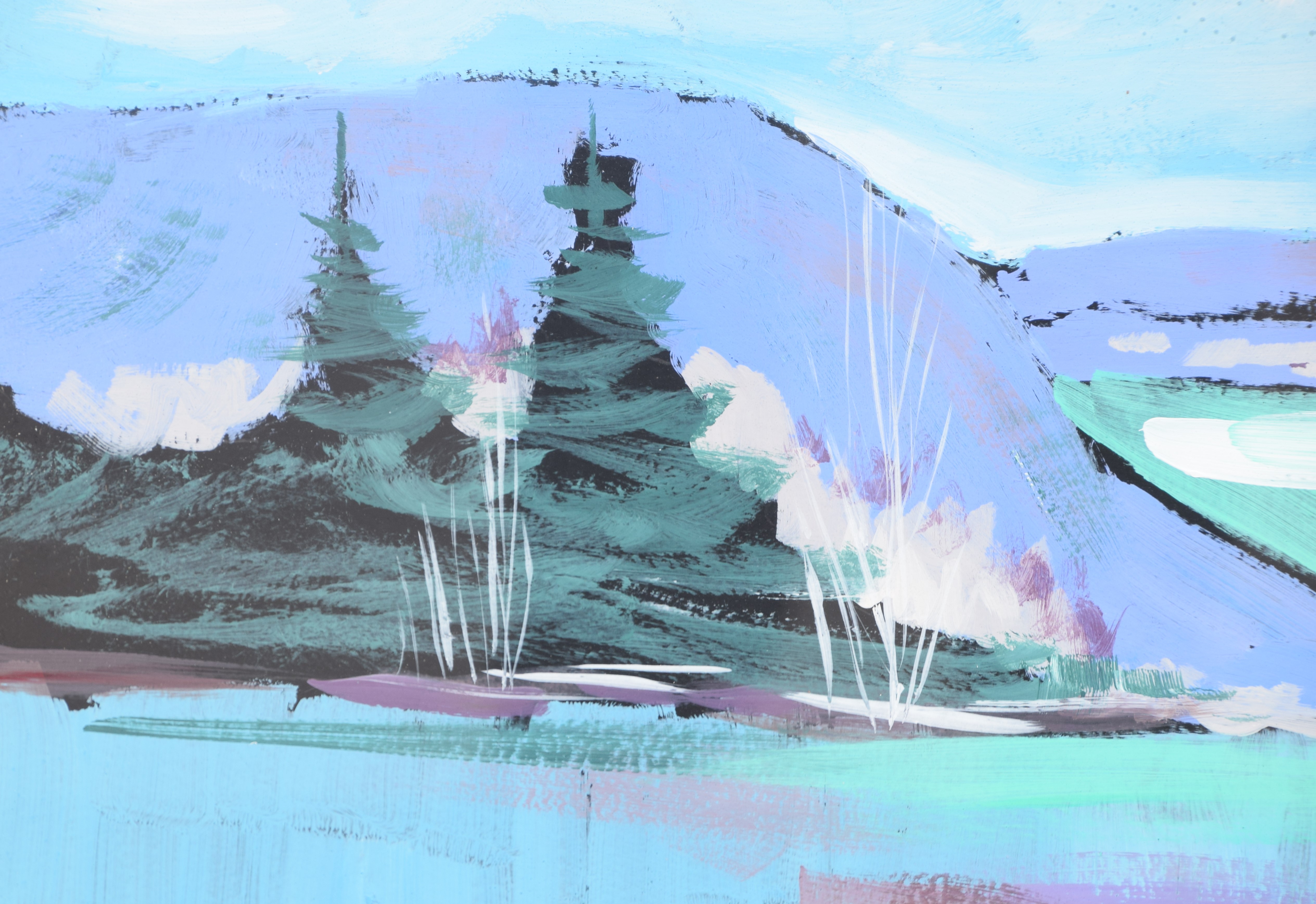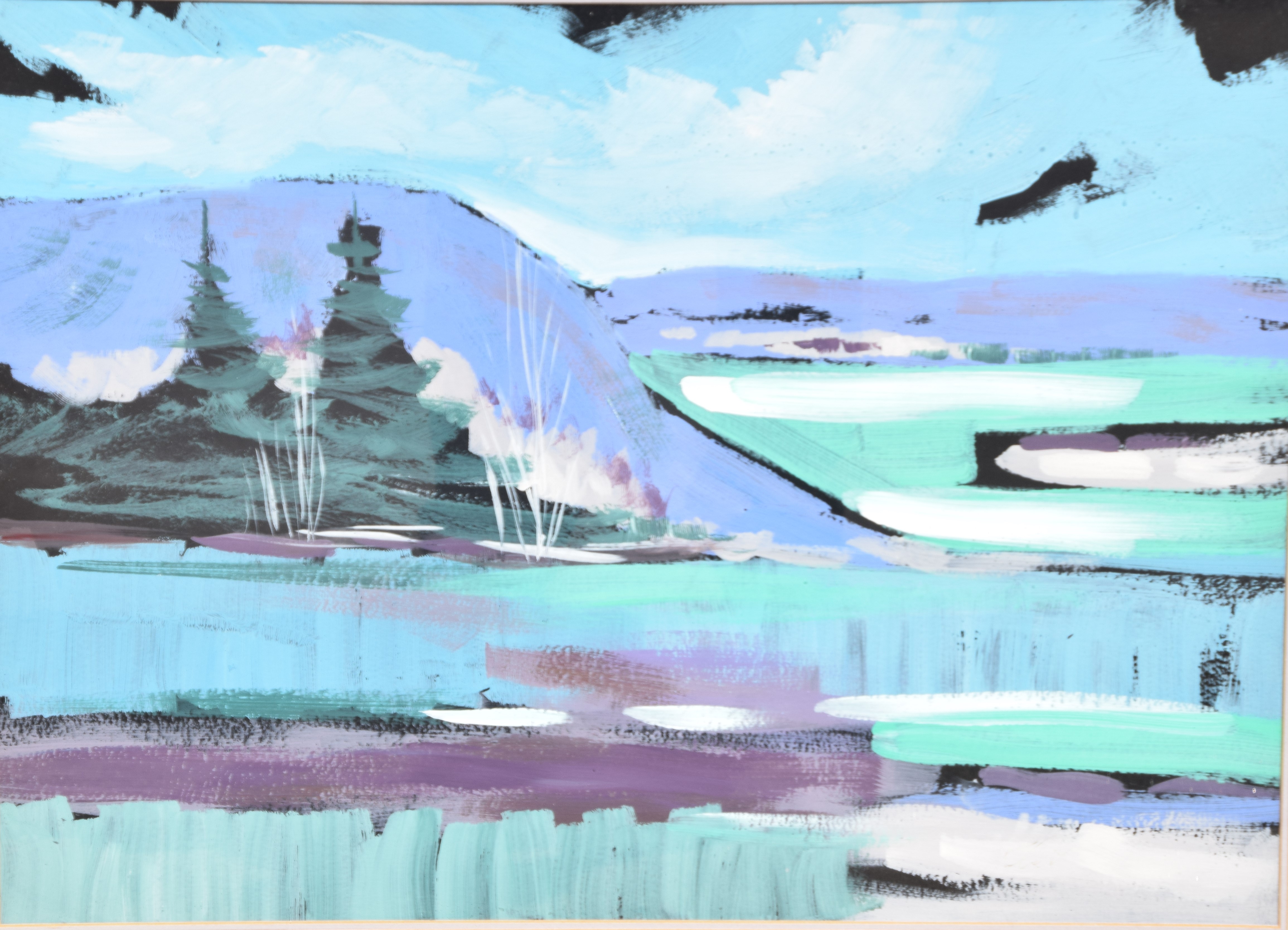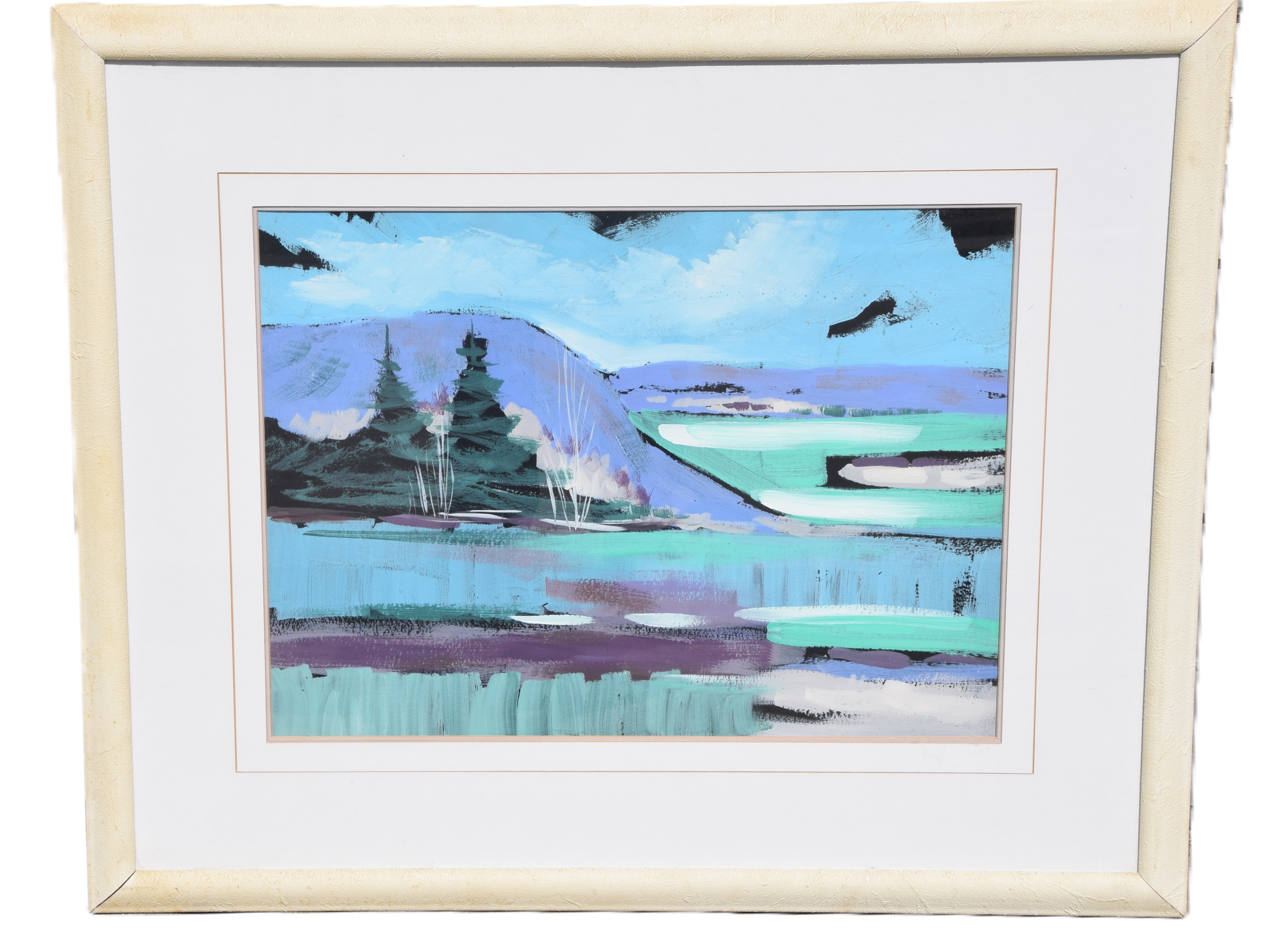 Large watercolor landscape believed to have been painted by a Canadian artist. Painting includes a pond, evergreen trees and hills in background. Dimensions: 16″ x 21″