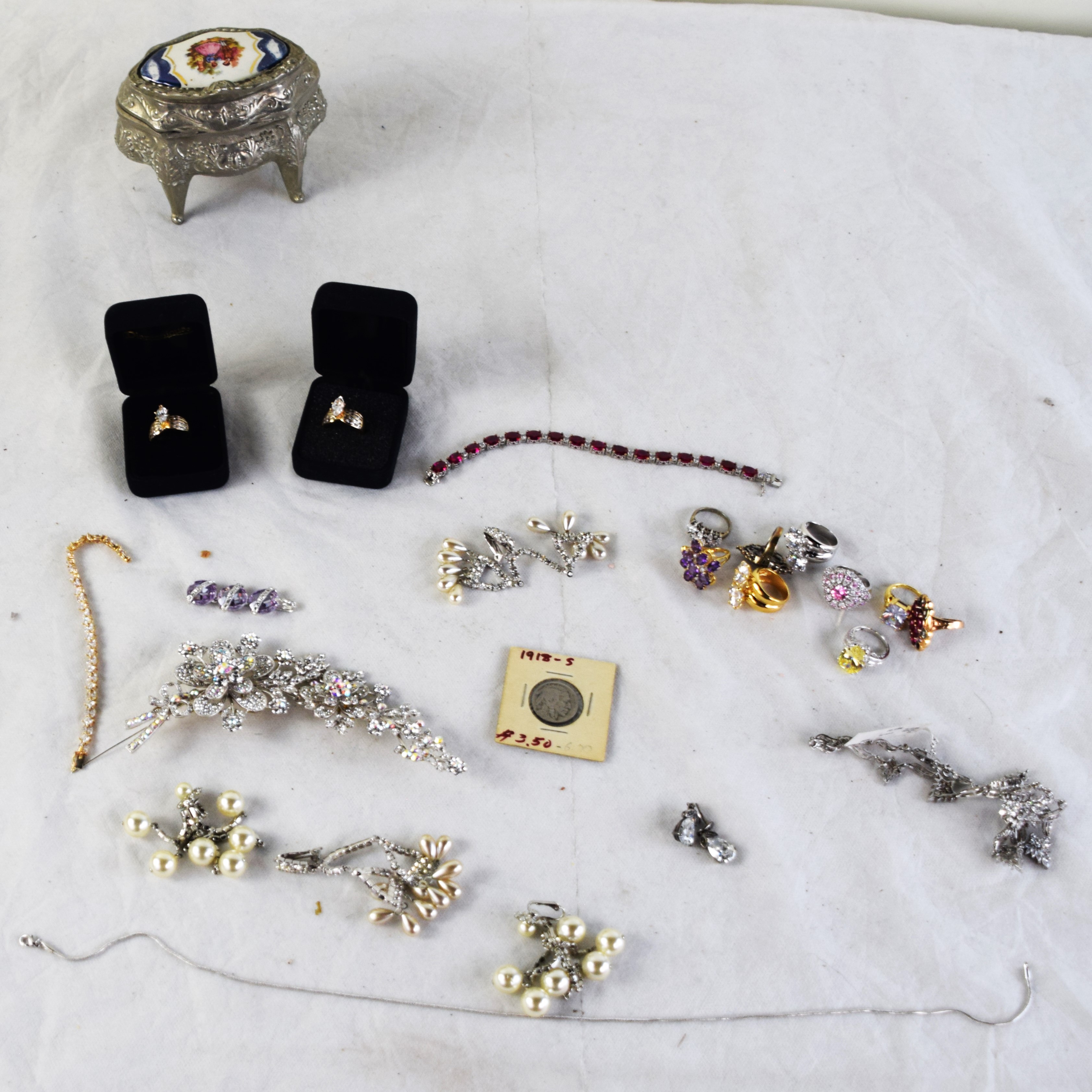 Costume jewelry lot to include Lady’s rings, necklace, pearl earrings, a jewelry casket, 1918S Buffalo nickel, approximately 15 pieces