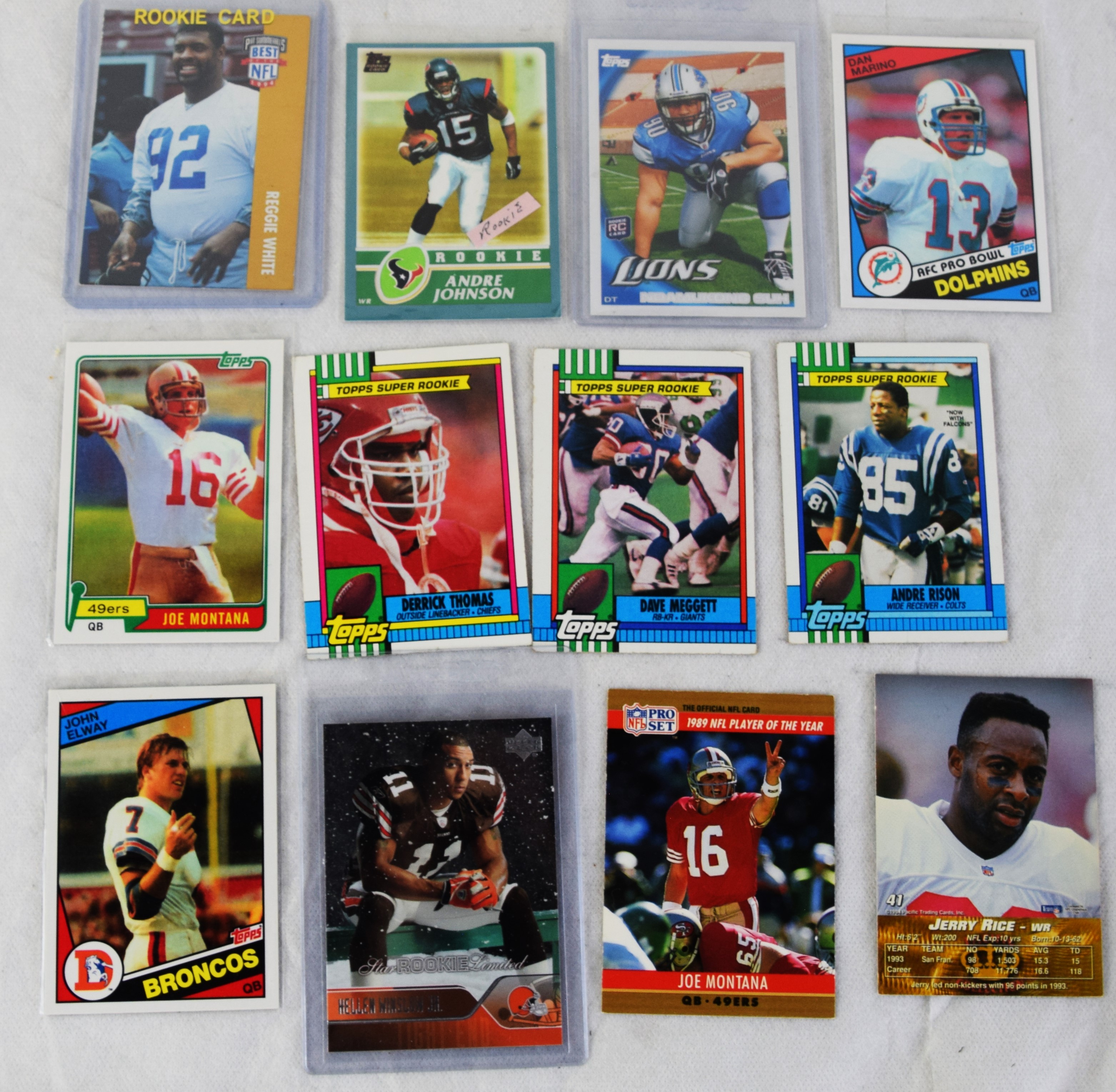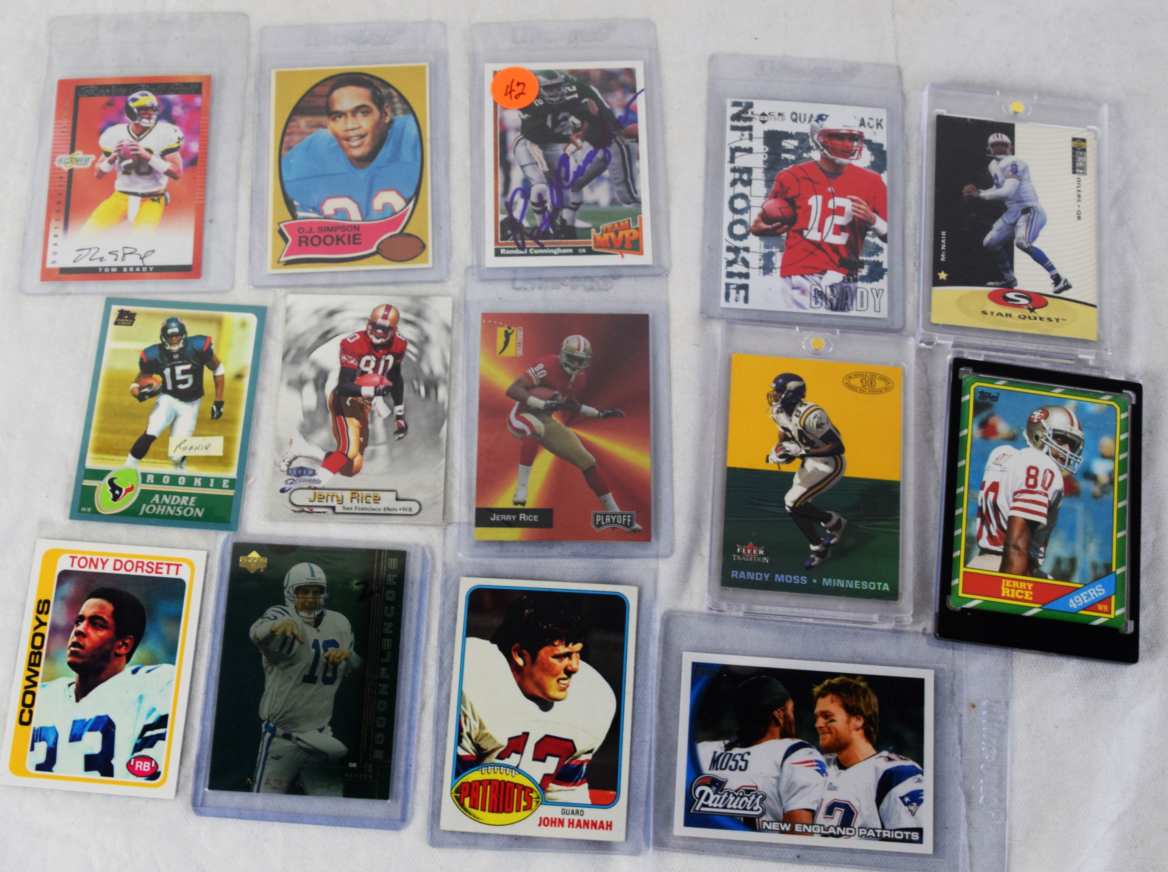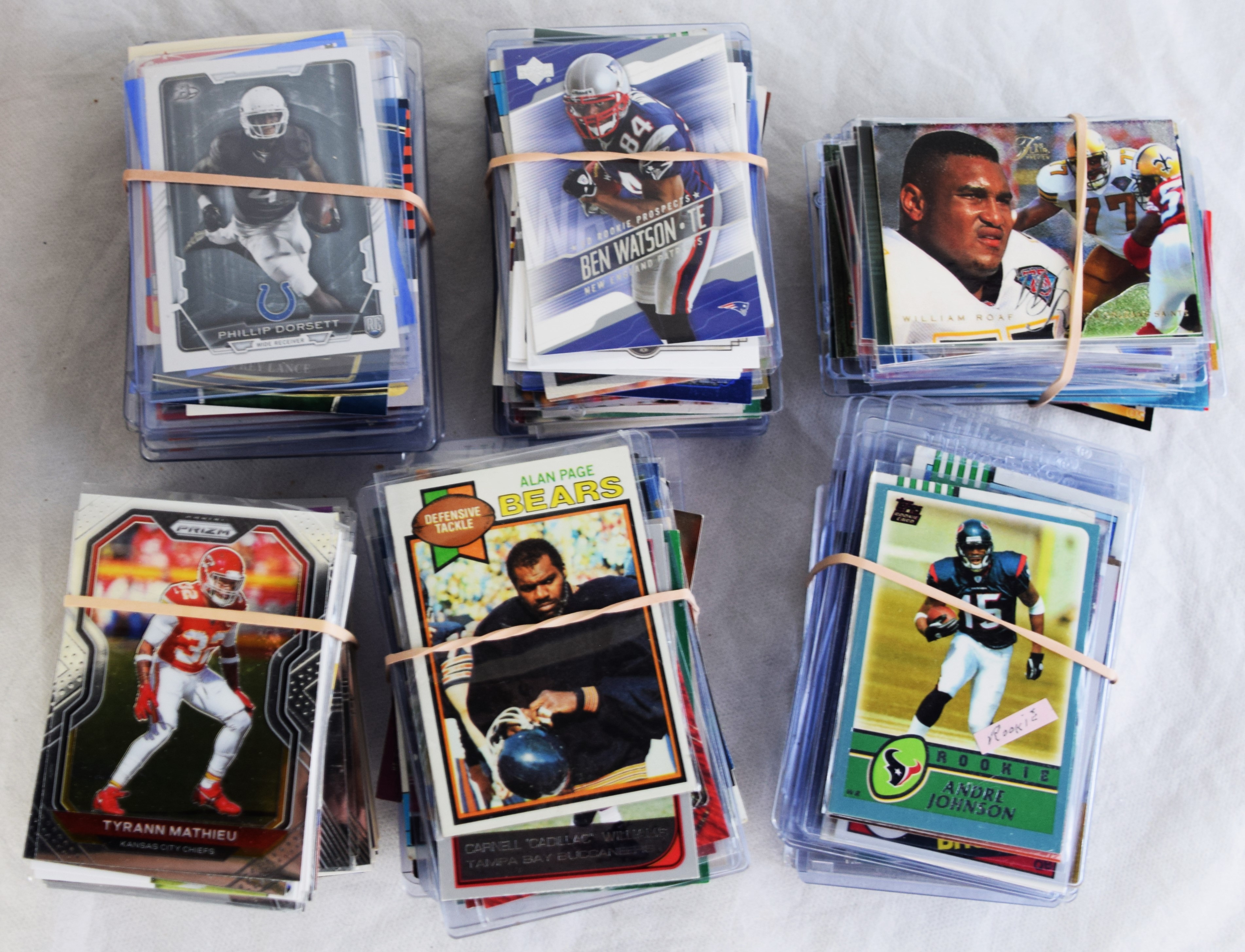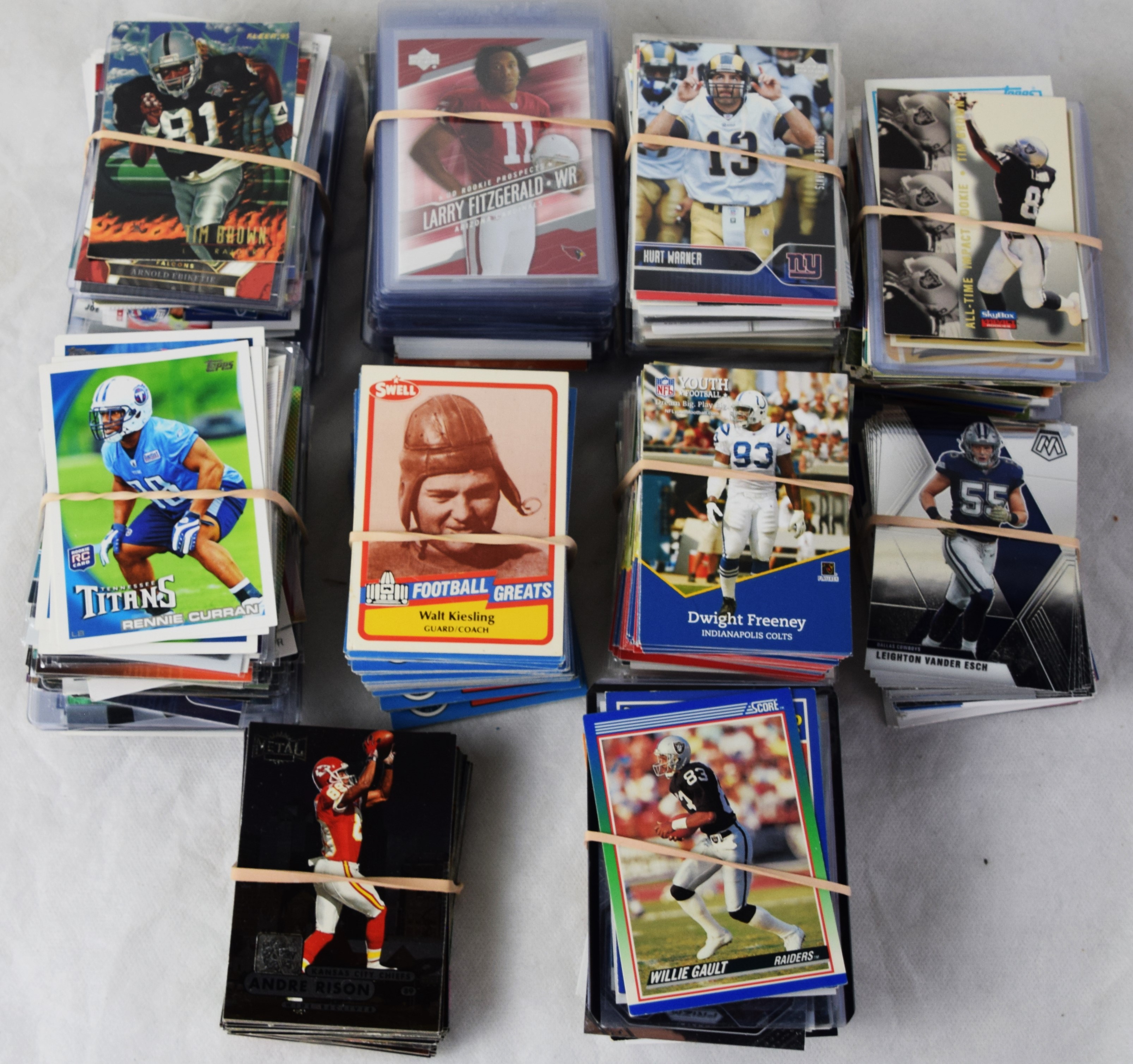 Over a thousand cards, many rookie cards and All Pros to include OJ Simpson, T. Brady, John Hannah, Derick Thomas, Dave Meggett and Andre Rison and more. Also included or dozens of Swell cards of football Greats