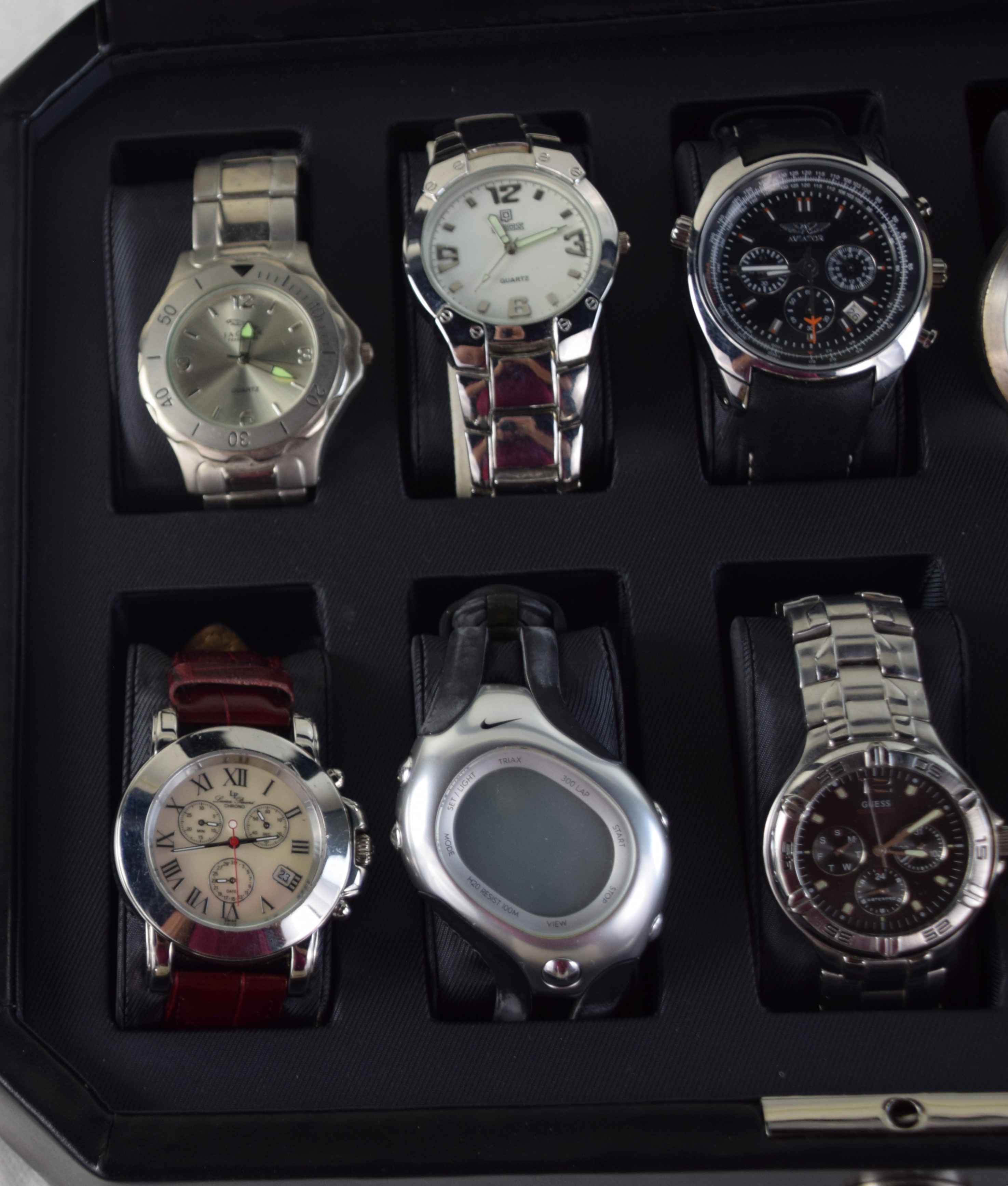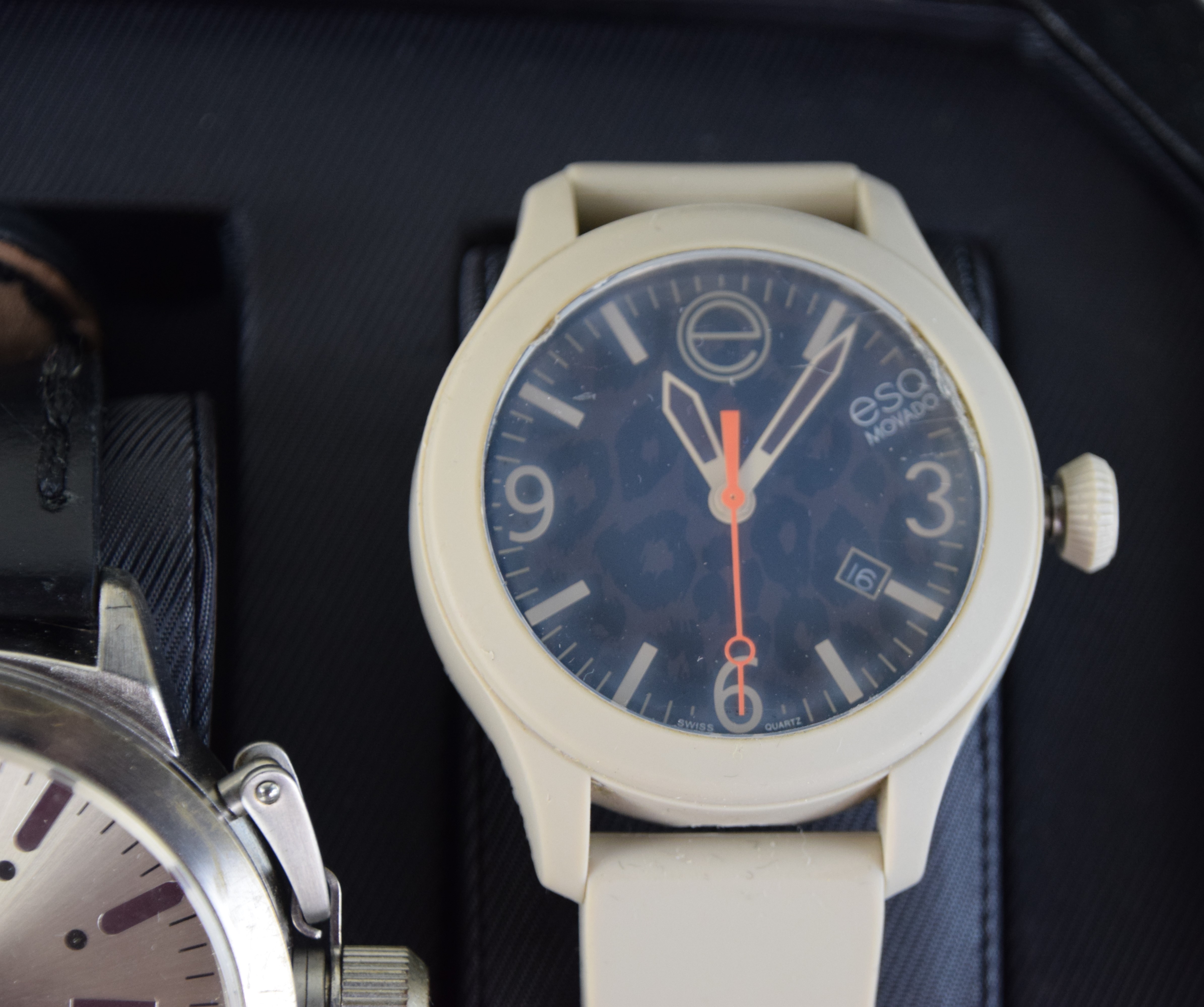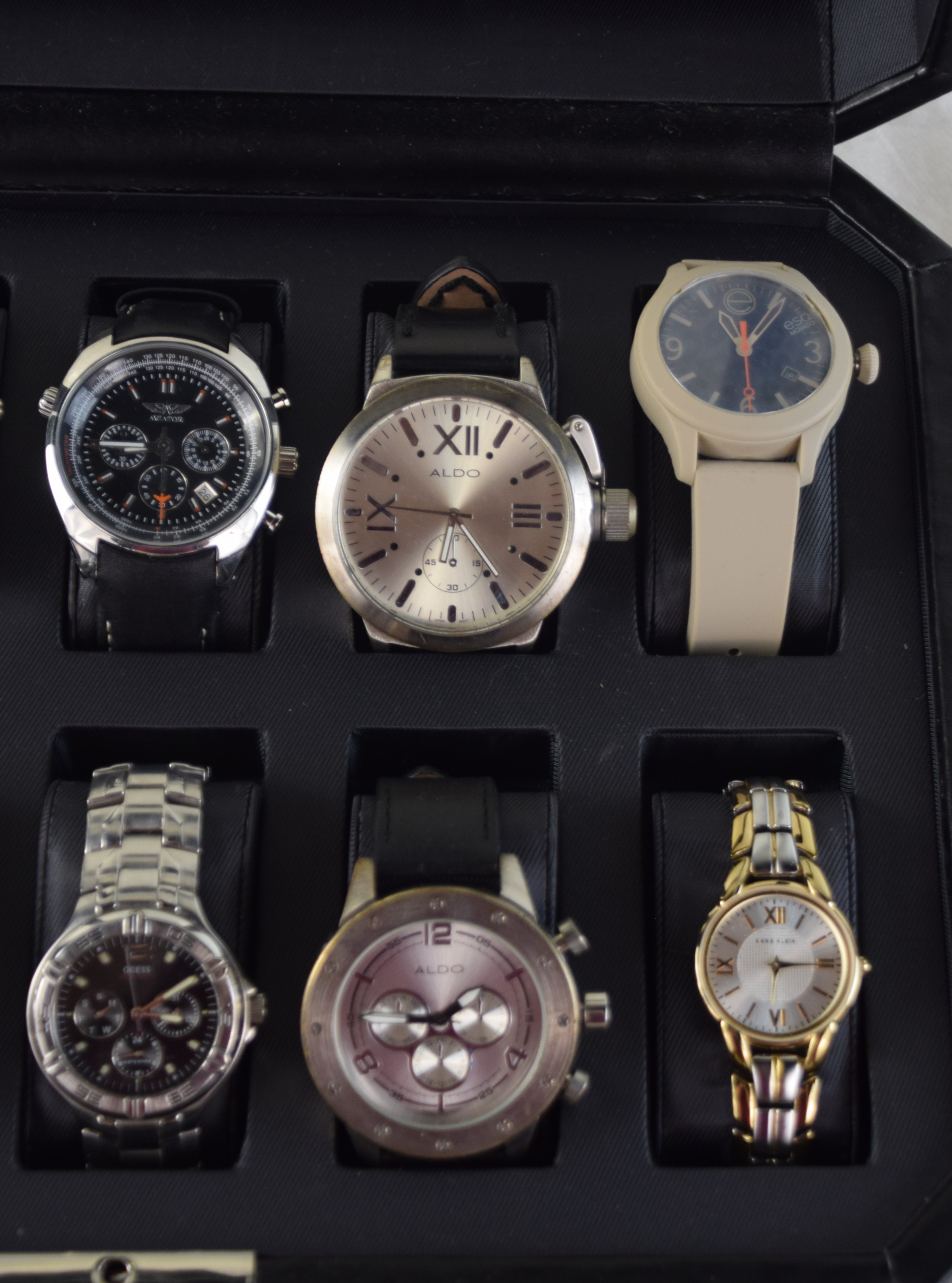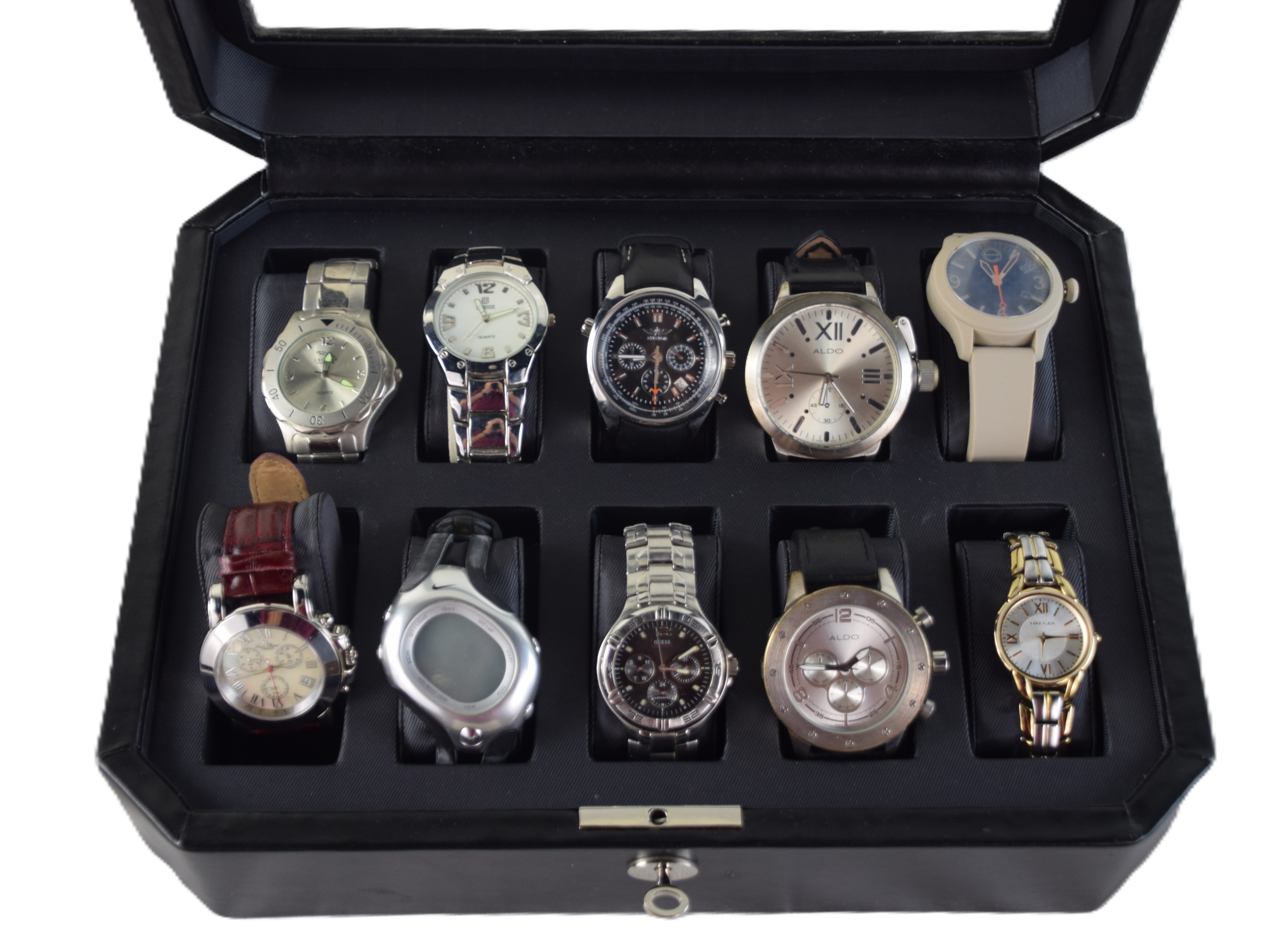 10 watches in a collectors’ box to include a Movado and others.