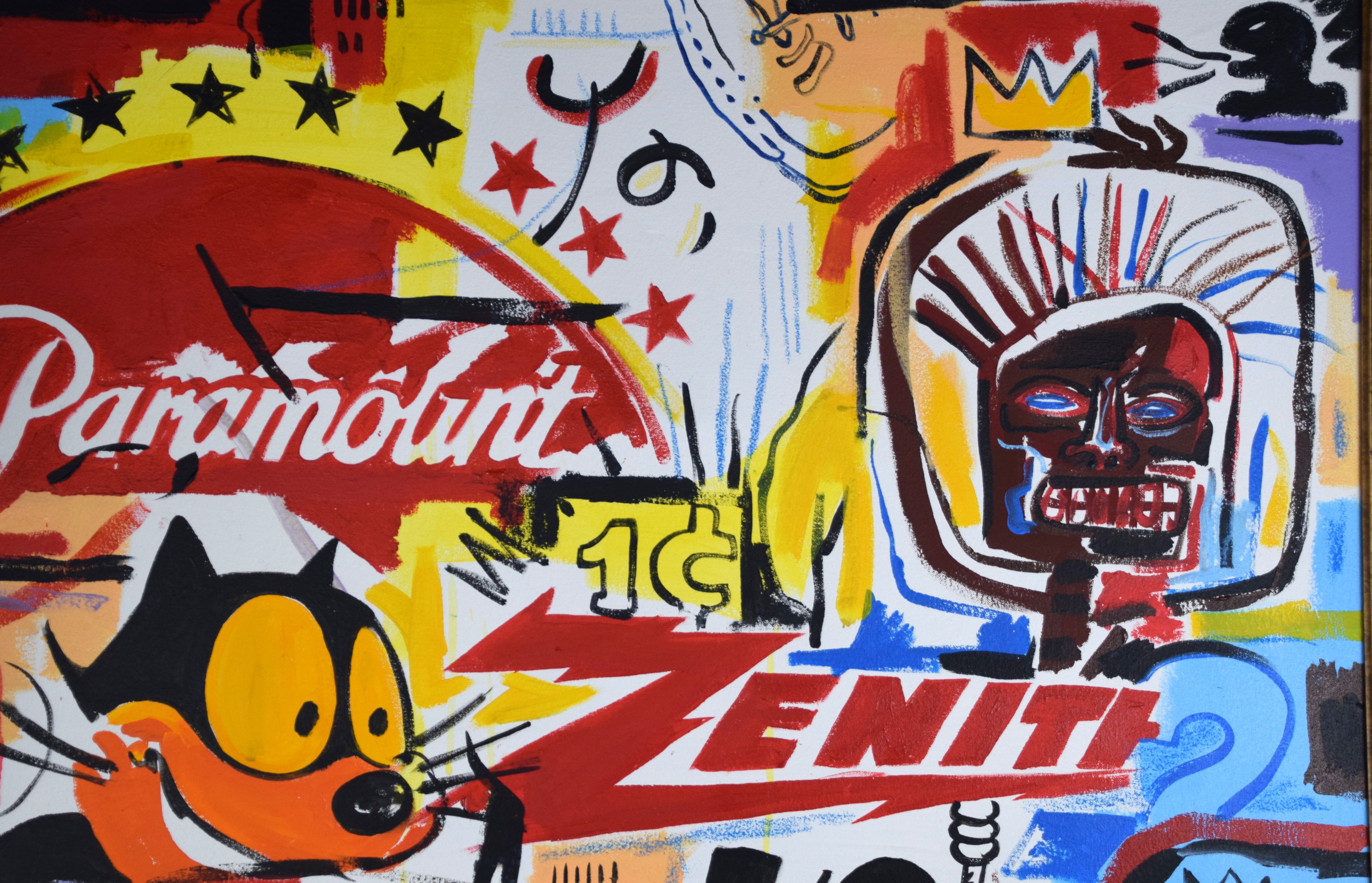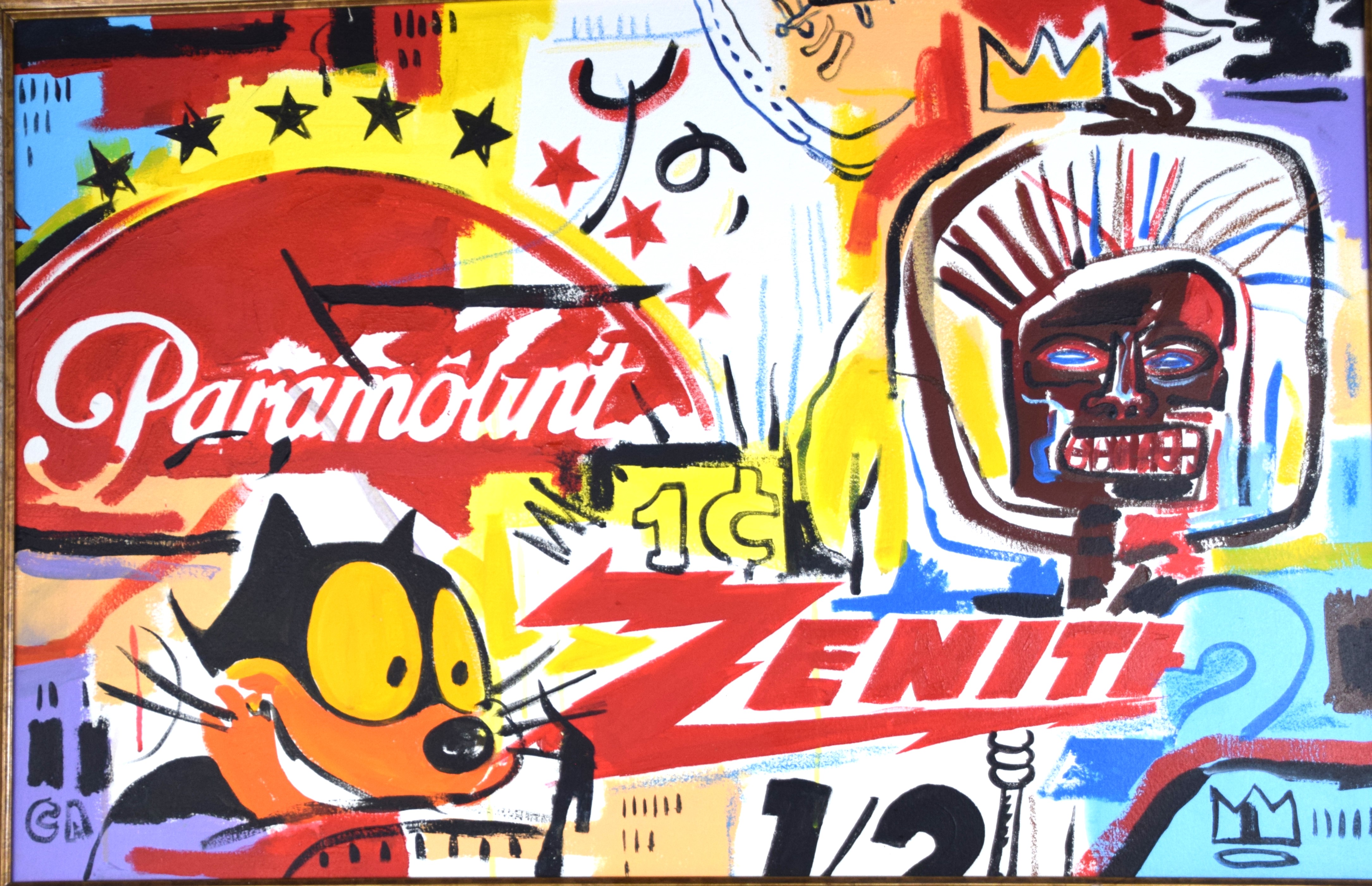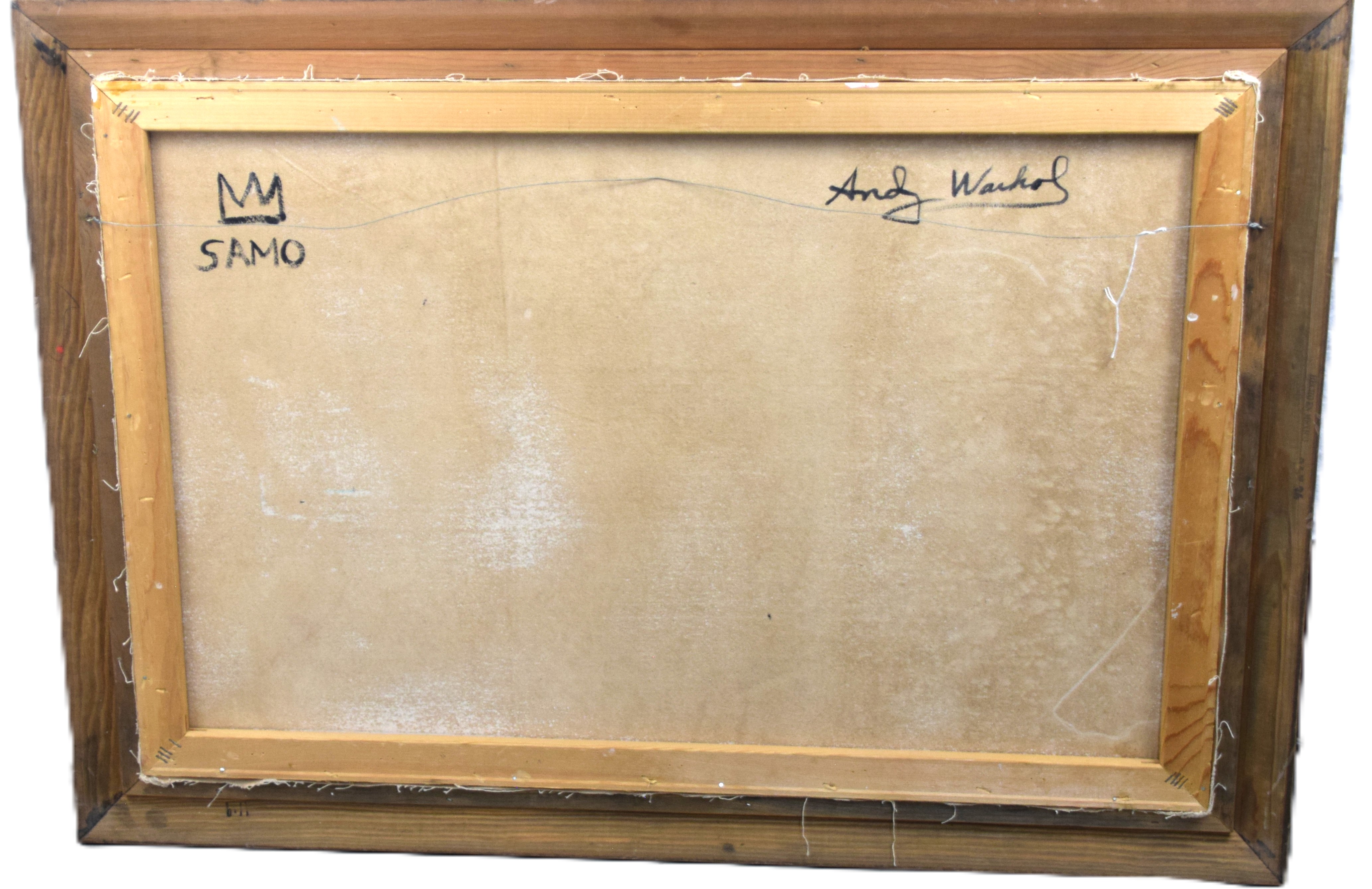 An attributed Basquiat and Warhol pop art painting, oil on canvas with Paramount and Zenith logos. Jean-Michel Basquiat (1960 – 1988) worked in New York and is known for graffiti street paintings under the name pseudonym ‘SAMO’. Andy Warhol (1928 – 1987) worked in New York and Pennsylvania, whose name is synonymous with Pop Art. No COA on file. Provenance: From the collection of Todd Wagner of Tampa, Florida. Dimensions: 23″ x 35″. Insurance appraisal dated 2023 on file.