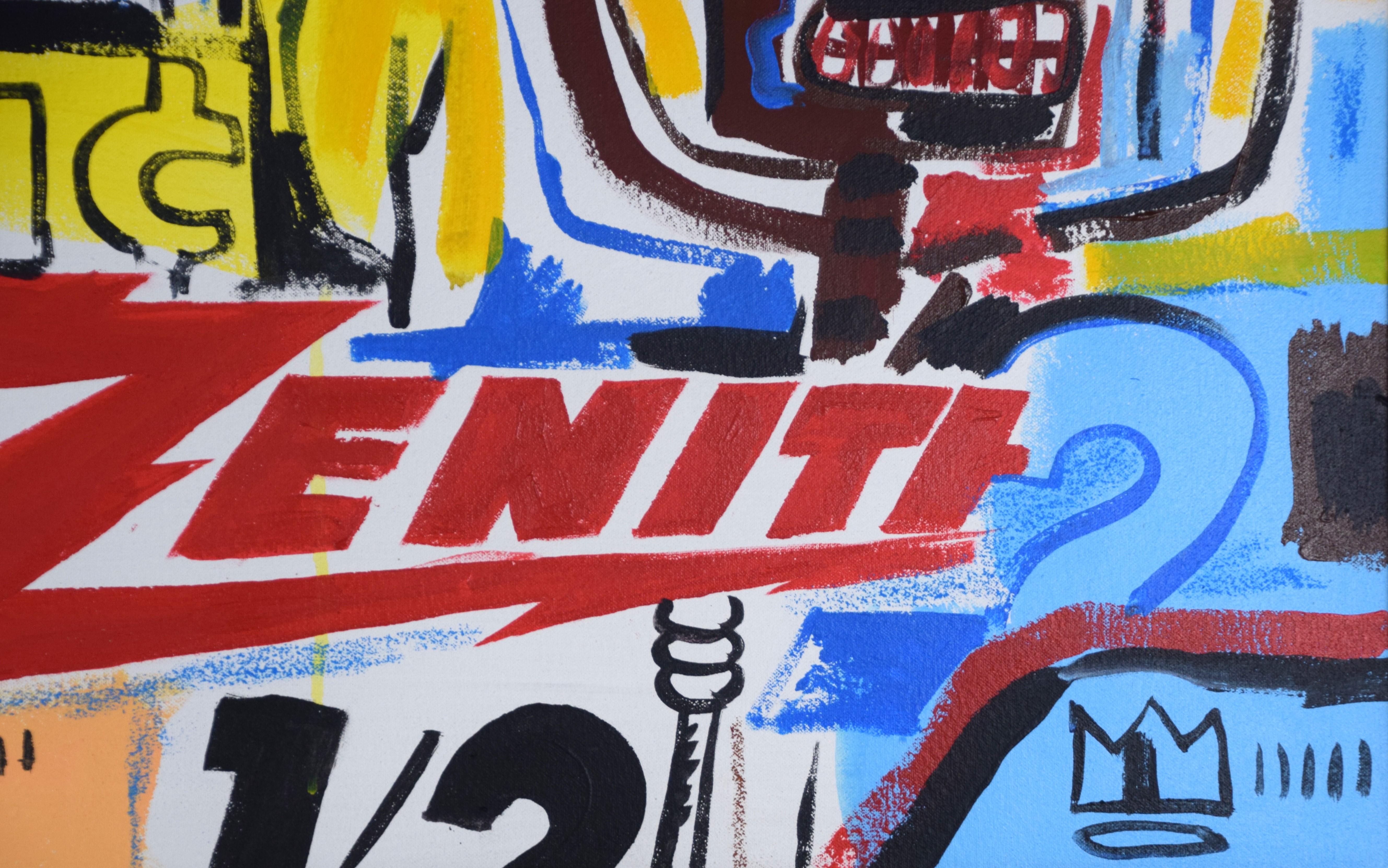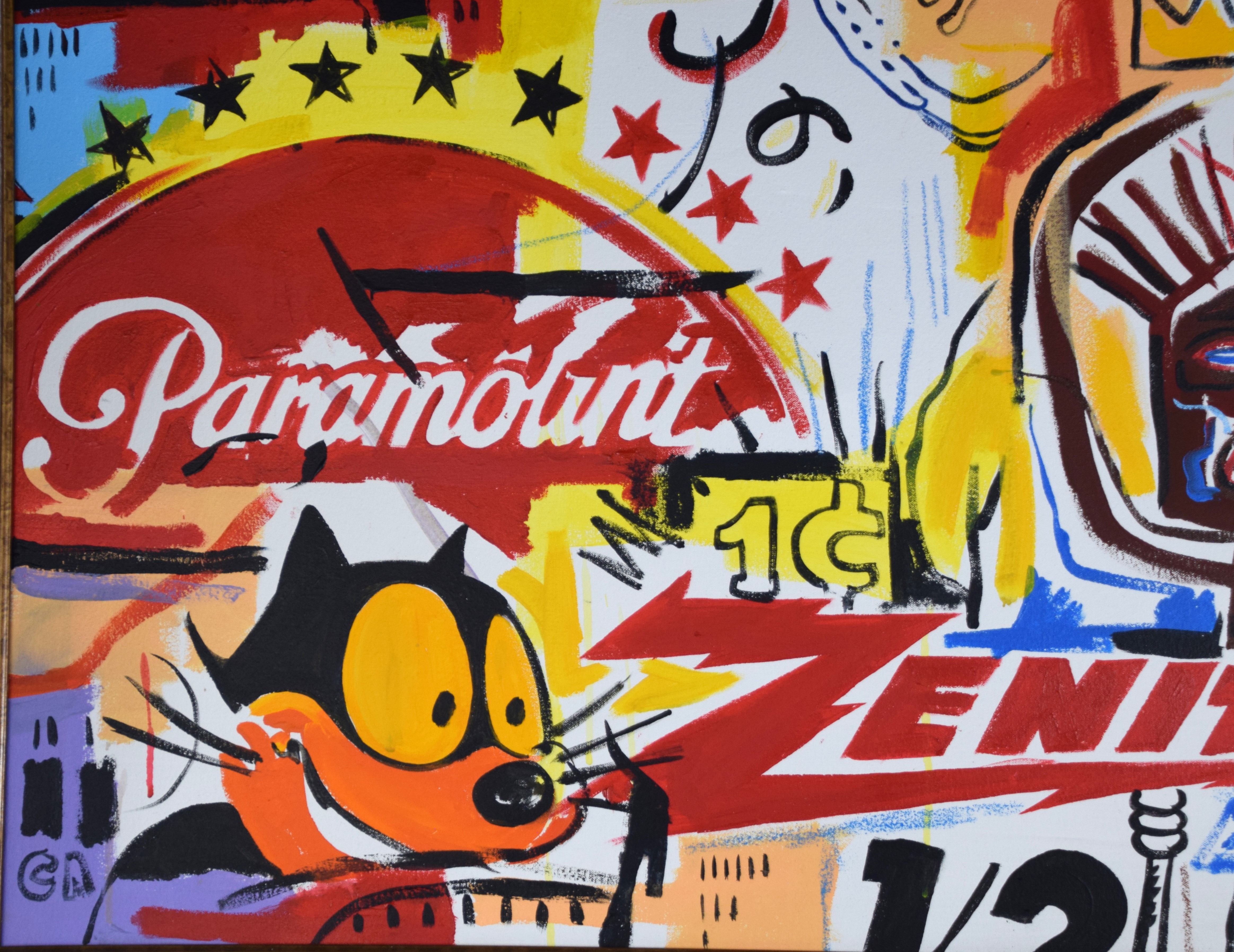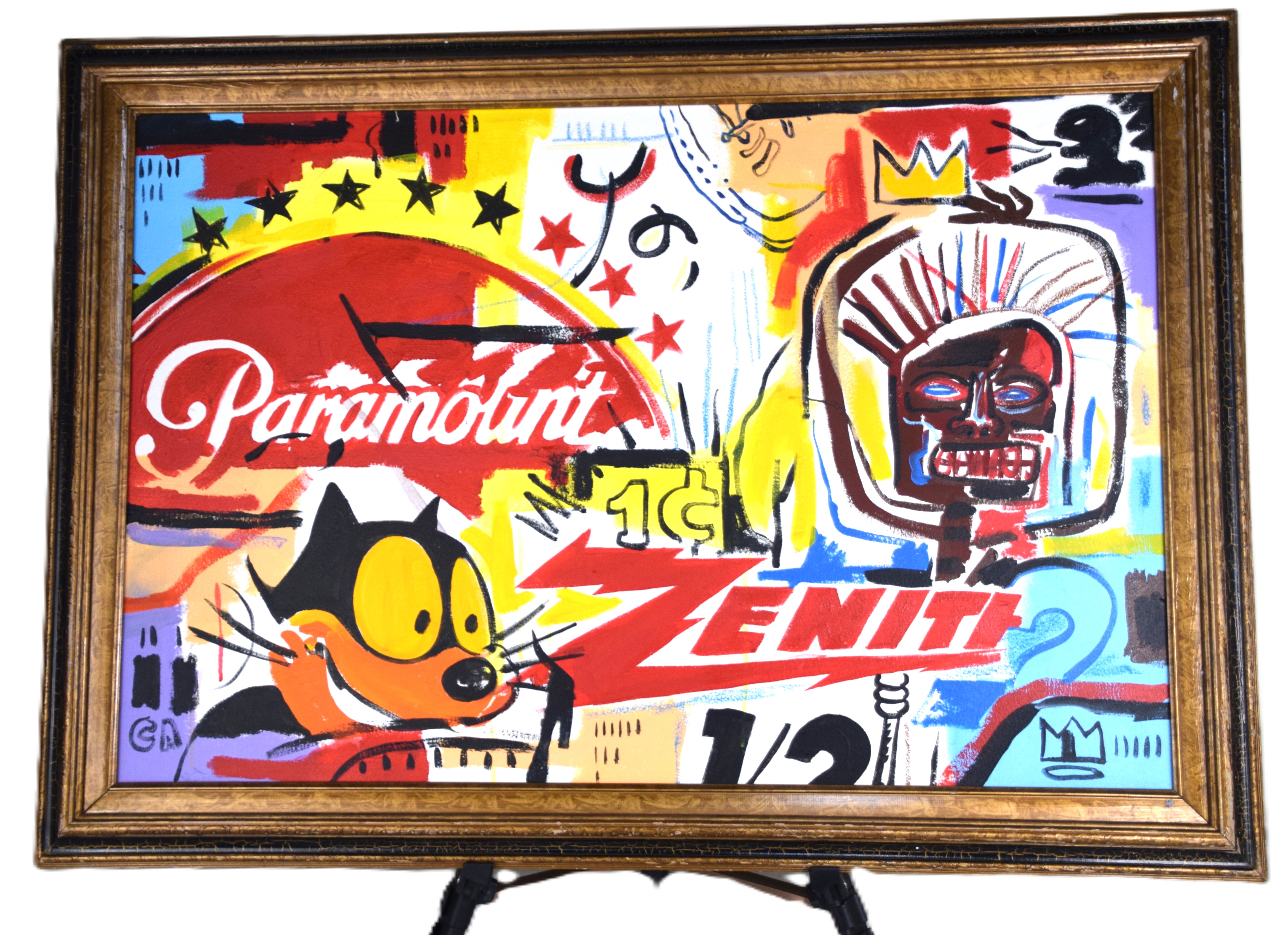 An attributed Basquiat and Warhol pop art painting, oil on canvas with Paramount and Zenith logos. Jean-Michel Basquiat (1960 – 1988) worked in New York and is known for graffiti street paintings under the name pseudonym ‘SAMO’. Andy Warhol (1928 – 1987) worked in New York and Pennsylvania, whose name is synonymous with Pop Art. No COA on file. Provenance: From the collection of Todd Wagner of Tampa, Florida. Dimensions: 23″ x 35″. Insurance appraisal dated 2023 on file.