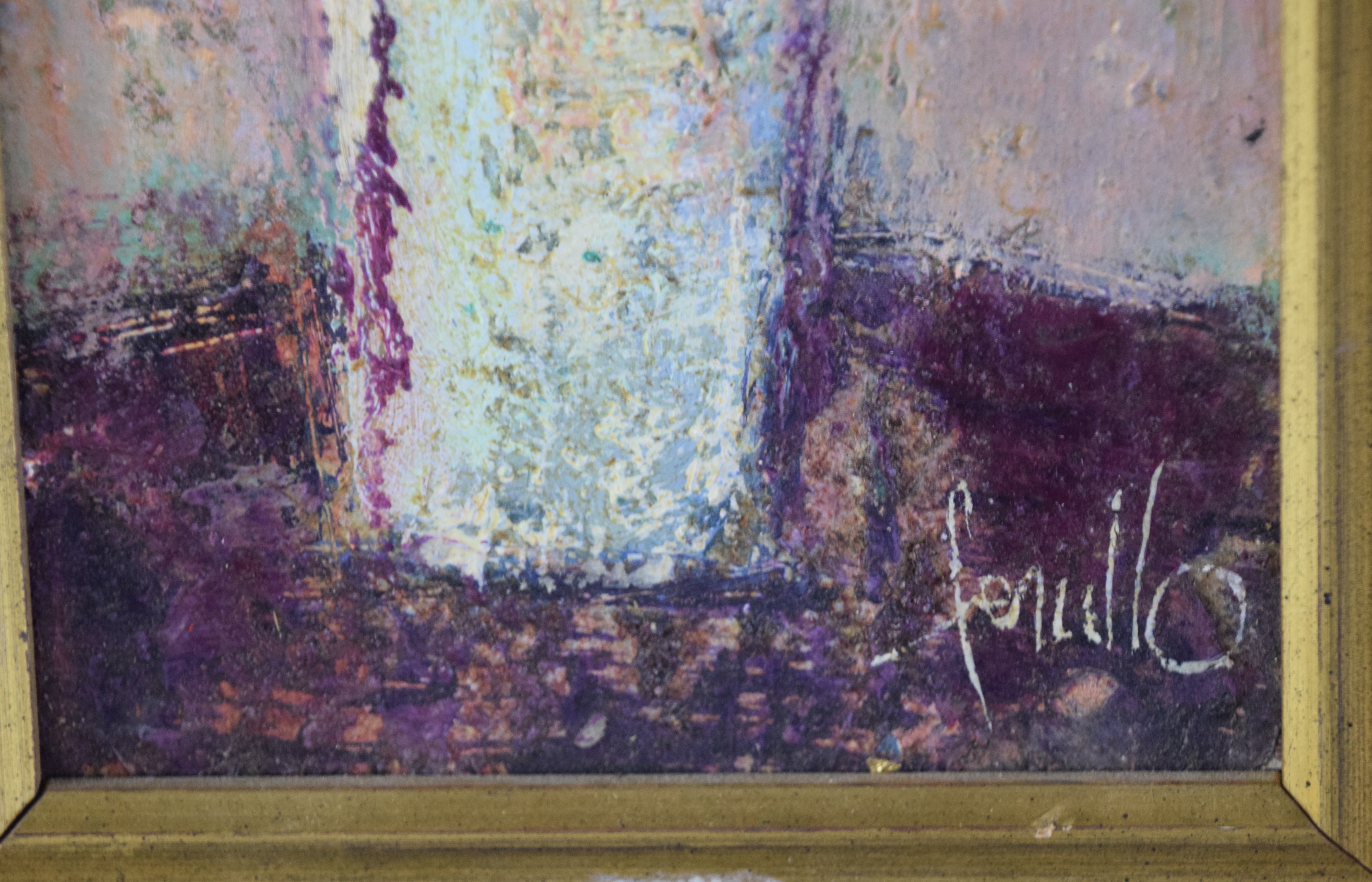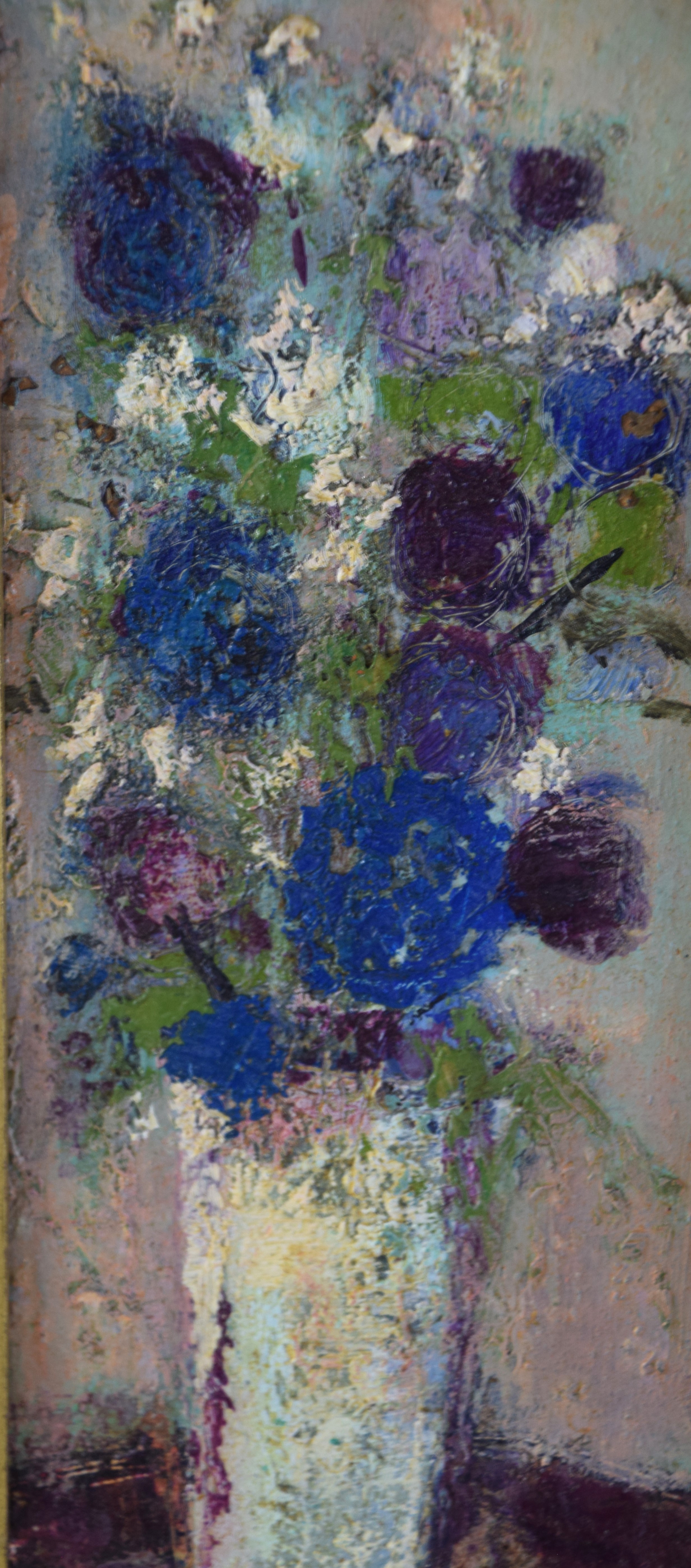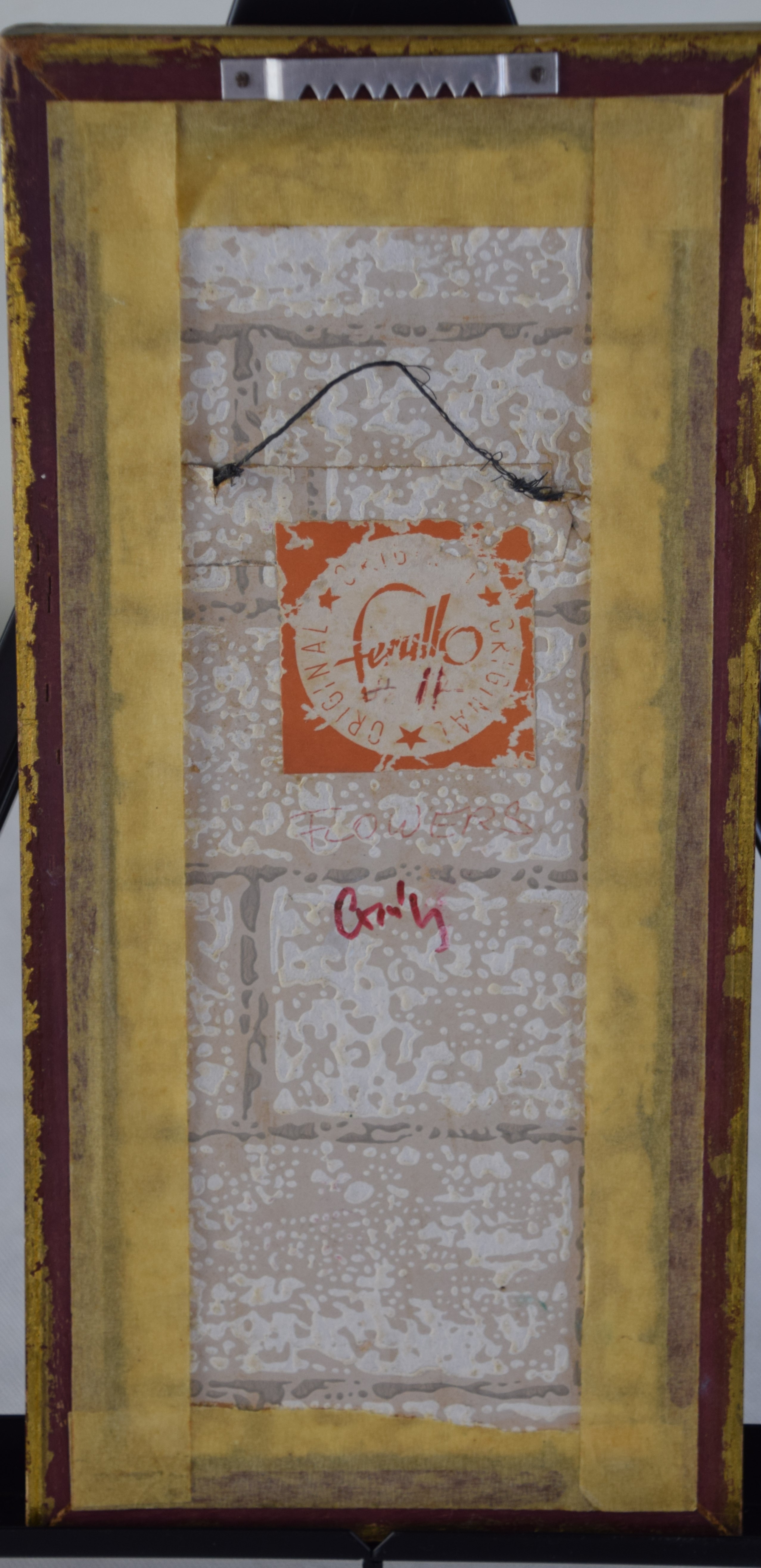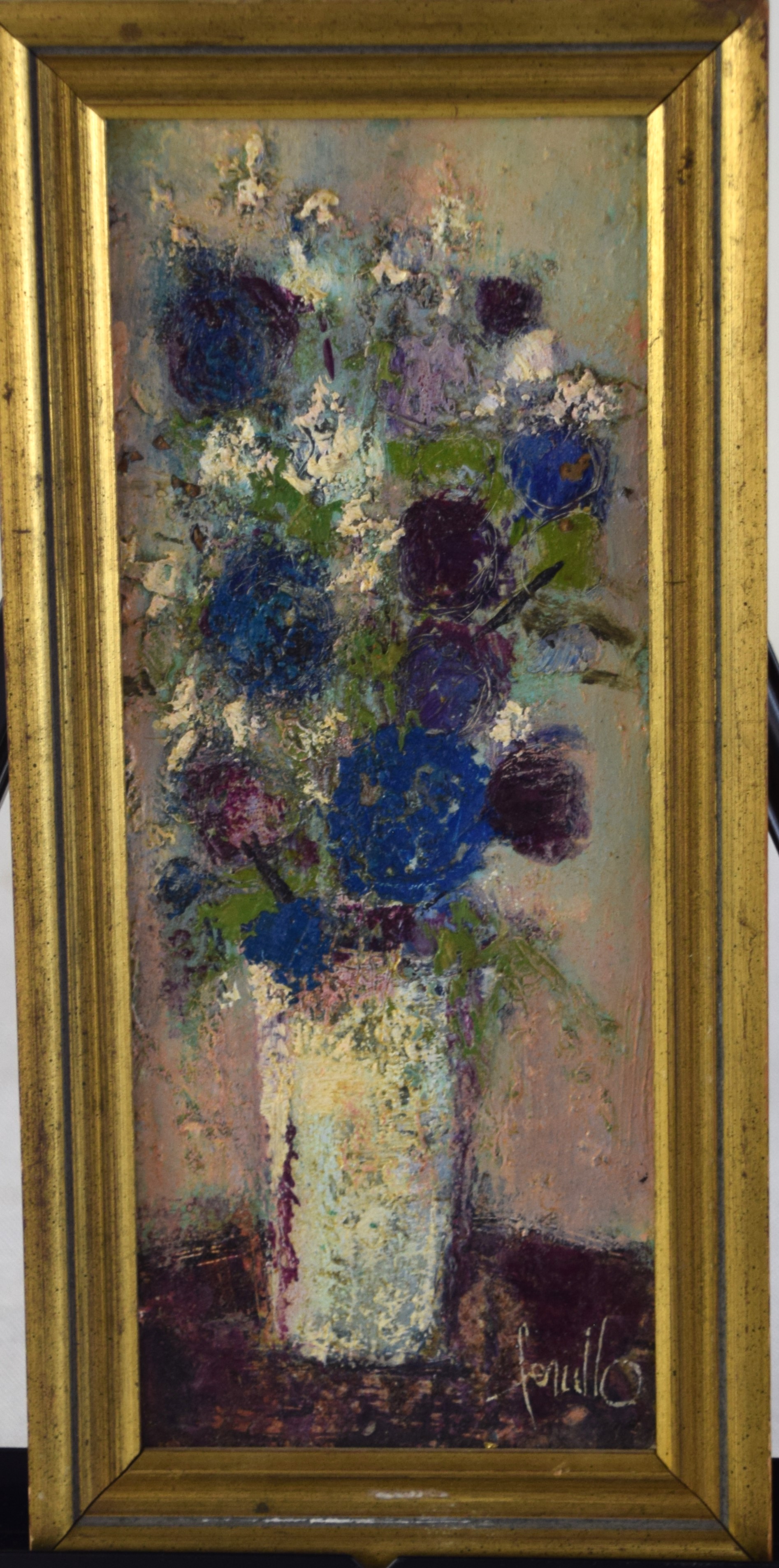 Framed and signed still life of flowers in a white vase. Edith Ferullo (1928 – 2008) was known for her abstract and cubist style Painting. Dimensions: 13″ x 6.5″