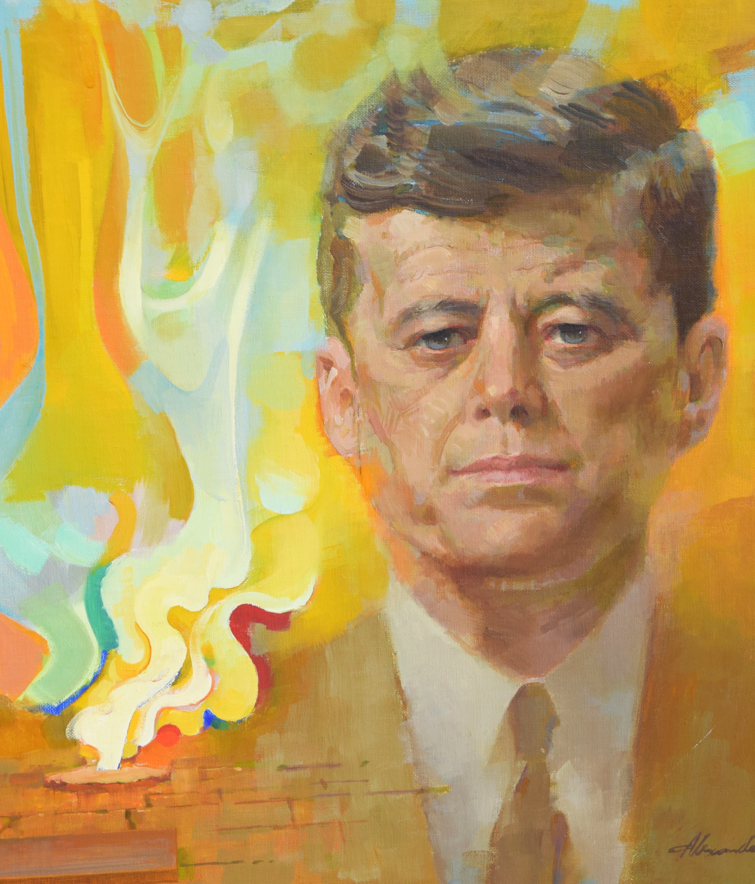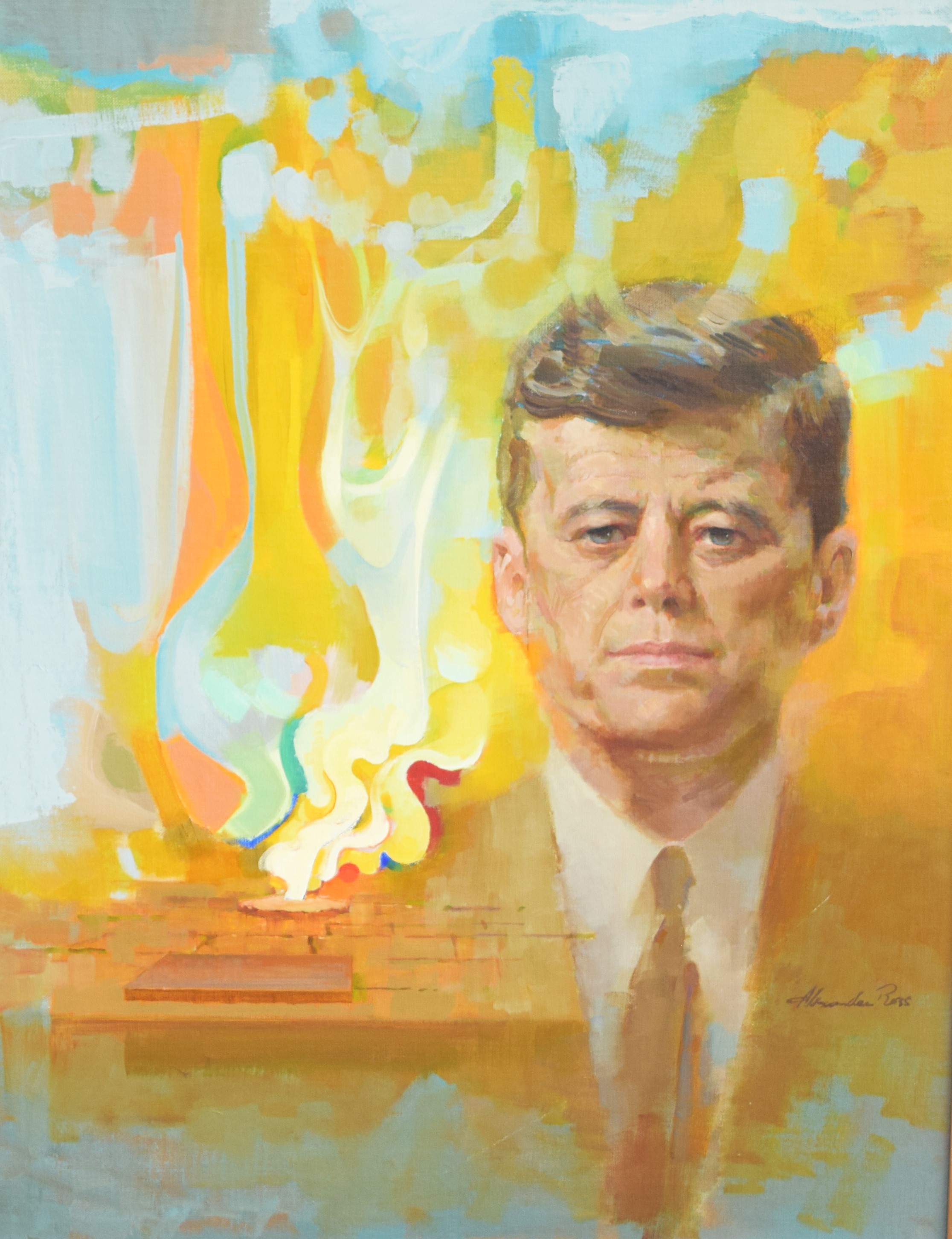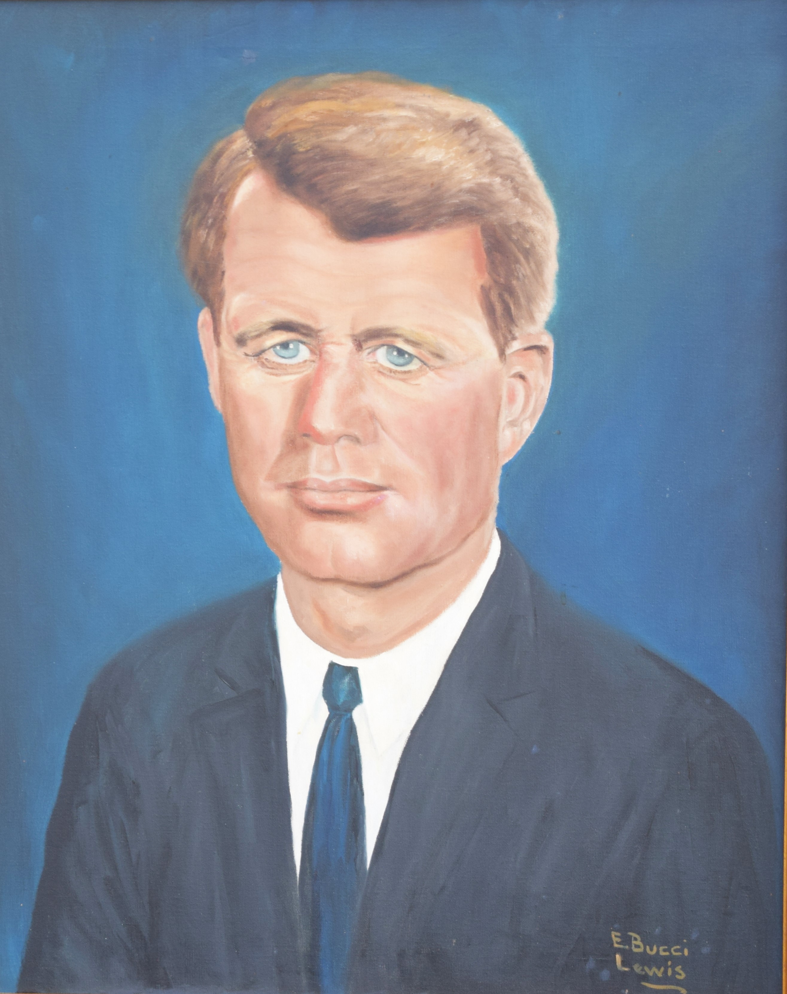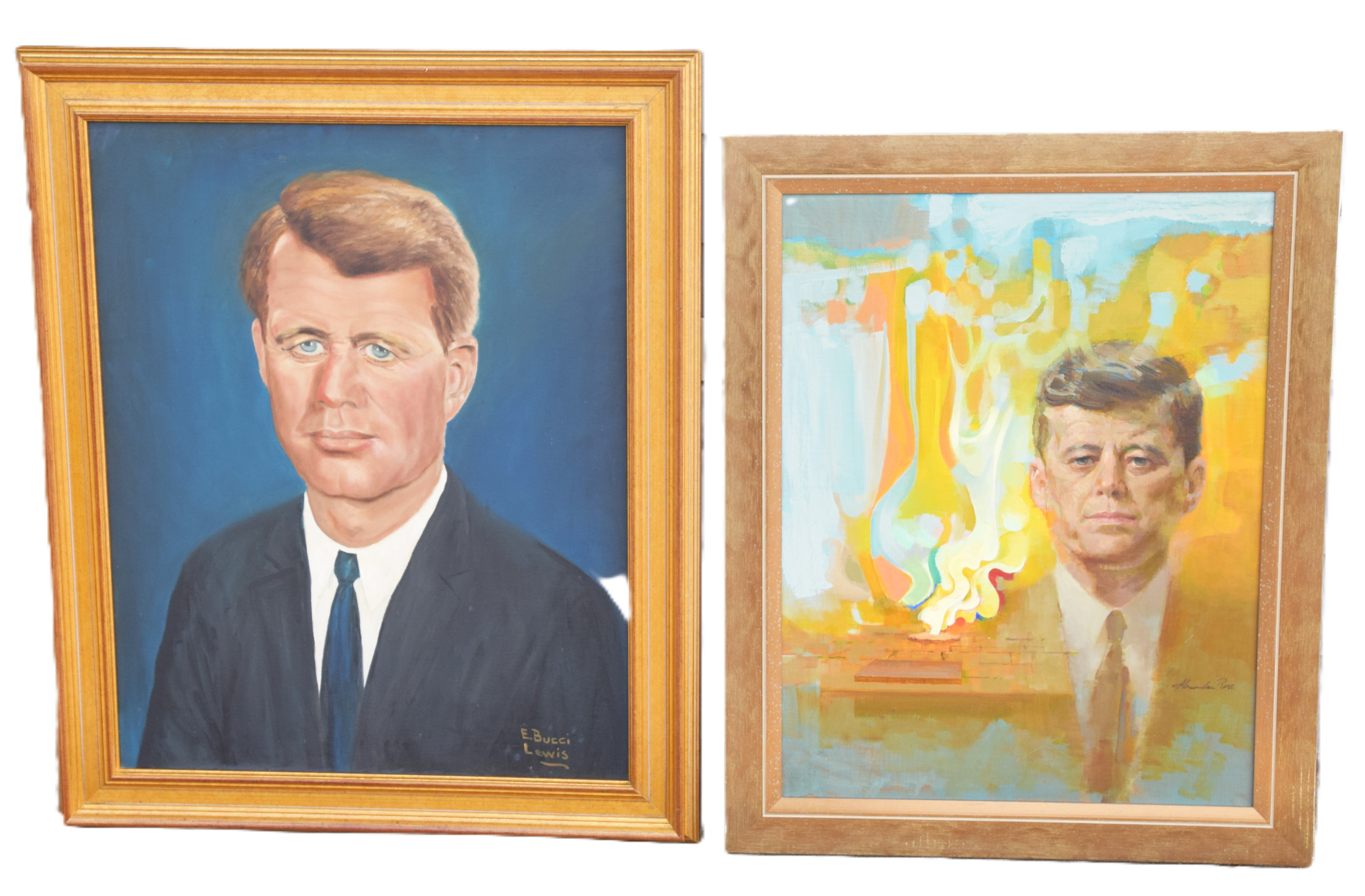 Portrait of John F. Kennedy, oil on board, with the eternal flame signed by Alexander Ross. Alexander Sharpe Ross (1908/09 – 1990) worked in Connecticut and Alexander Ross is known for Illustrations and portraits. The Robert Kennedy portrait, oil on canvas, is signed by E. Bucci Lewis. Dimensions: 27.5″ x 21″ JFK, 30″ x 24.5 RFK