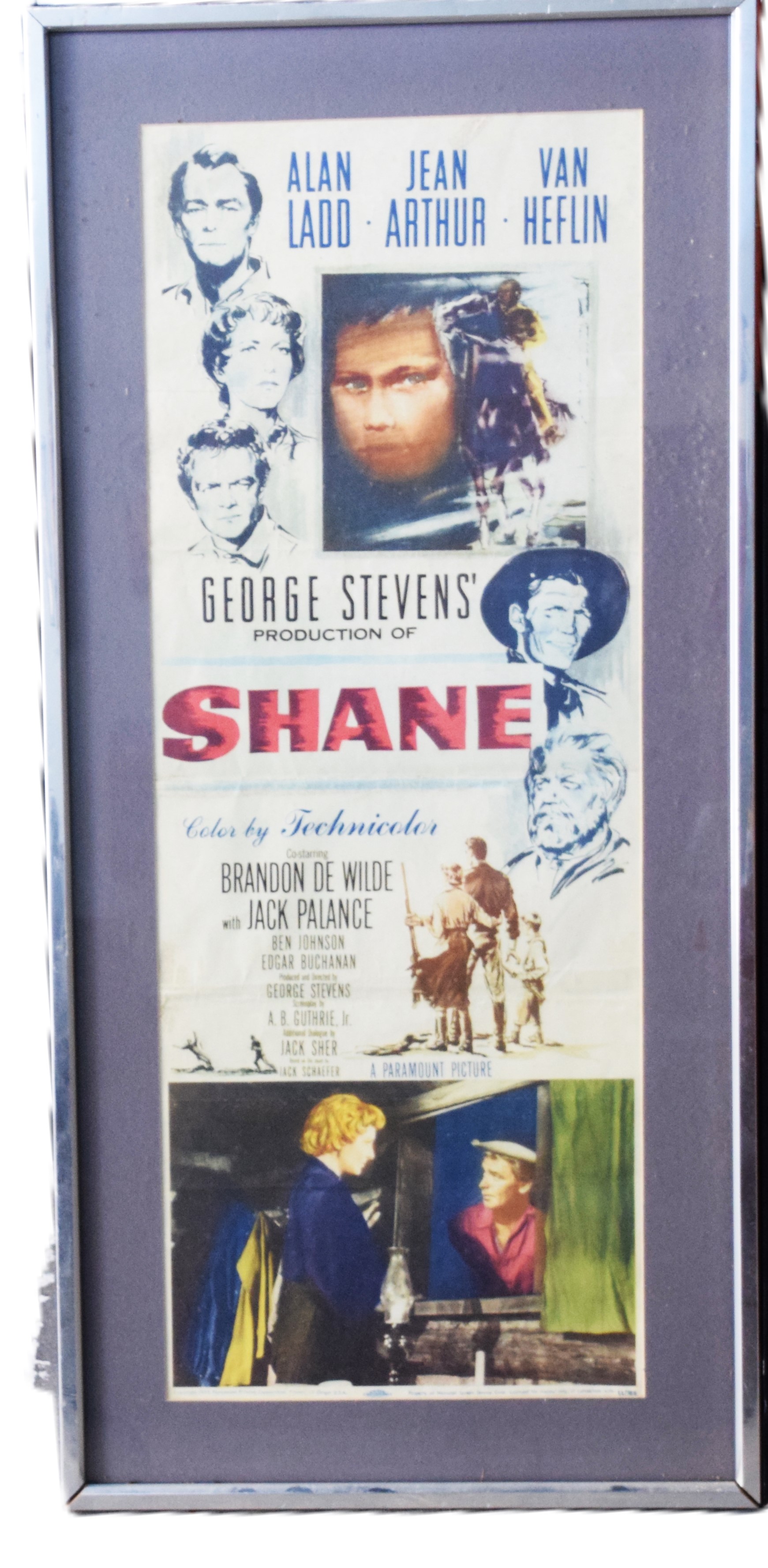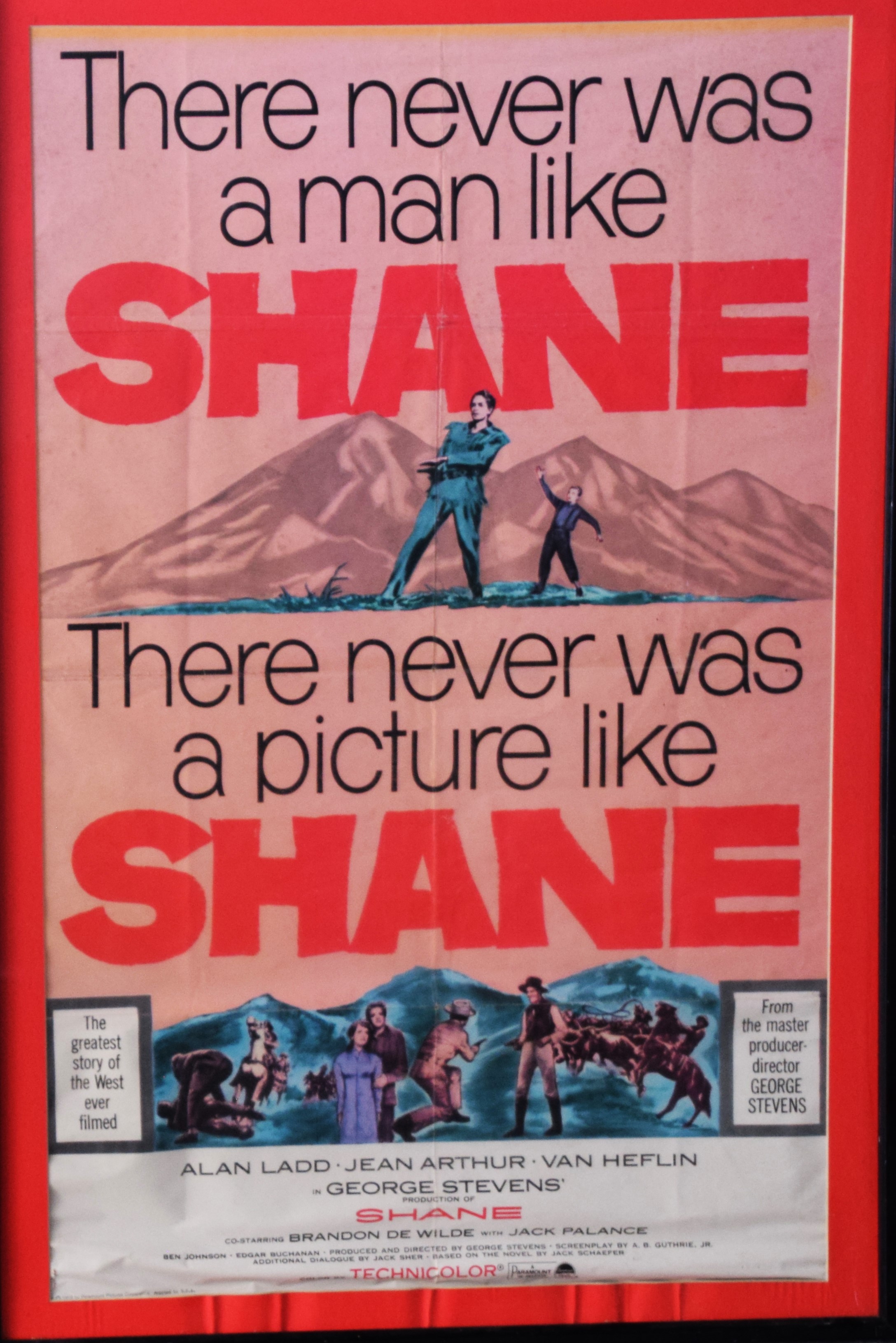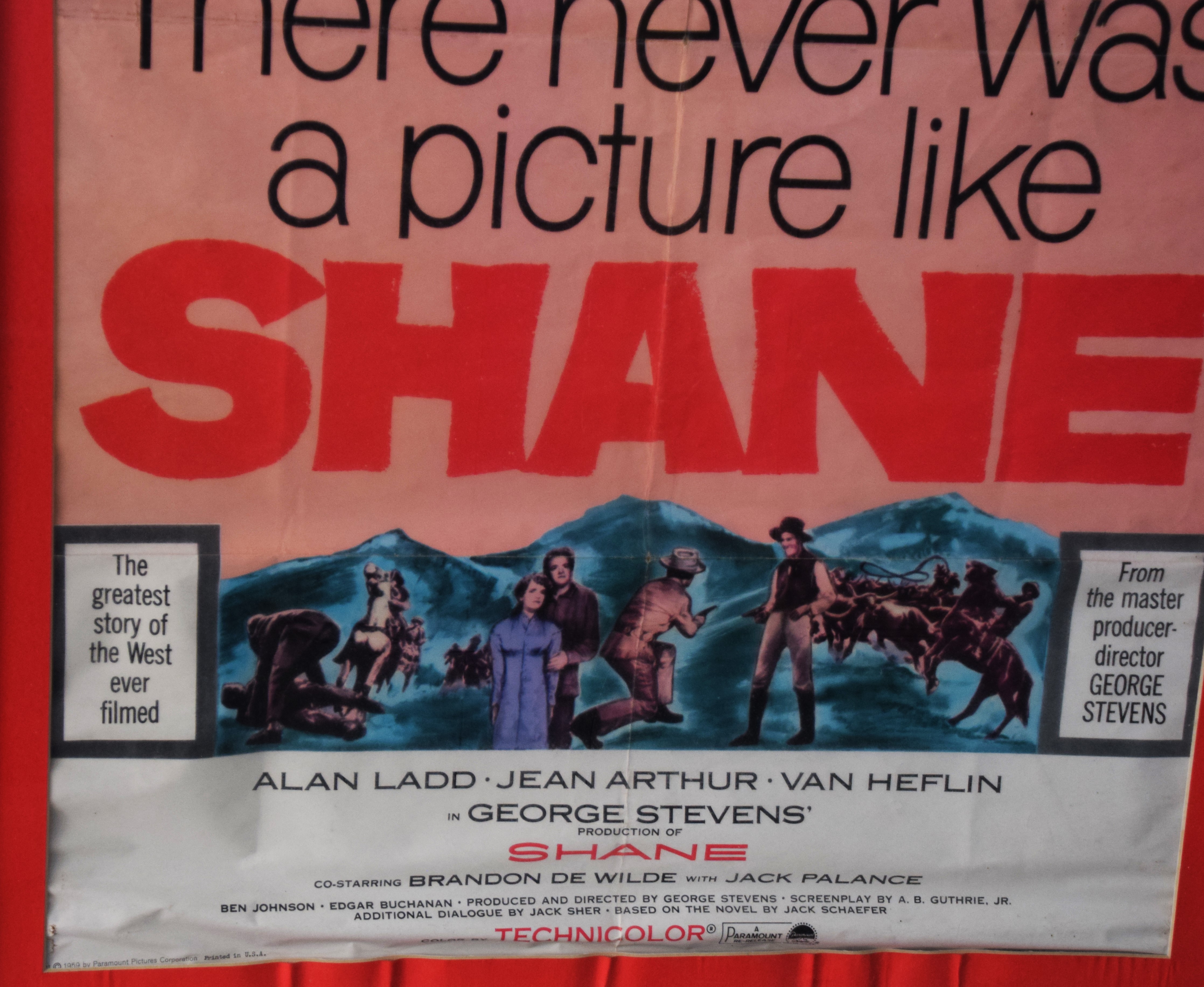 Two Shane Western movie posters including the rare first edition 1953 Paramount printing 36″ x 14″ and the more common 1959 Paramount edition 27″ x 41″. Starring Alan Ladd, Jean Arthur, Van Heflin.
