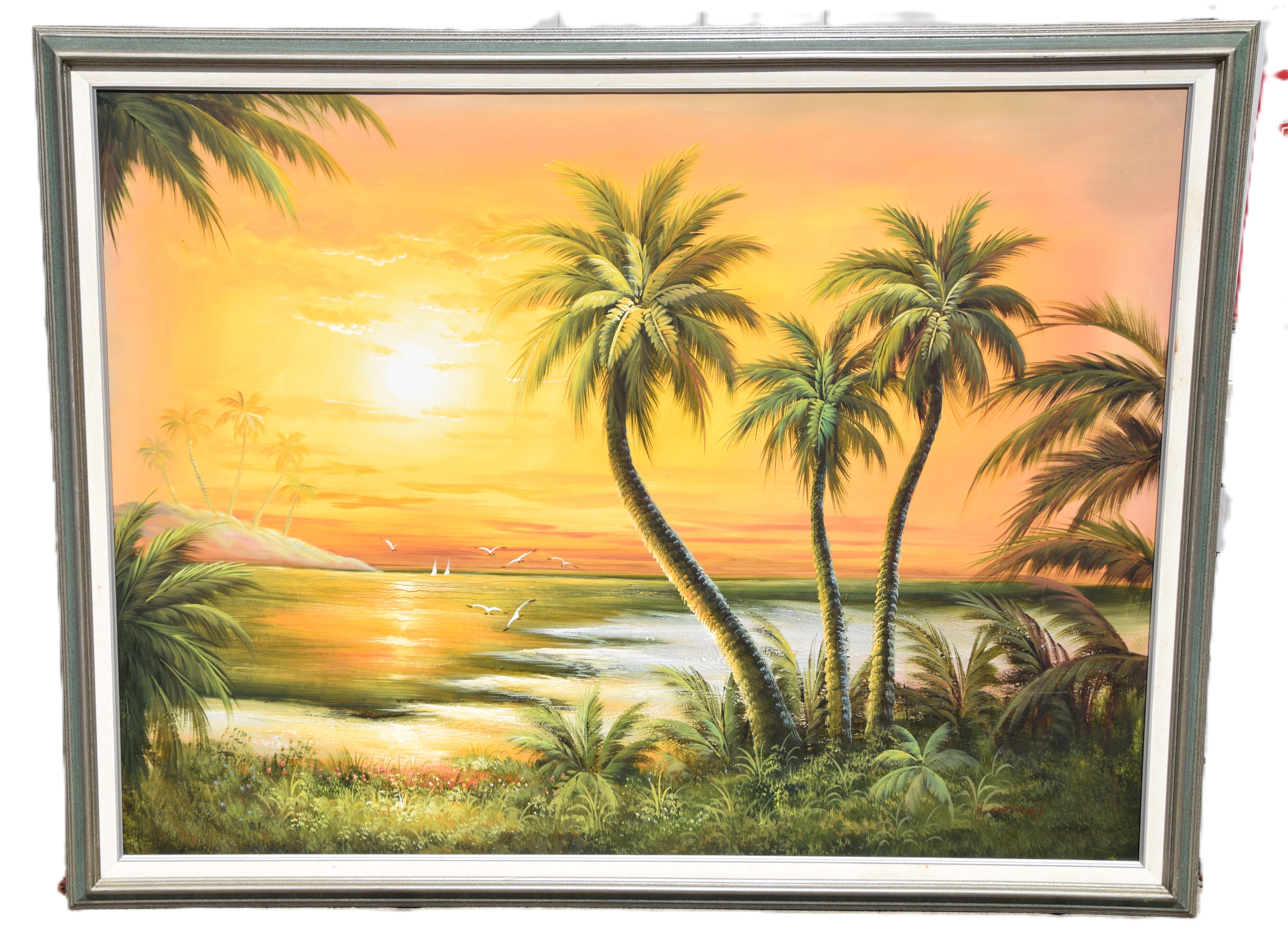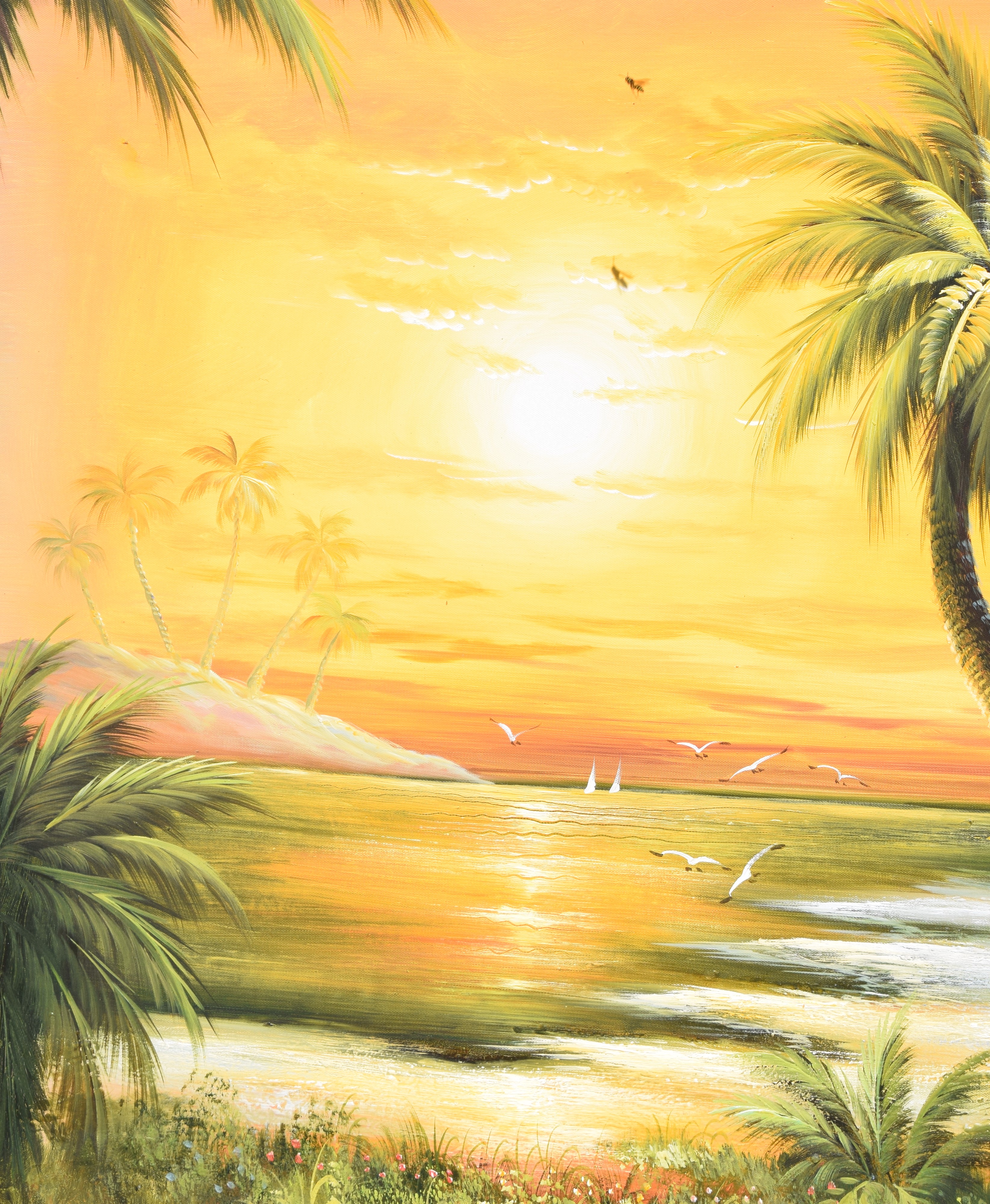 Contemporary oil painting on canvas of a Florida scene with sunset, palm trees, seagulls, and an ocean background. Dimensions: 36″ x 47.5″
