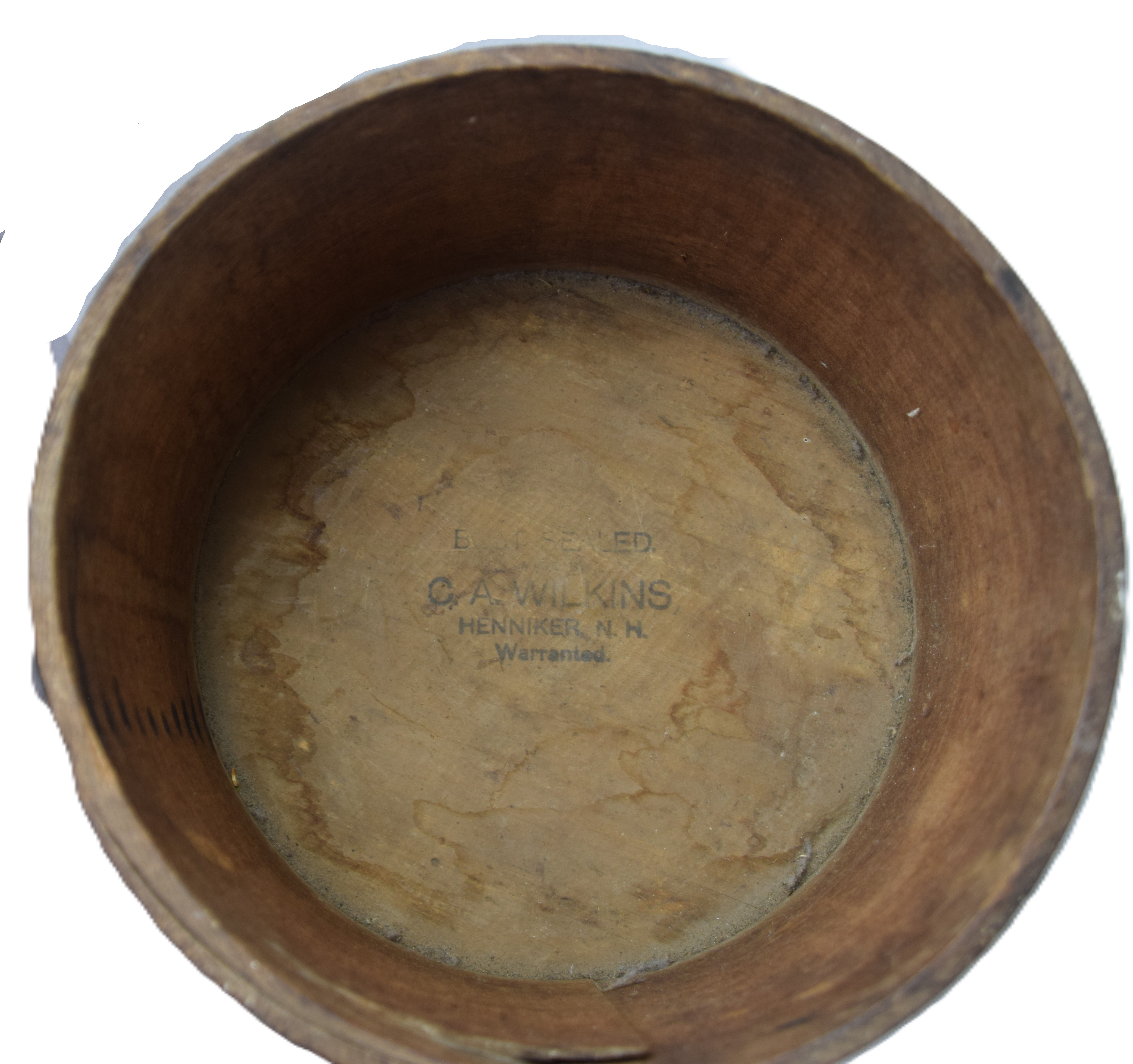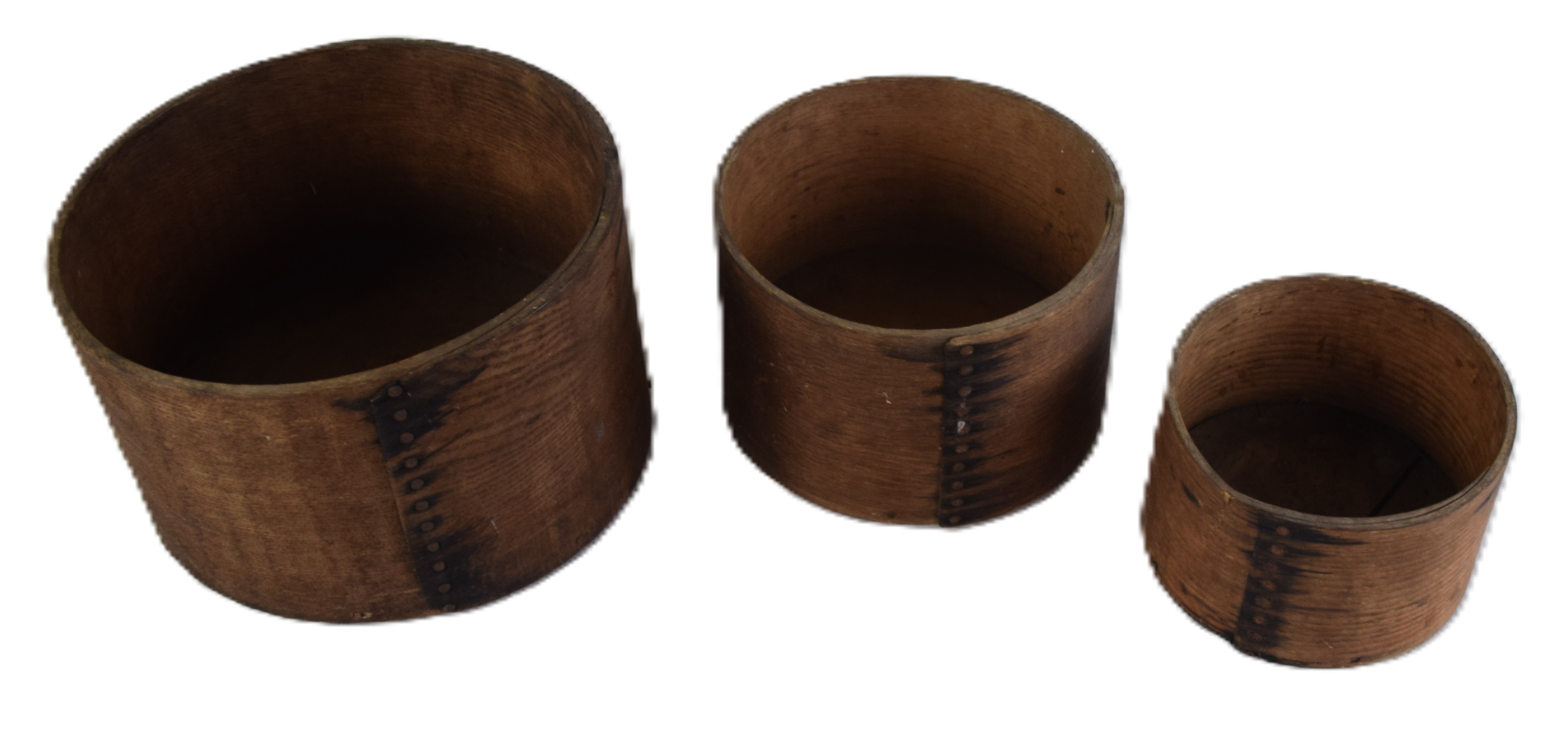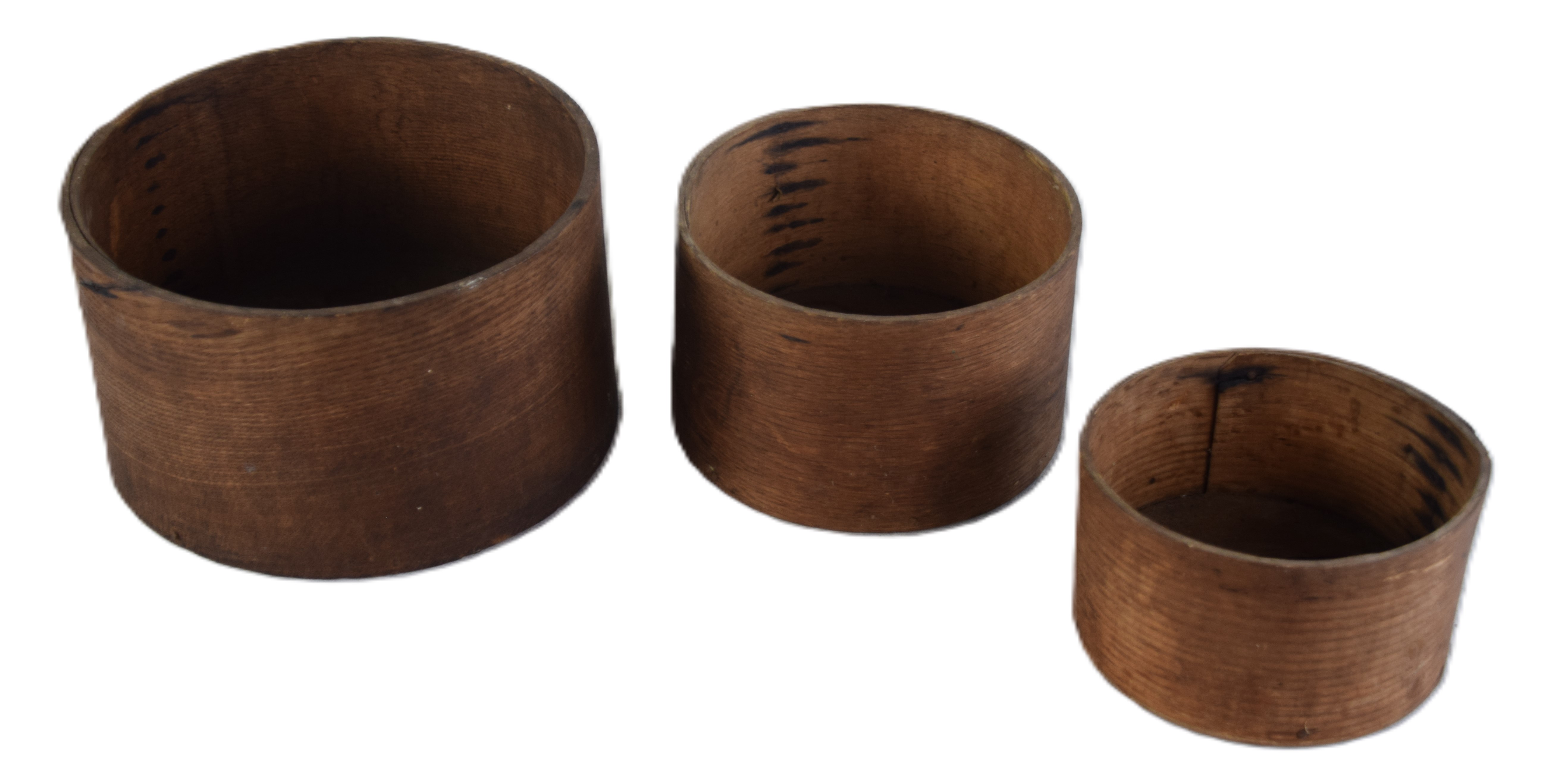 Nesting set of three circular wooden measures, stamped CA Wilkens, Henniker NH. Dimensions: 6″, 7.5″ and 9″ Diameters