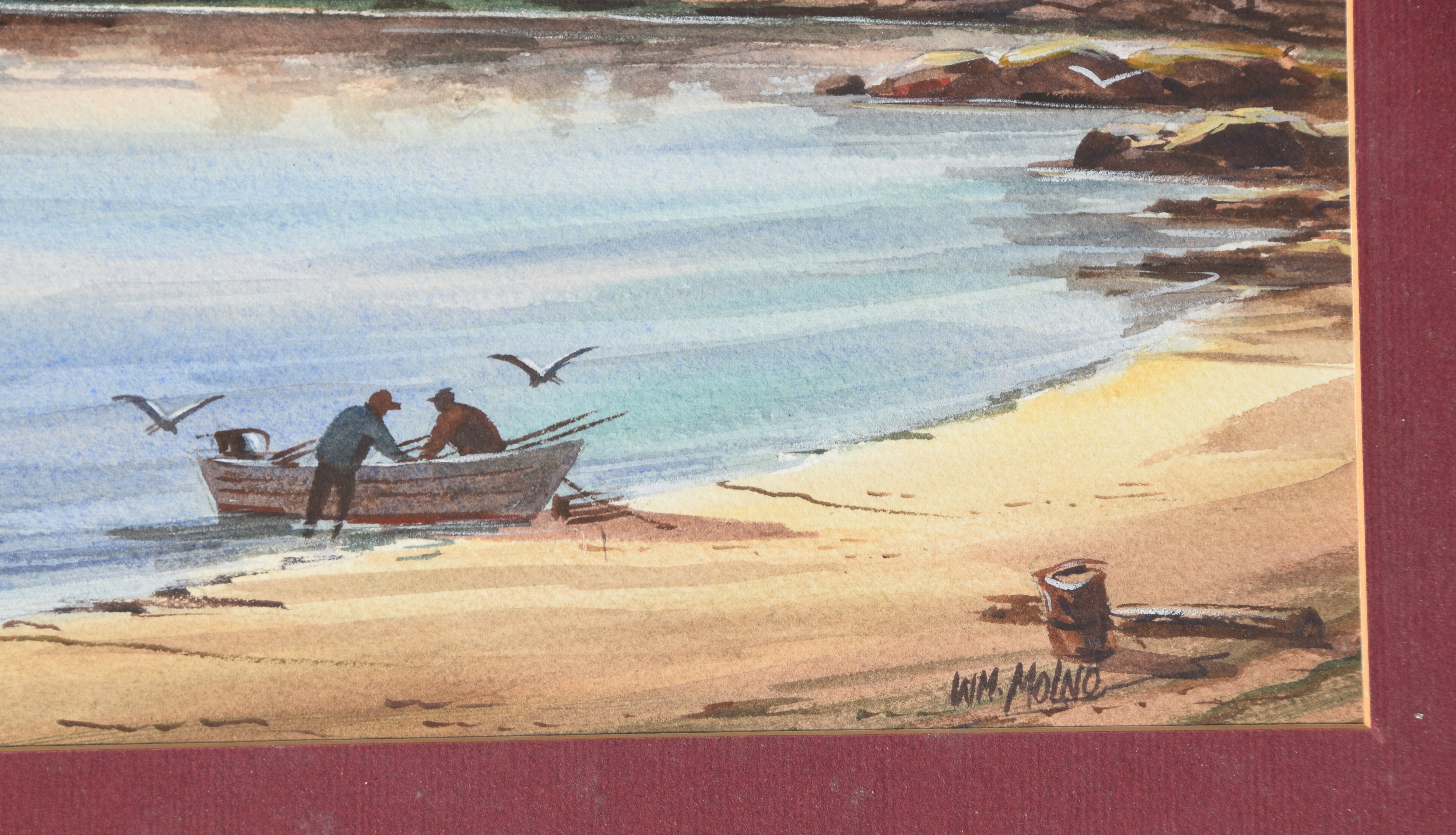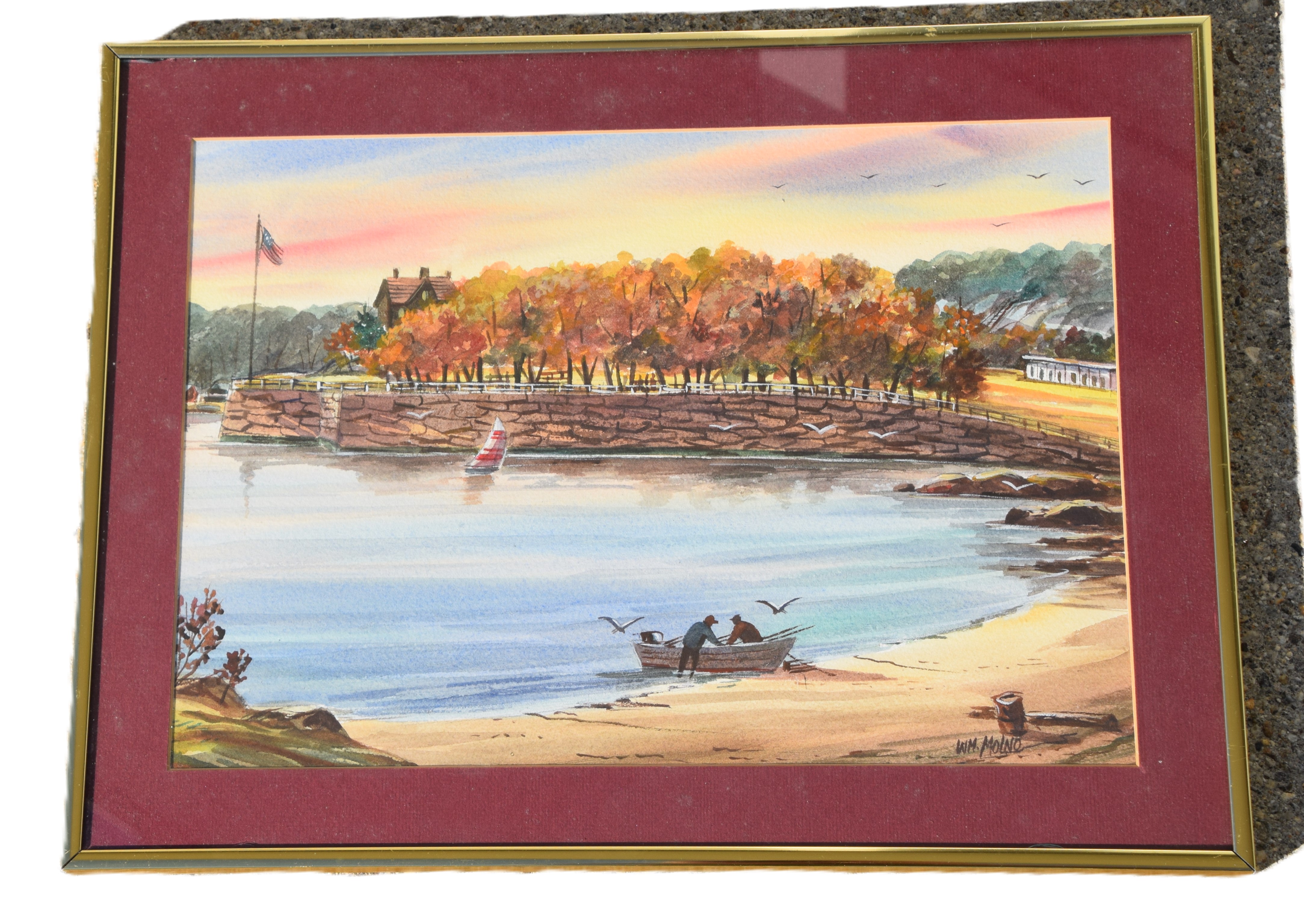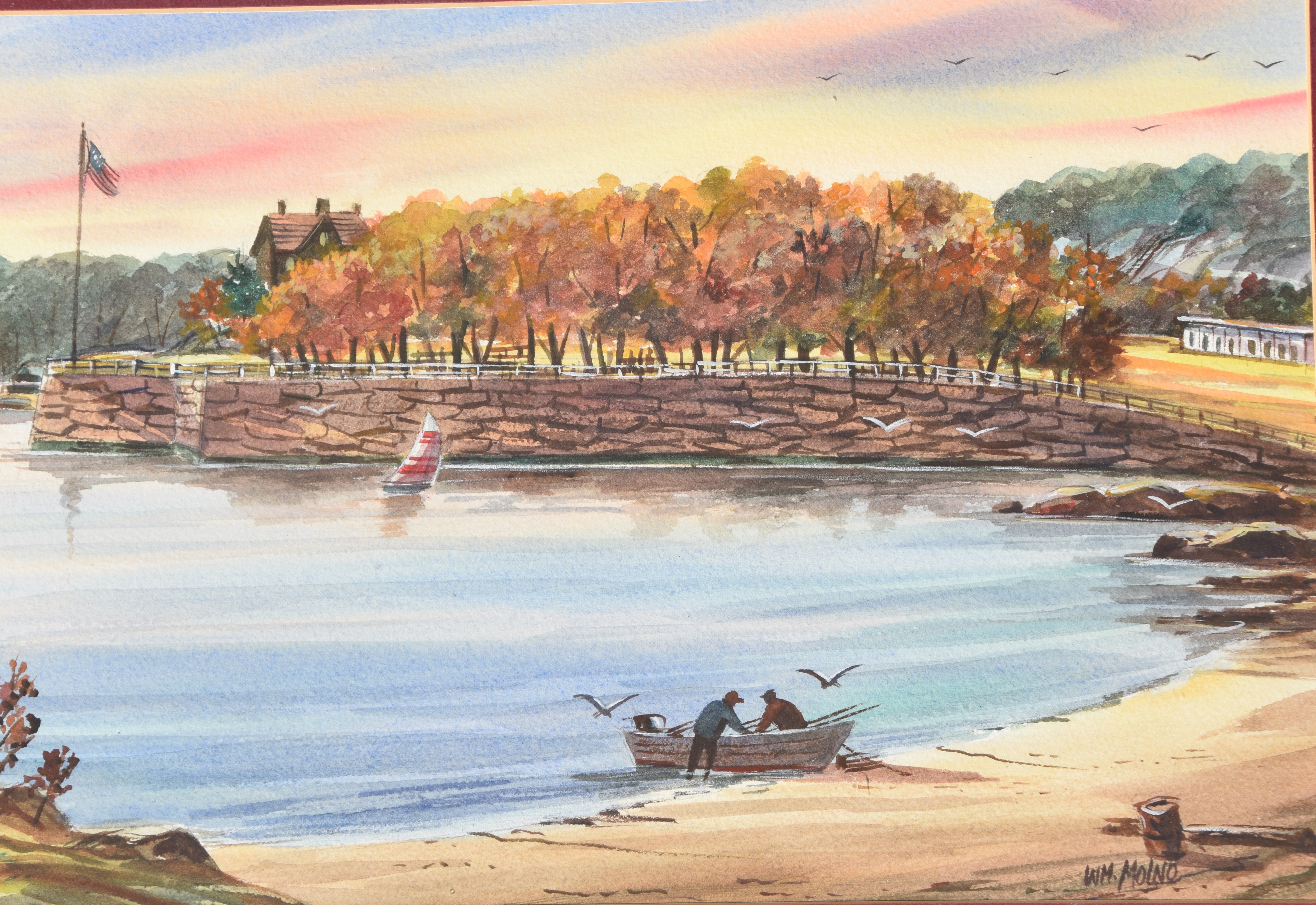 Watercolor titled “Branford Point in the Fall” by William Molno, a Branford Connecticut artist, Signed Wm Molno. Dimensions: 9.5″ x 13″ Image size