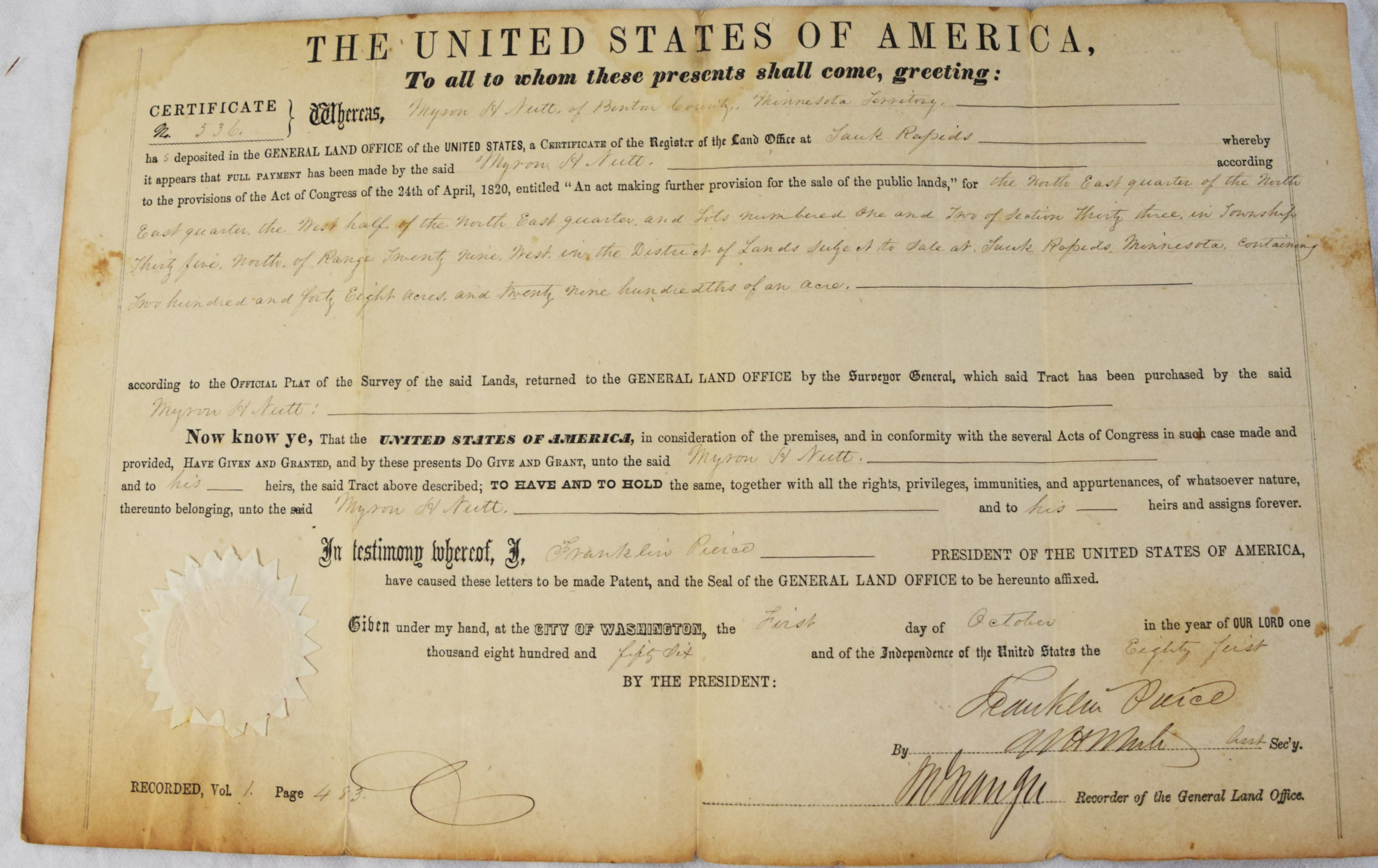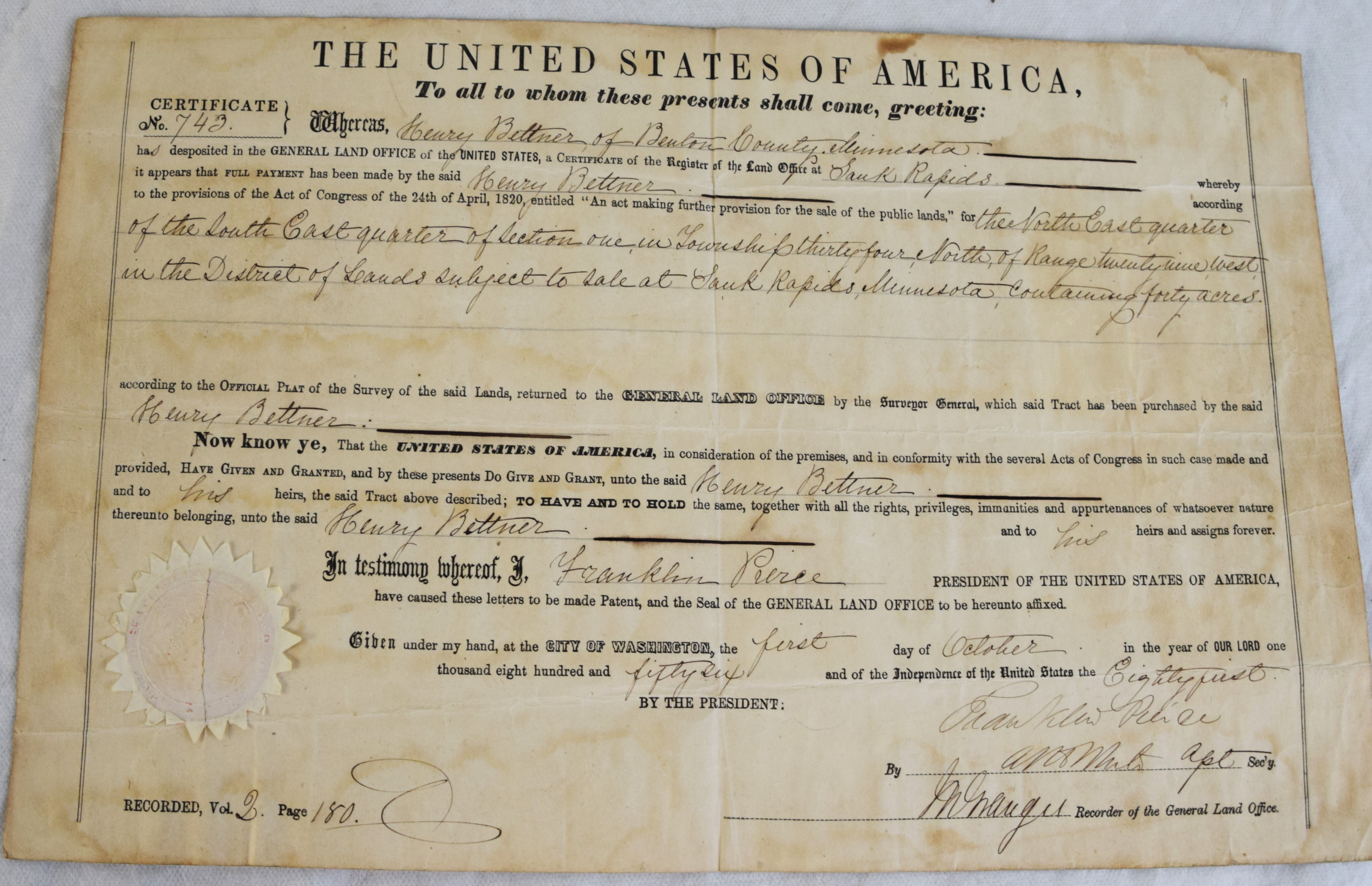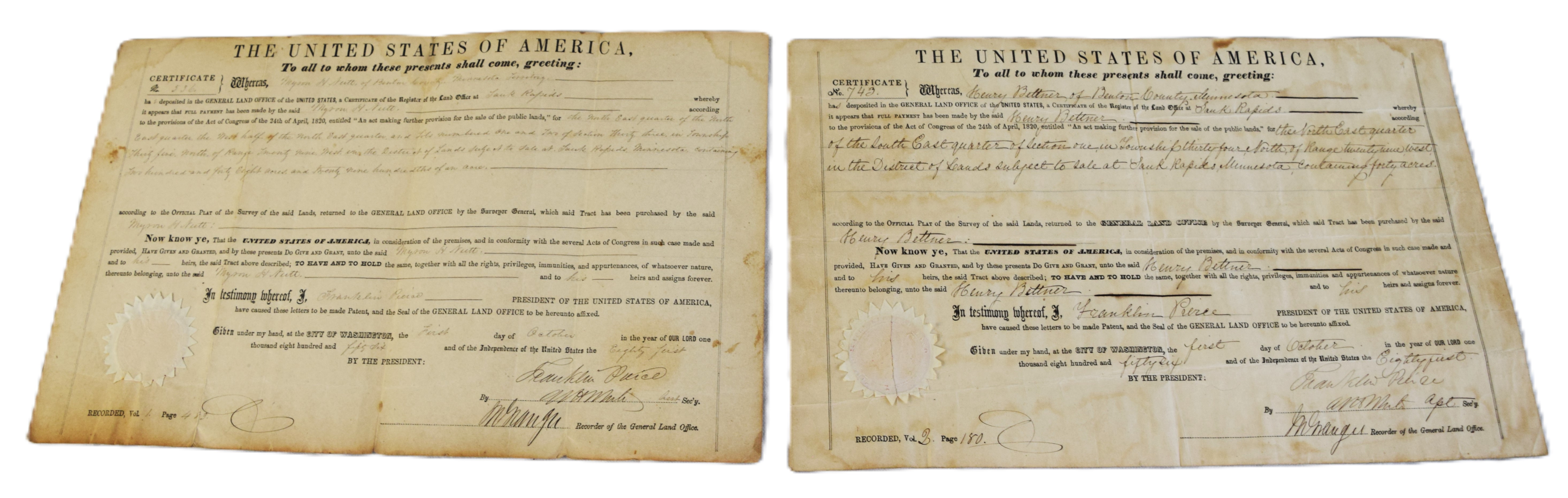 Two land grants signed by President Pierce, October 1, 1856 for land in Grand Rapids, Minnesota. Dimensions: 10″ x 16″