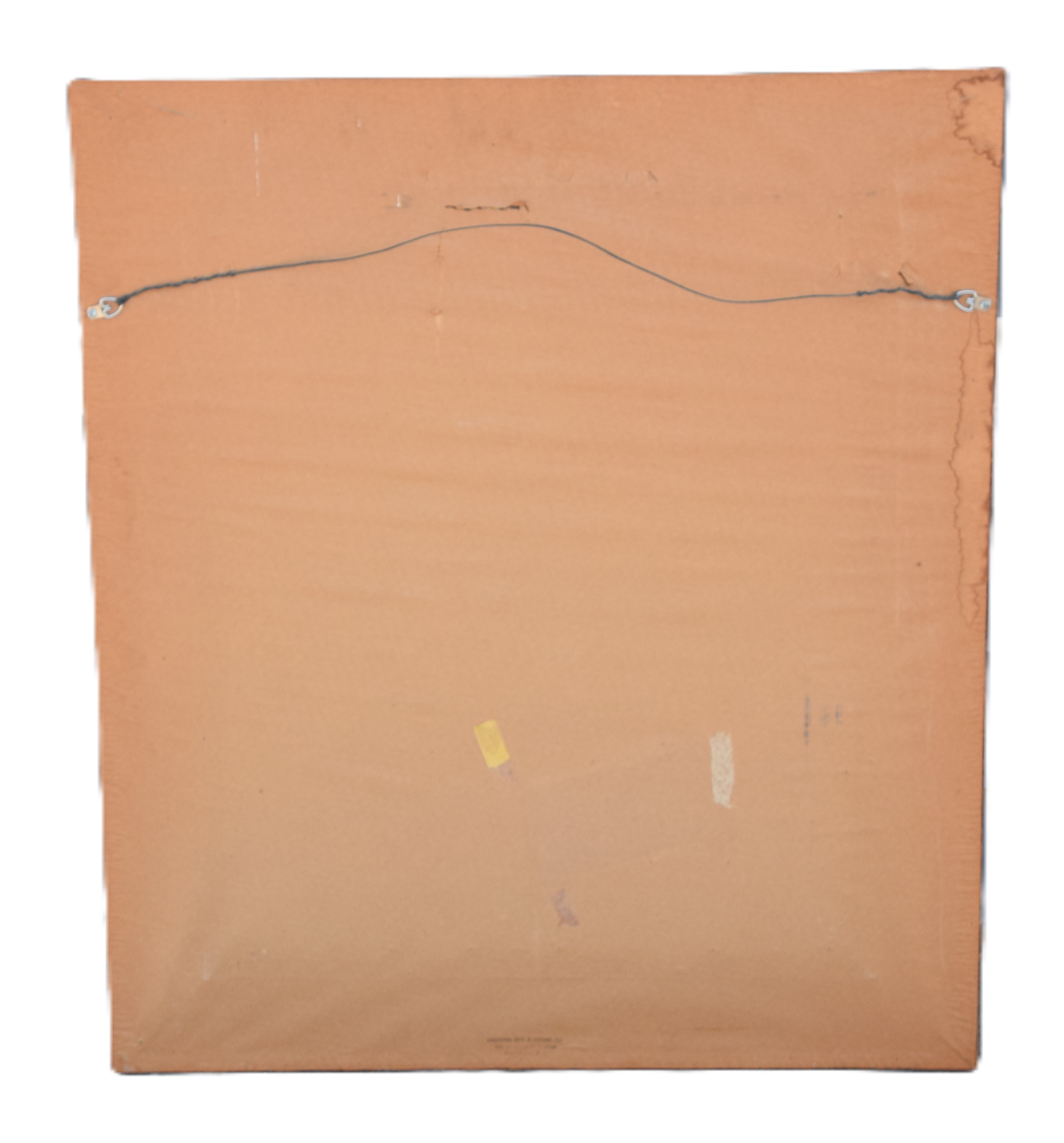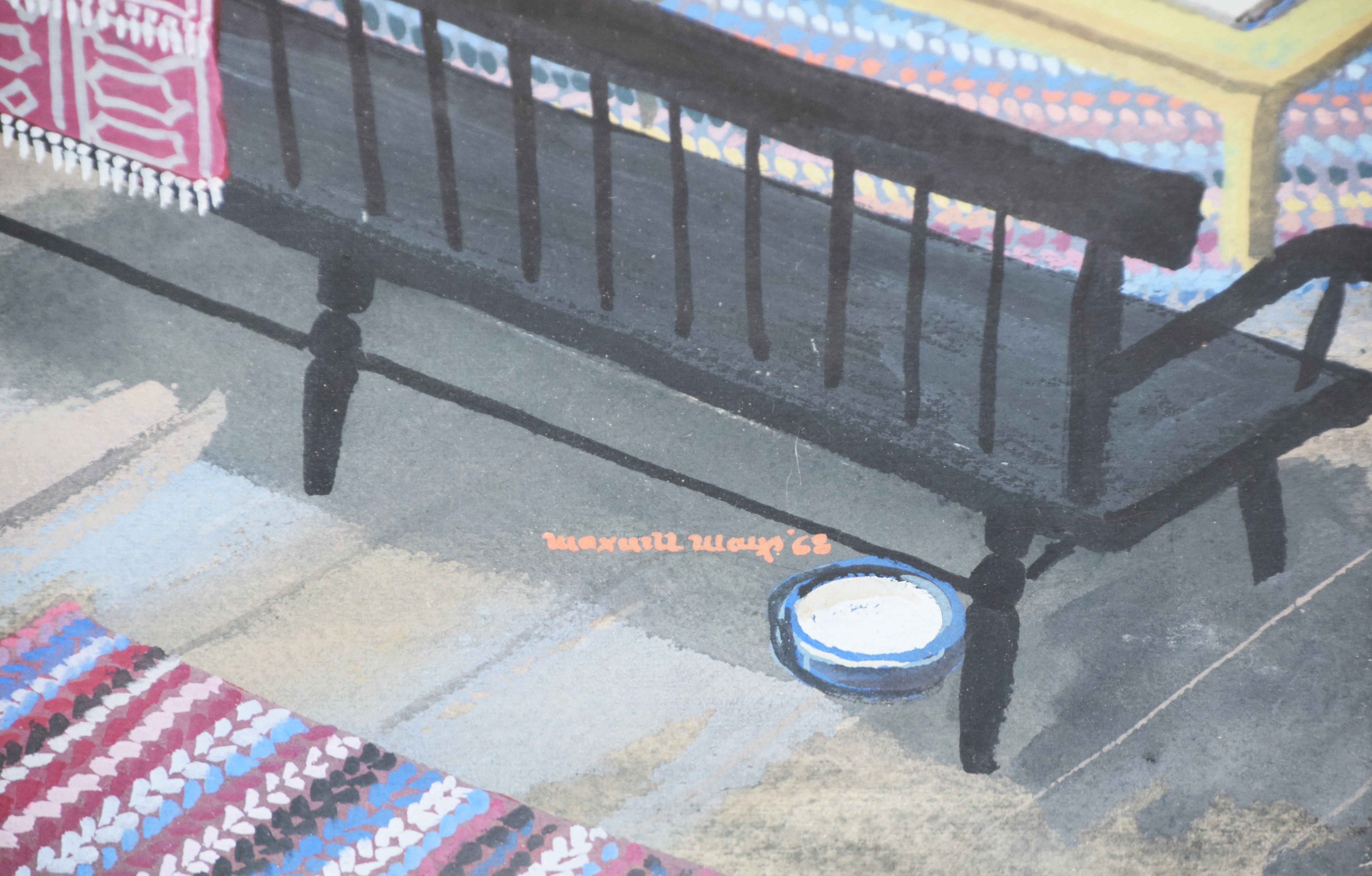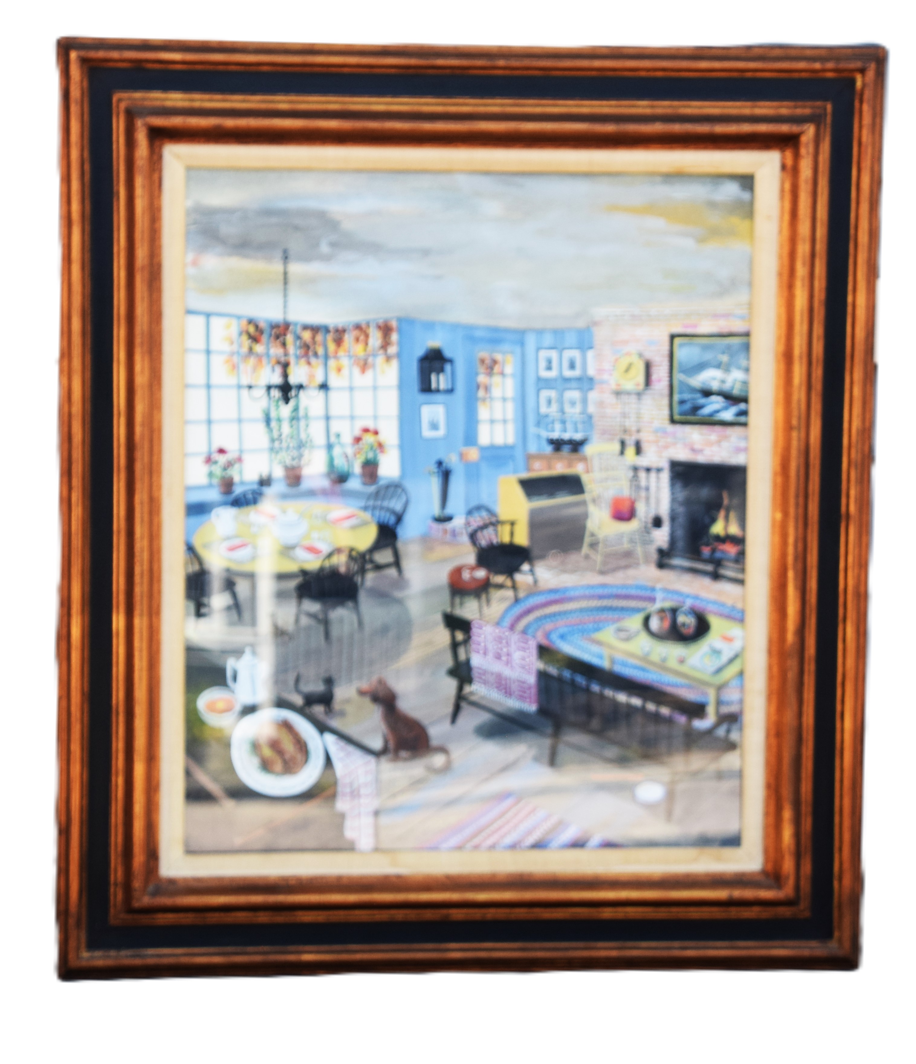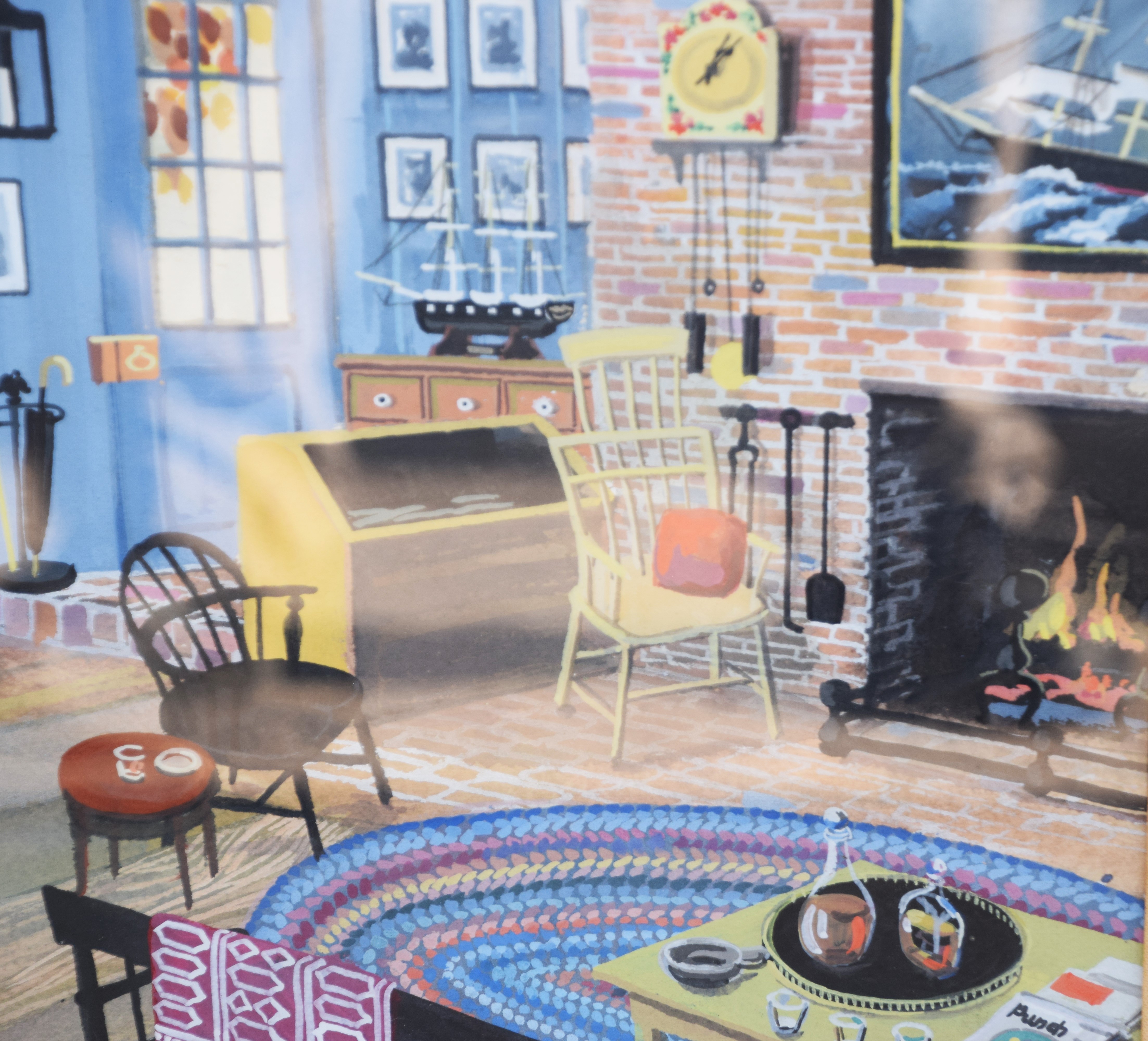 Framed watercolor of an interior scene of a dinning table, fireplaces and den, signed Maxwell Ways, 1968. Dimensions: 24″ x 19.5″ Image size